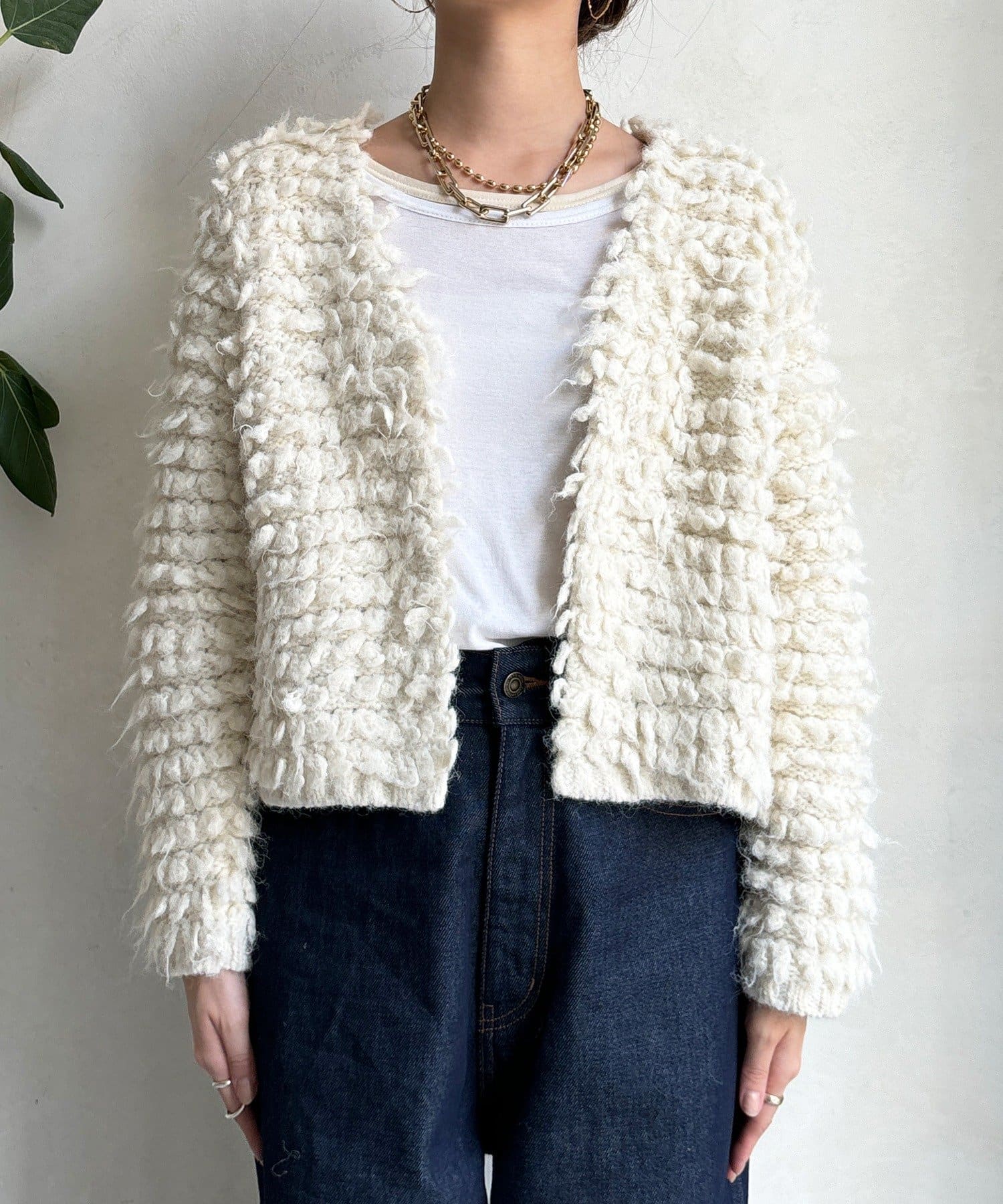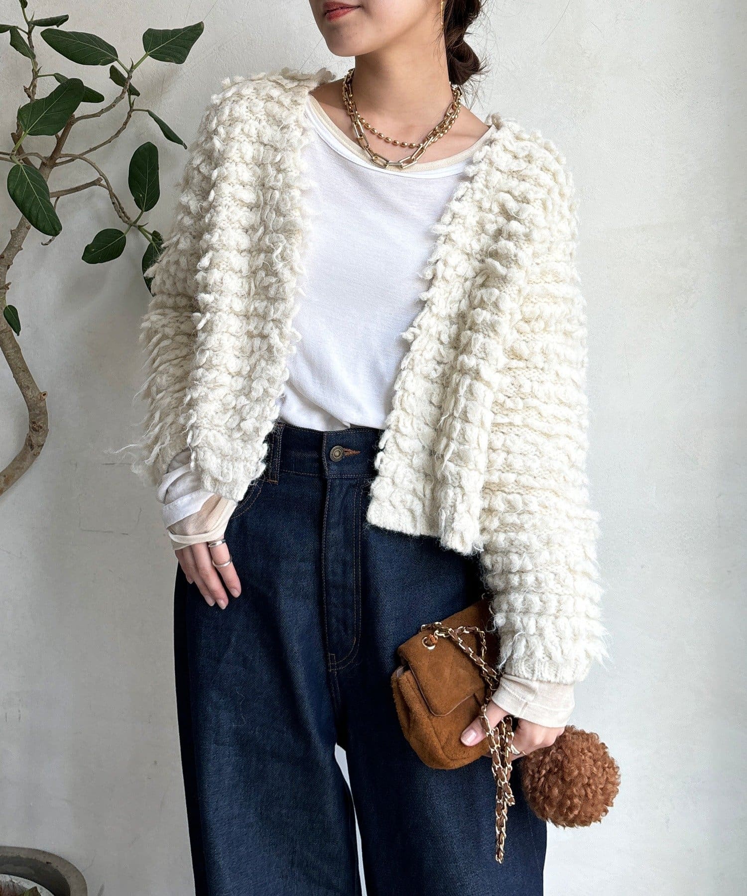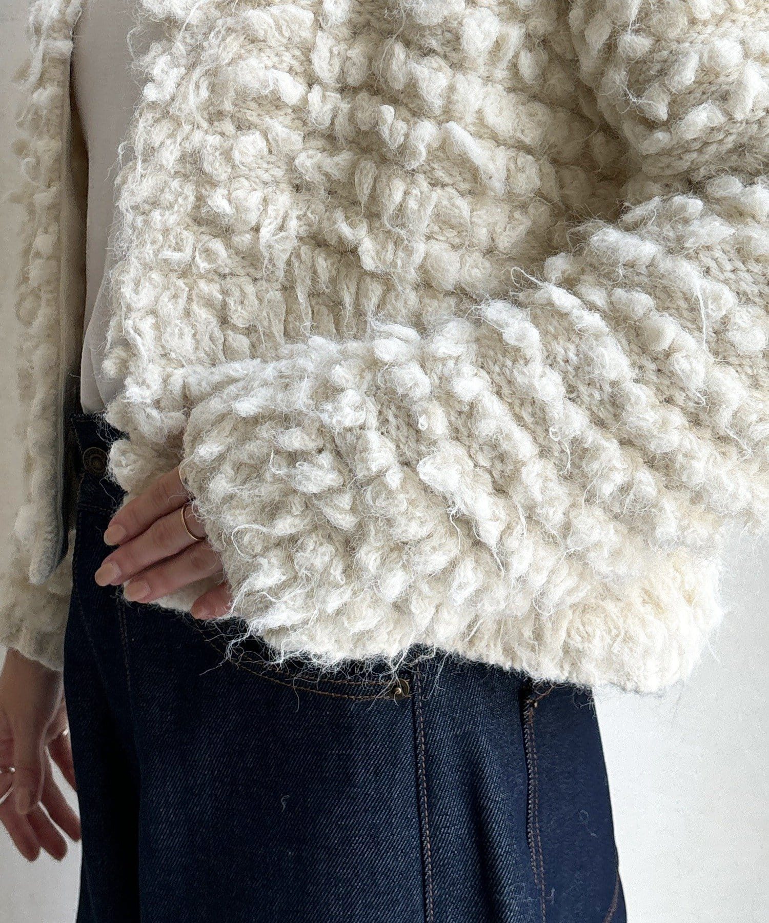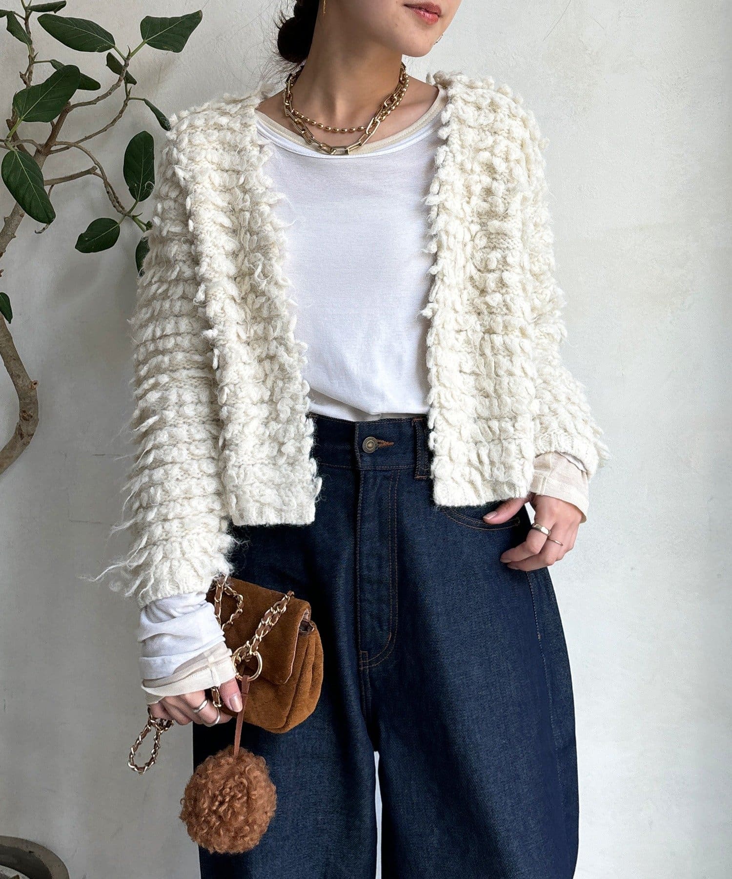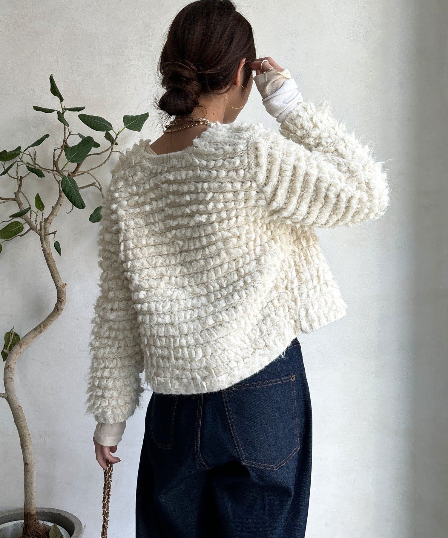 もこもこと愛らしい表面感がポイントのニットジャケット。
