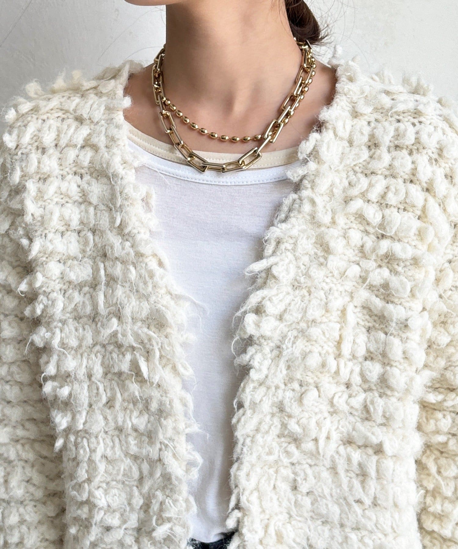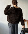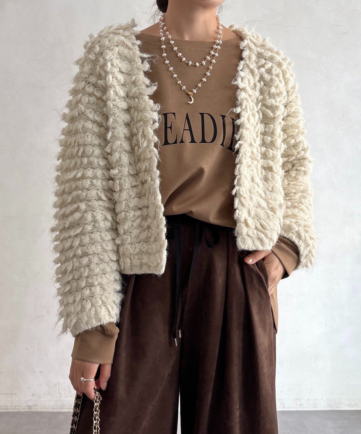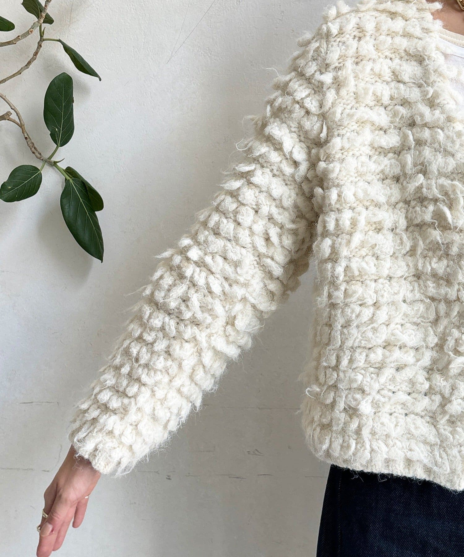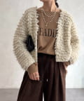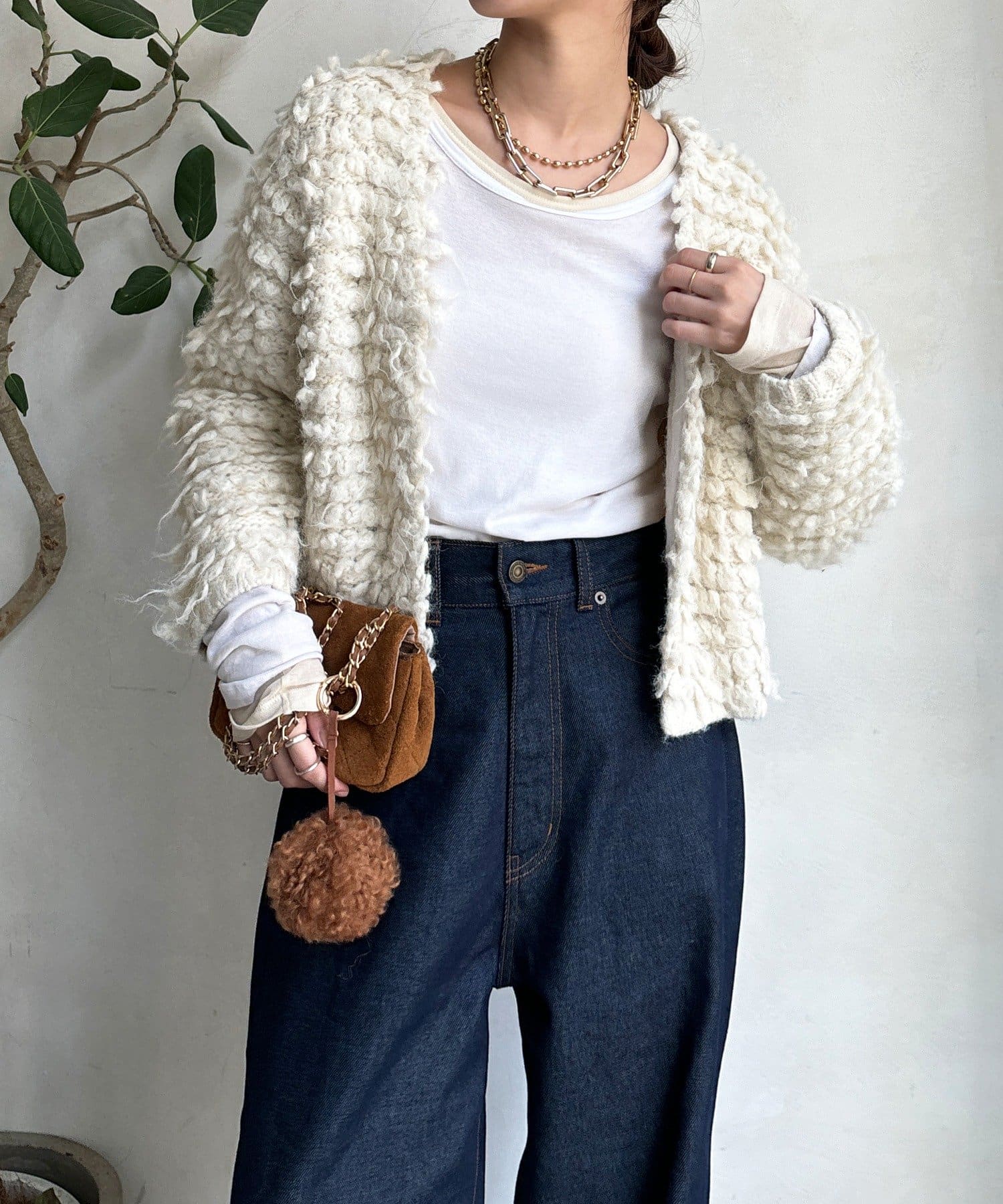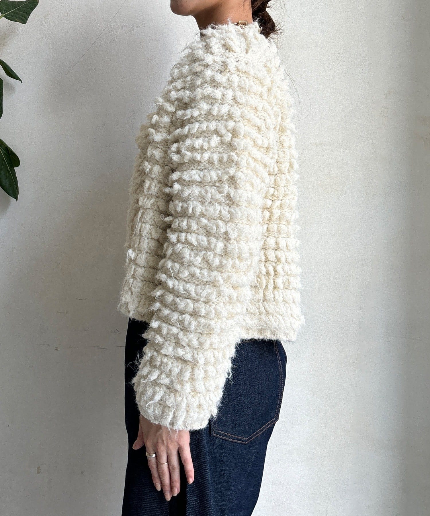 もこもこと愛らしい表面感がポイントのニットジャケット。