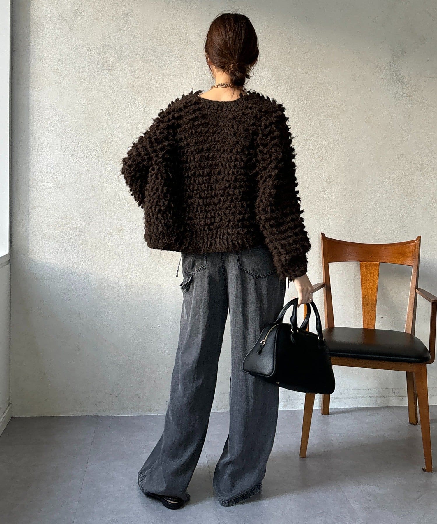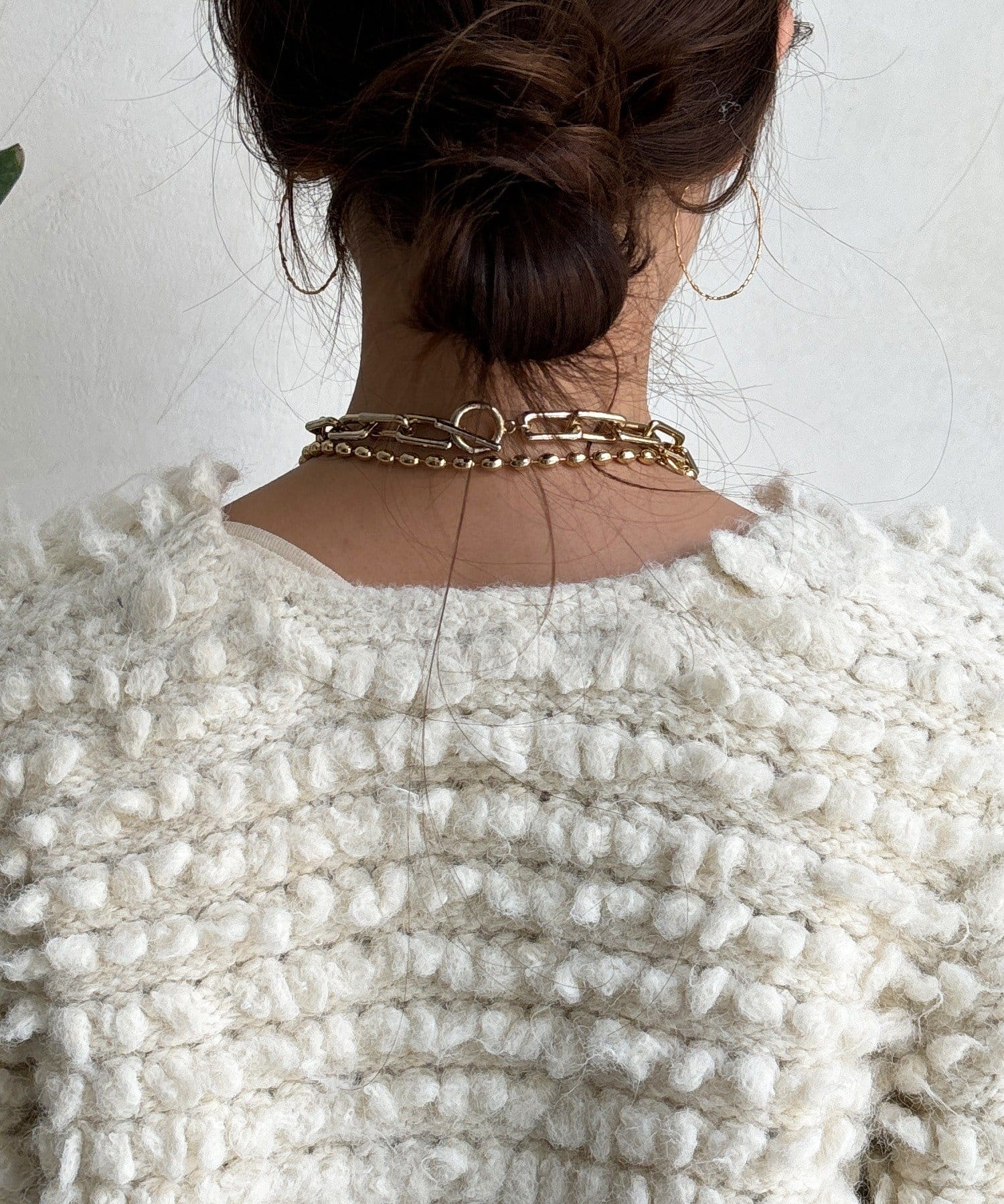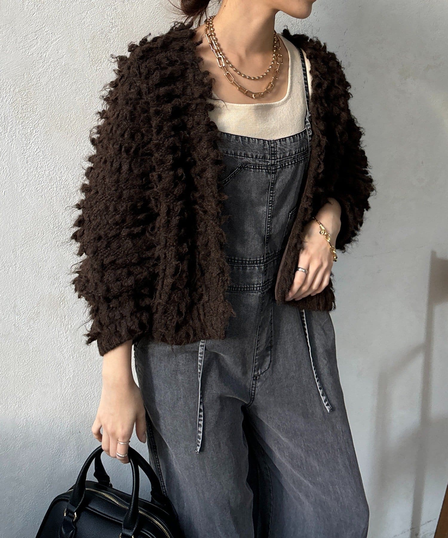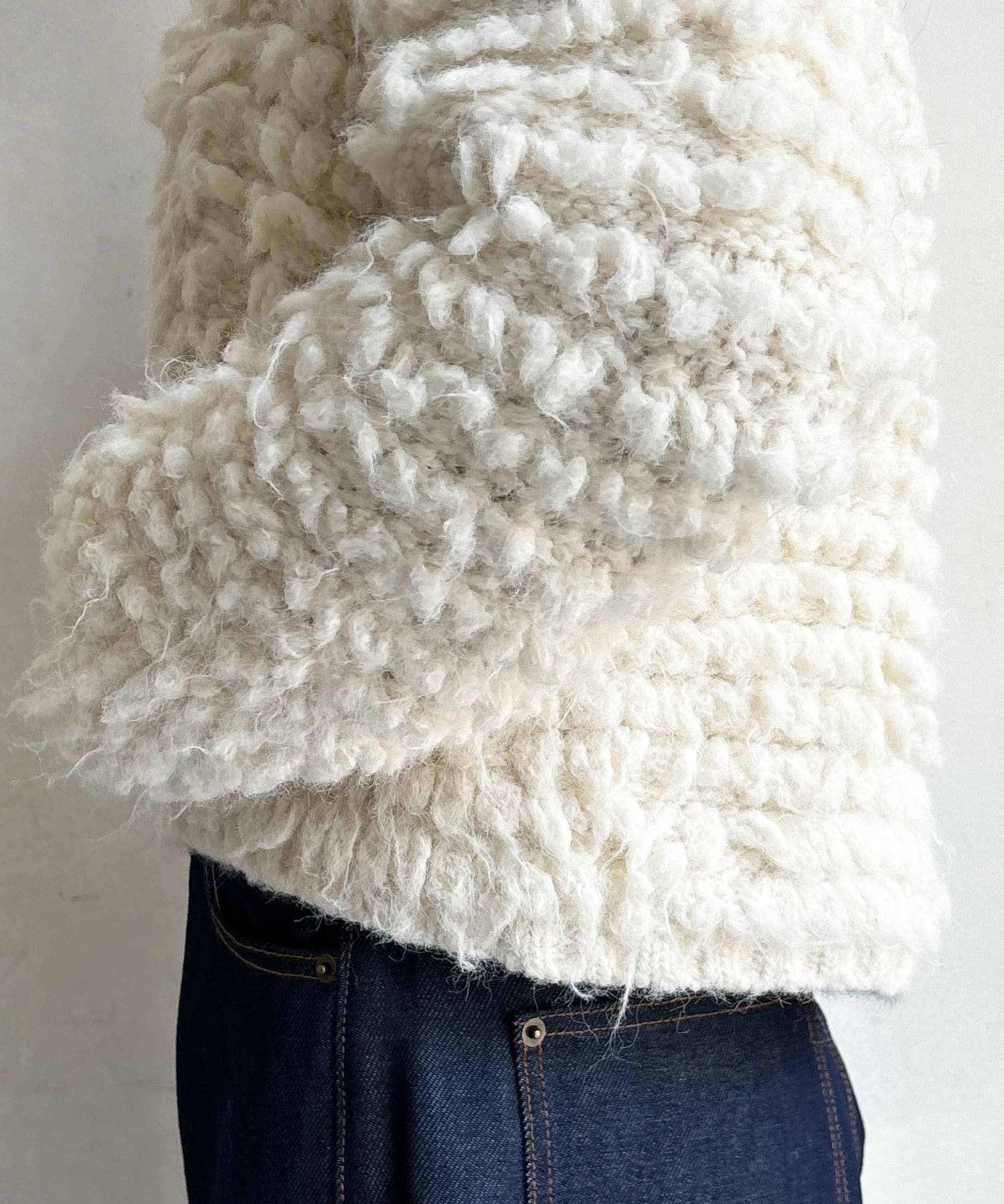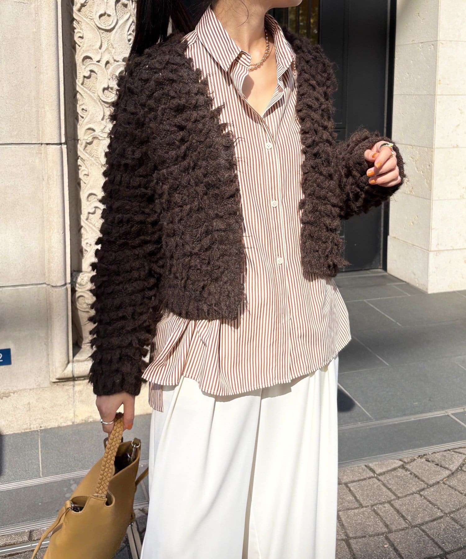 もこもこと愛らしい表面感がポイントのニットジャケット。