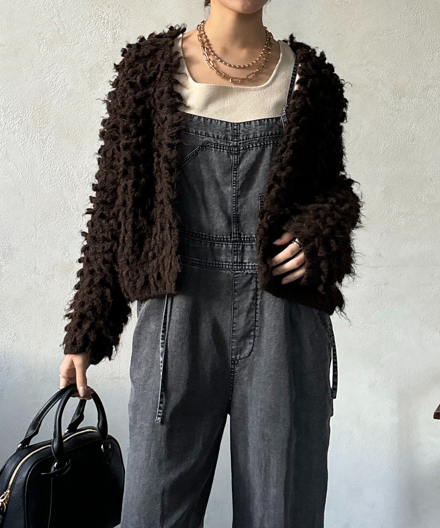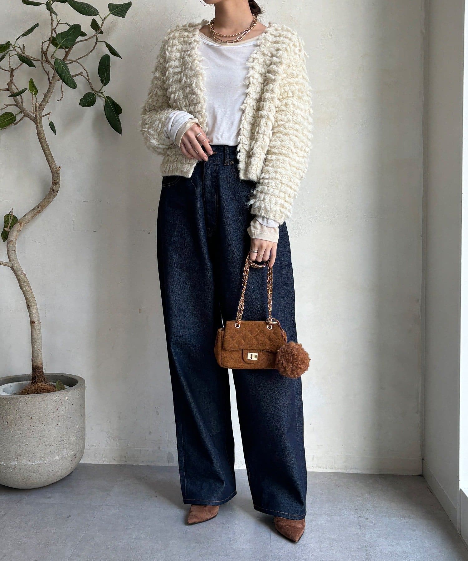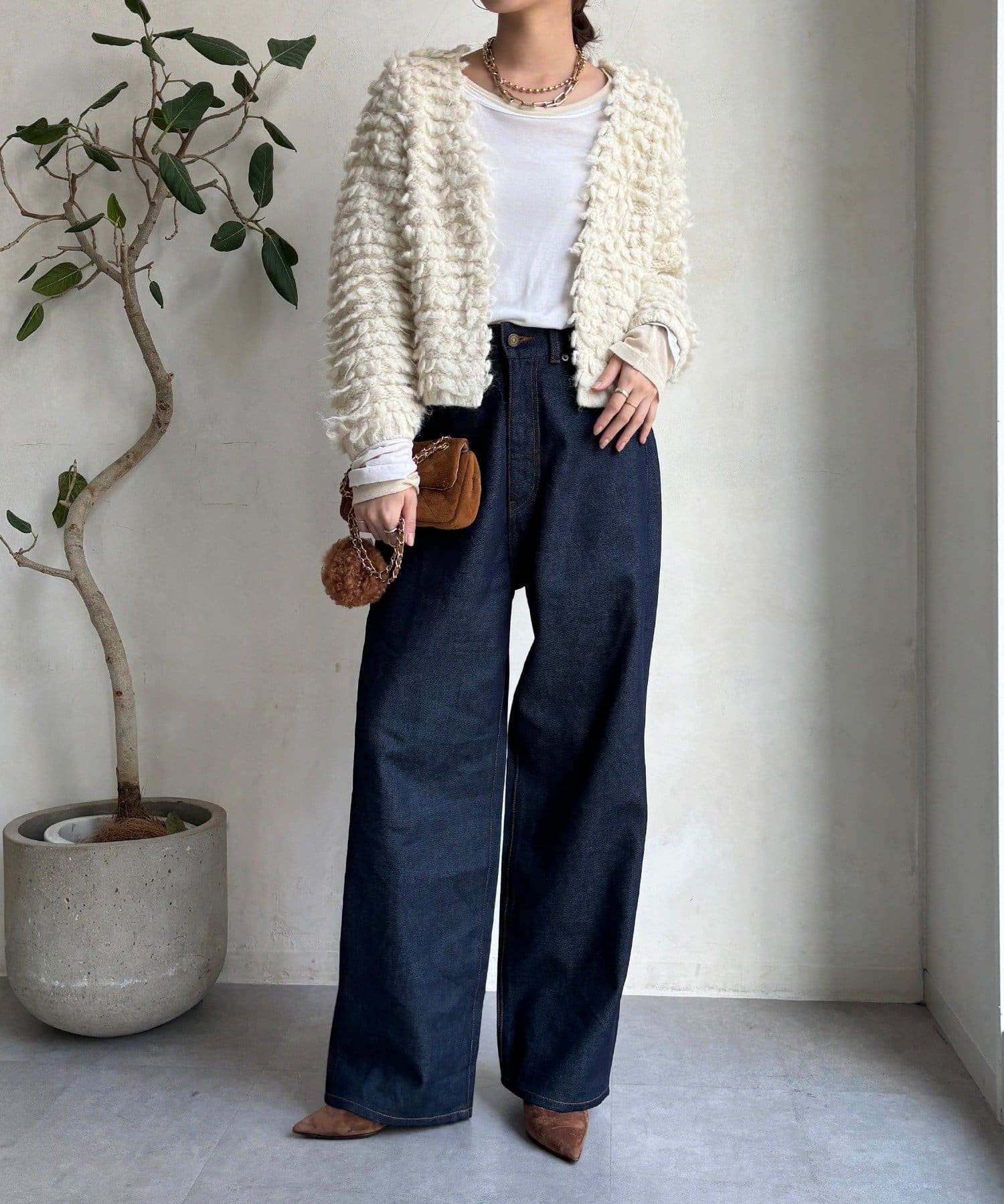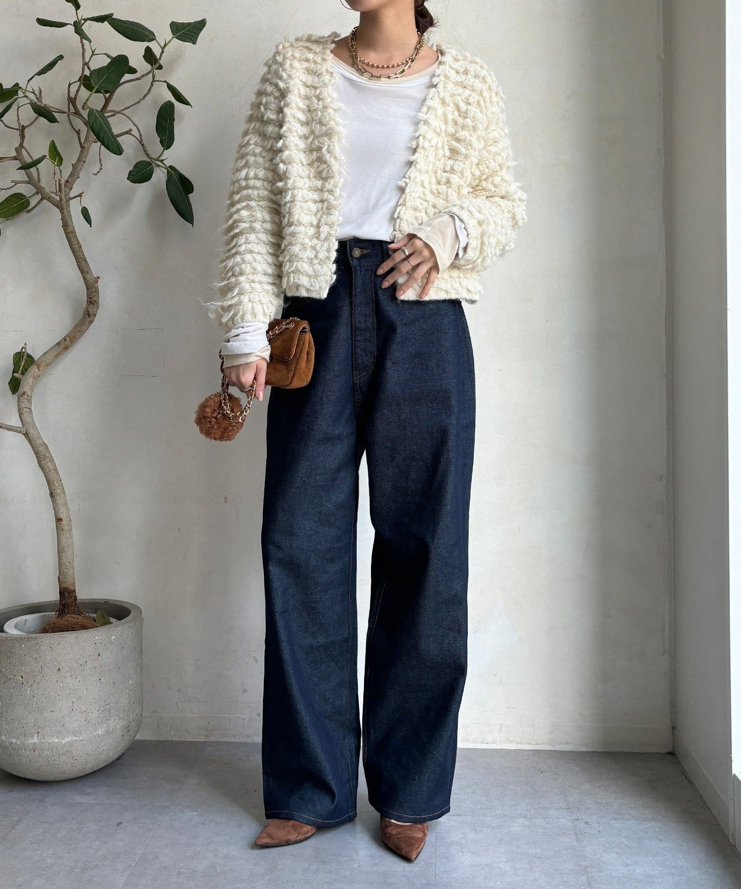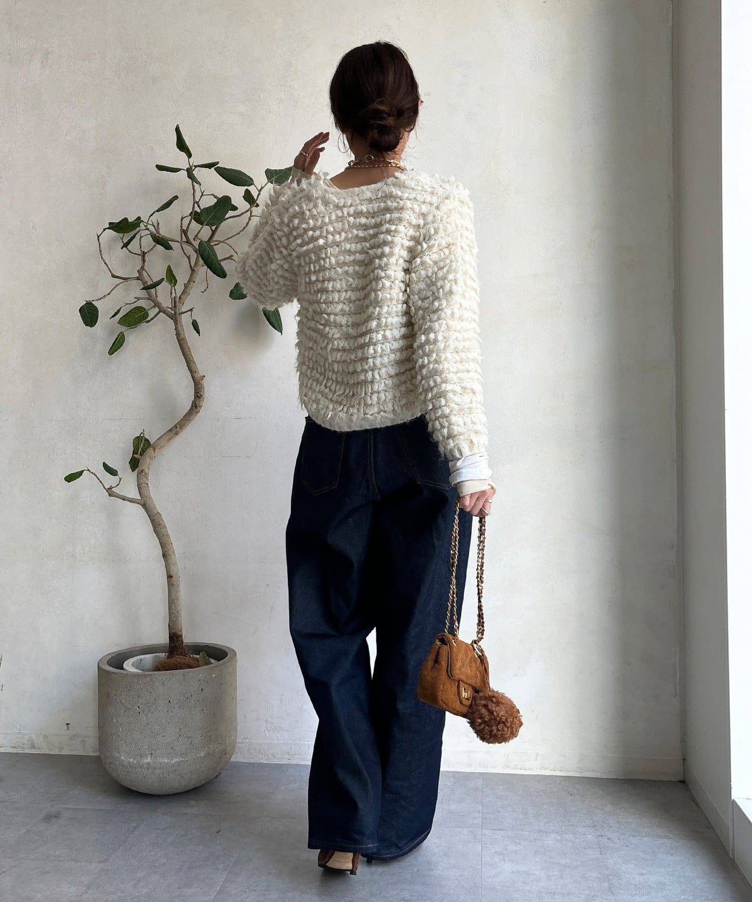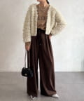 もこもこと愛らしい表面感がポイントのニットジャケット。