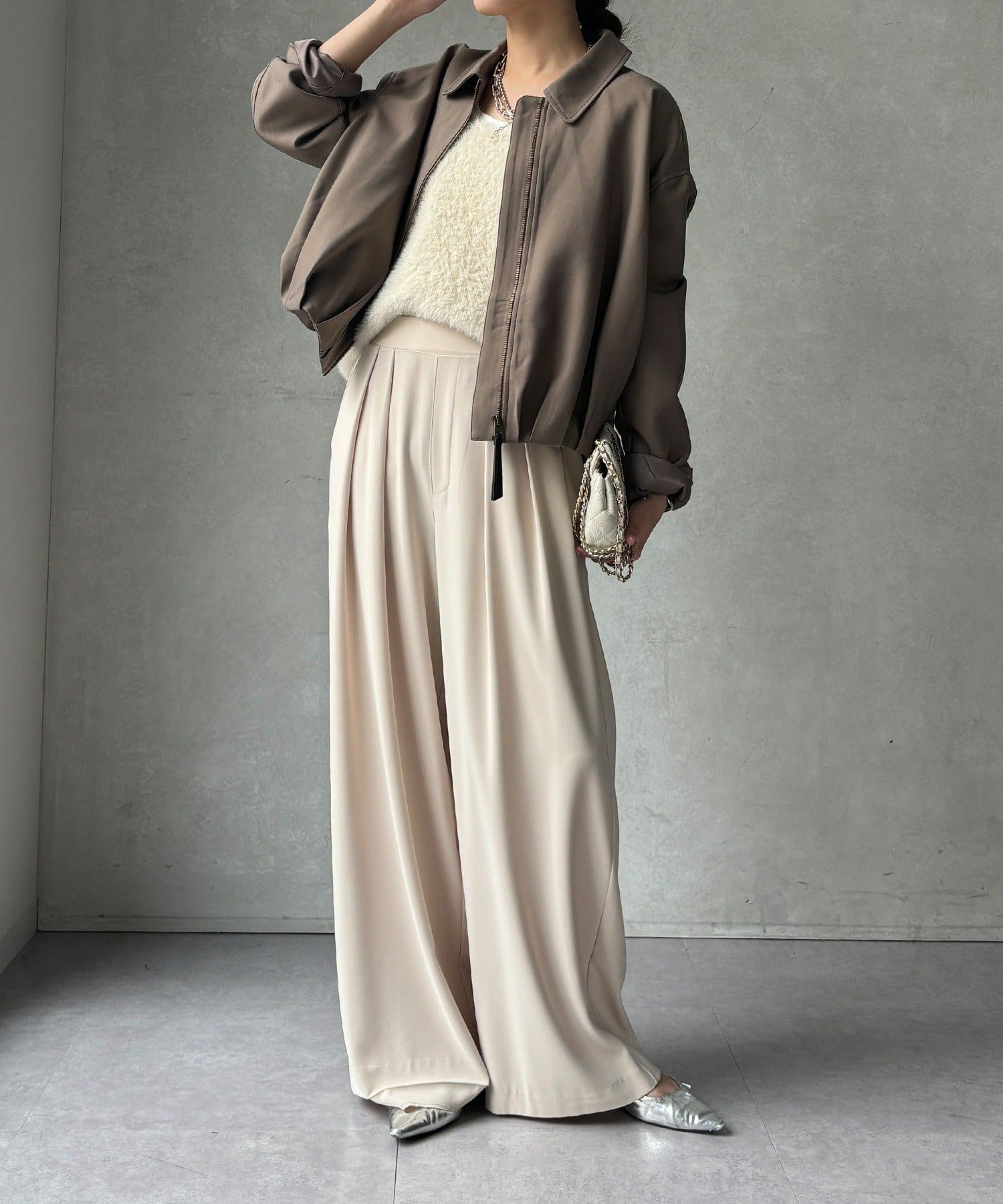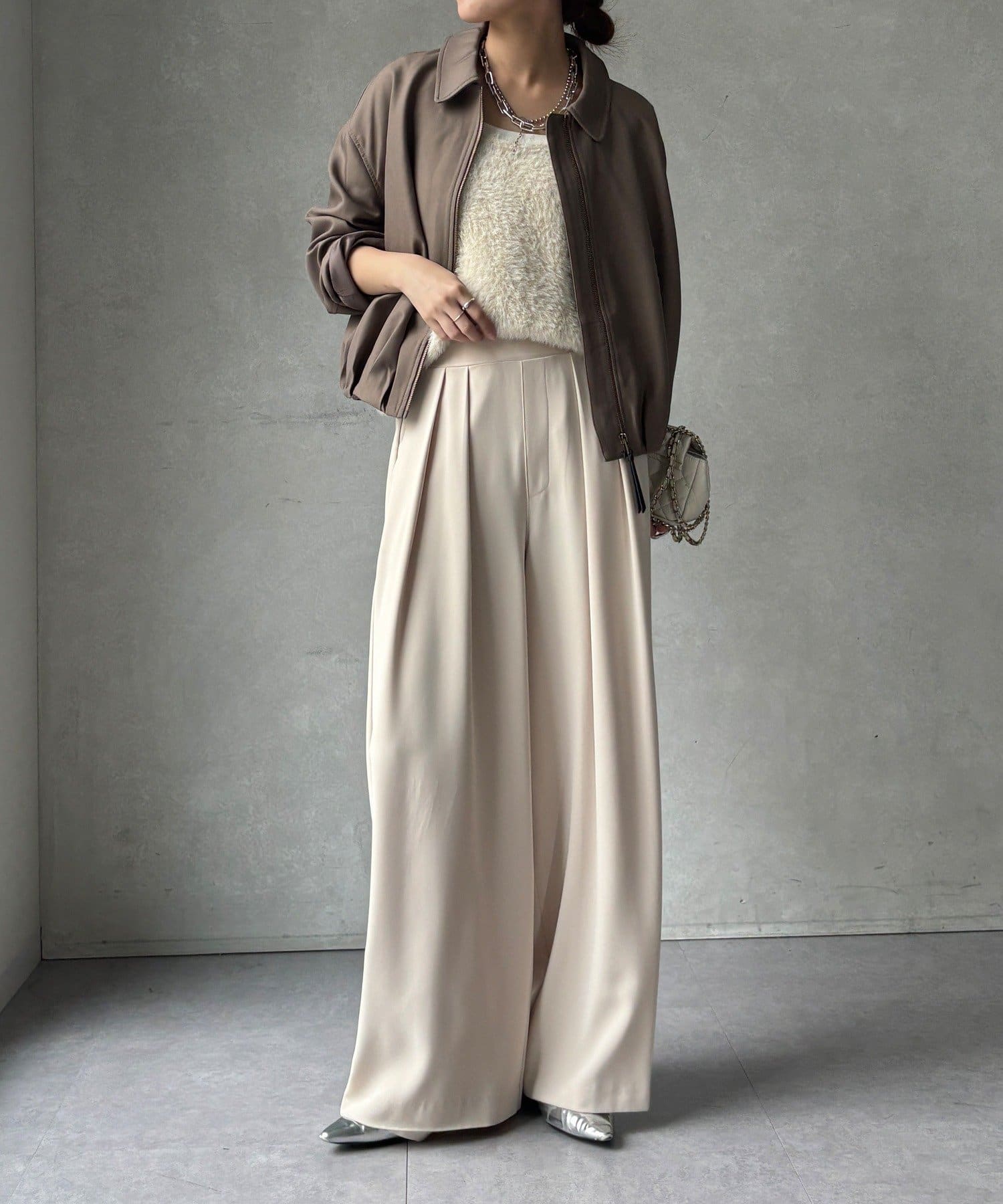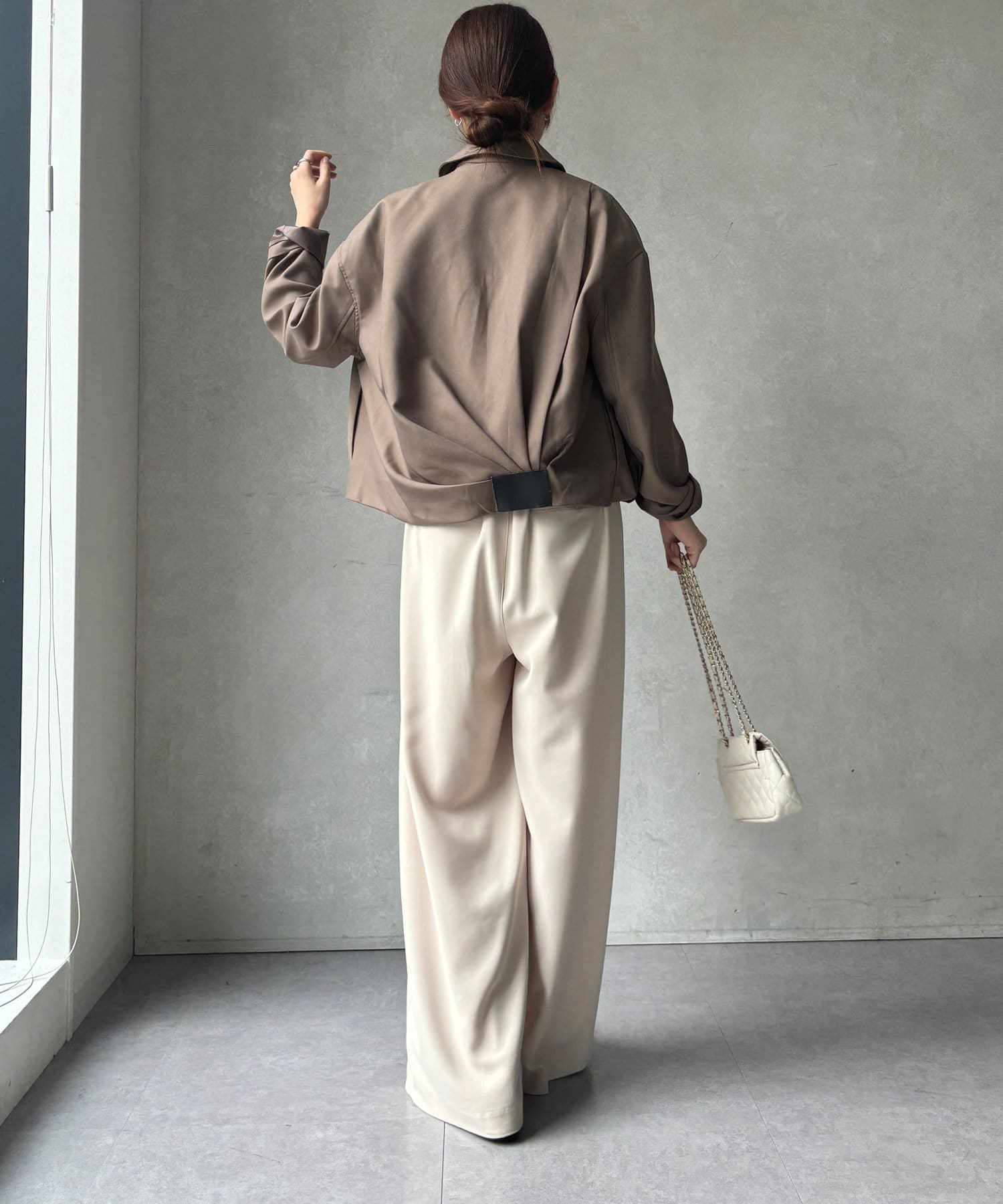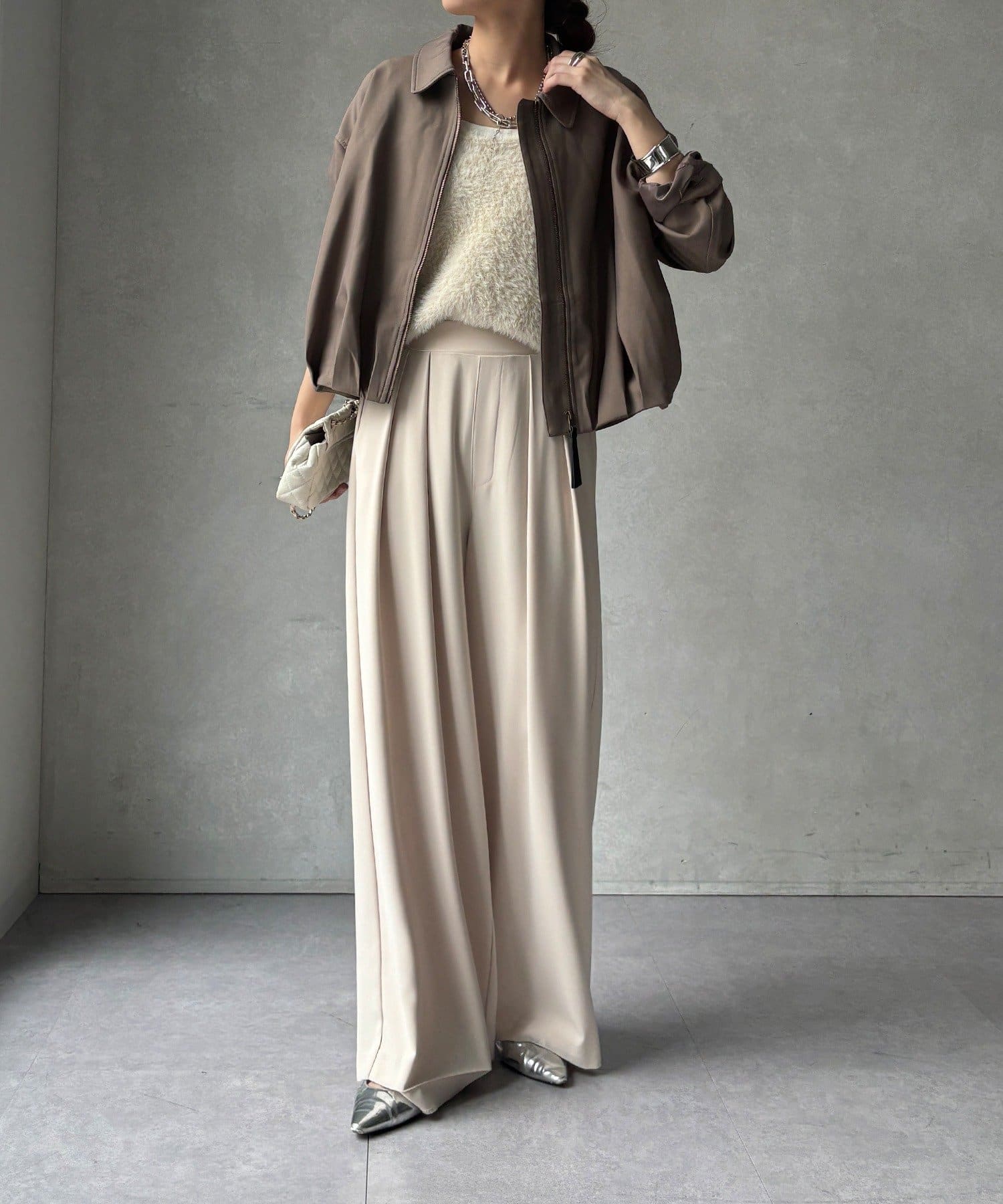 深めのタックを入れることで、ふんわりとしたバルーンシルエットを生み出し、女性らしい丸みをプラスしています。
