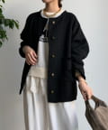 ノーカラーのデザインがお顔周りをすっきりとみせてくれ、ゴールドのボタンがクラシックなポイントに。