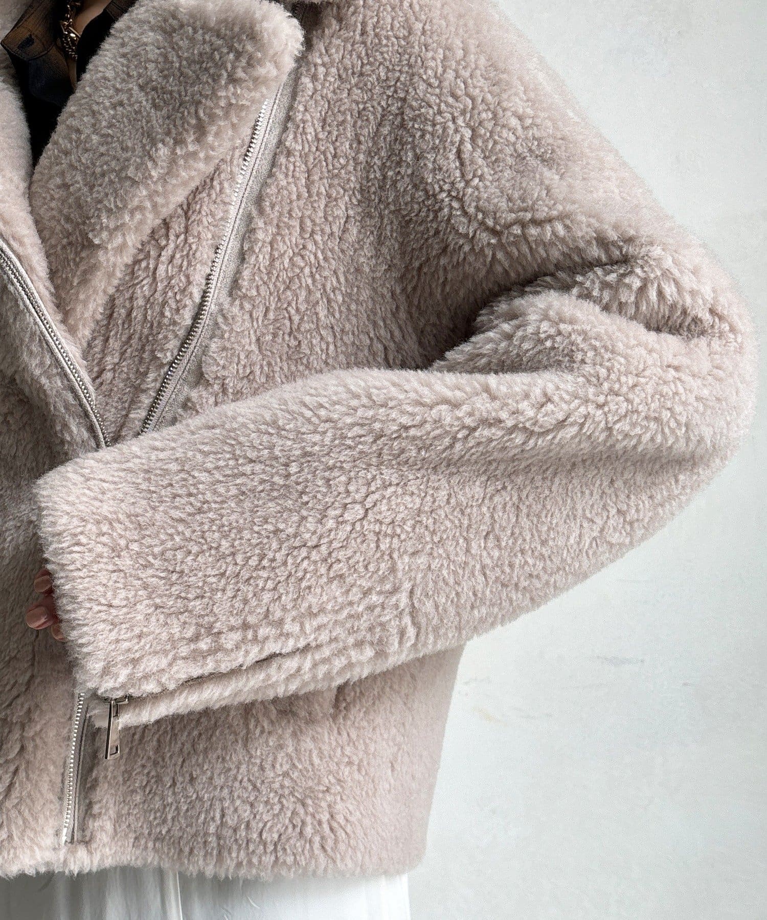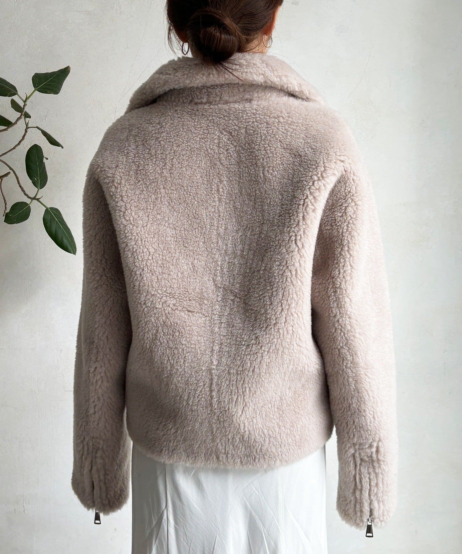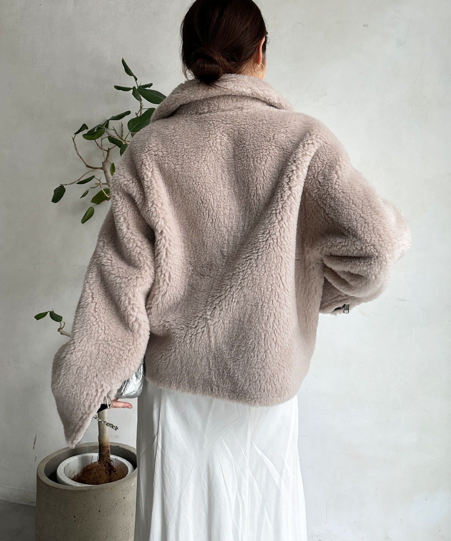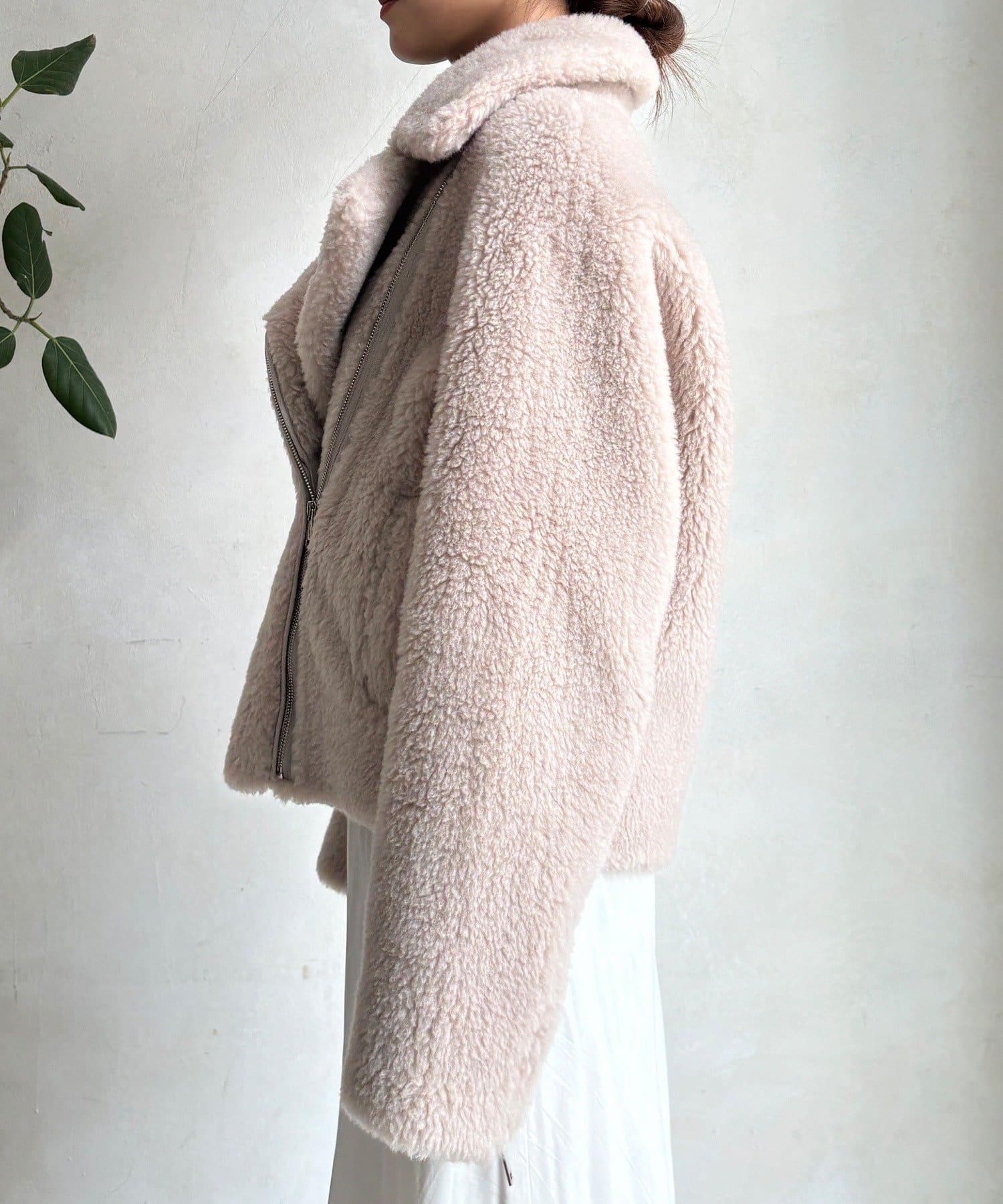 柔らかなボアの素材を使用した、保温性と高級感を兼ね備えたショート丈ジャケット。