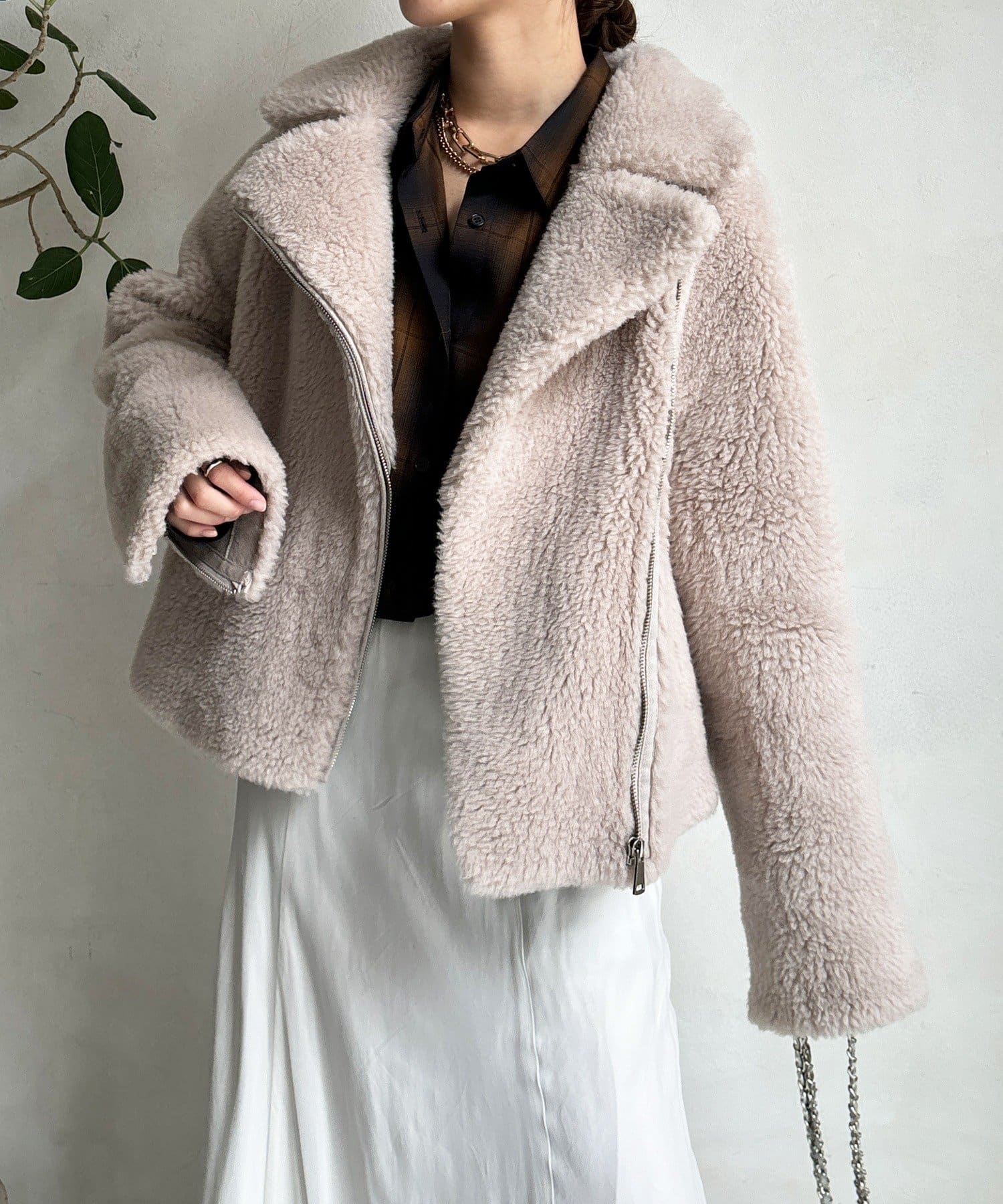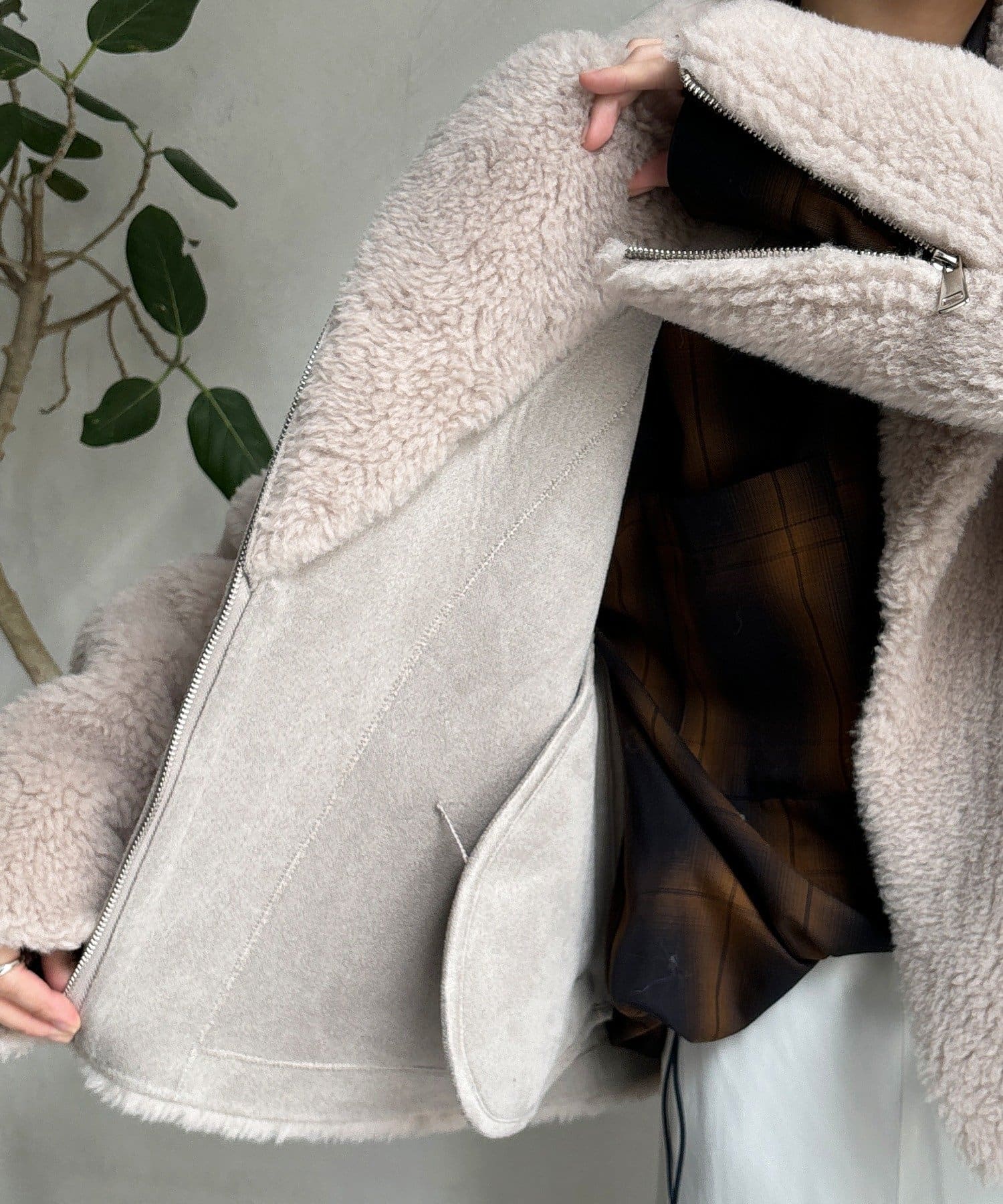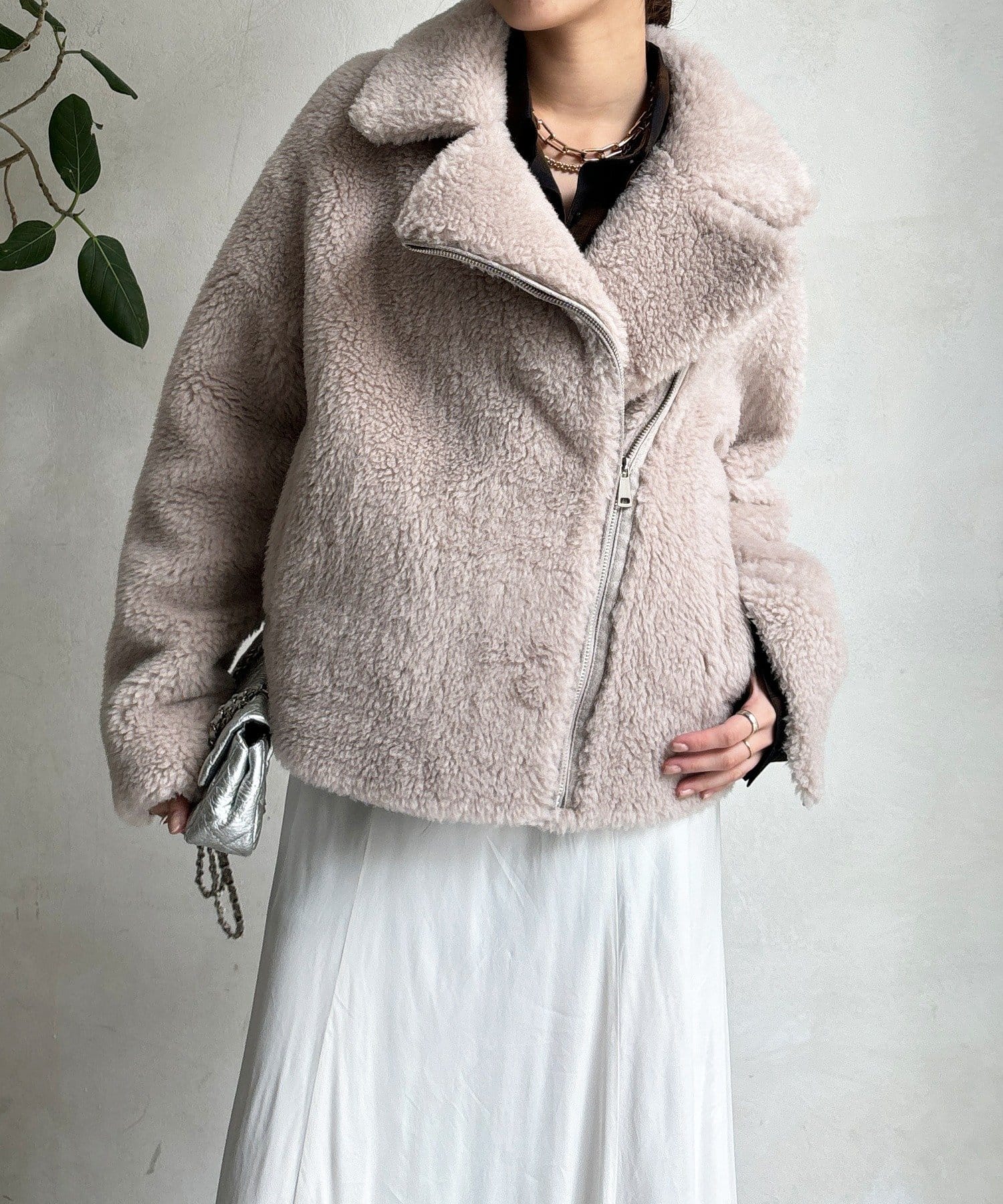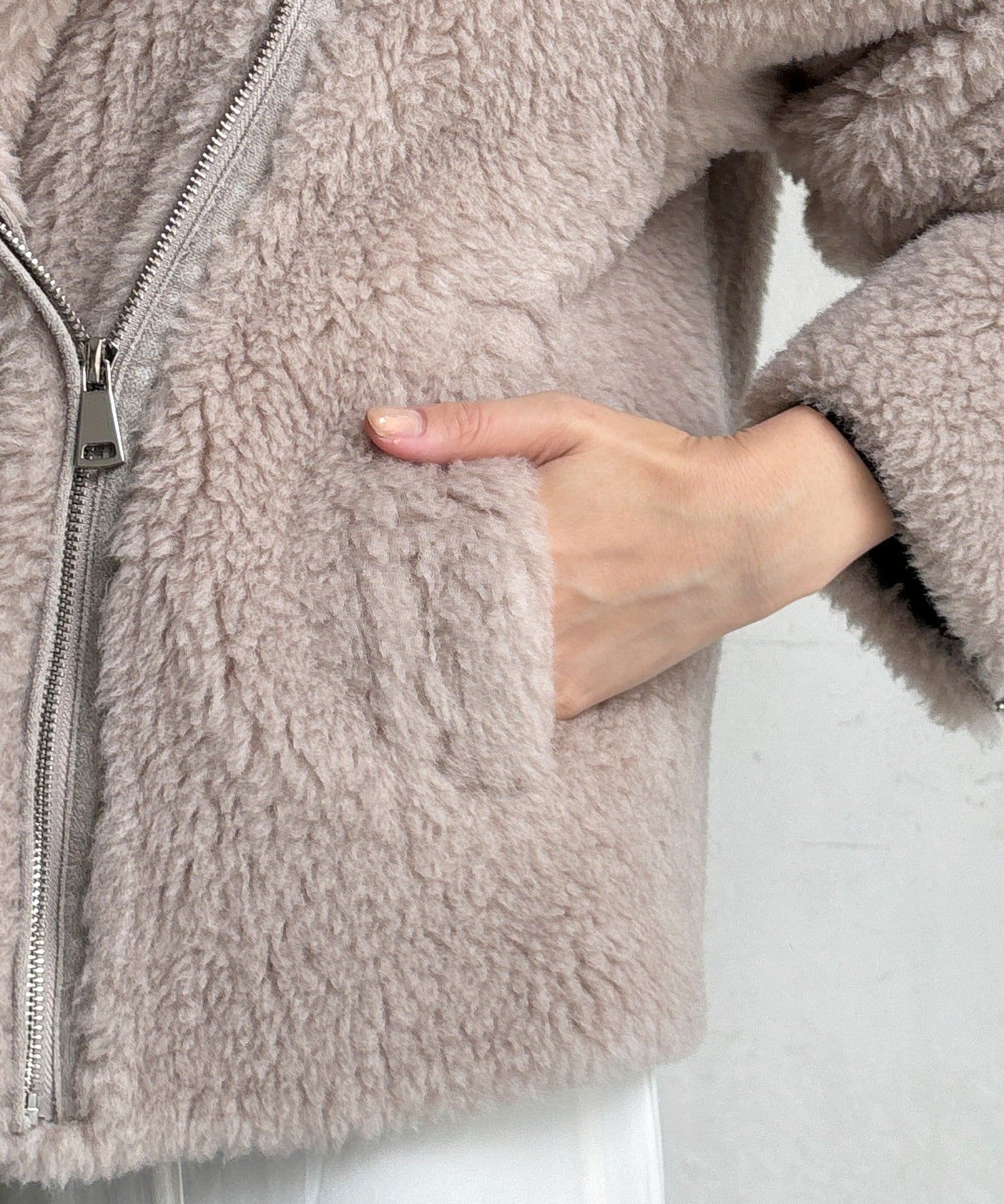 柔らかなボアの素材を使用した、保温性と高級感を兼ね備えたショート丈ジャケット。