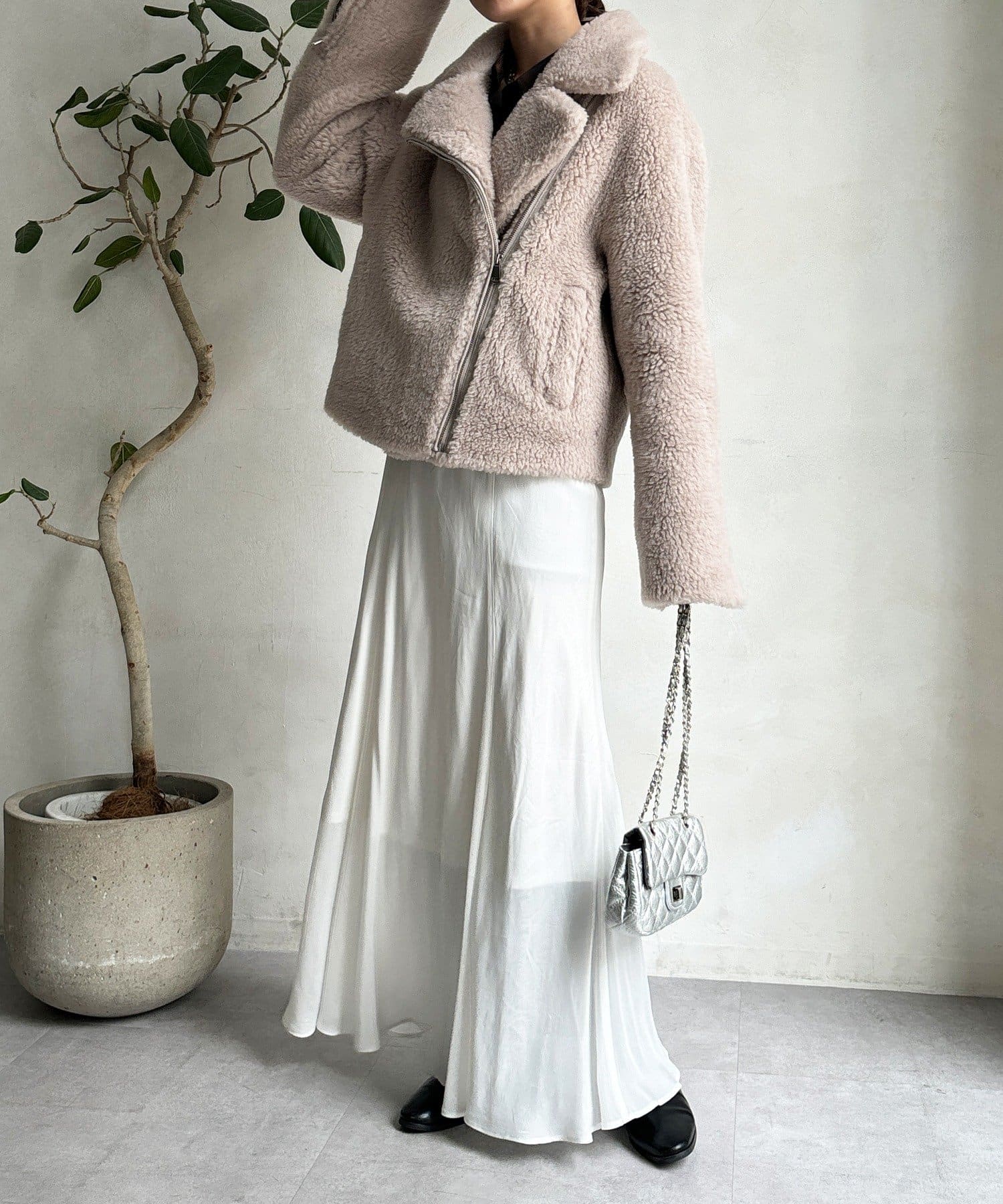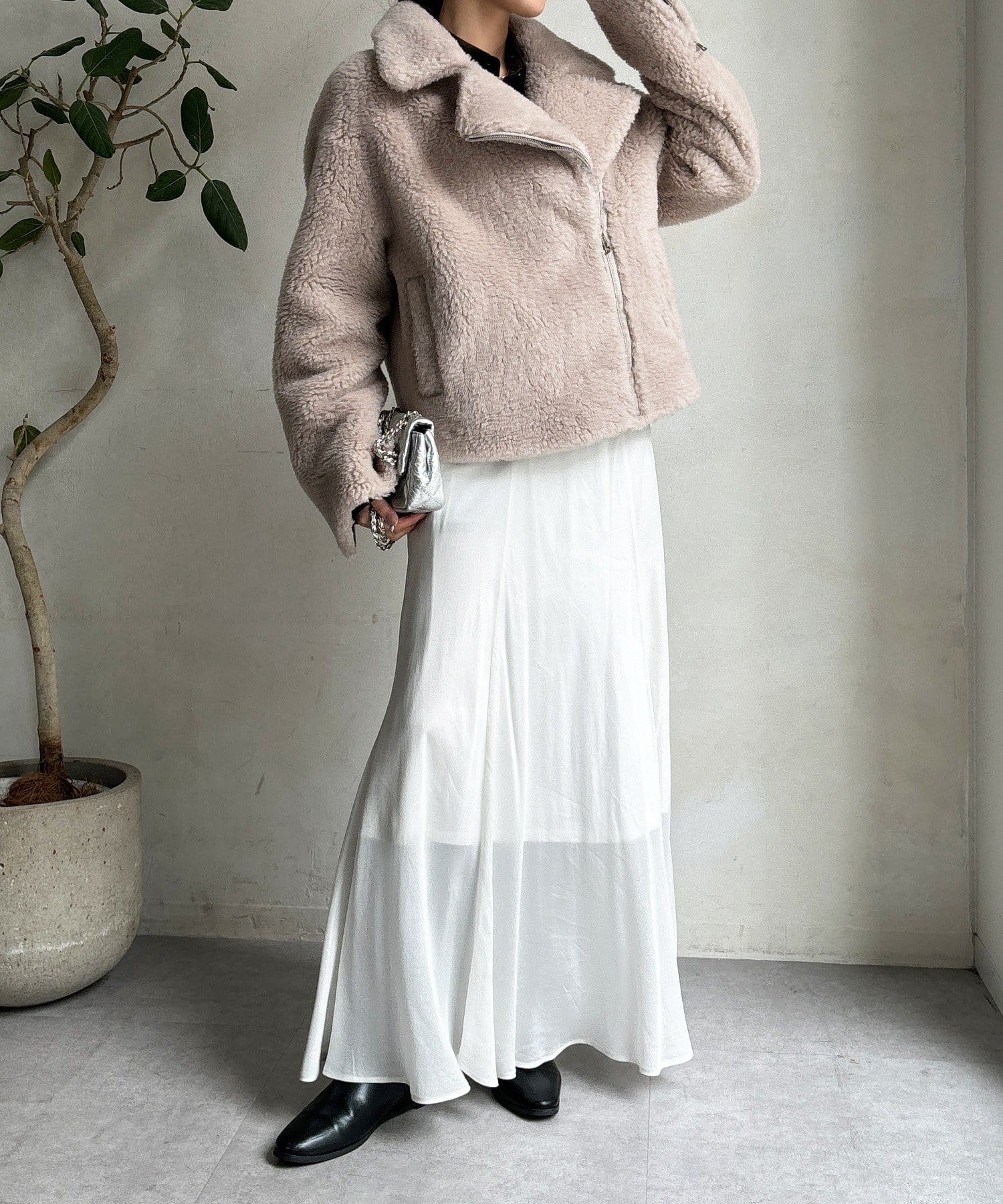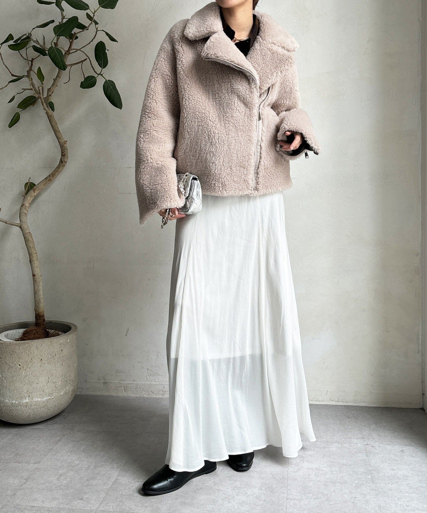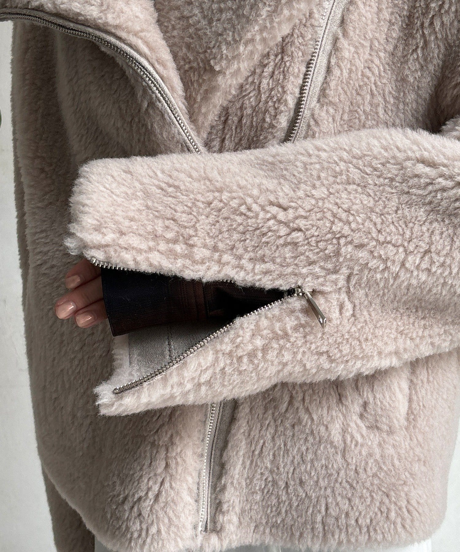 柔らかなボアの素材を使用した、保温性と高級感を兼ね備えたショート丈ジャケット。