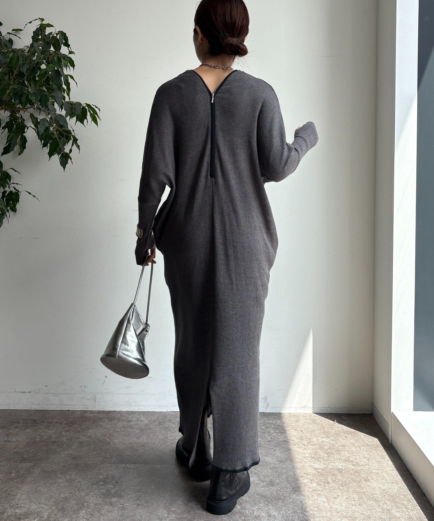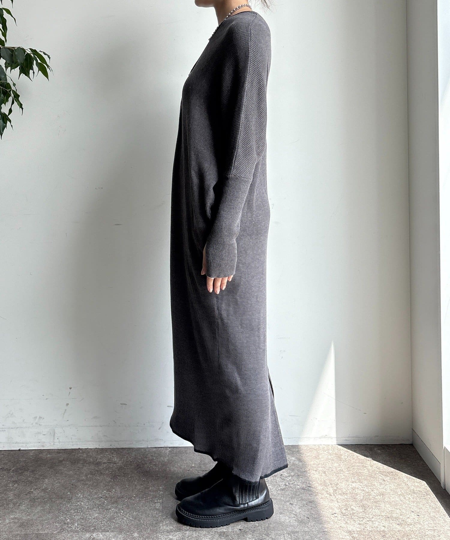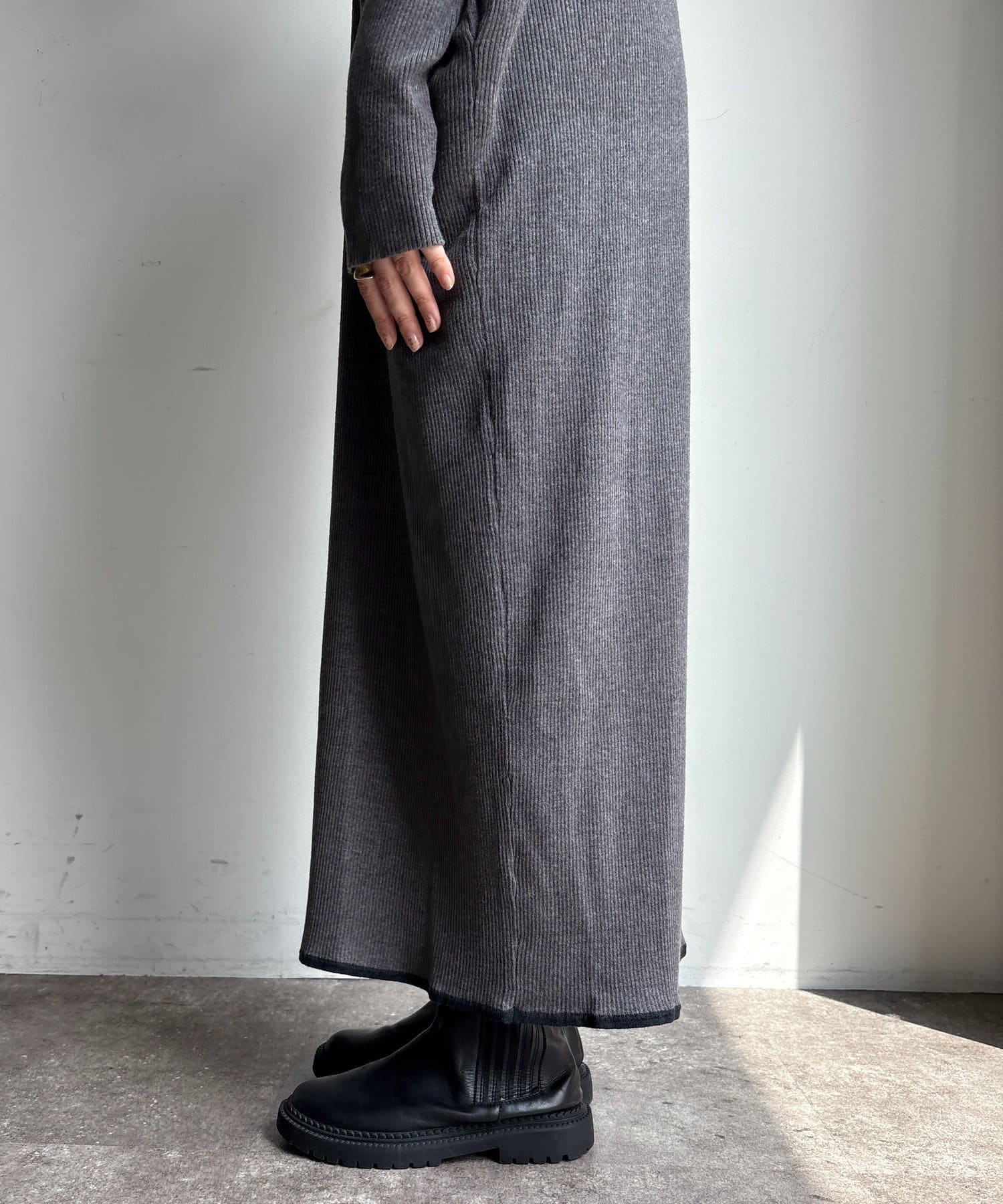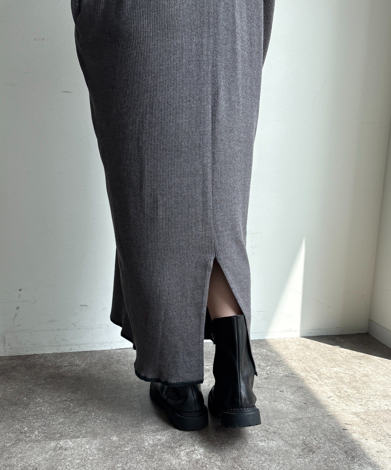 足元にはスリットが入っているので、ロング丈でも重たく見えず、デザインと歩きやすさを両立。
