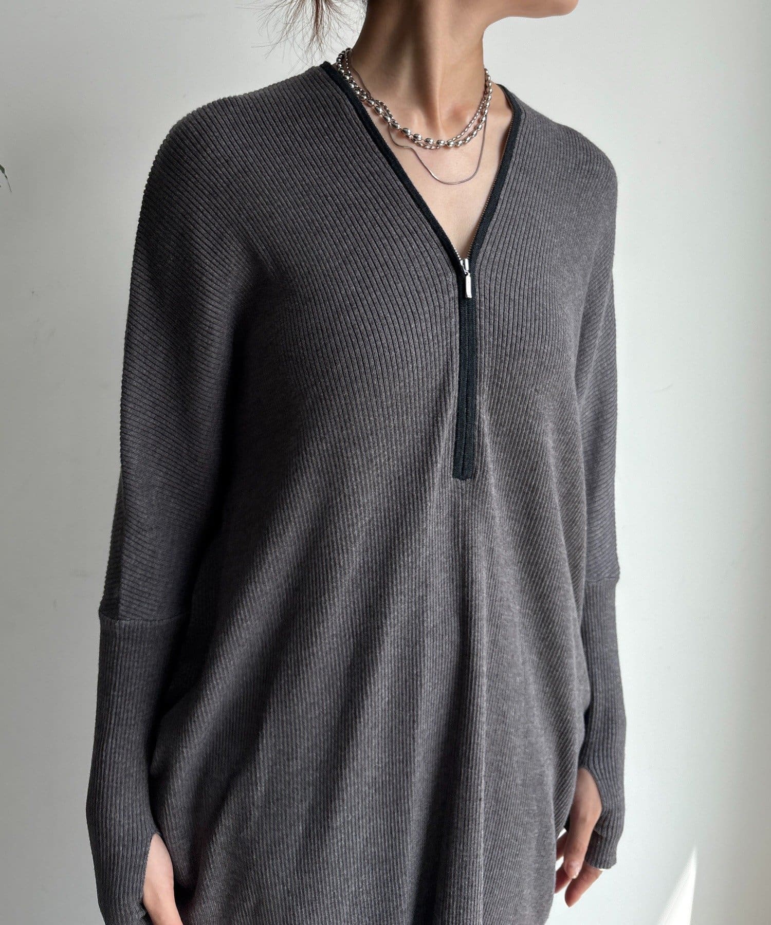 身体のラインを美しく魅せるリブ編み素材に、前後どちらから見ても抜かりないジップデザインが映える1枚!