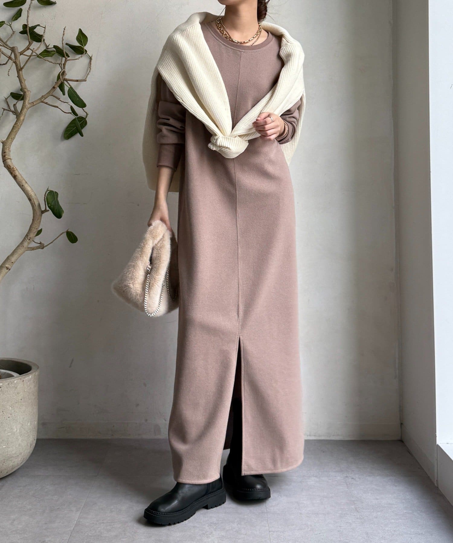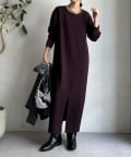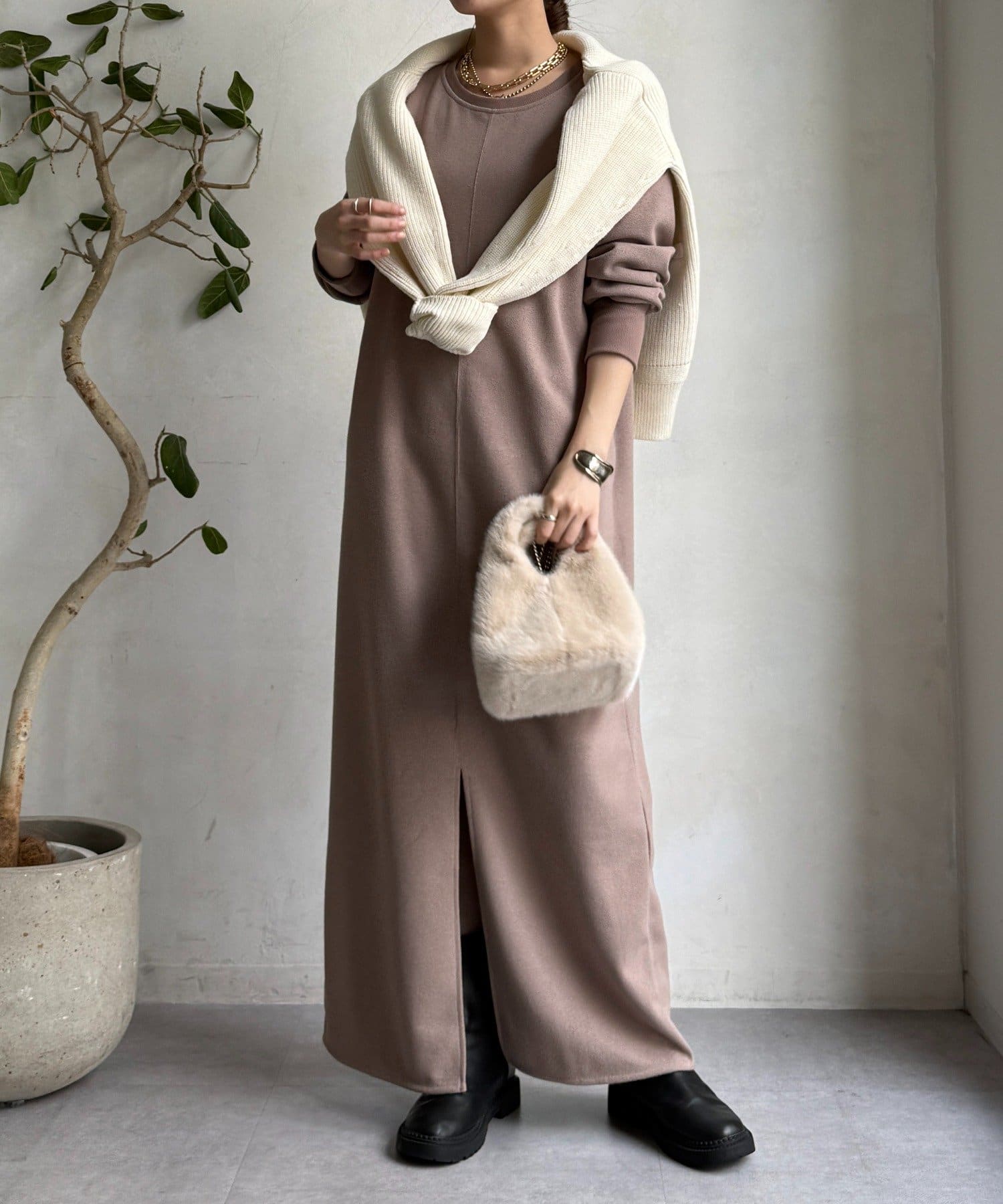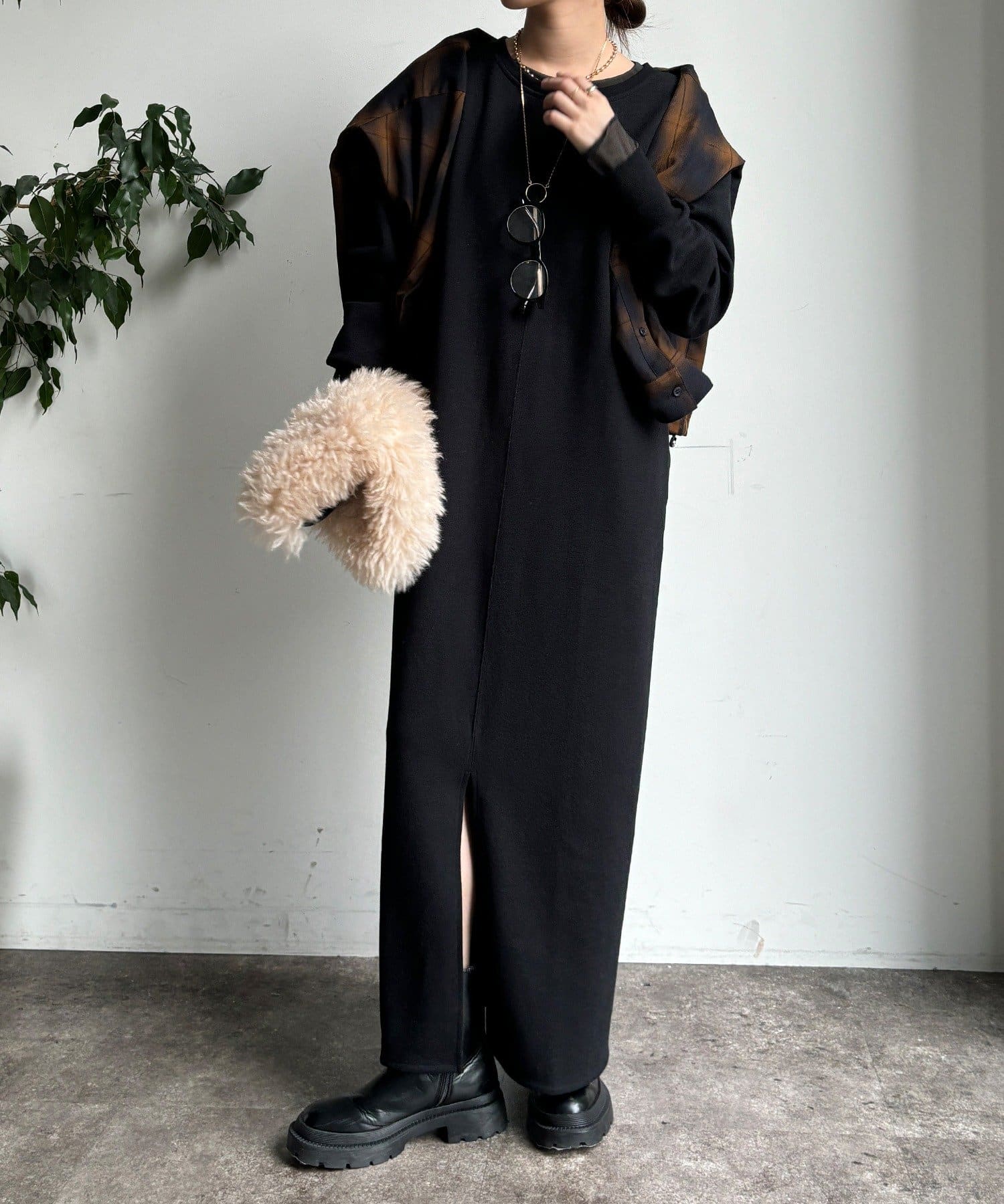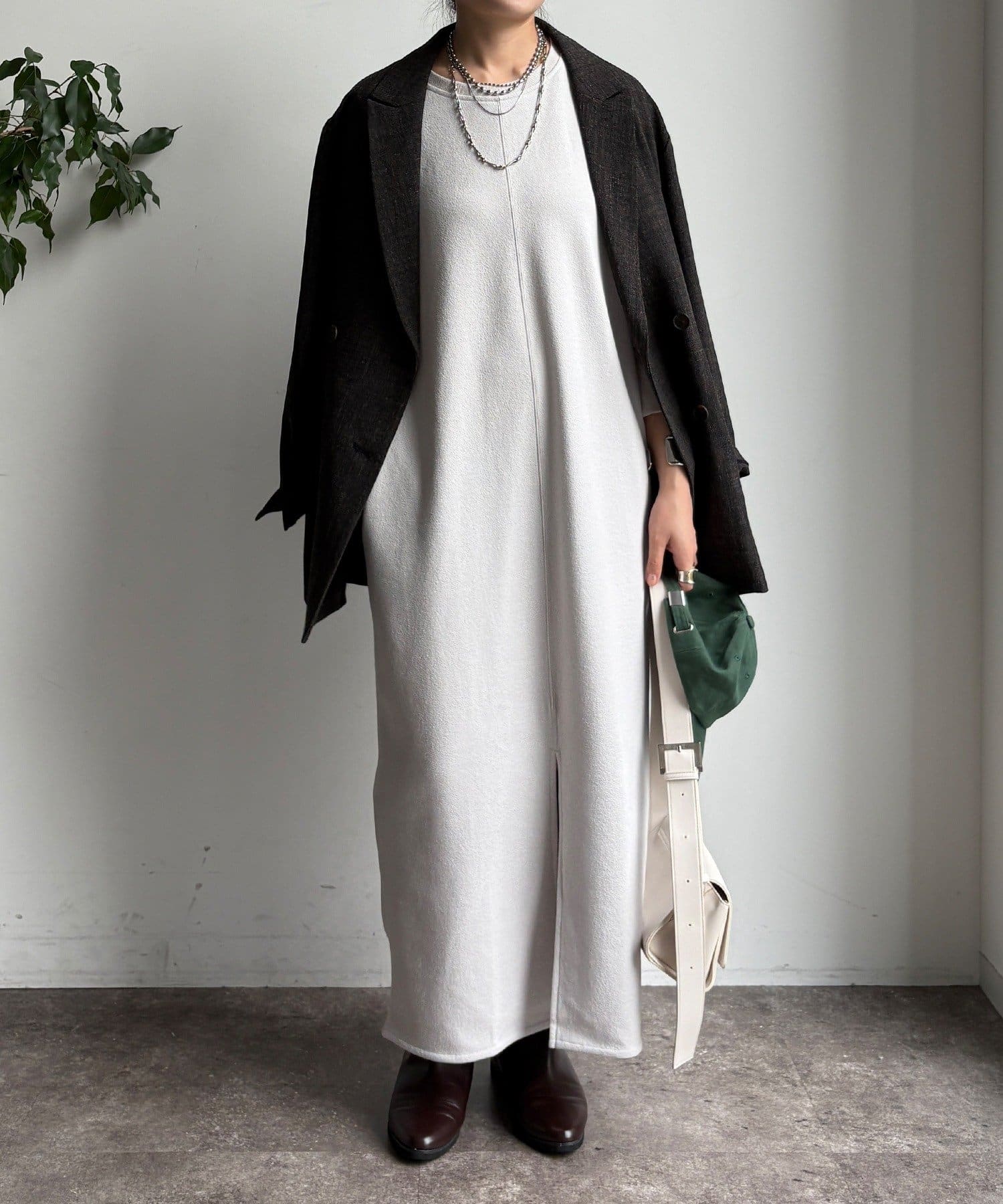 フロント裾にはスリットをプラスすることで、ロング丈のワンピースながらも重たい印象にならずに決まります。