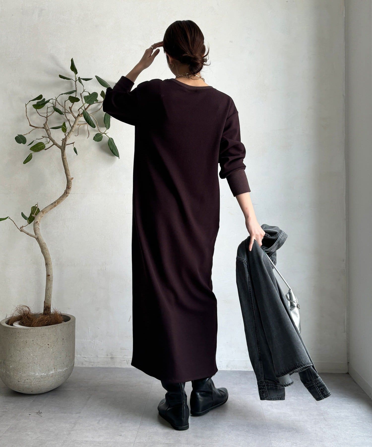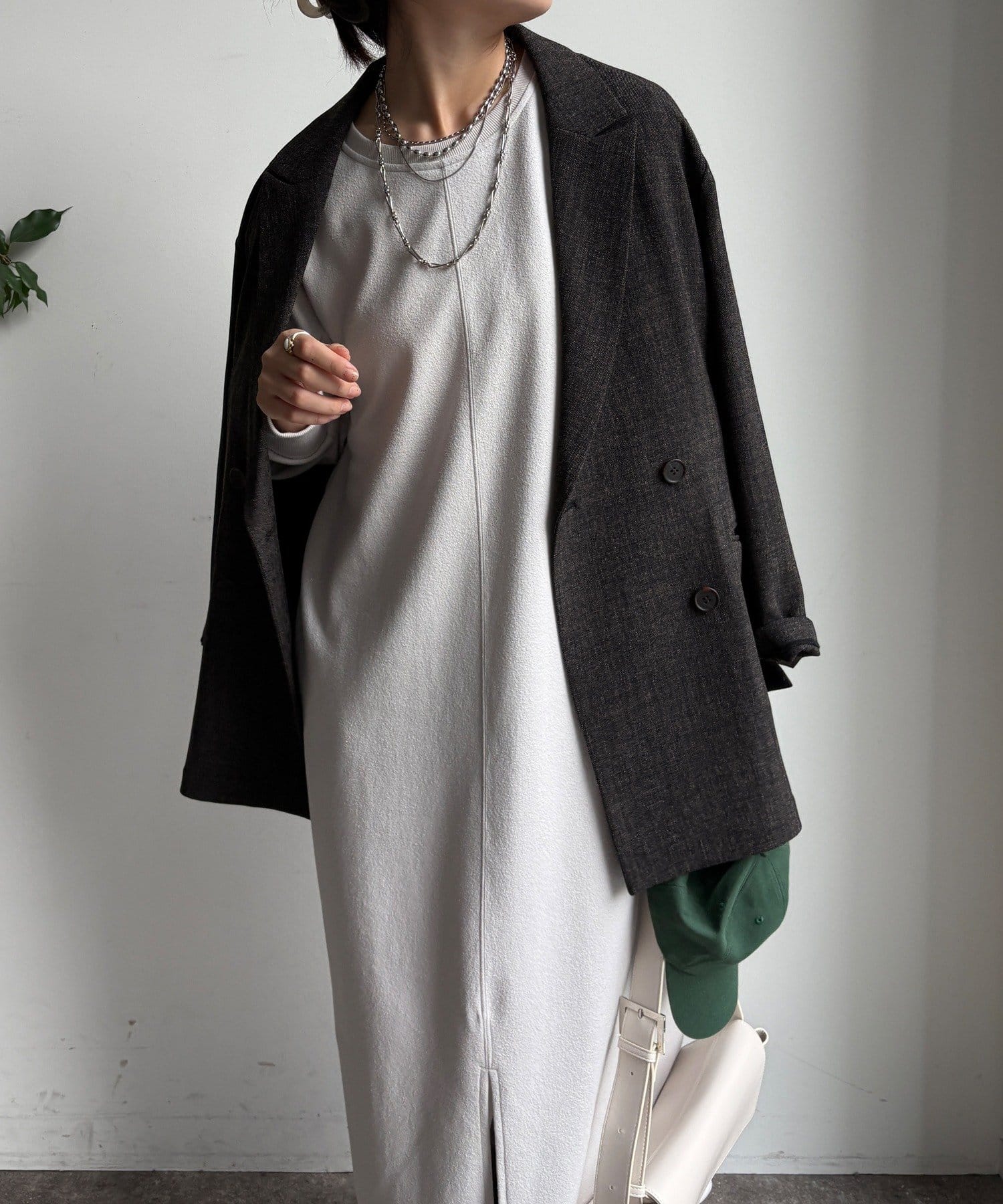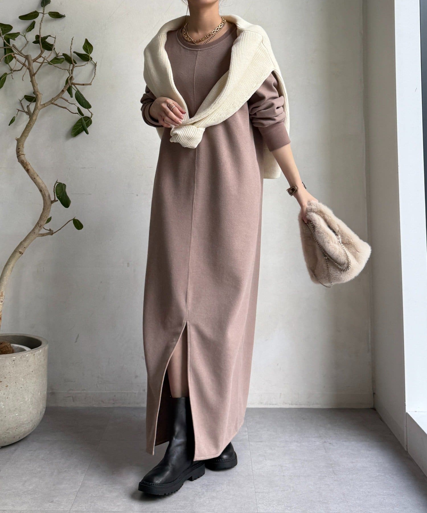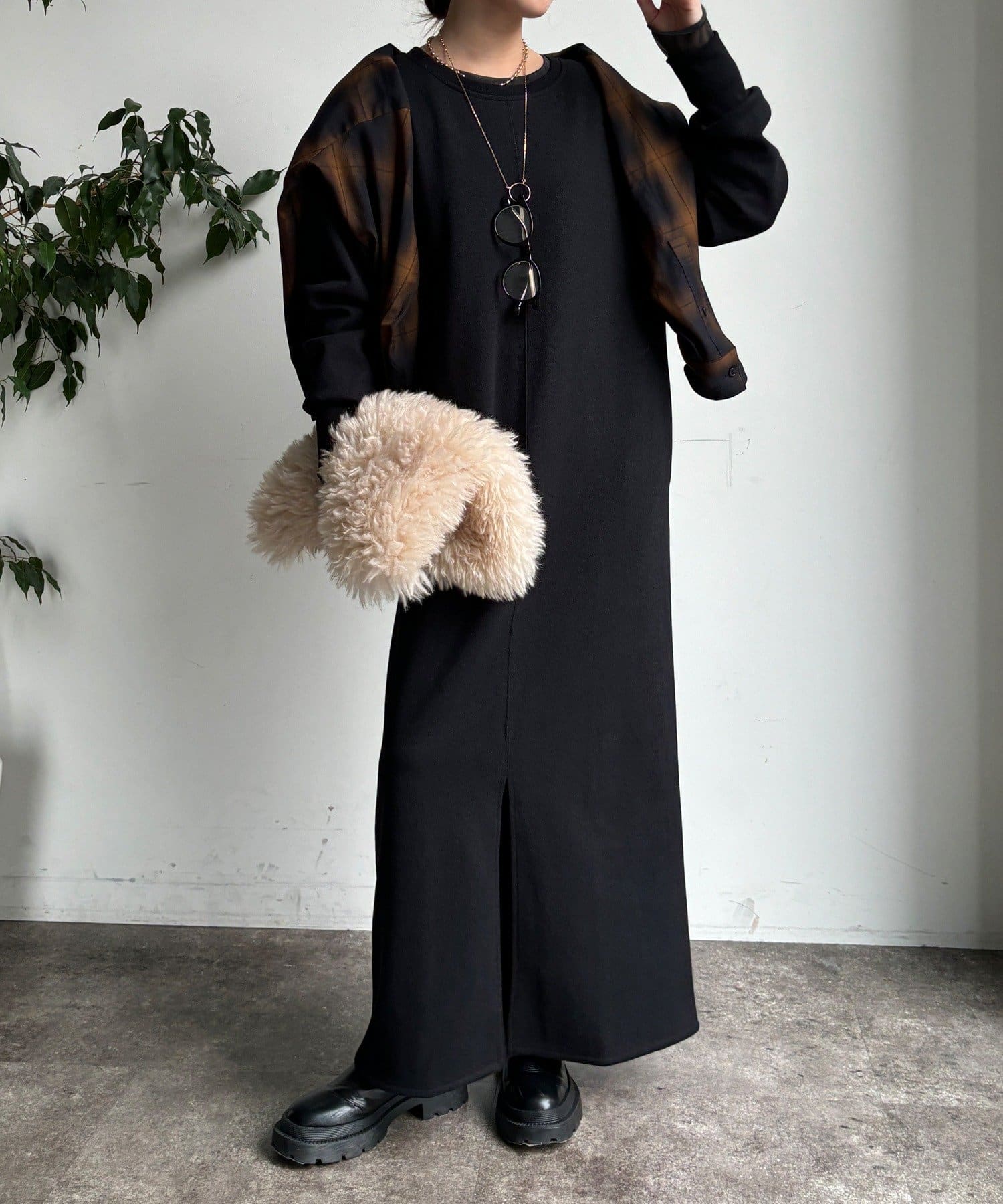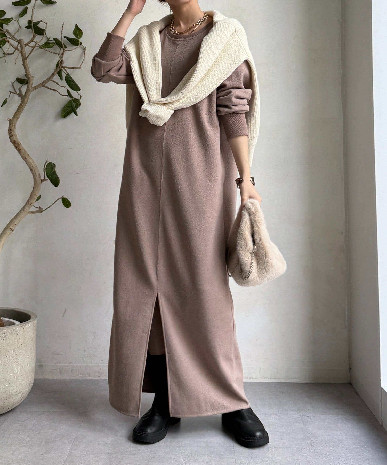 フロント裾にはスリットをプラスすることで、ロング丈のワンピースながらも重たい印象にならずに決まります。