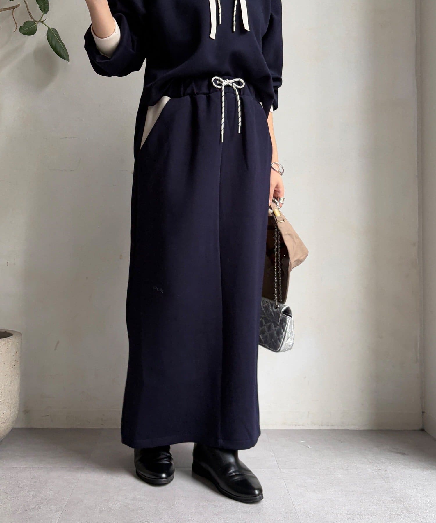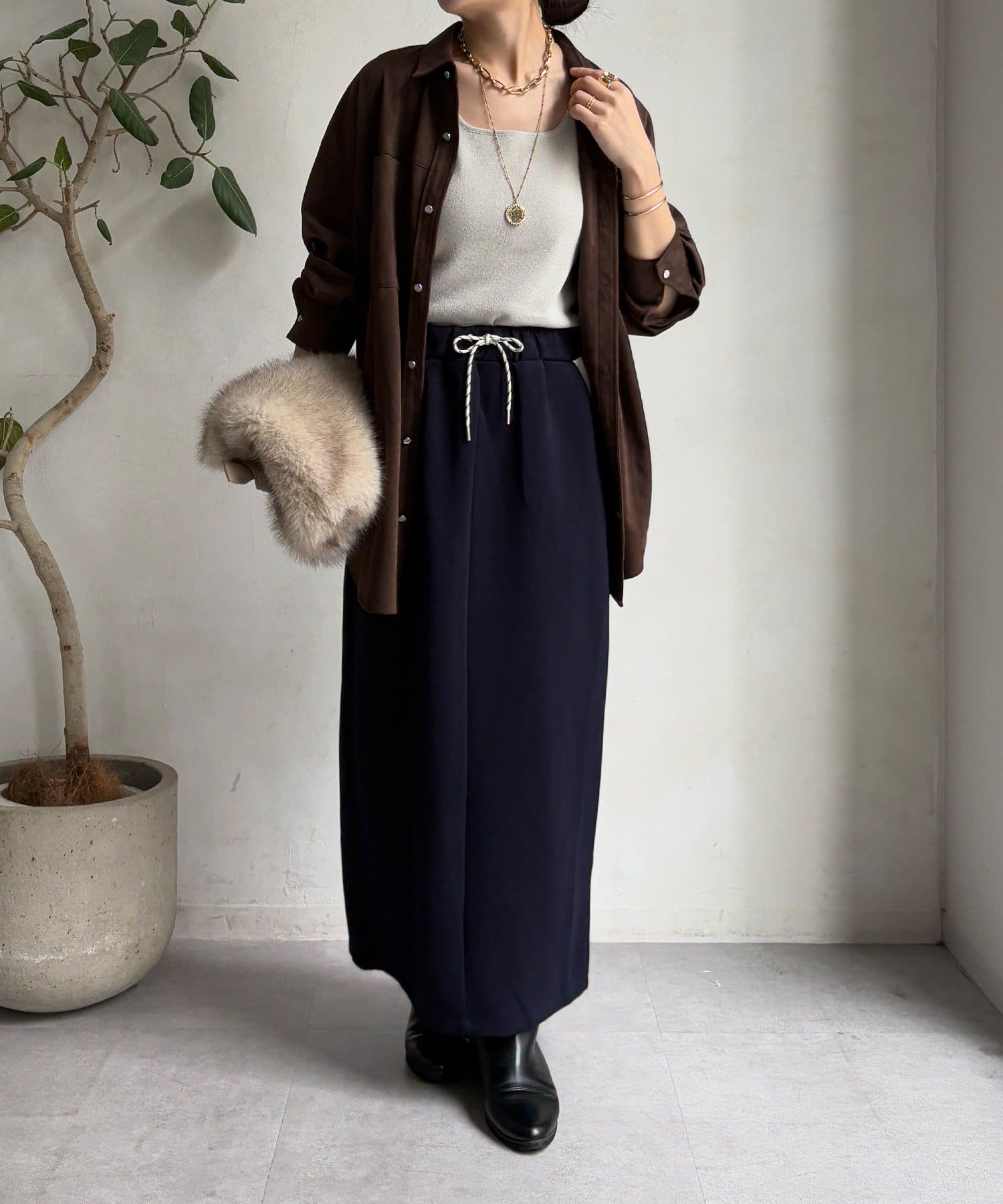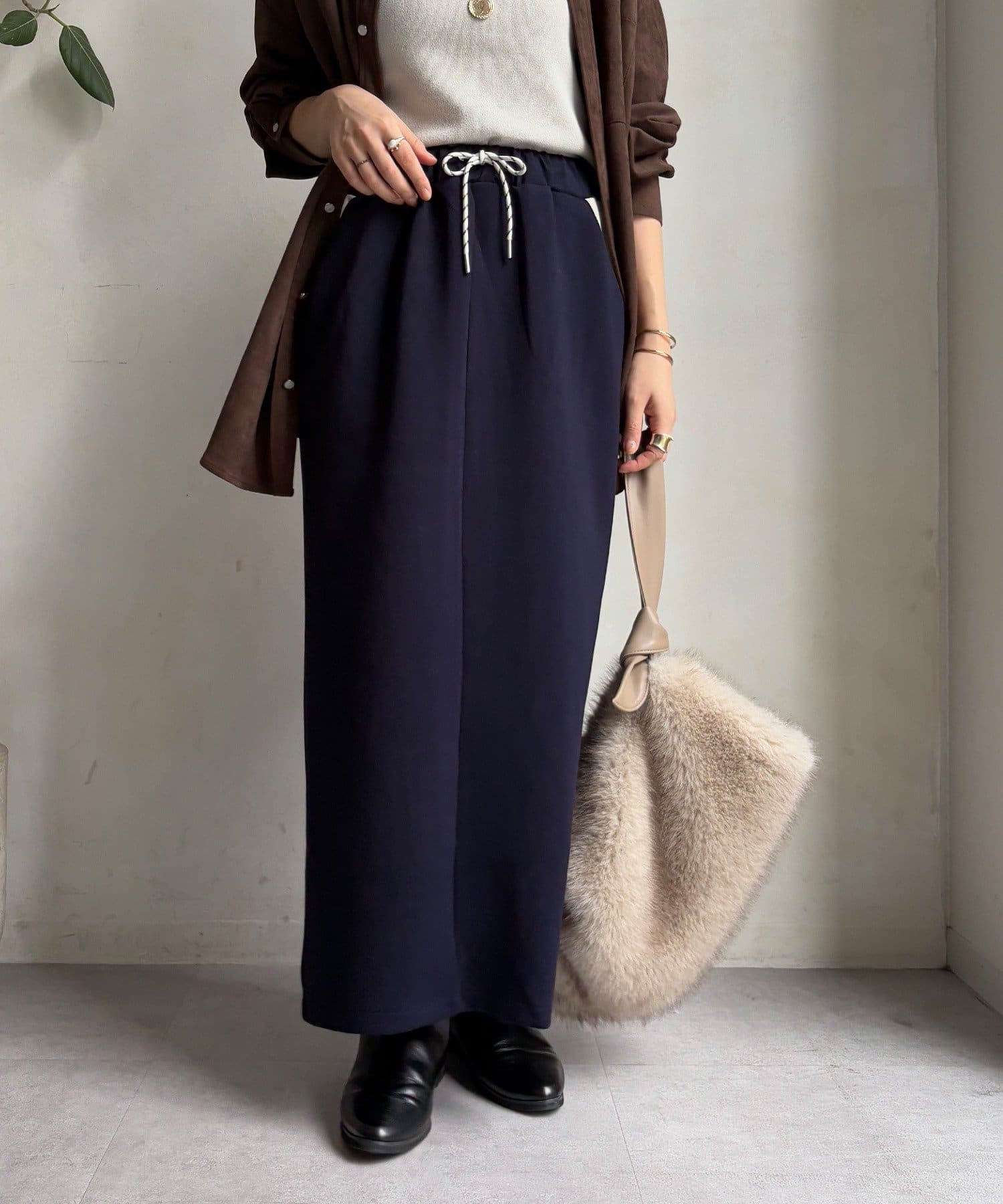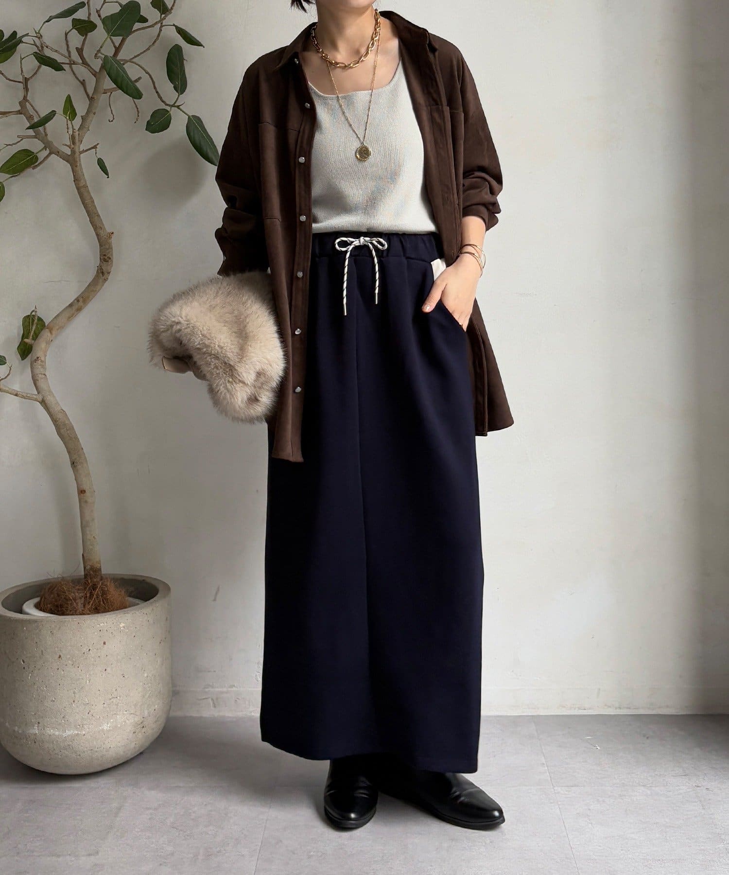 同素材のトップスやアウターとセットアップで揃えれば、旬なスタイルが簡単に完成しますよ。