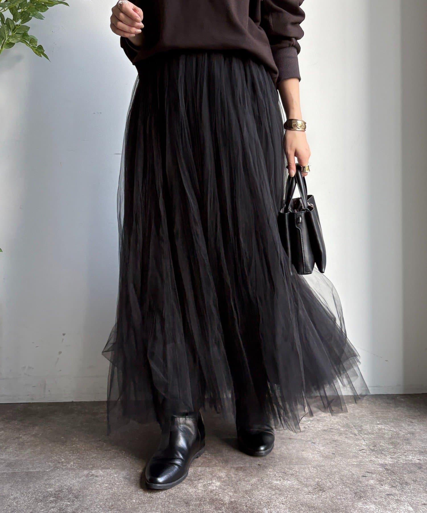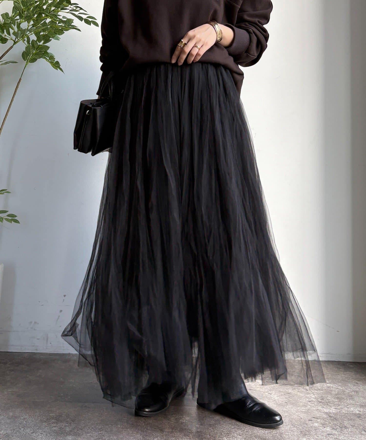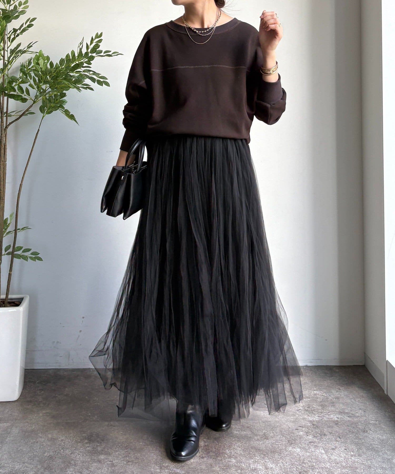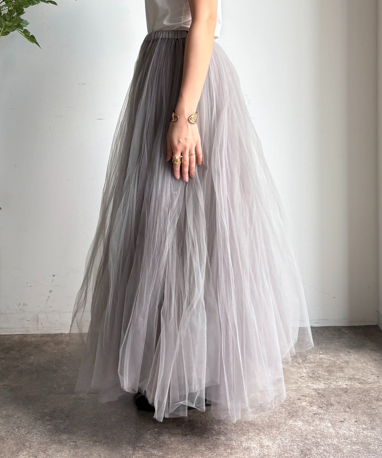繊細なチュールを重ね、甘すぎない洗練された大人の印象に。