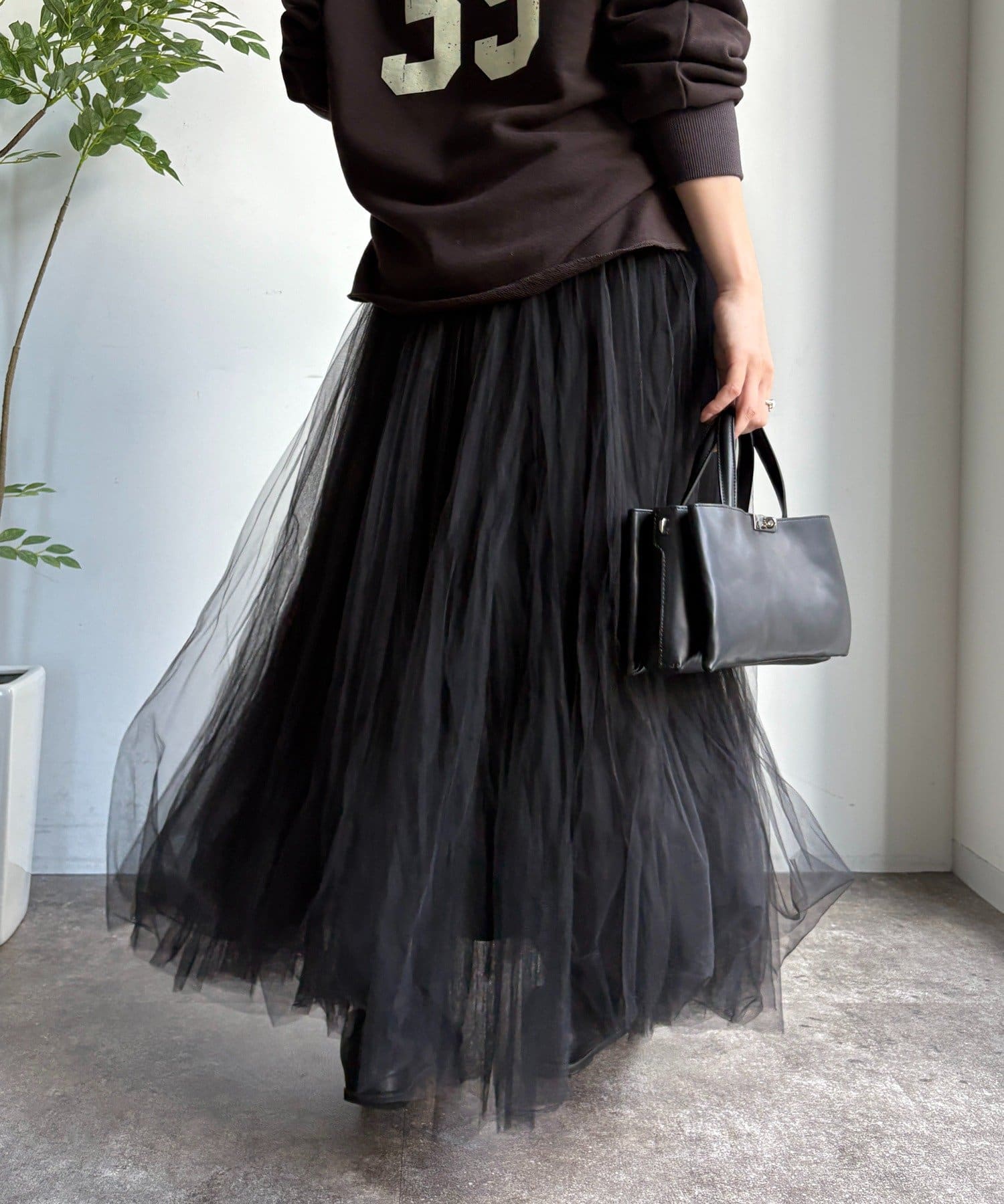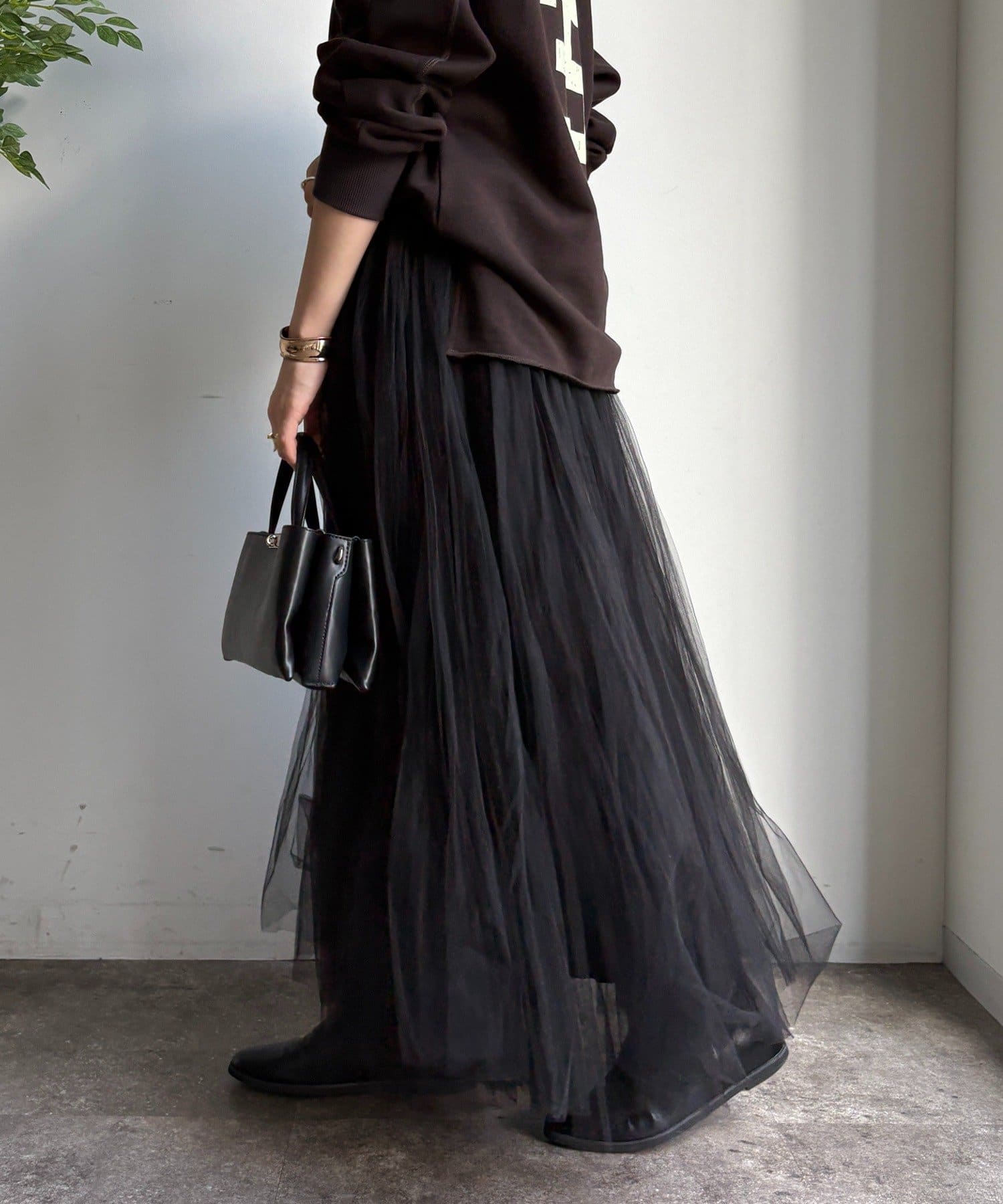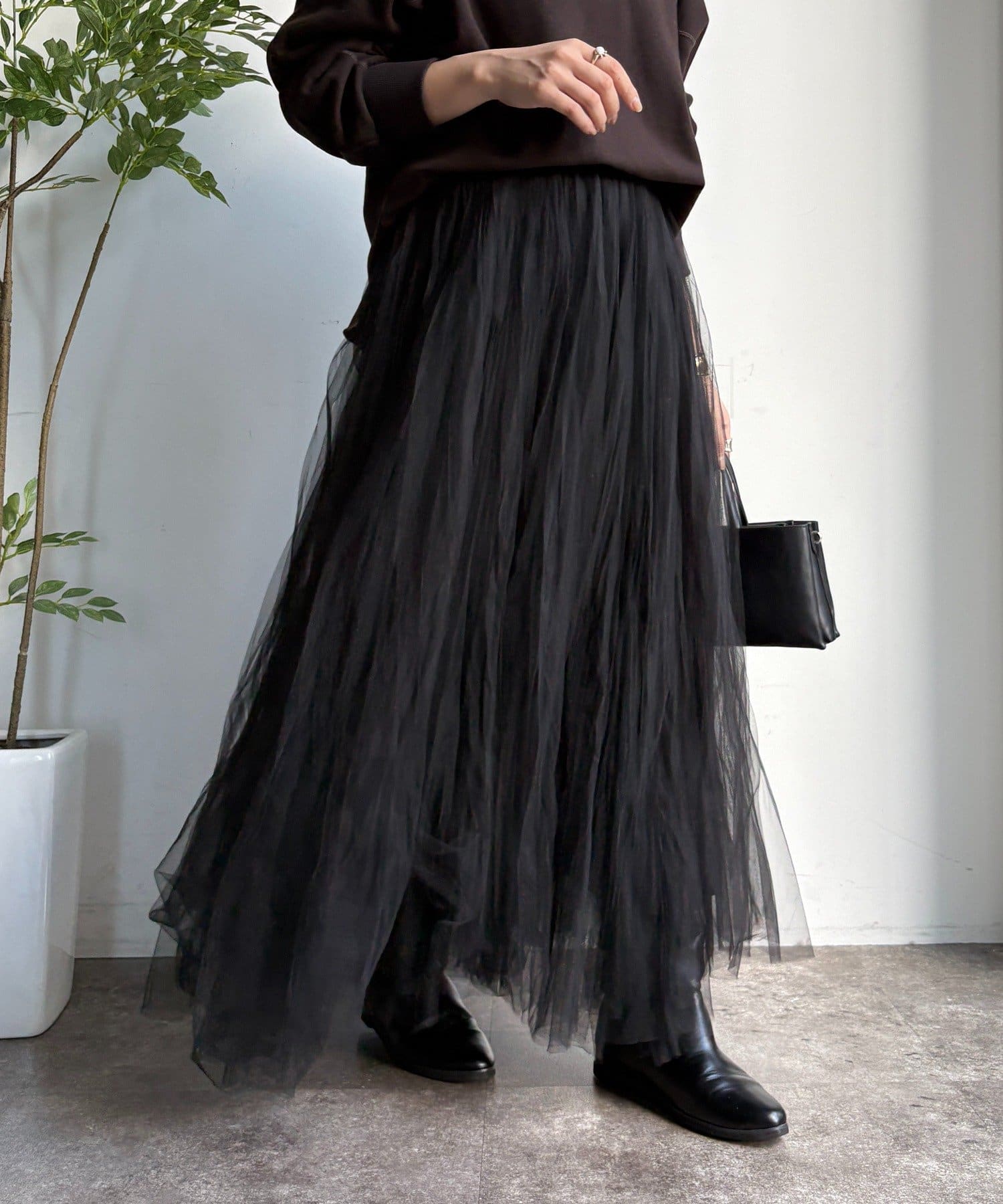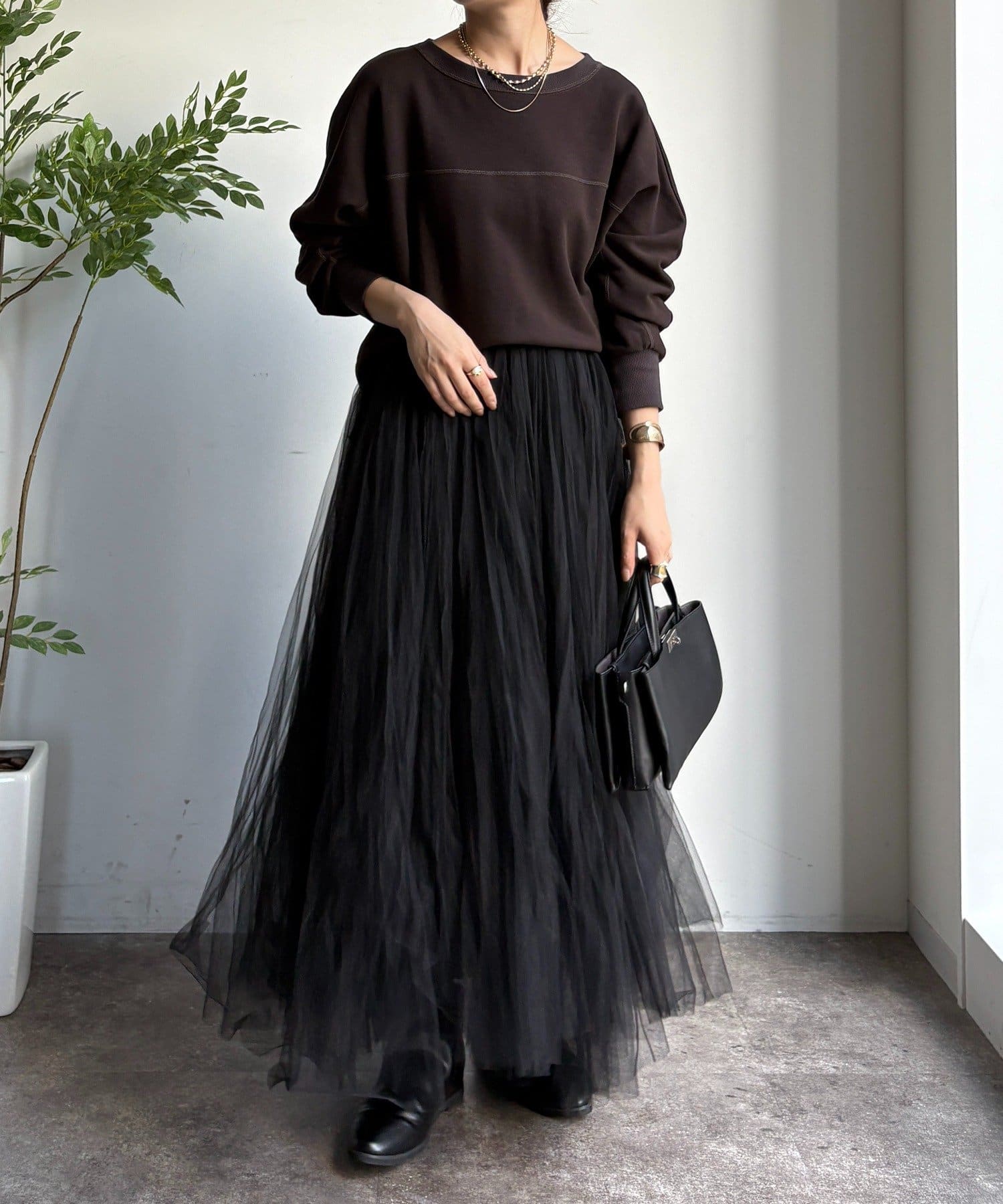 繊細なチュールを重ね、甘すぎない洗練された大人の印象に。
