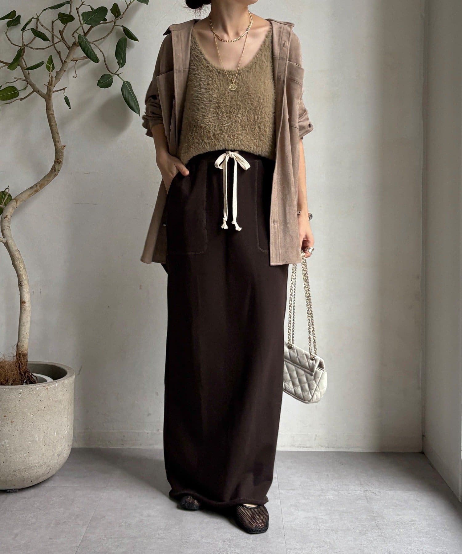身体のラインを拾いにくく、すっと落ちるIラインシルエットは、
