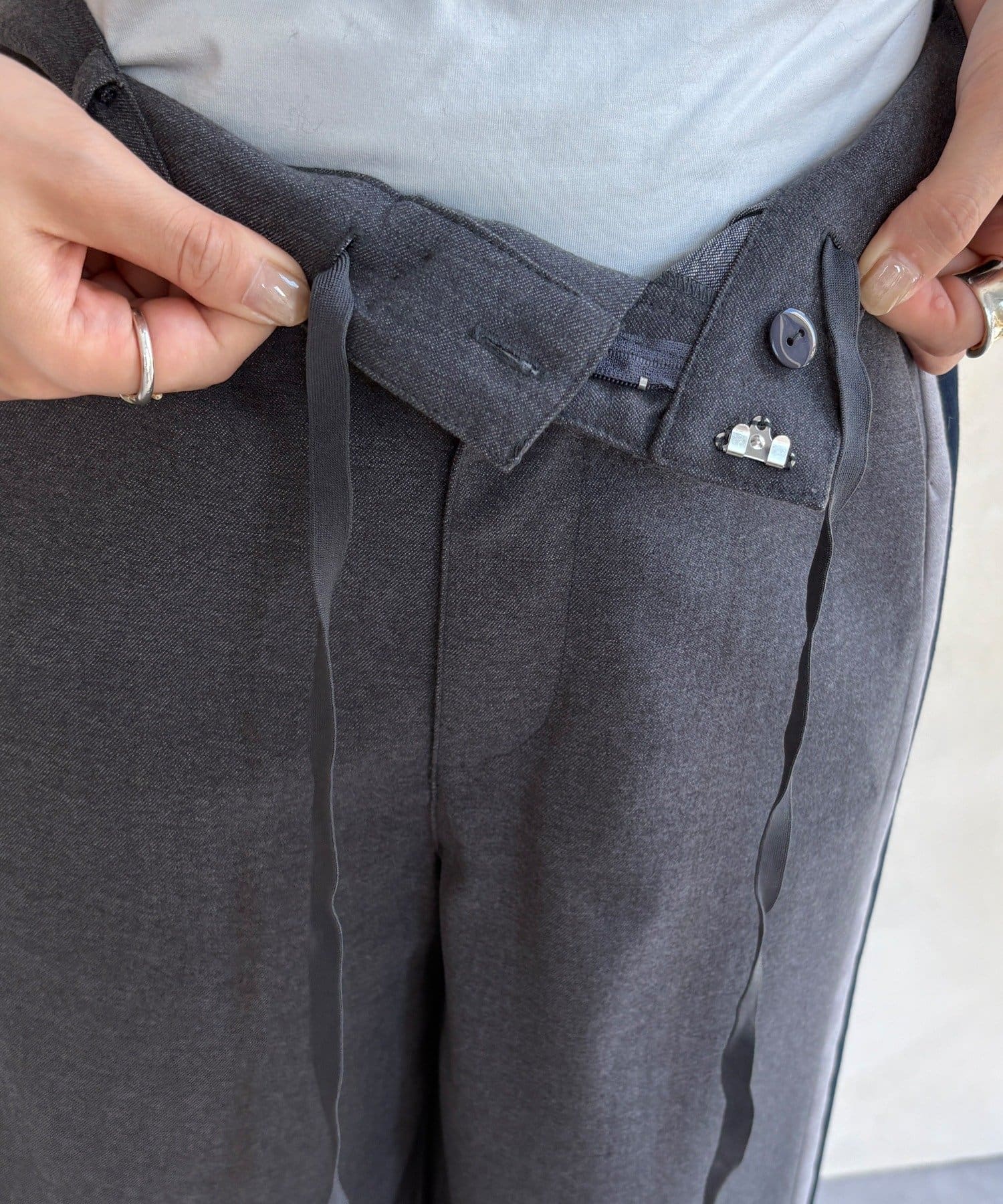 ウエスト部分には、ボタンとホックに加え、内側のリボンで細やかなサイズ調整が可能なため、快適なフィット感で、一日中ストレスフリーに過ごせます。