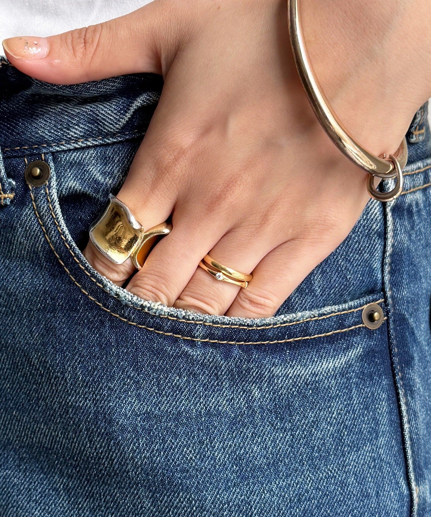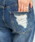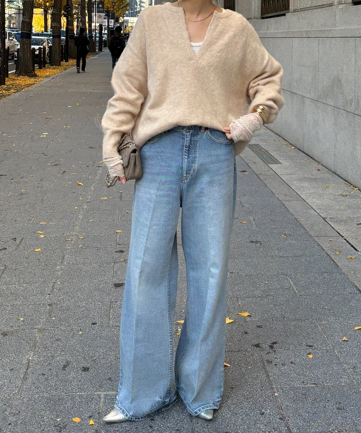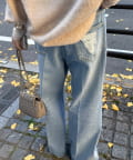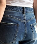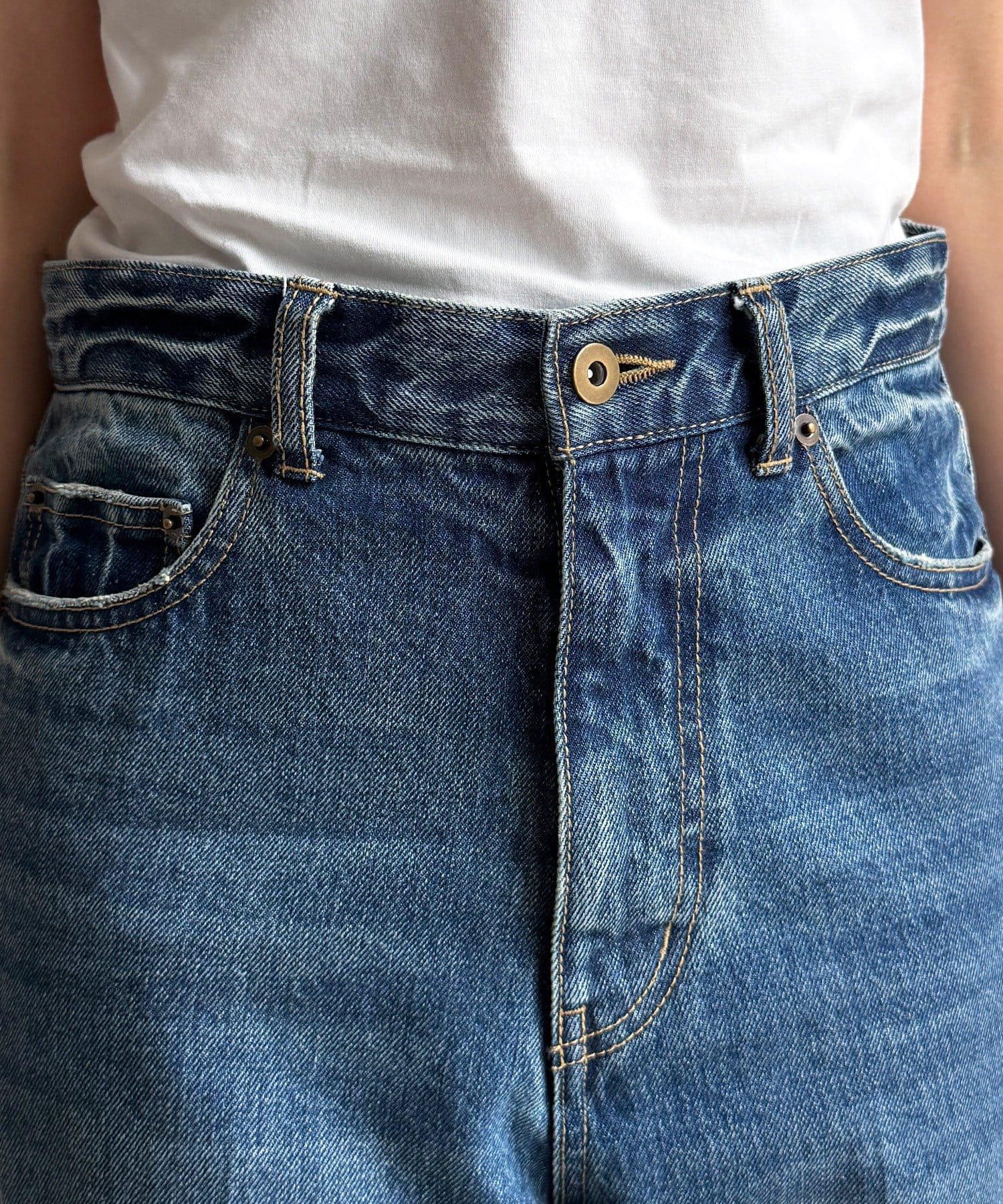 ダメージ加工の掛かったラフなブルーと、少しきれい見えしてくれるリジットデニムのインディゴブルーの、加工感の異なる2カラー展開は、同じシルエットでも全く異なる印象を与えます。