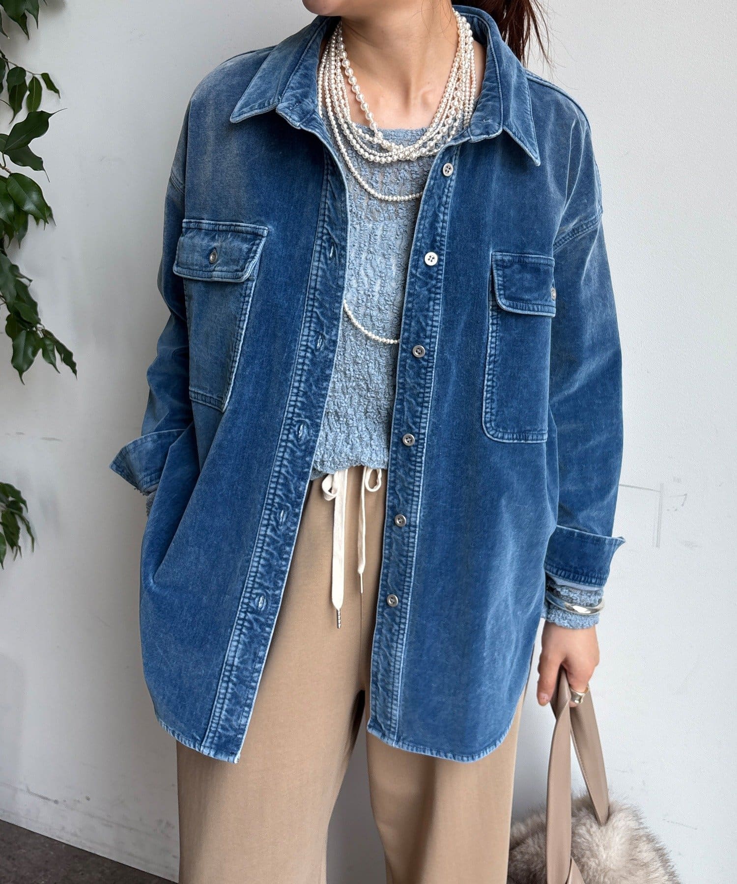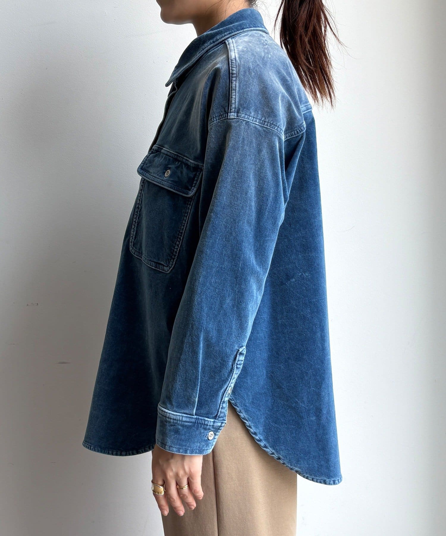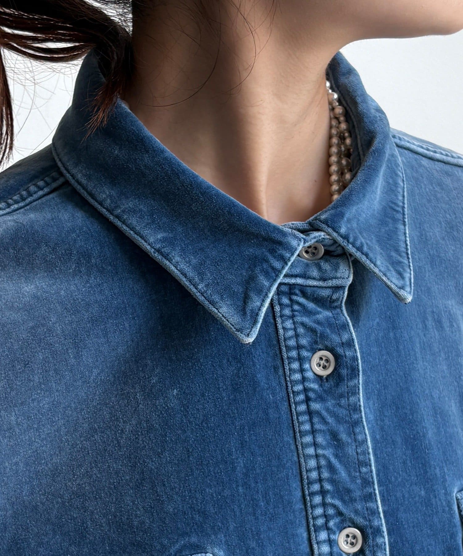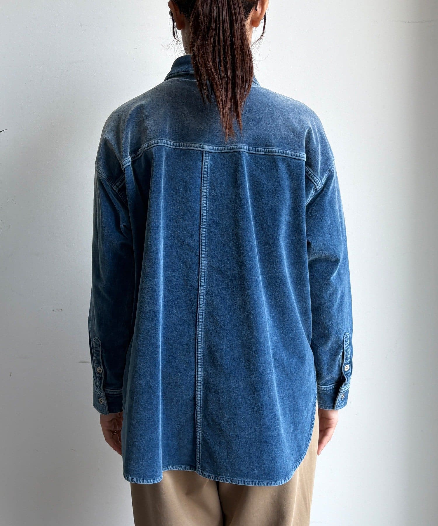 表面が毛羽だった綿の別珍素材を使用。ほかにはあまりない素材感のデニムシャツで新鮮な印象を与えます。