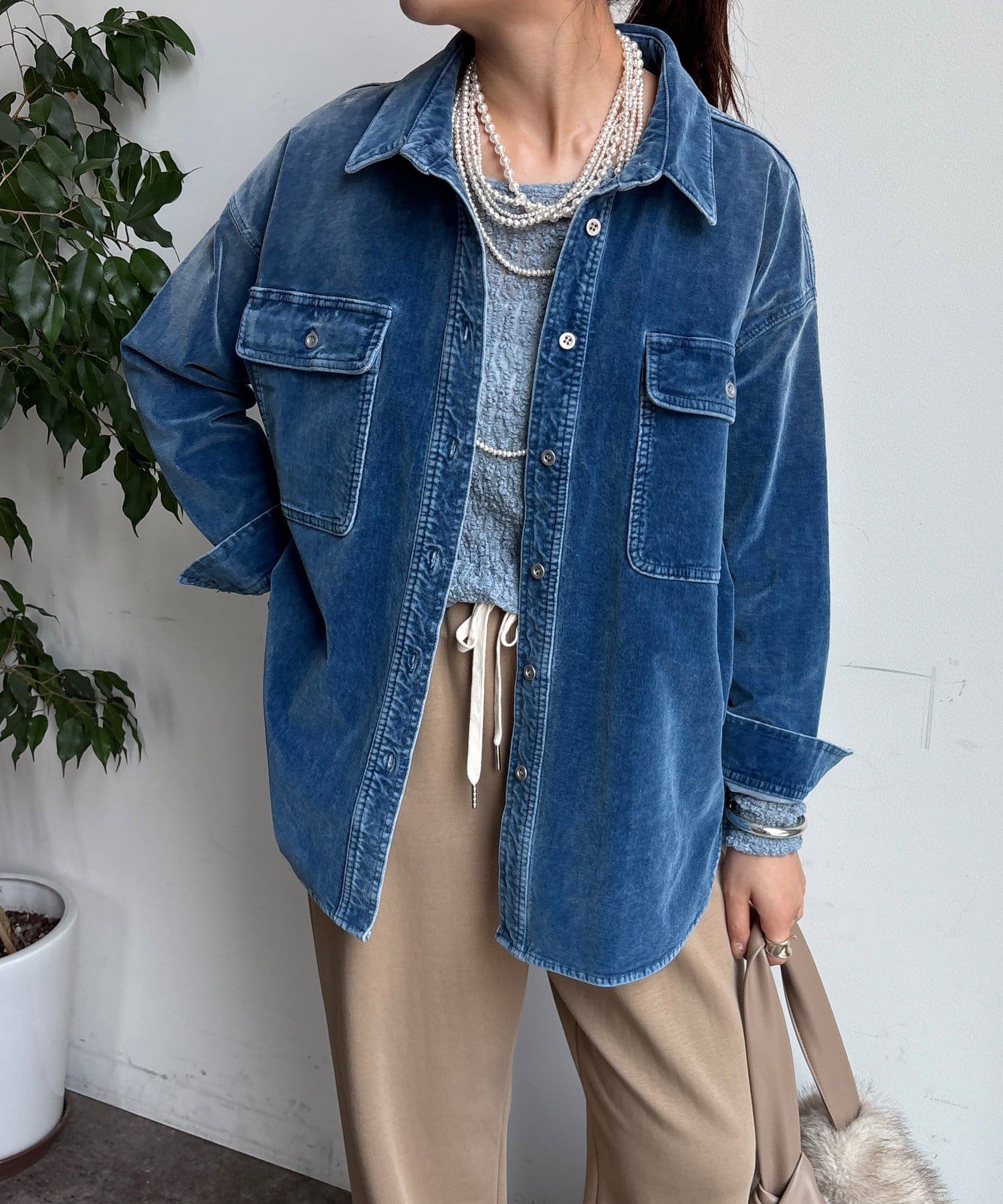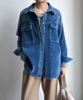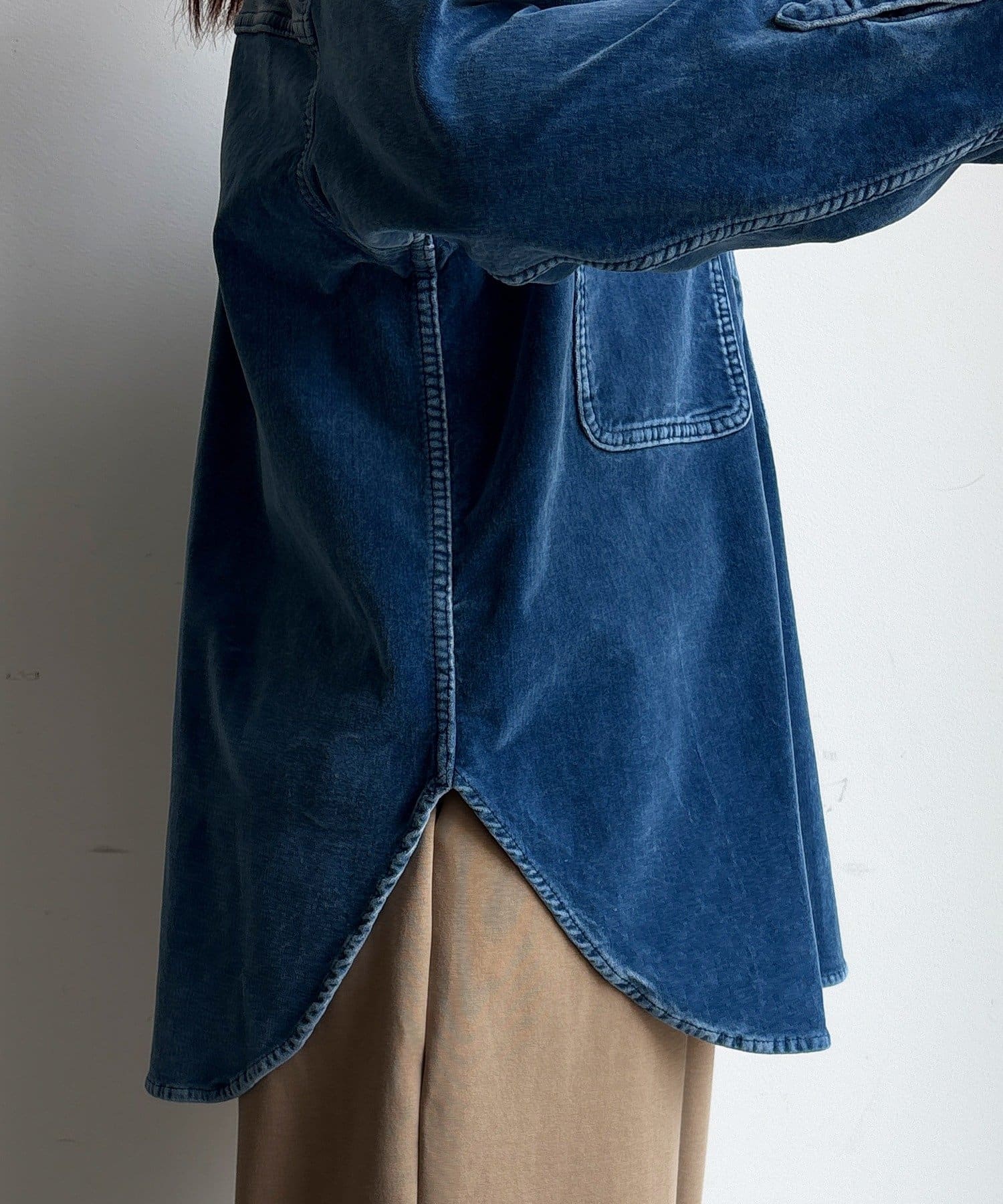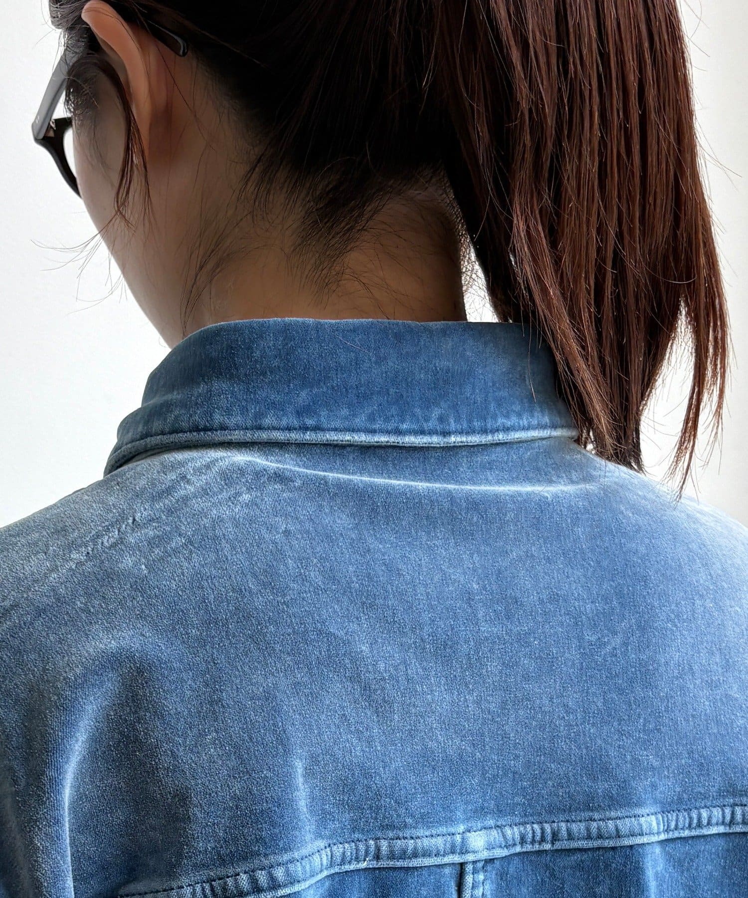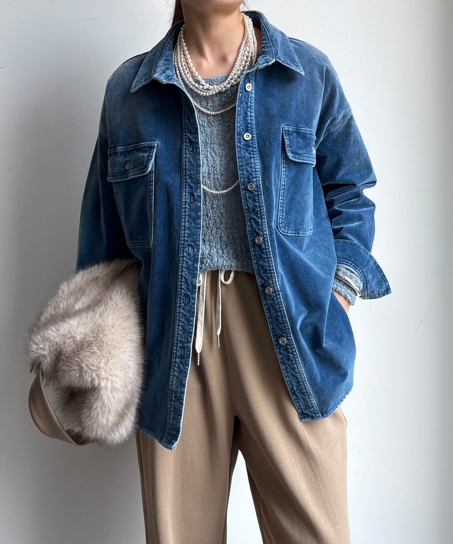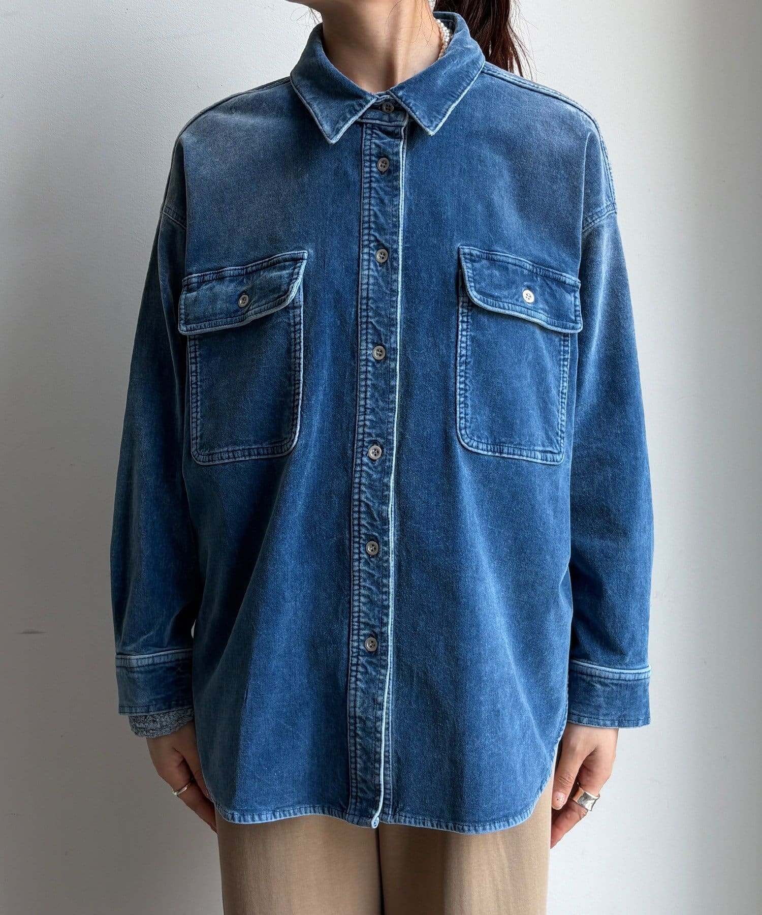 表面が毛羽だった綿の別珍素材を使用。ほかにはあまりない素材感のデニムシャツで新鮮な印象を与えます。