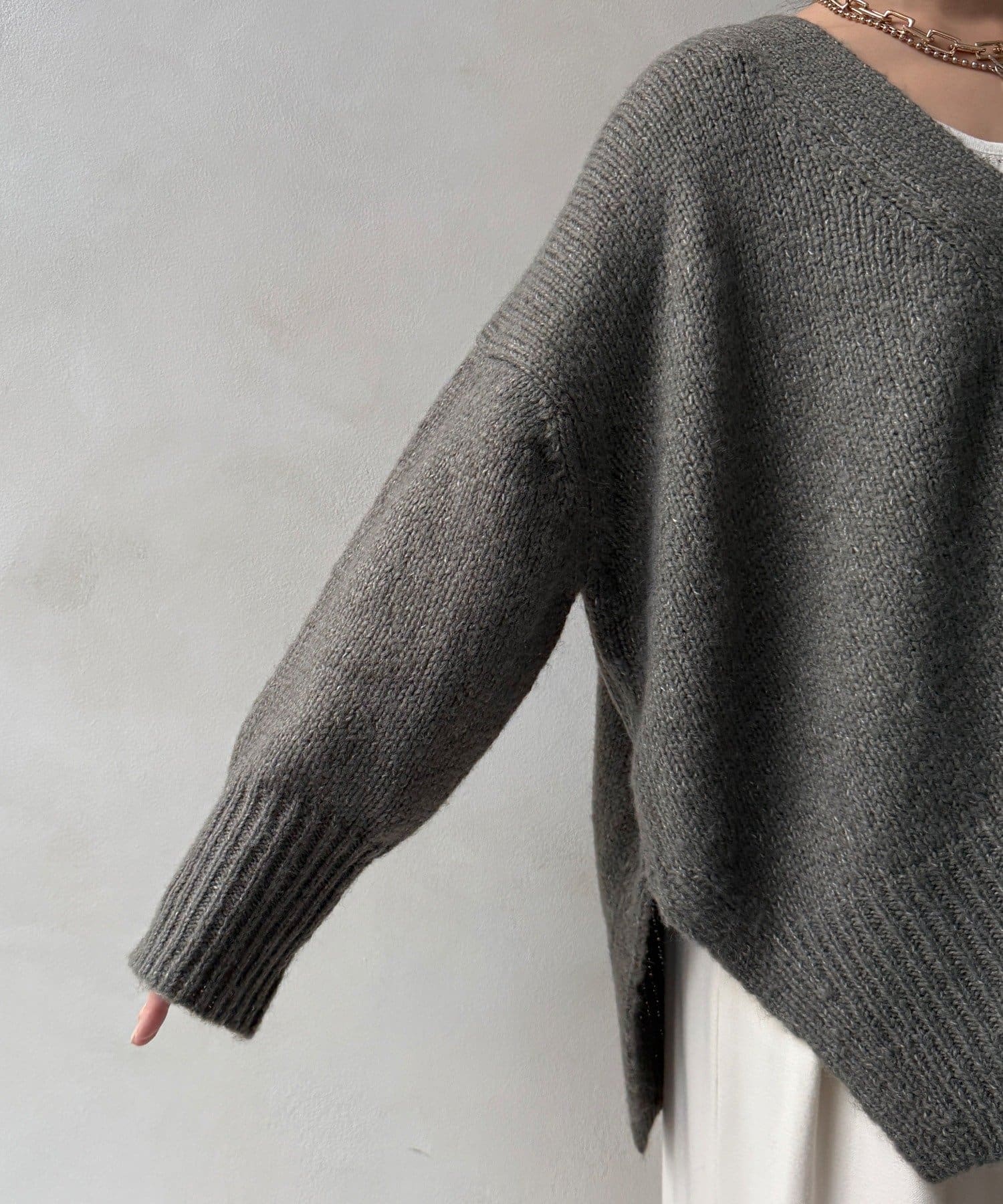 Vネックデザインで顔まわりをすっきり見せつつ、ボリューム袖が女性らしさをプラスし、