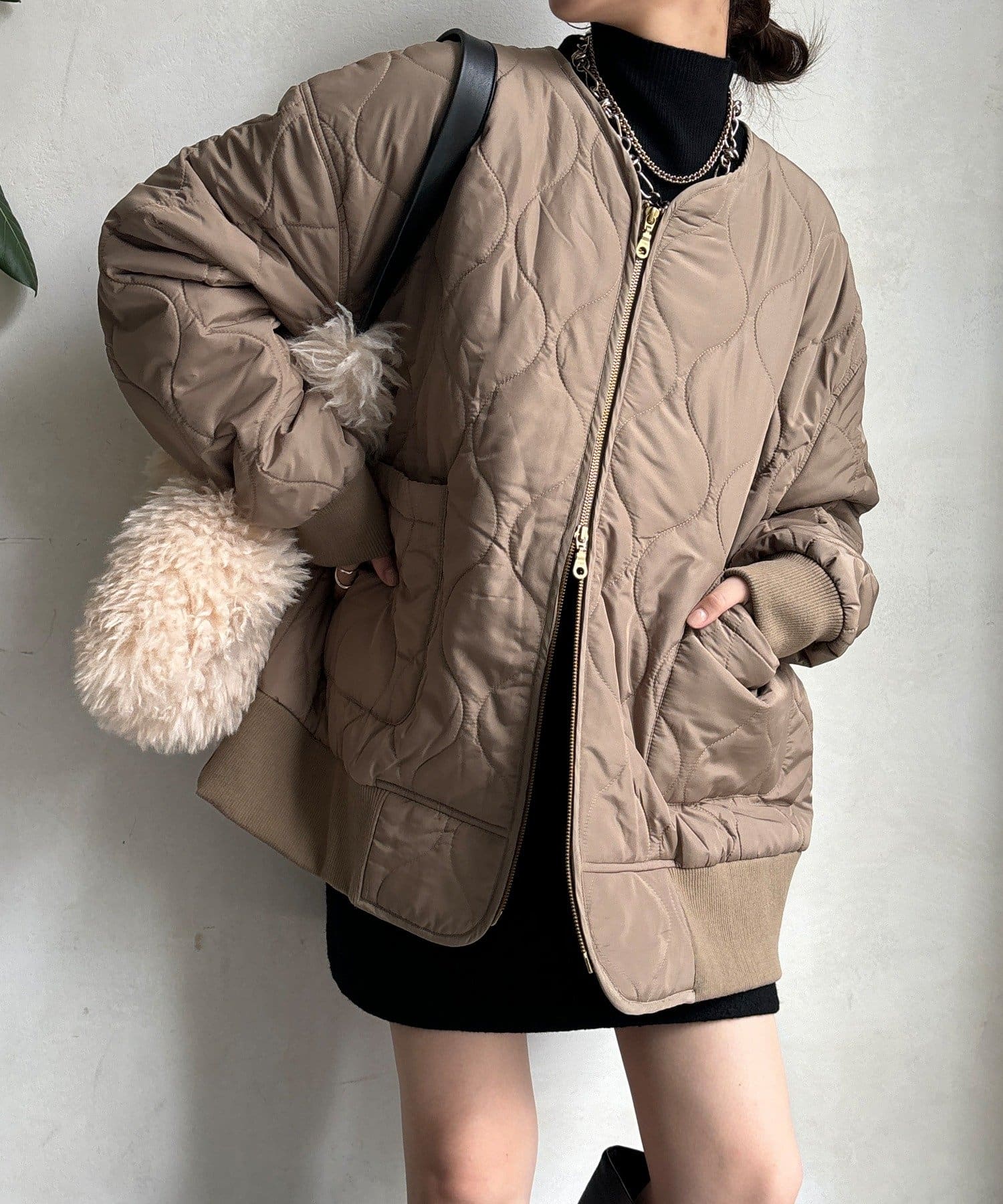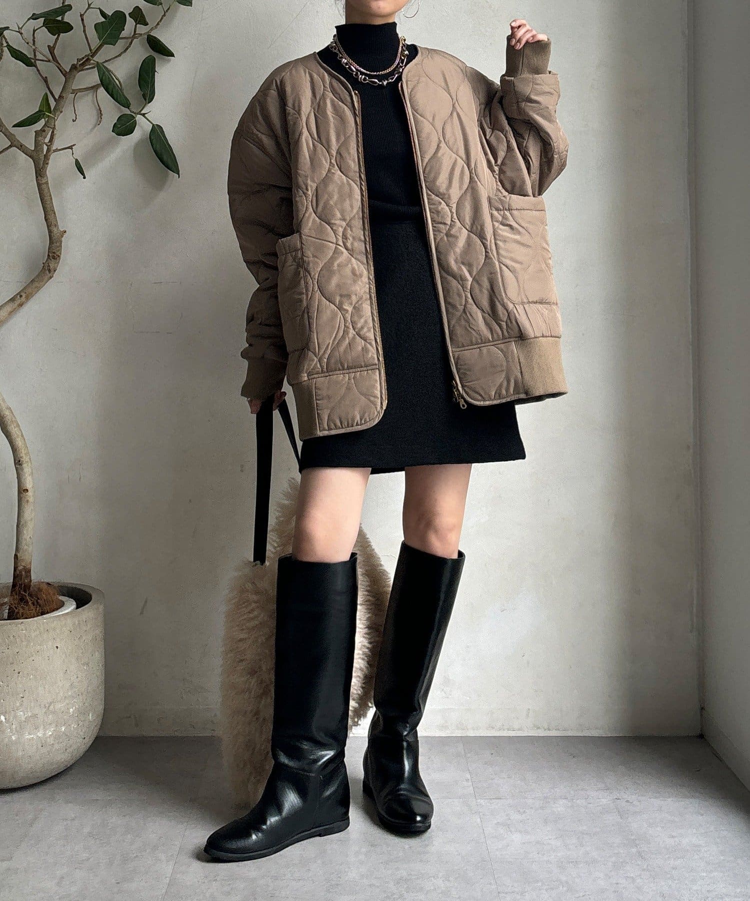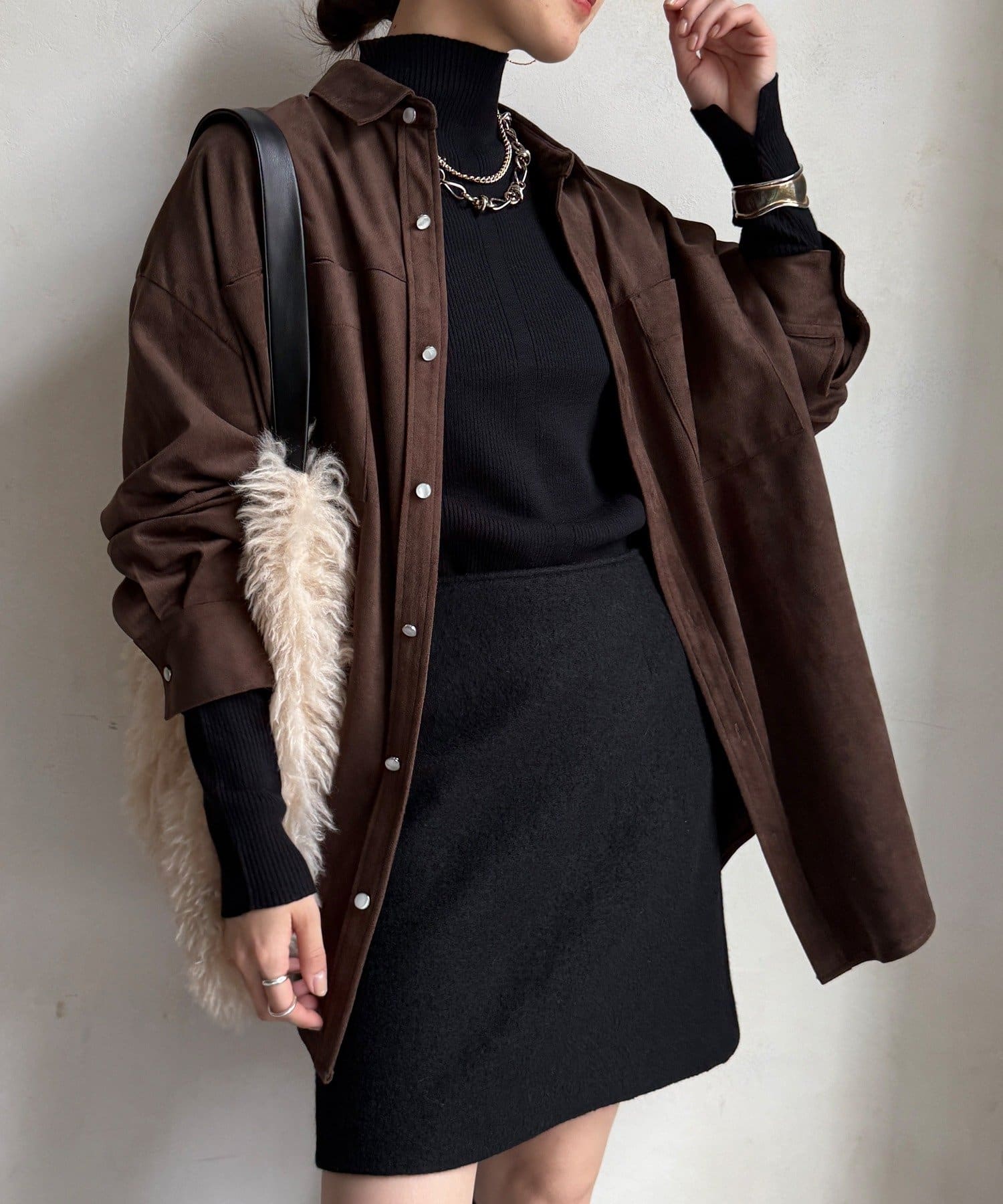 程よくフィットするリブ素材が女性らしいシルエットをつくり、着心地もやわらかで快適で、アウターを羽織っても着膨れしにくいのが嬉しいポイントです。