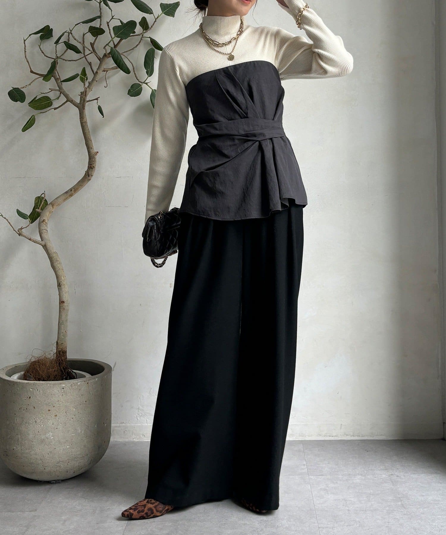 首元を美しく見せるボトルネックと、ボディラインに優しくフィットするリブ編みが、女性らしさを引き立てるニットトップが登場。