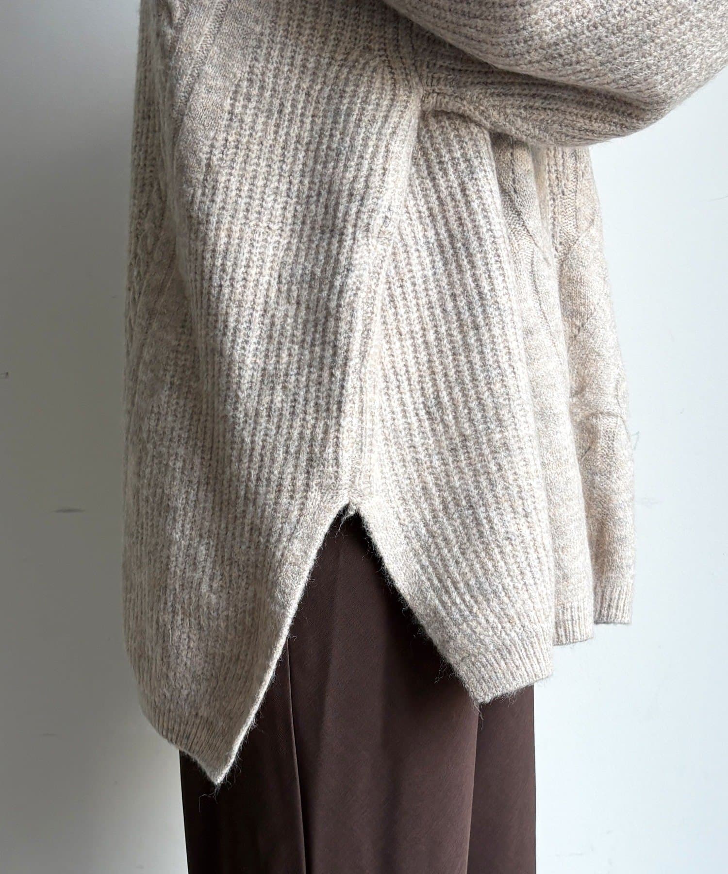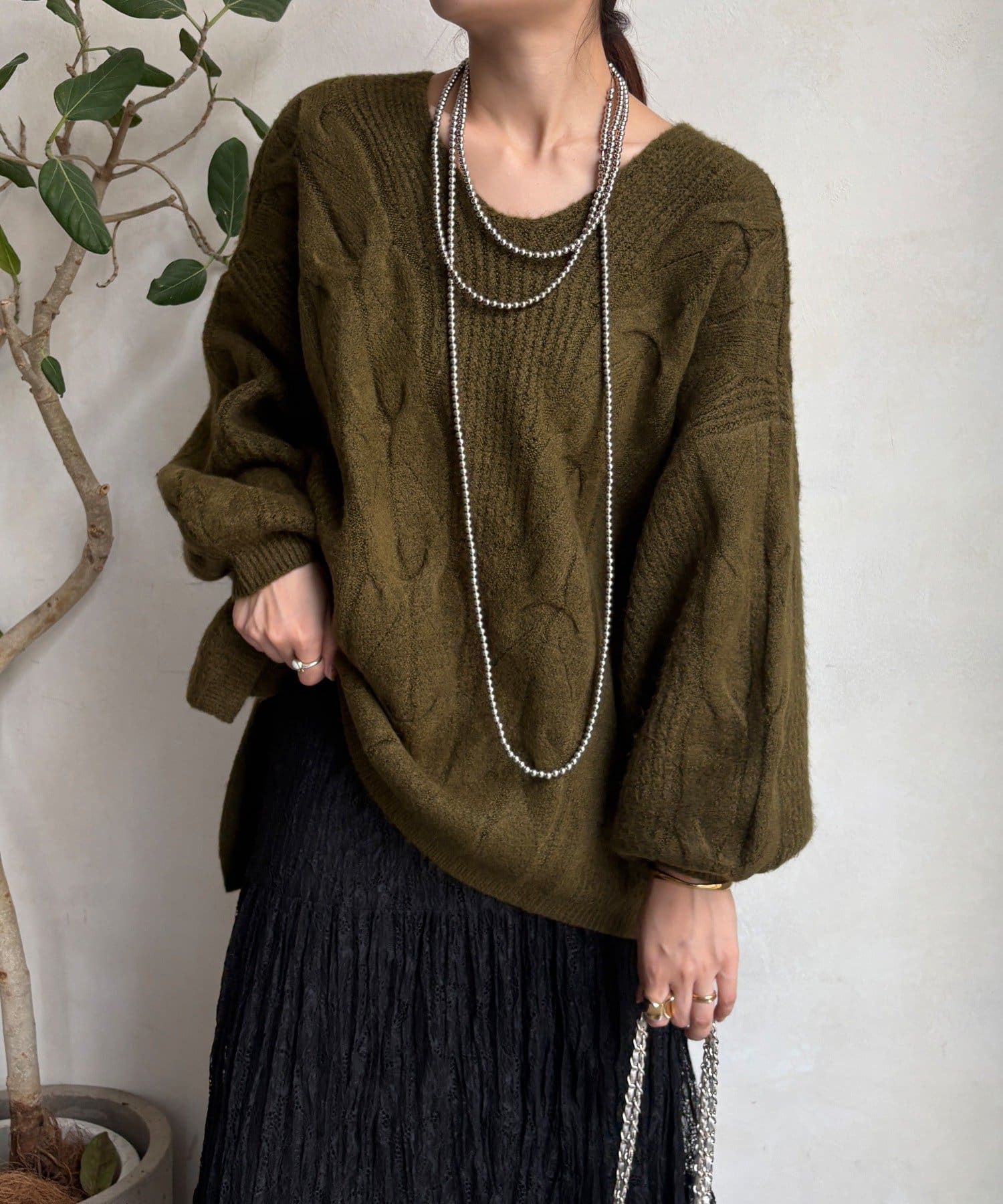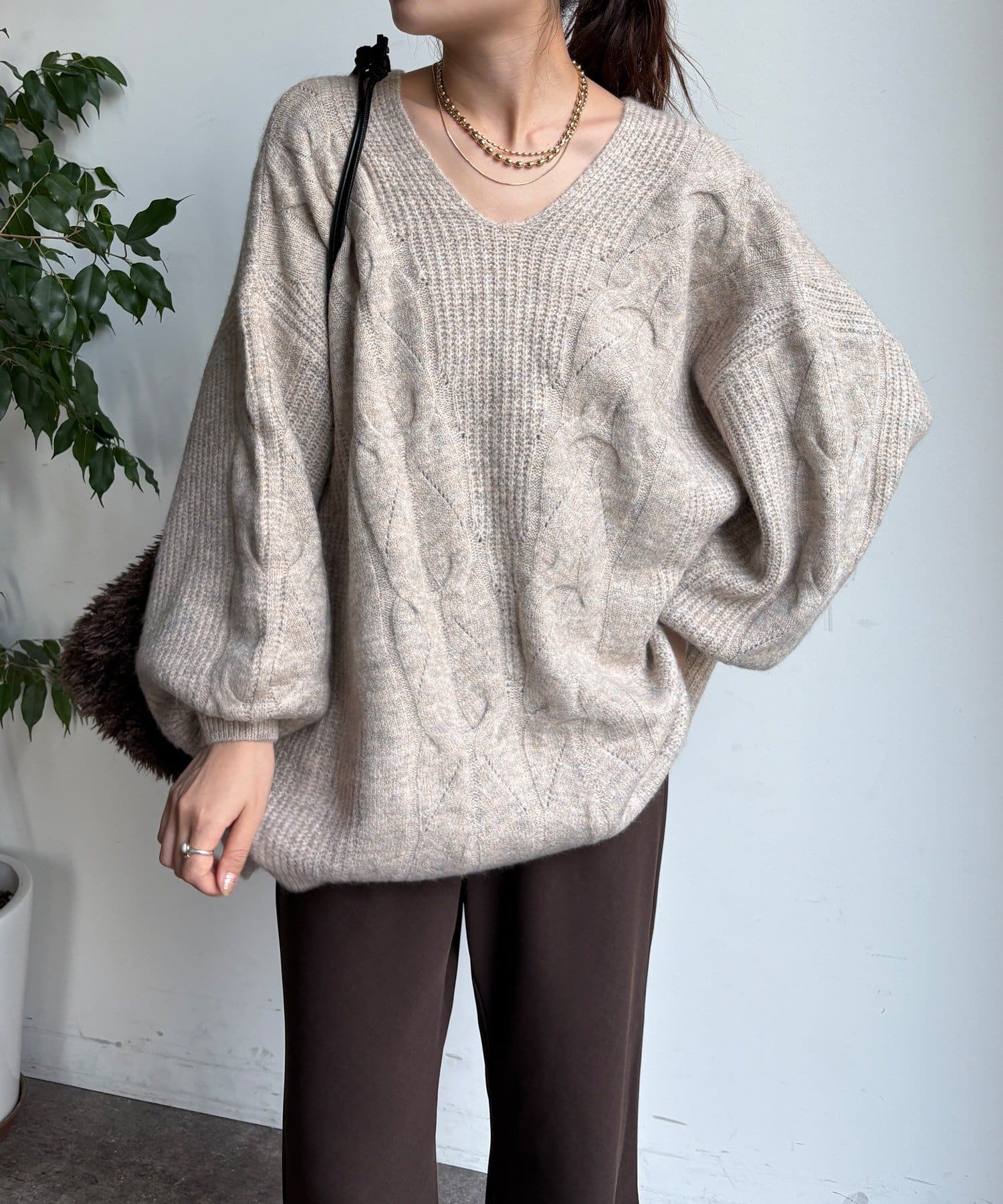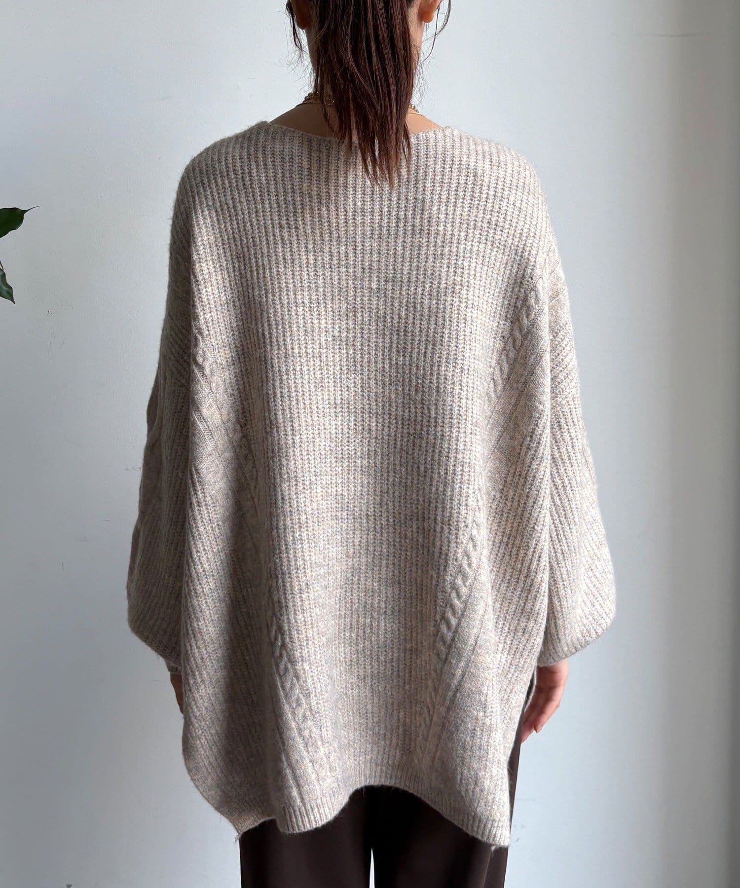 温かみのある大きめのケーブル編みと、抜け感のあるシルエットがかわいいニット。