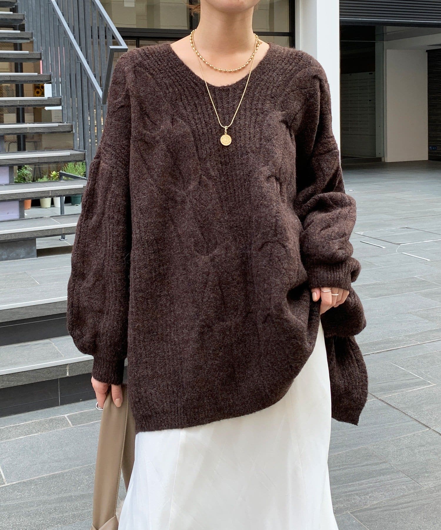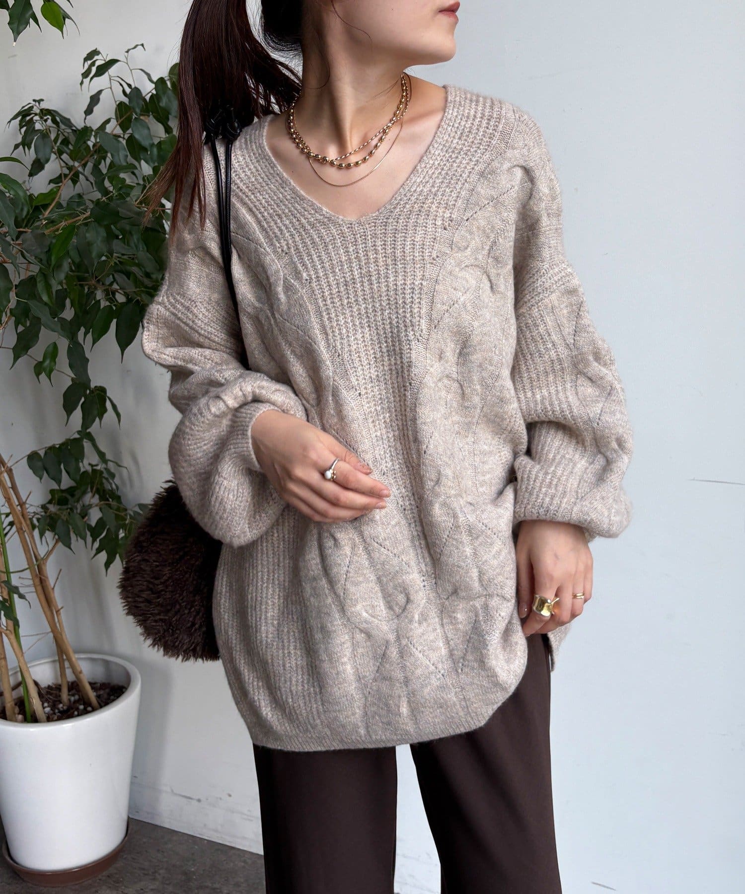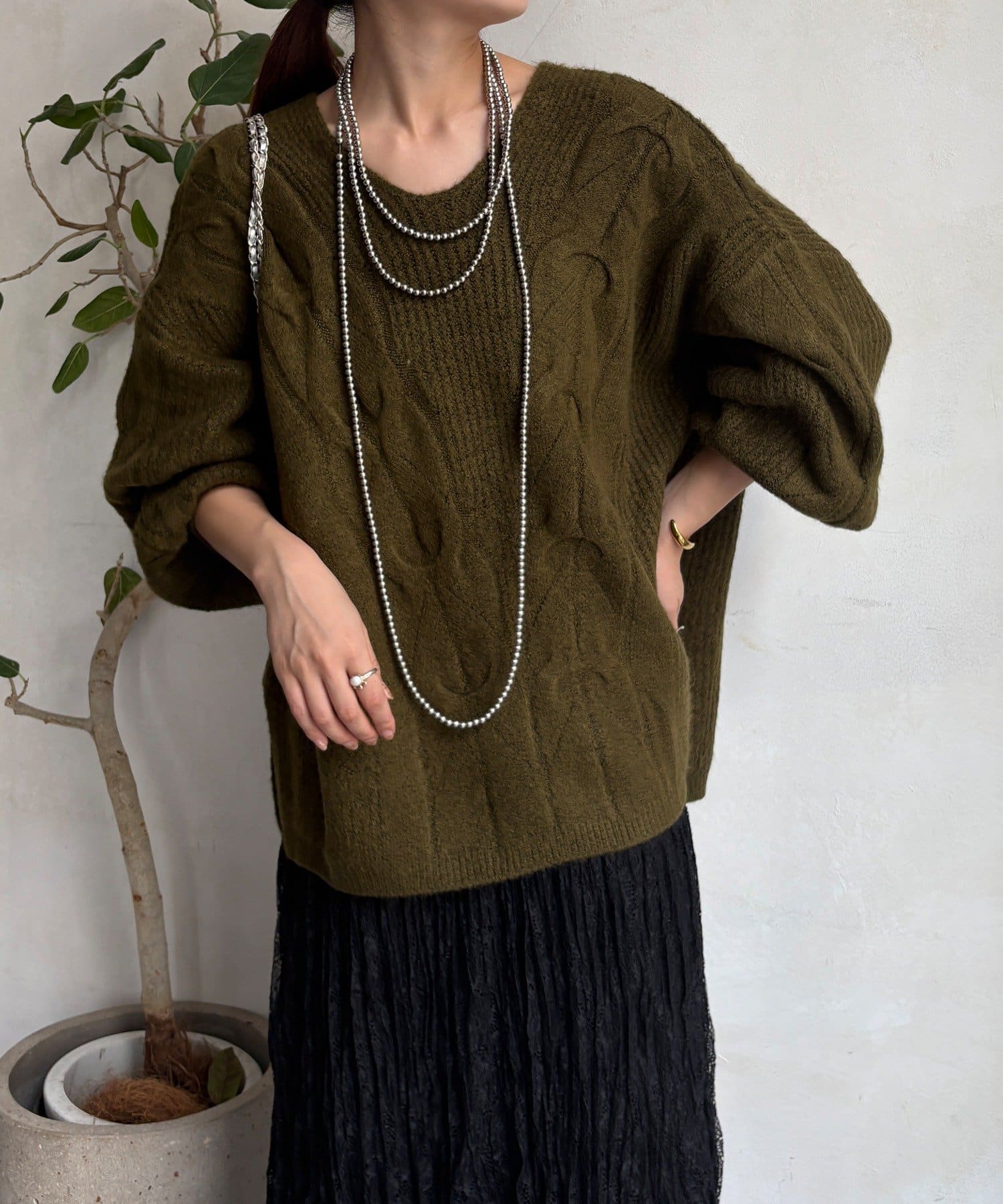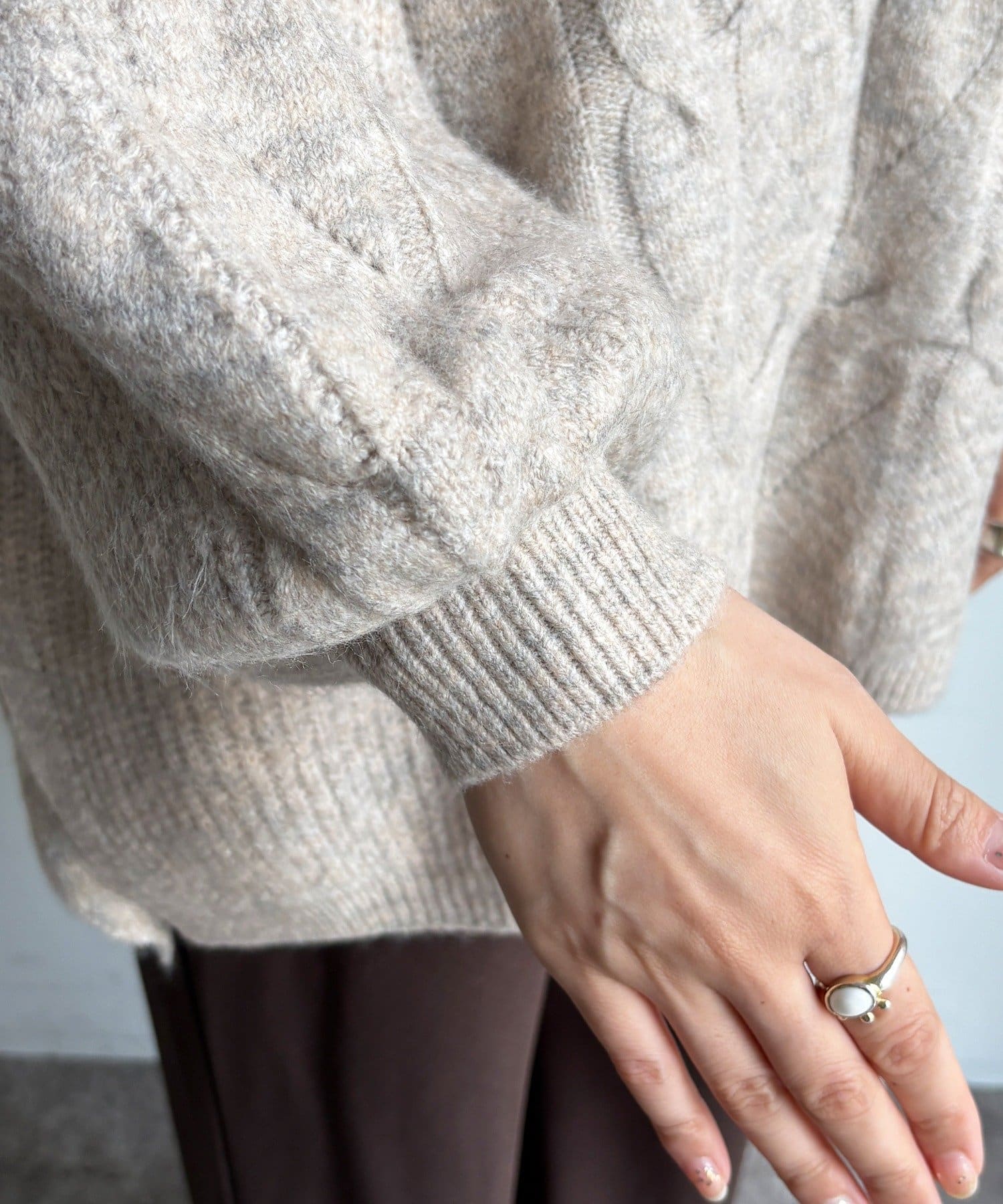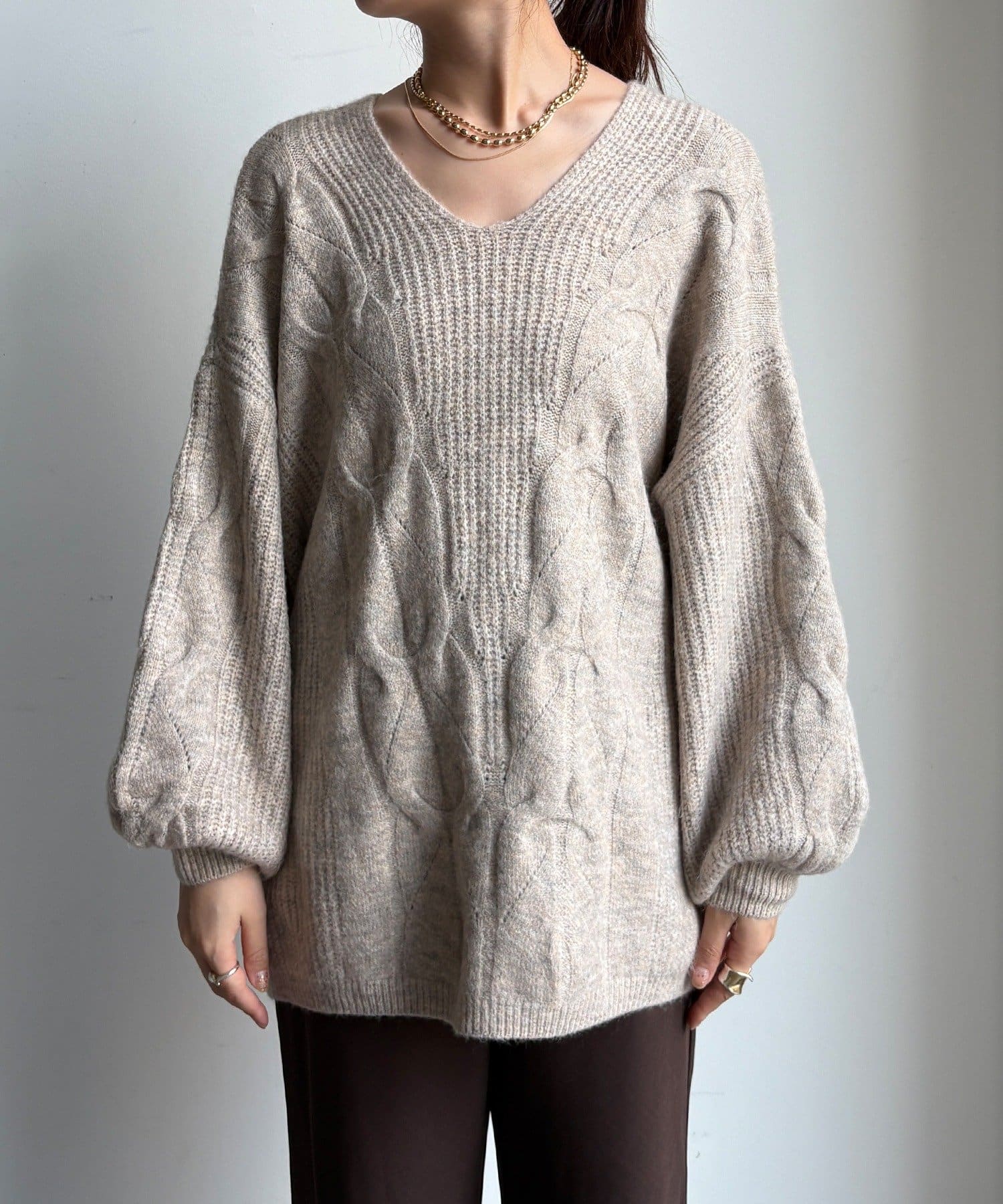 温かみのある大きめのケーブル編みと、抜け感のあるシルエットがかわいいニット。