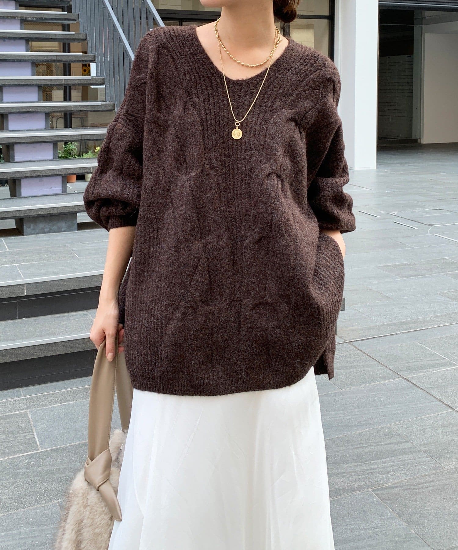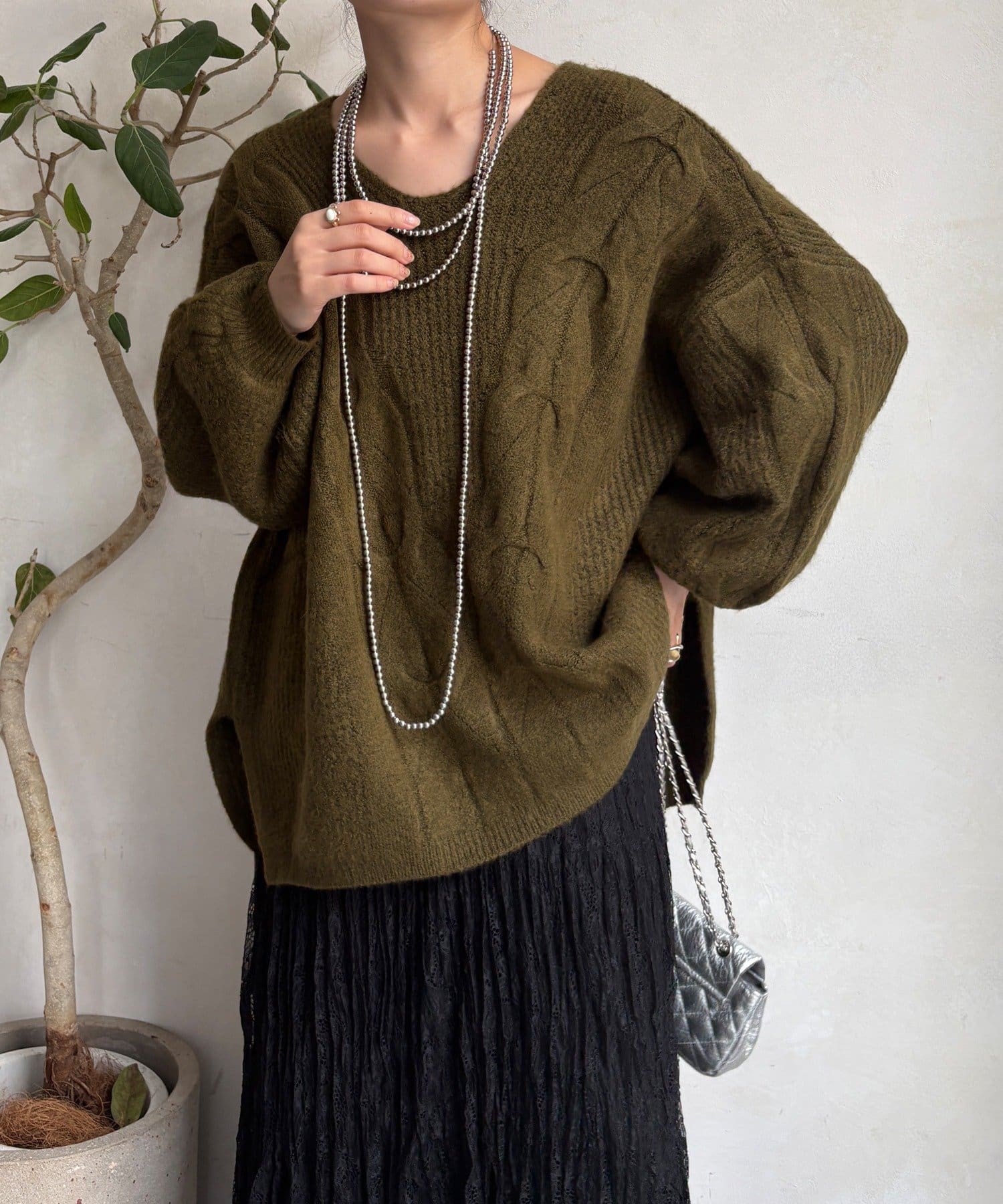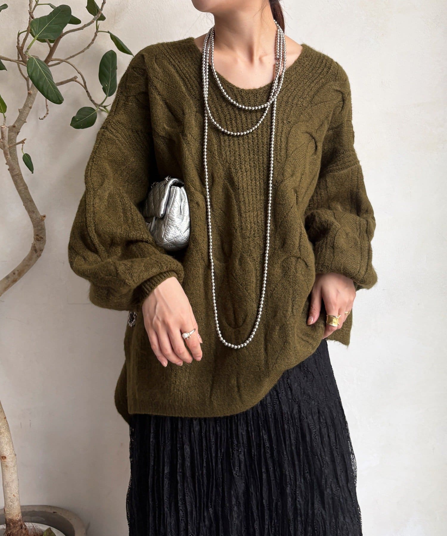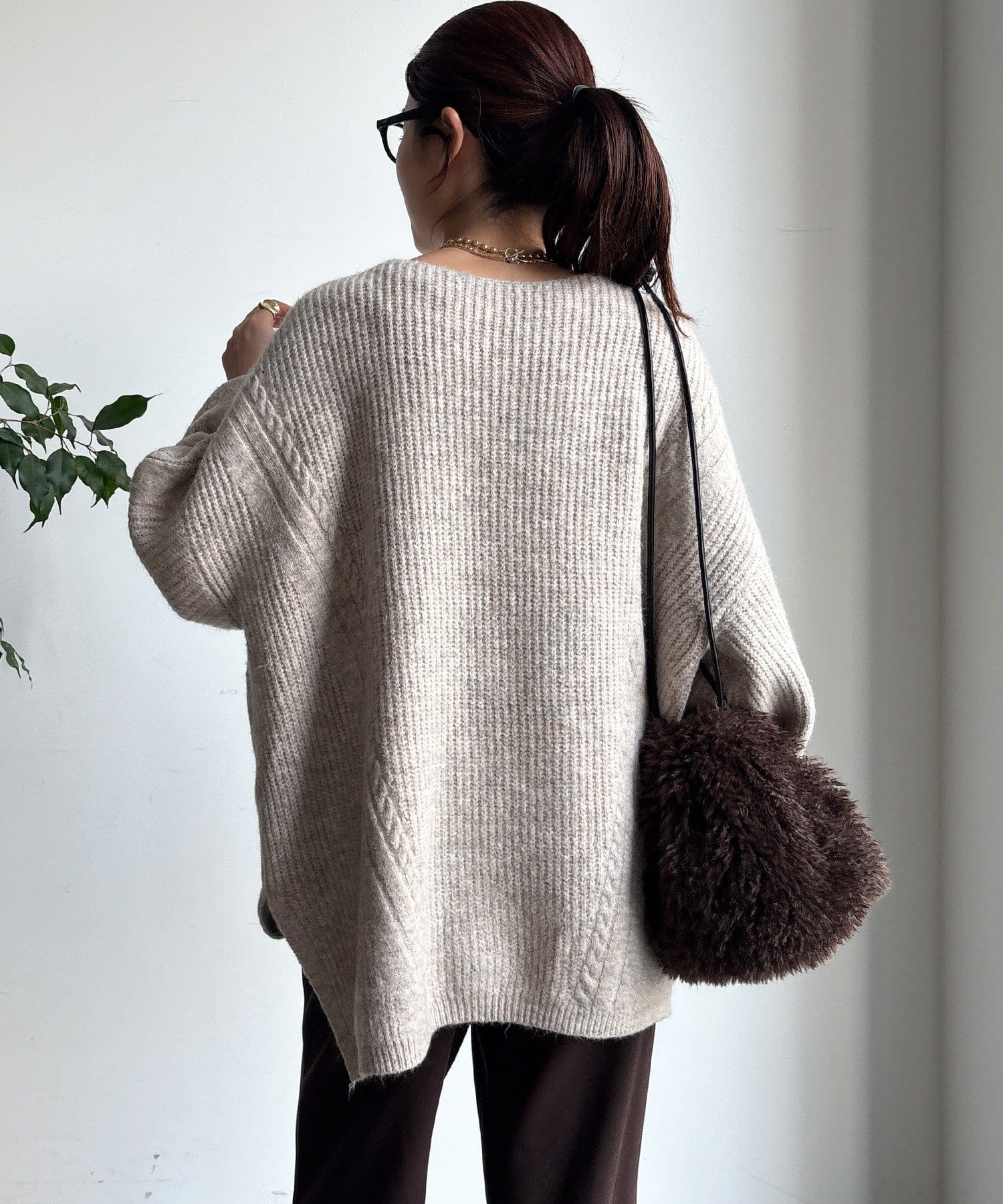 温かみのある大きめのケーブル編みと、抜け感のあるシルエットがかわいいニット。