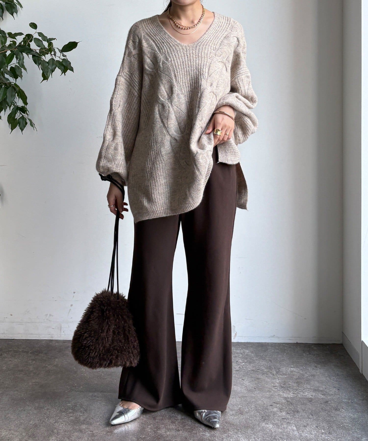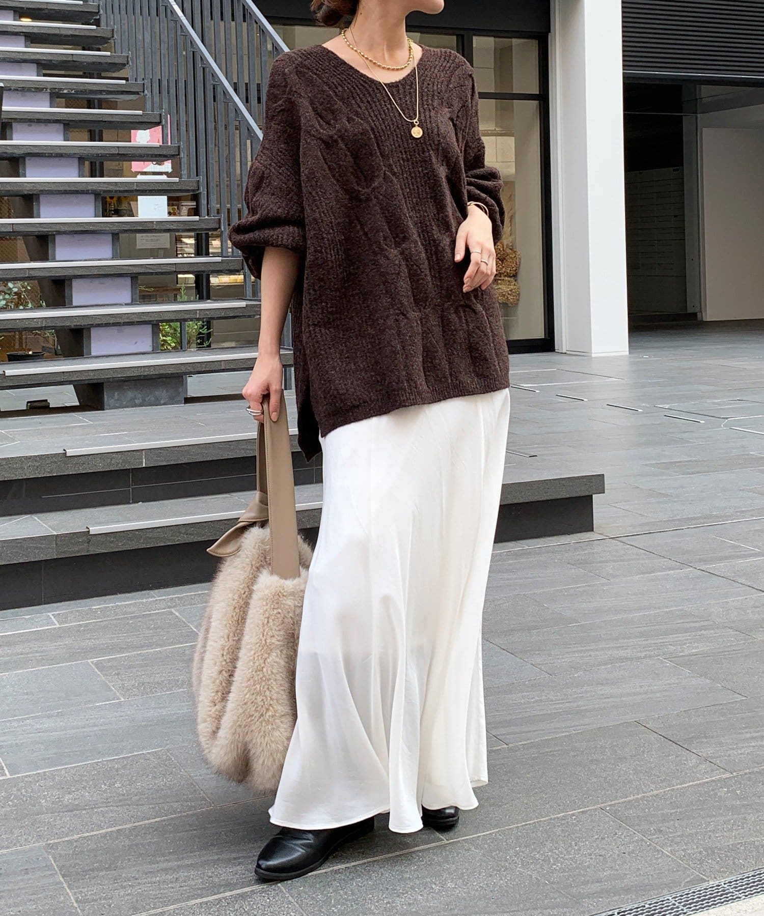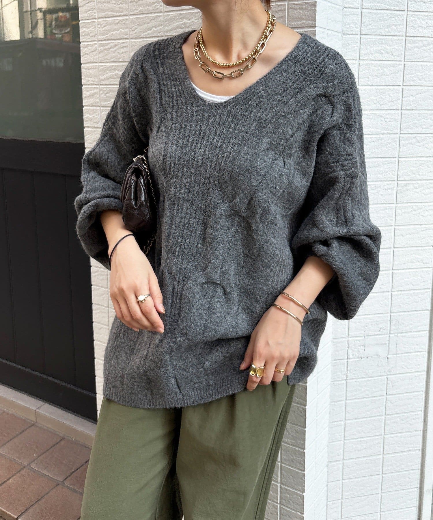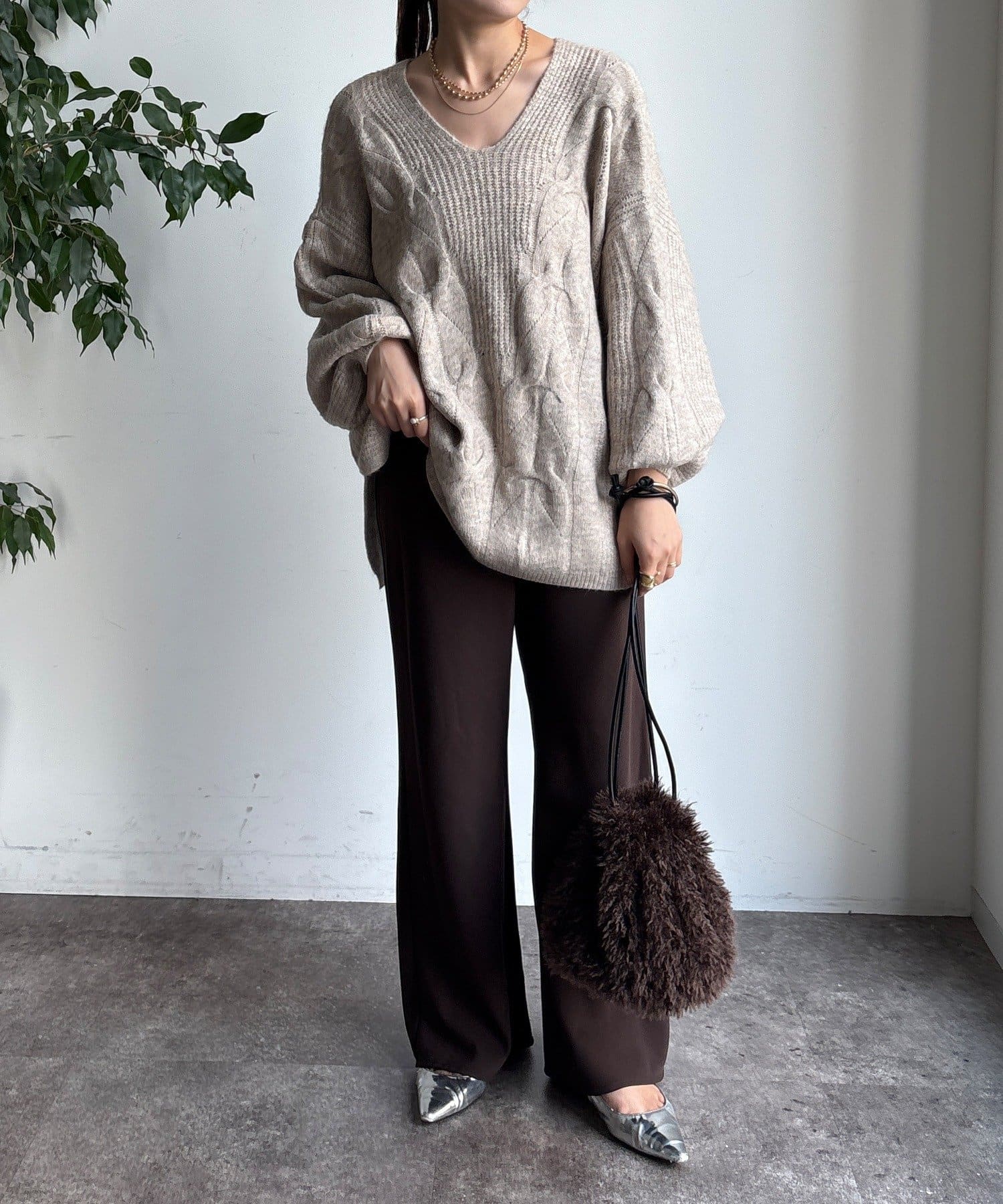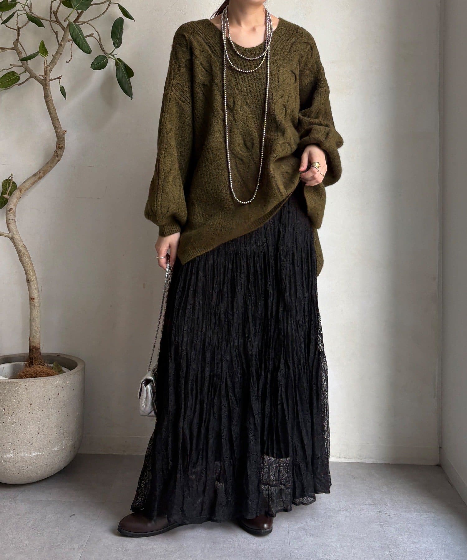 温かみのある大きめのケーブル編みと、抜け感のあるシルエットがかわいいニット。