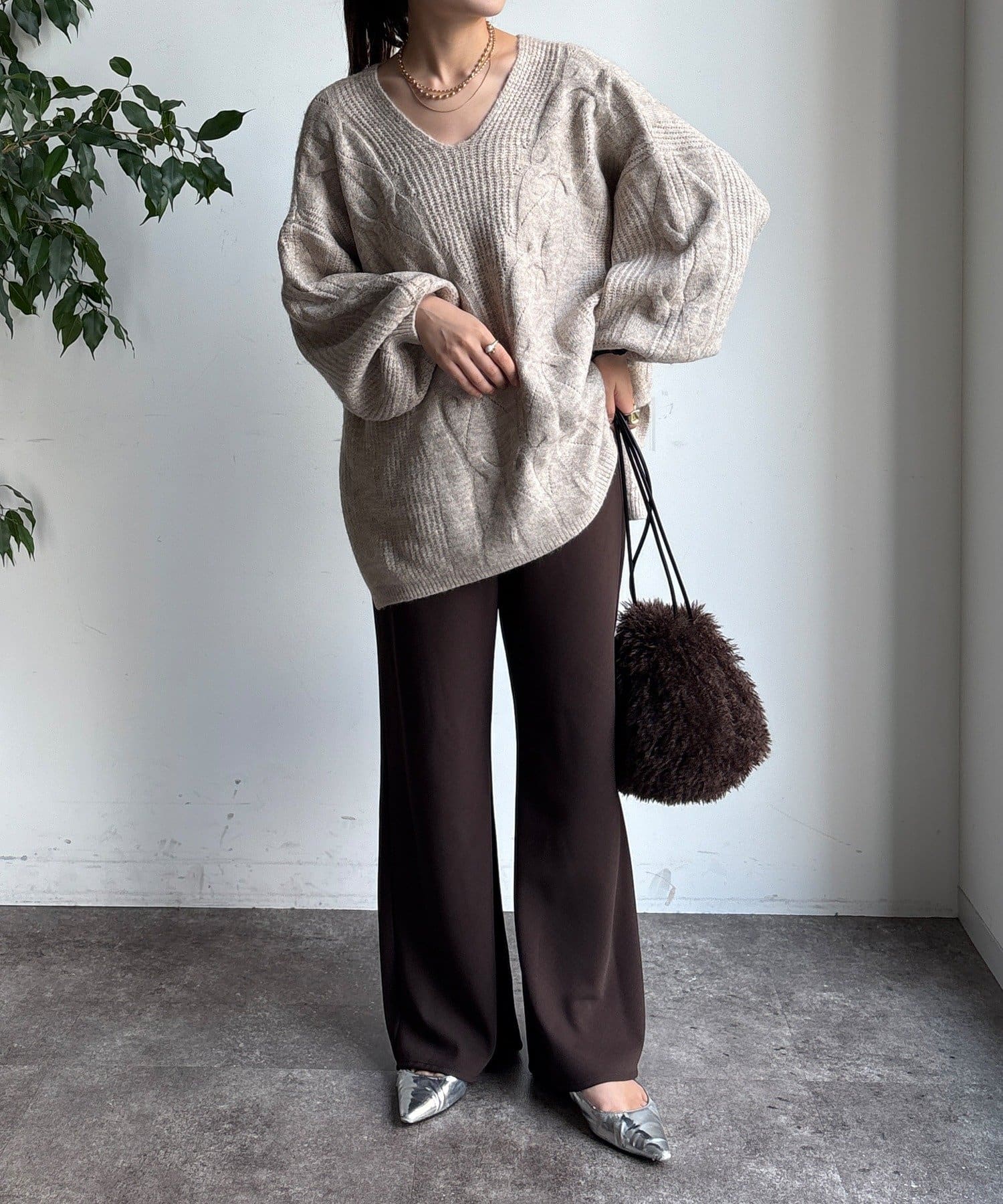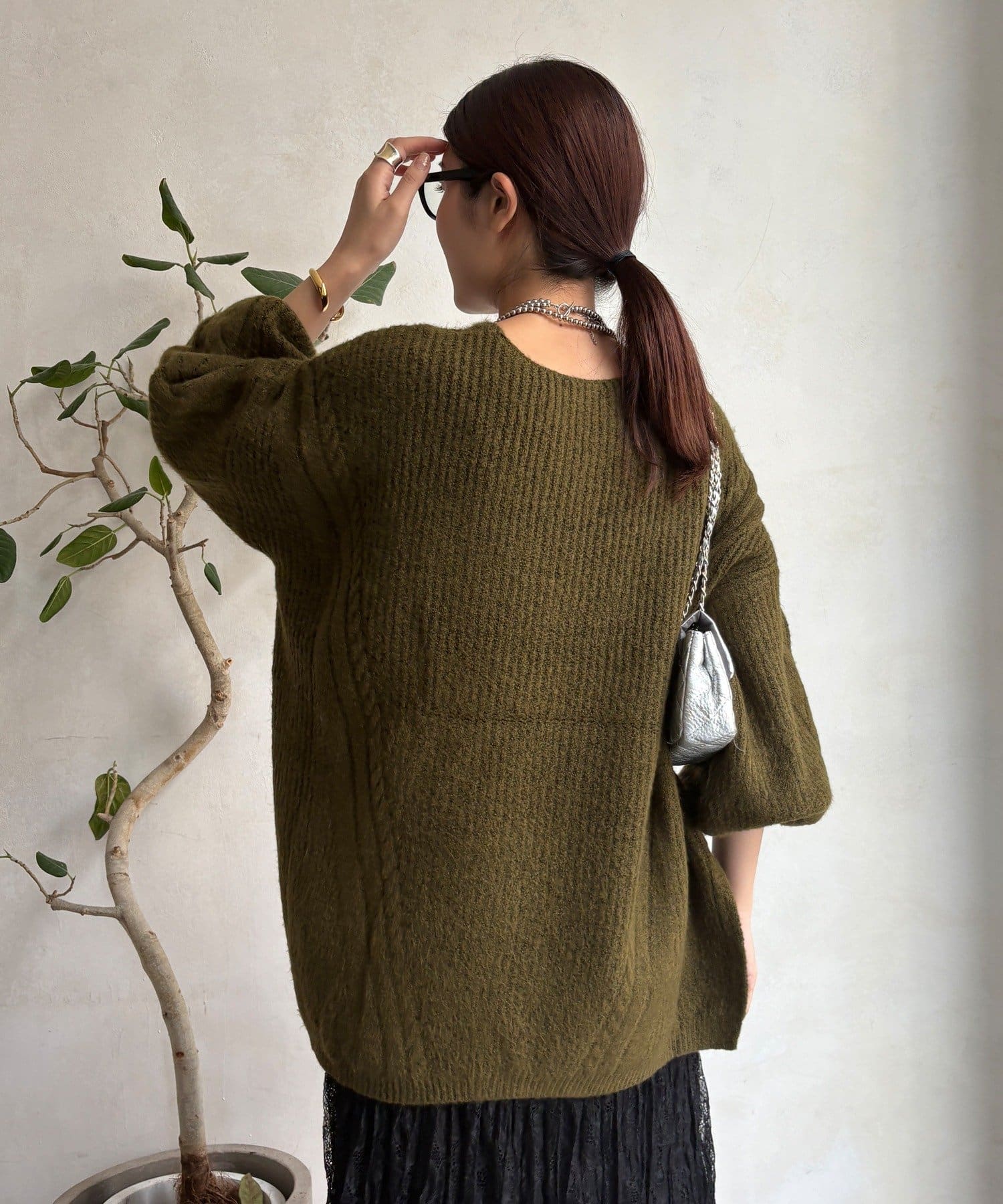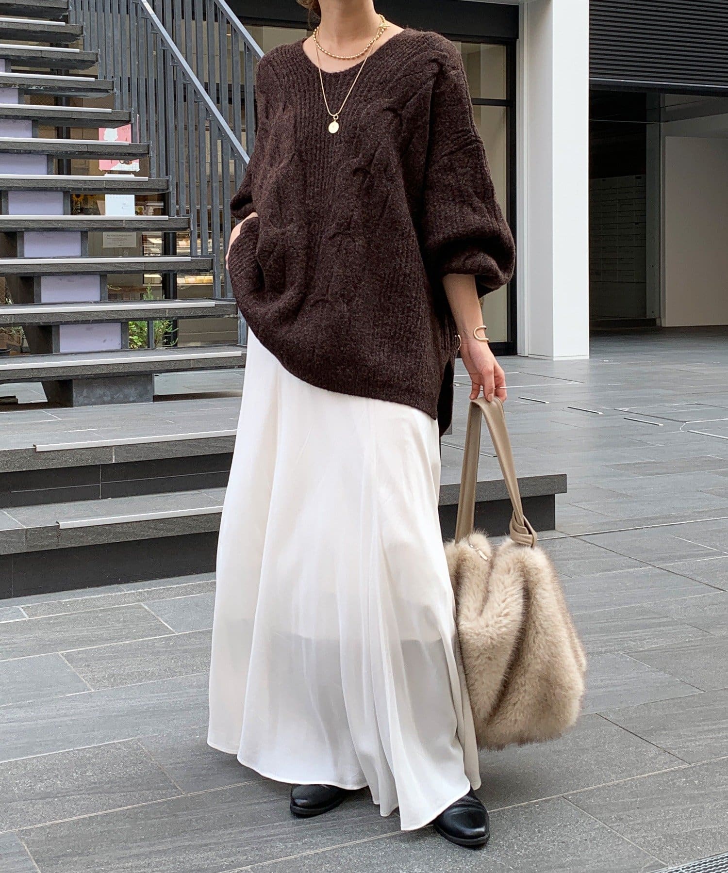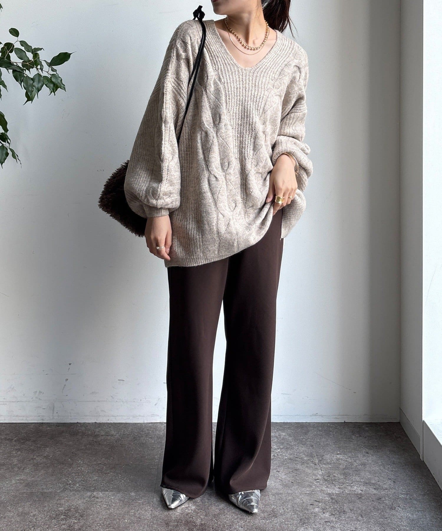 温かみのある大きめのケーブル編みと、抜け感のあるシルエットがかわいいニット。