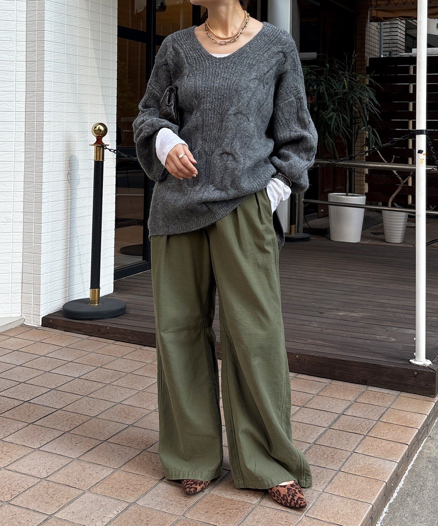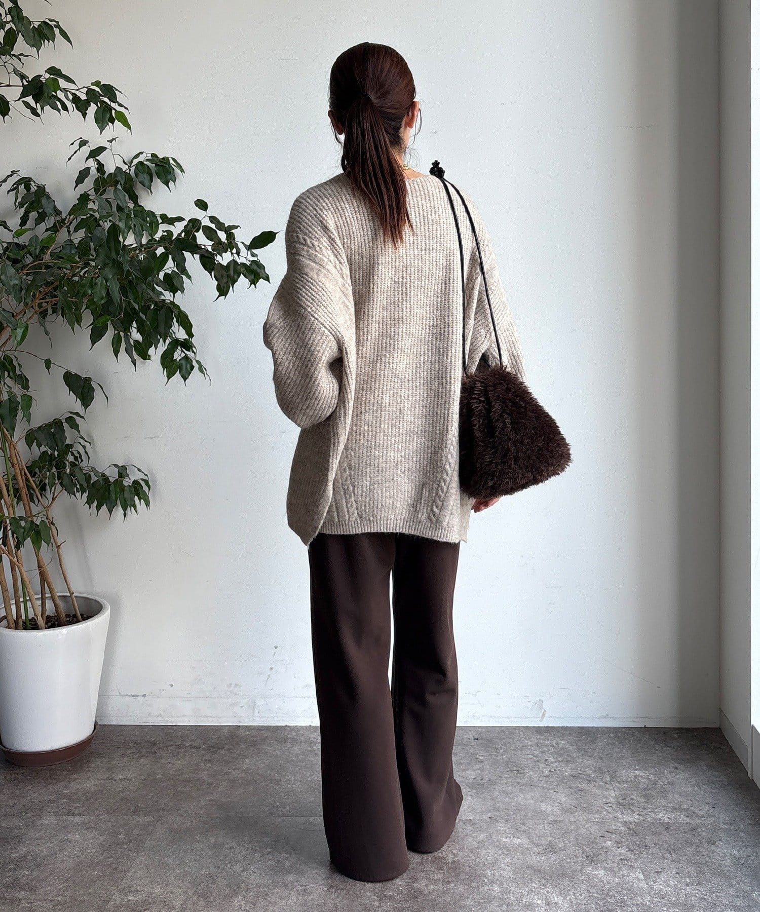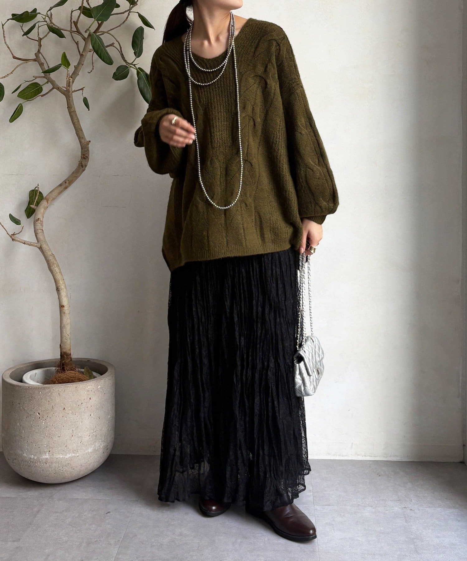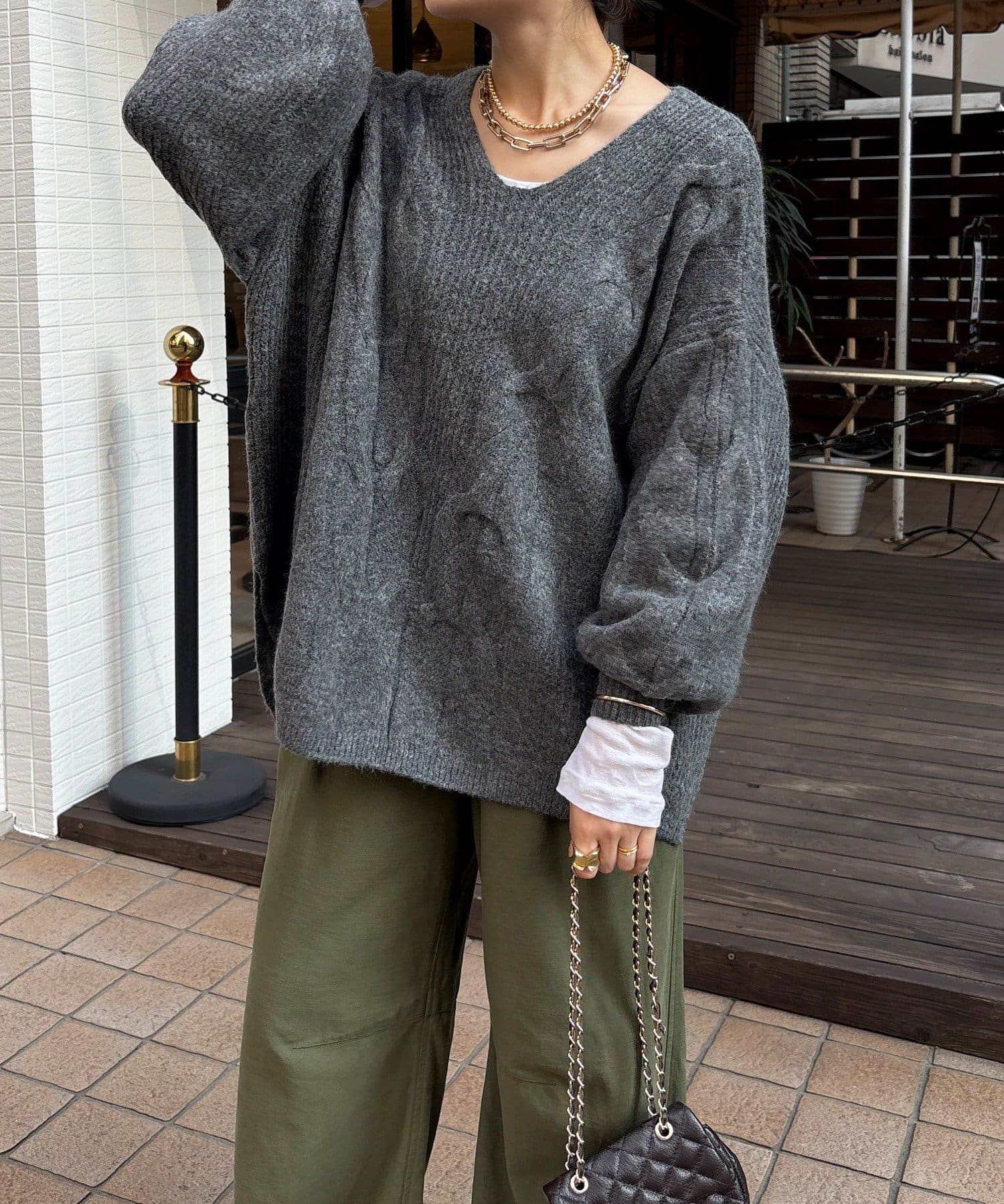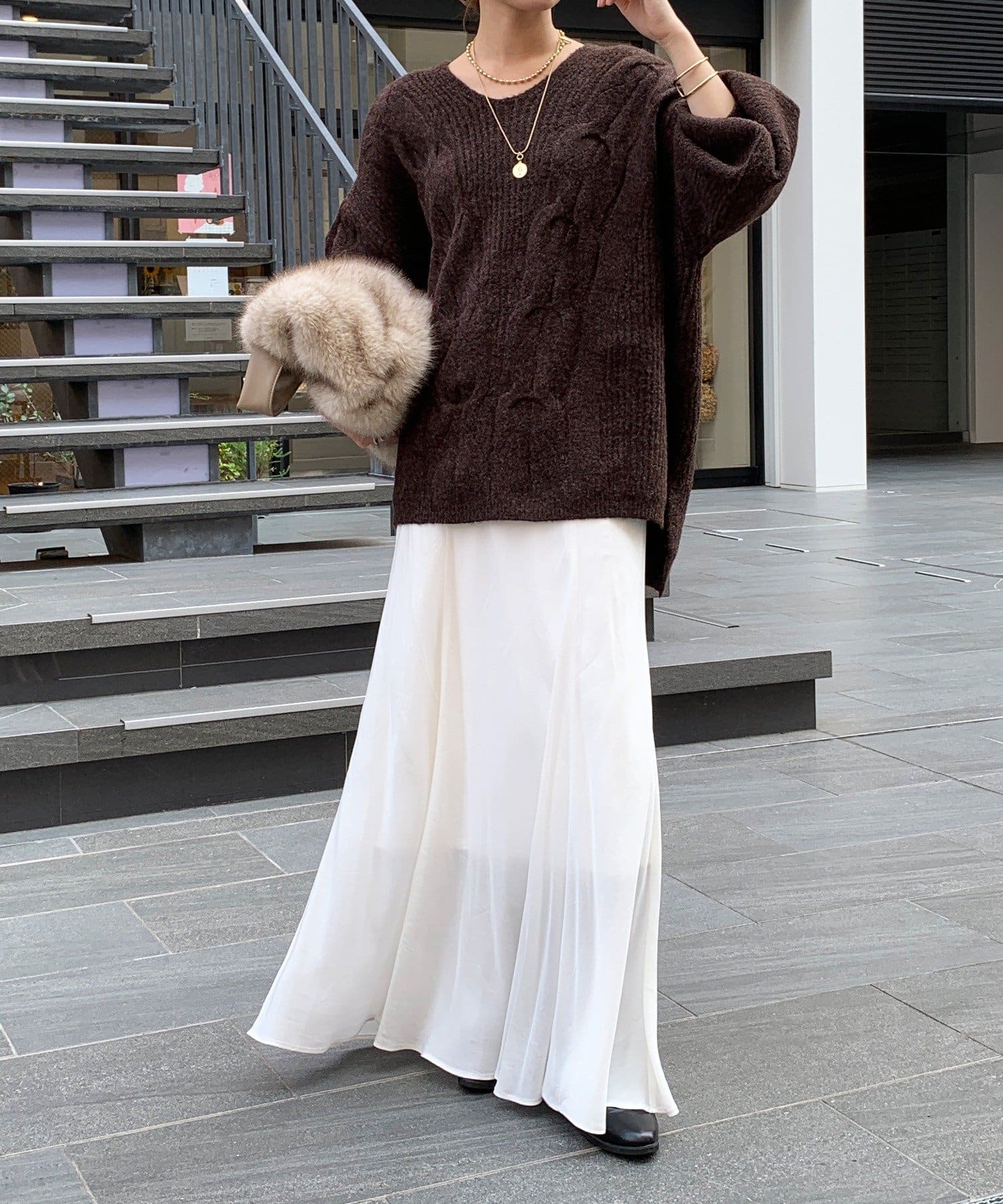温かみのある大きめのケーブル編みと、抜け感のあるシルエットがかわいいニット。