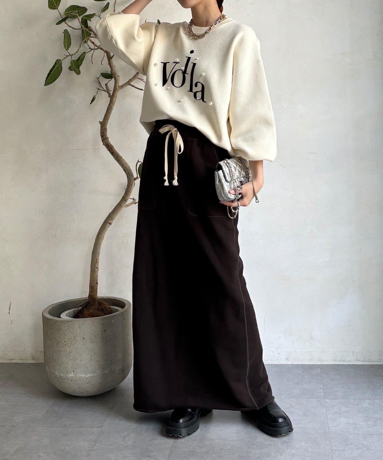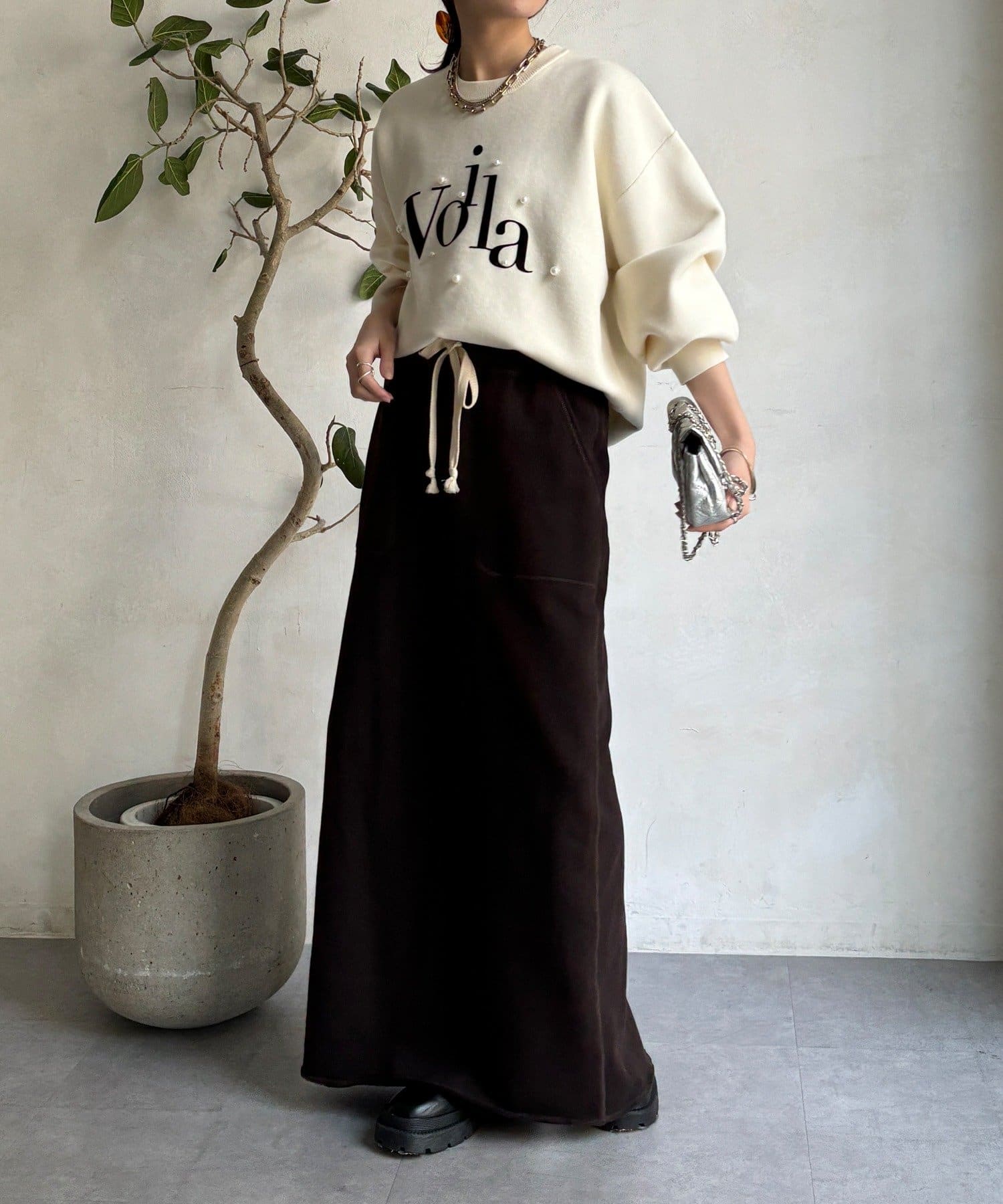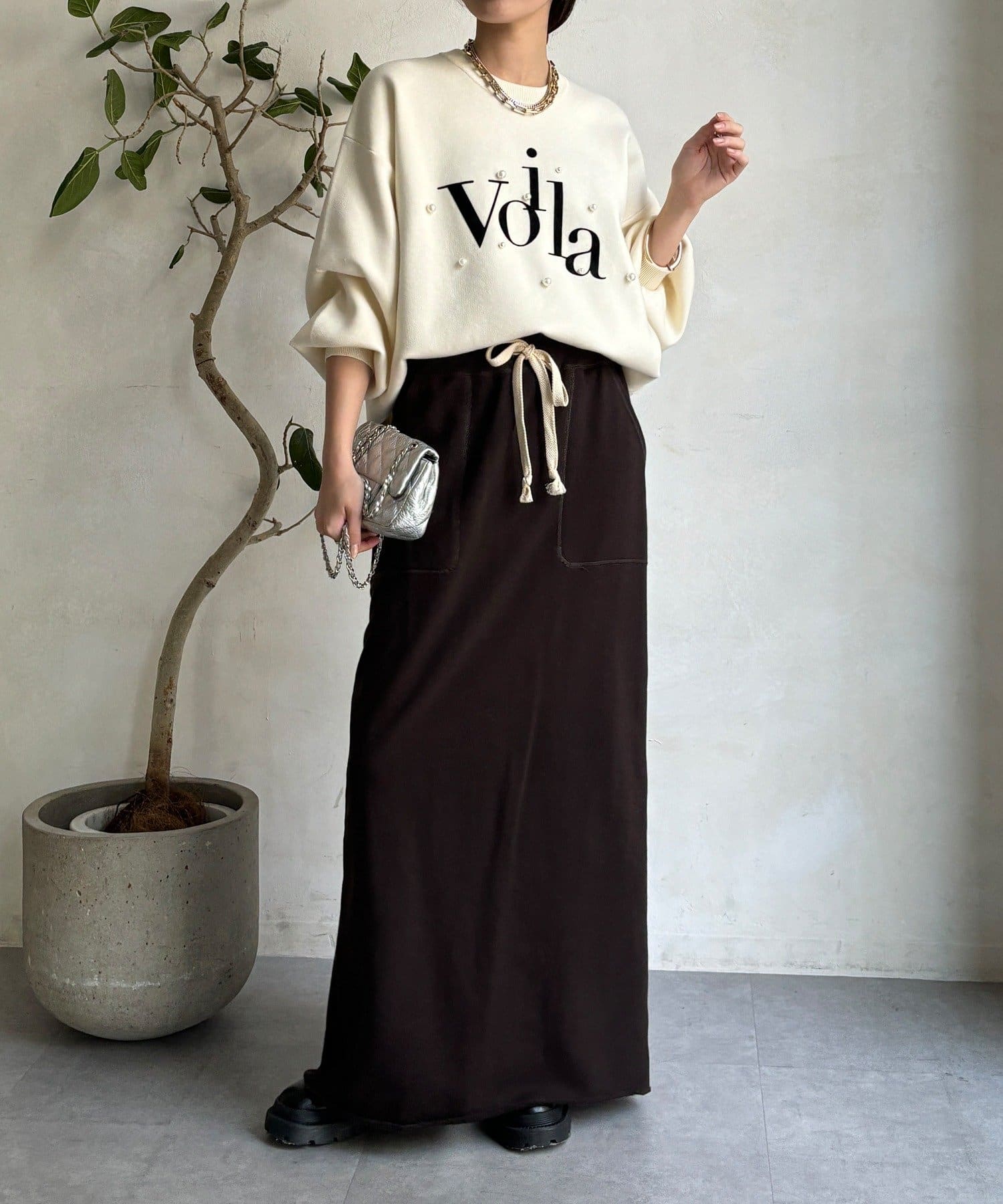 胸元のパールロゴが上品に輝くデザイン