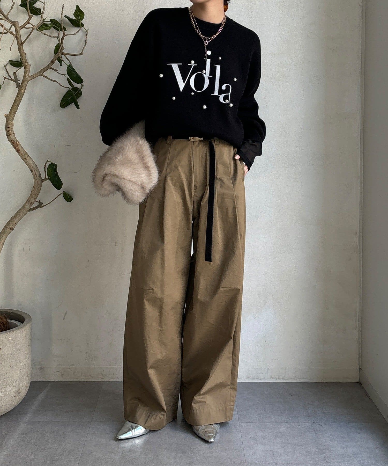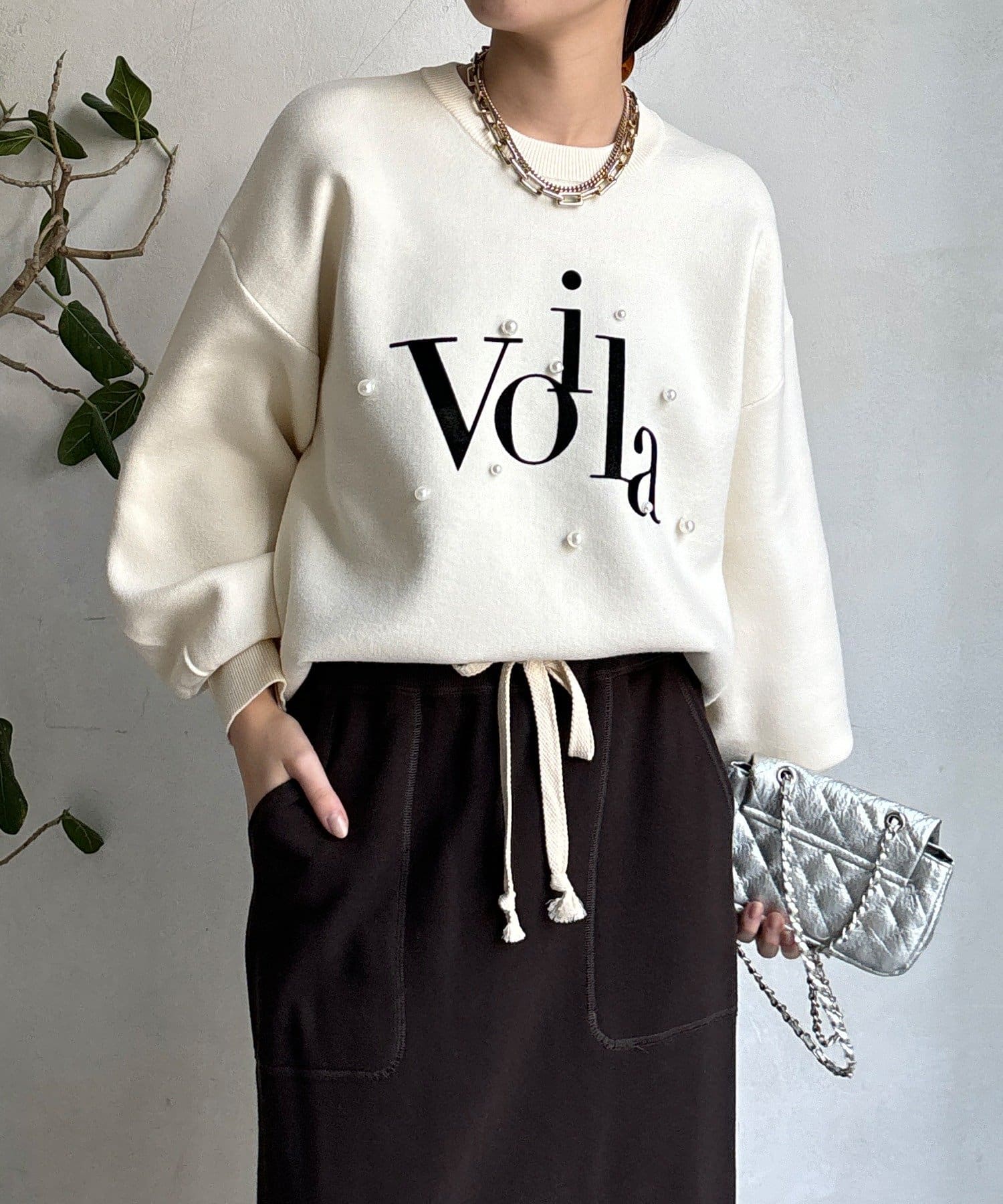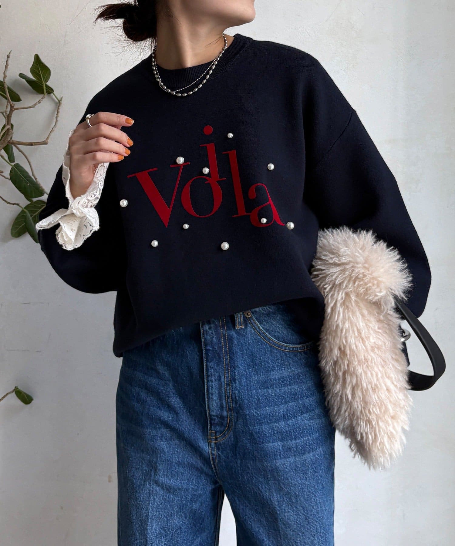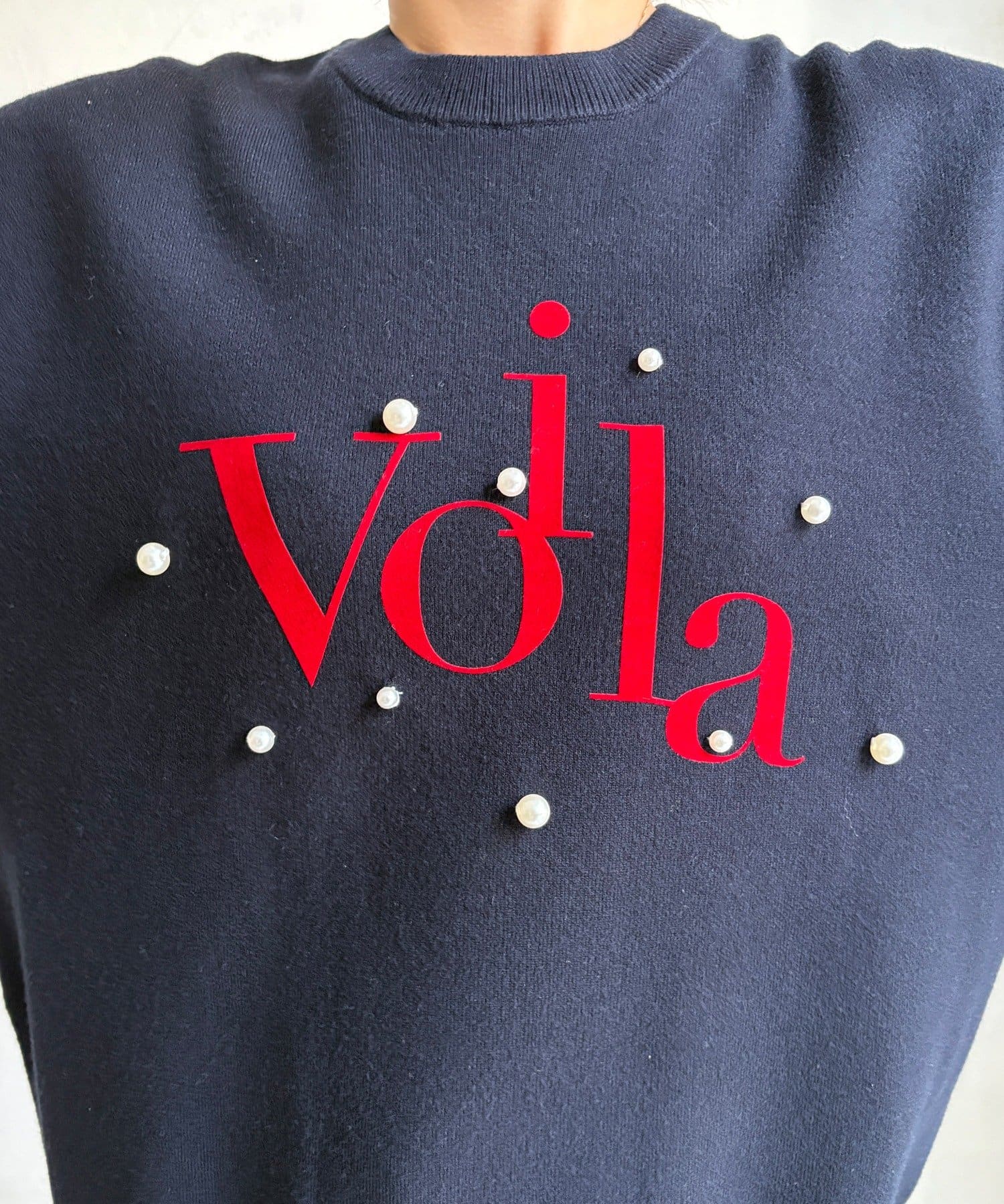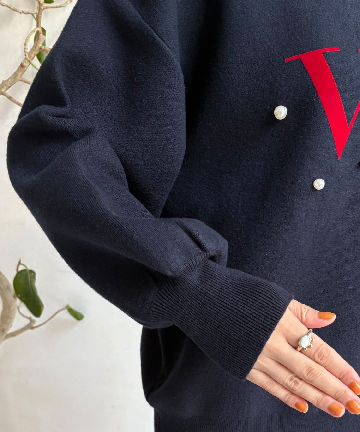 胸元にあしらわれたパールロゴが、さりげなくも目を惹くニットトップスが登場!