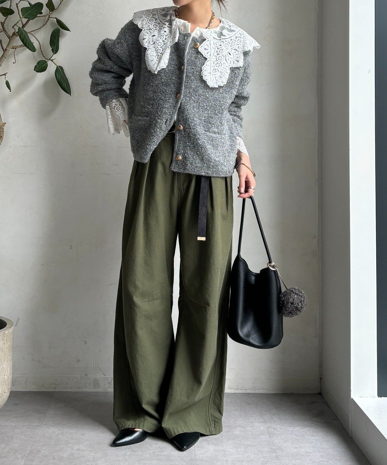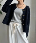 フロントにあしらわれたゴールドボタンが、さりげない華やかさをプラス。