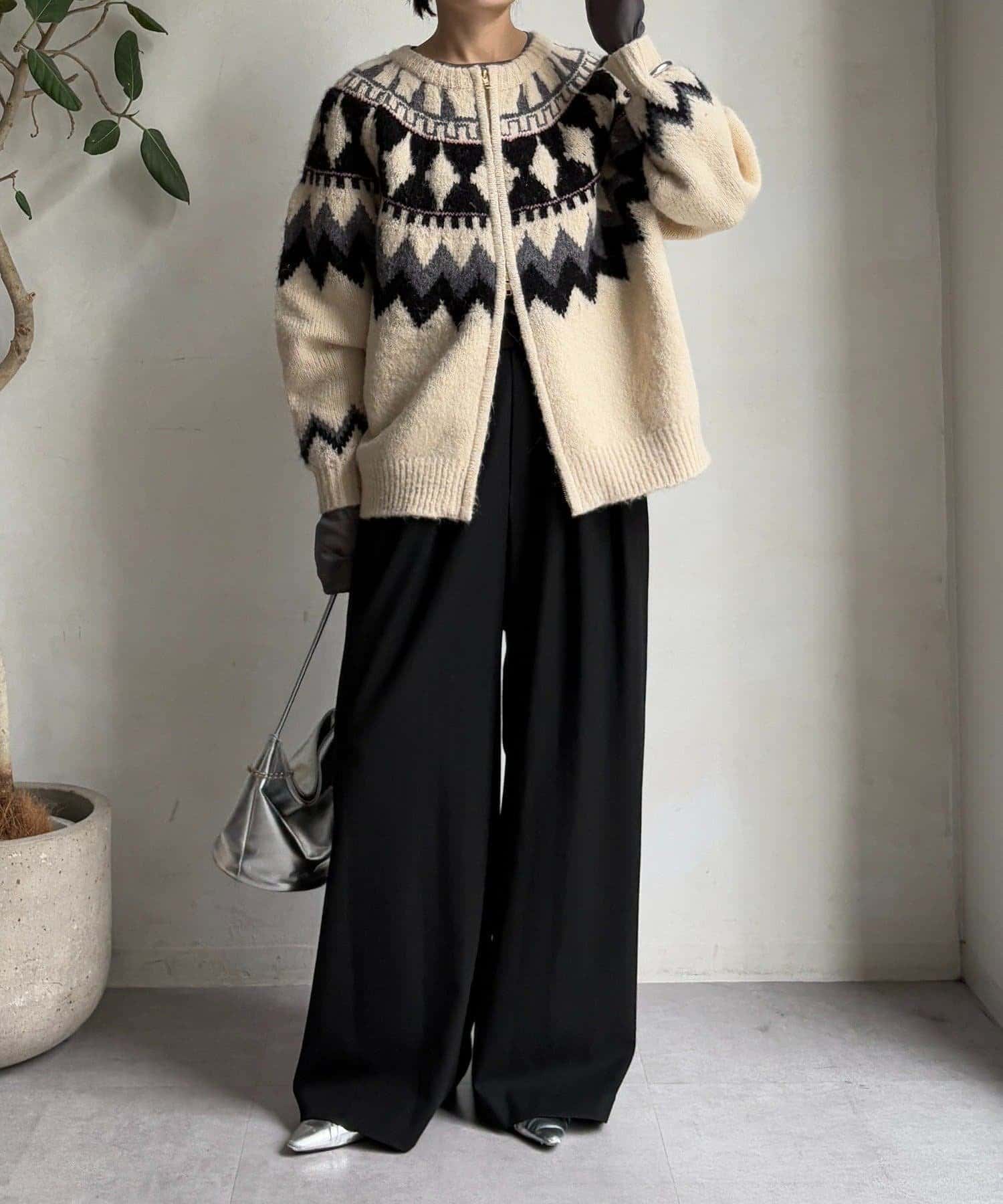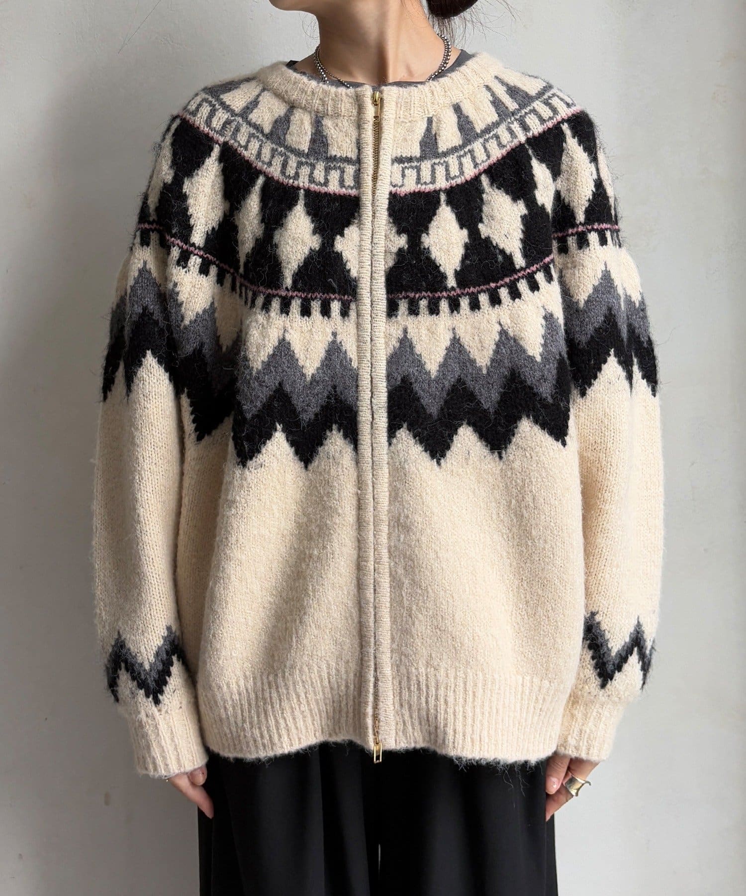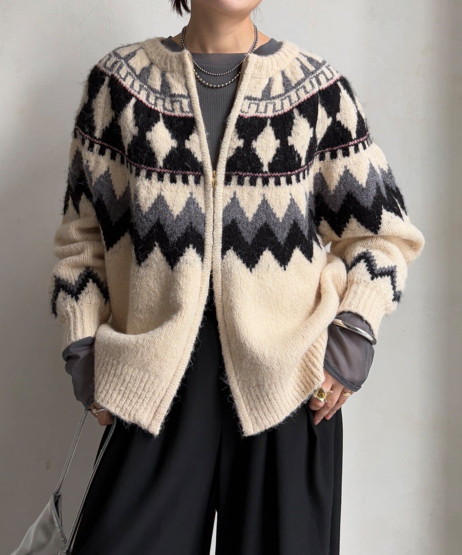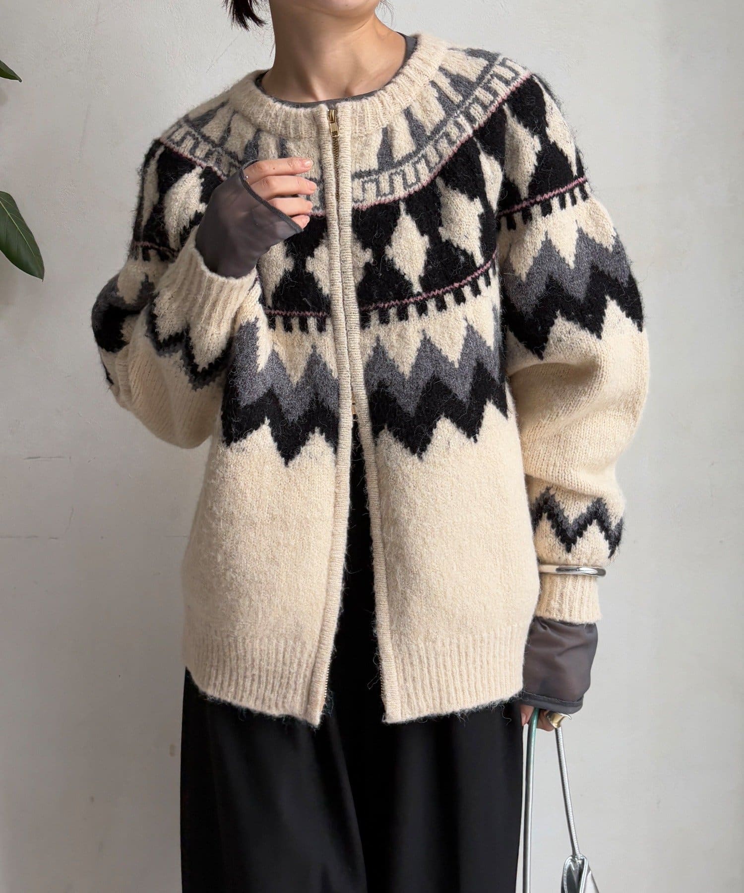 温かみのある柄のニットながらも、フロントをジップデザインにすることで甘さを抑えた大人の印象に。