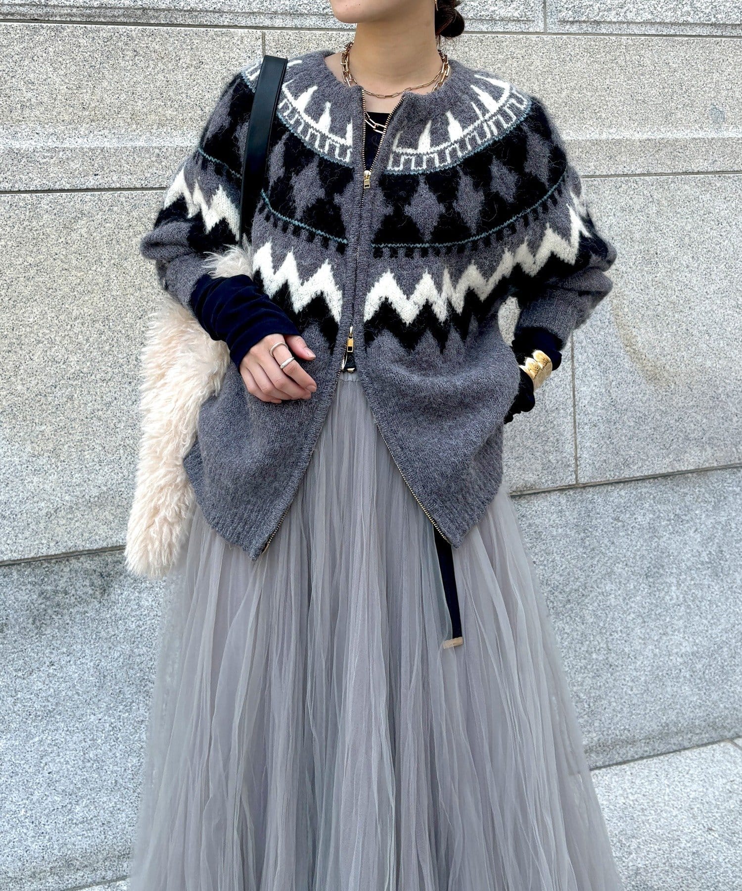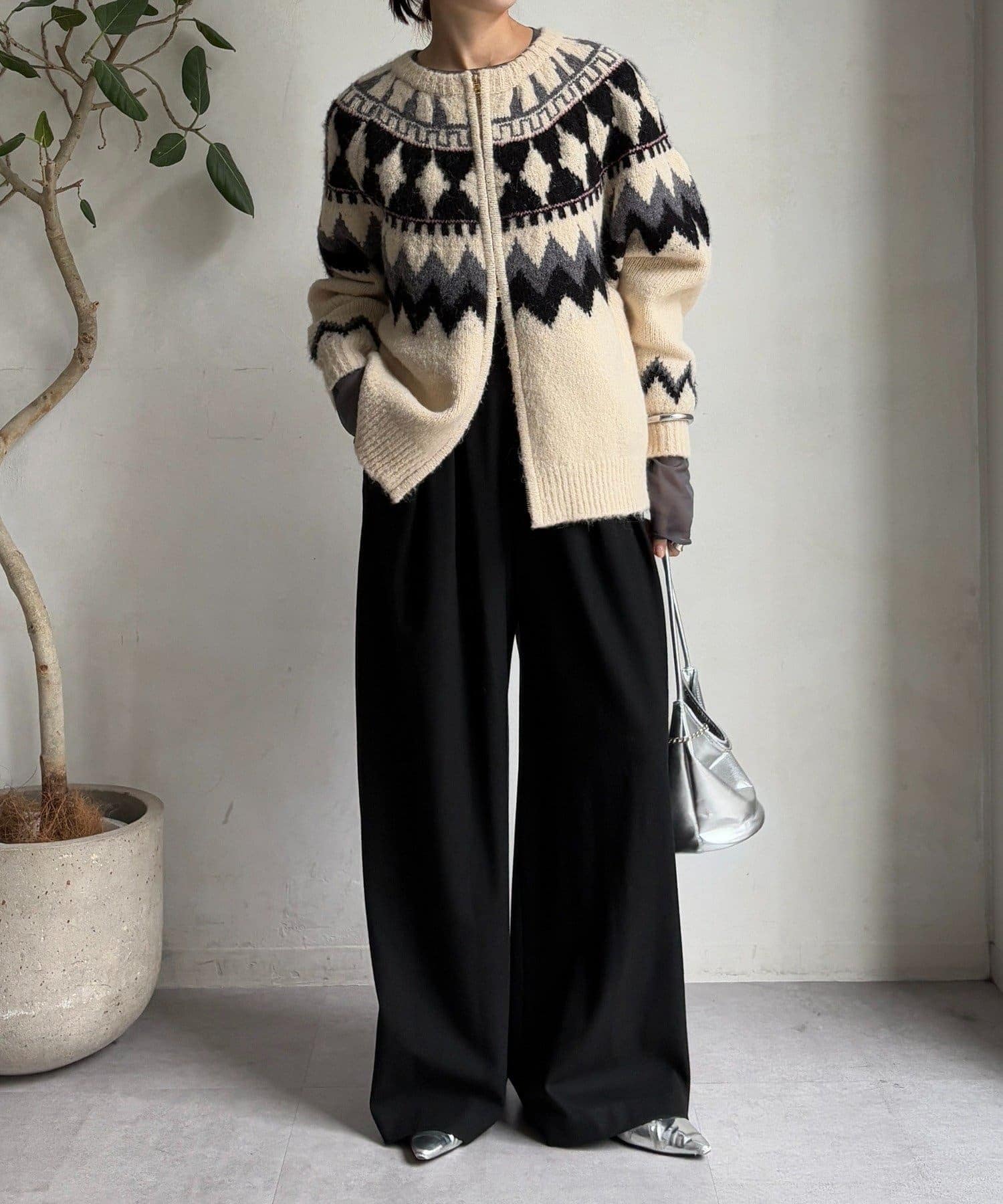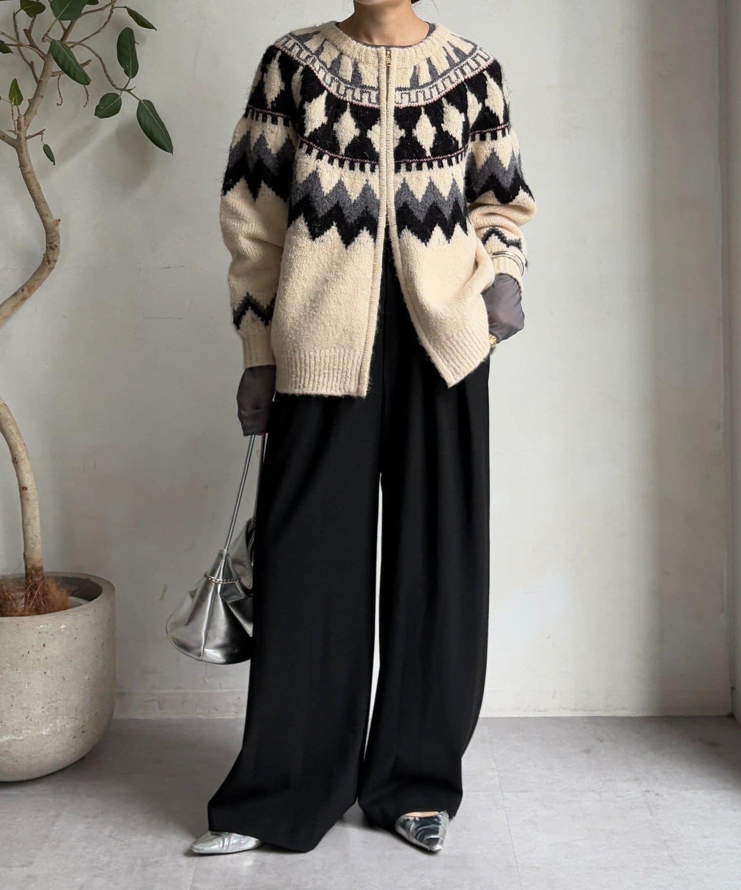 温かみのある柄のニットながらも、フロントをジップデザインにすることで甘さを抑えた大人の印象に。
