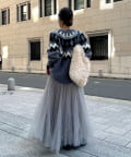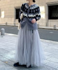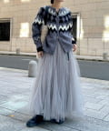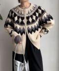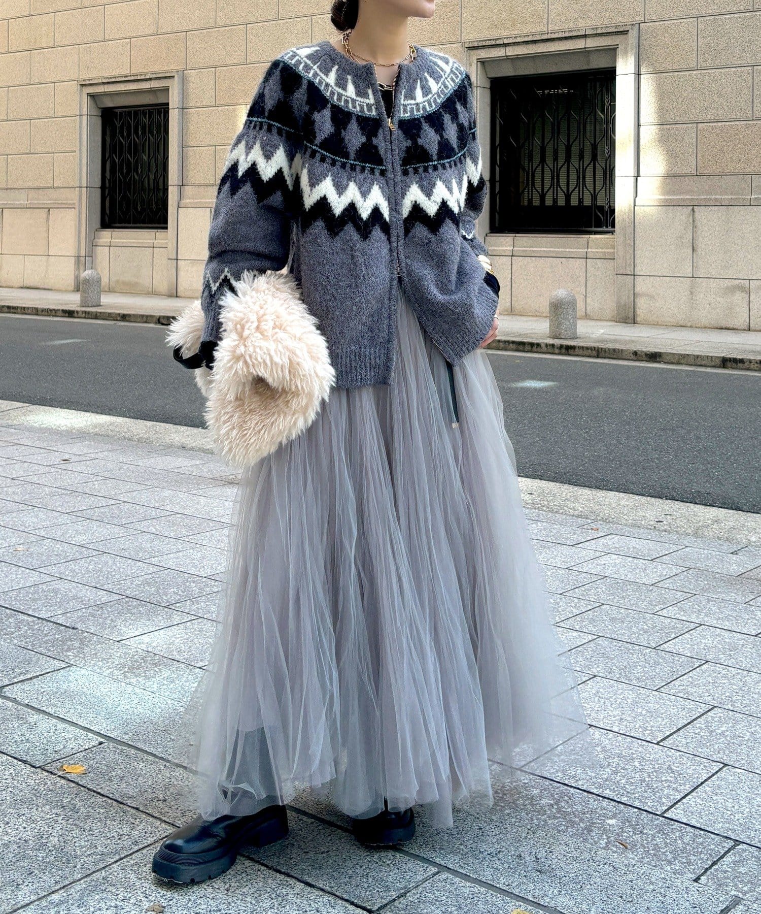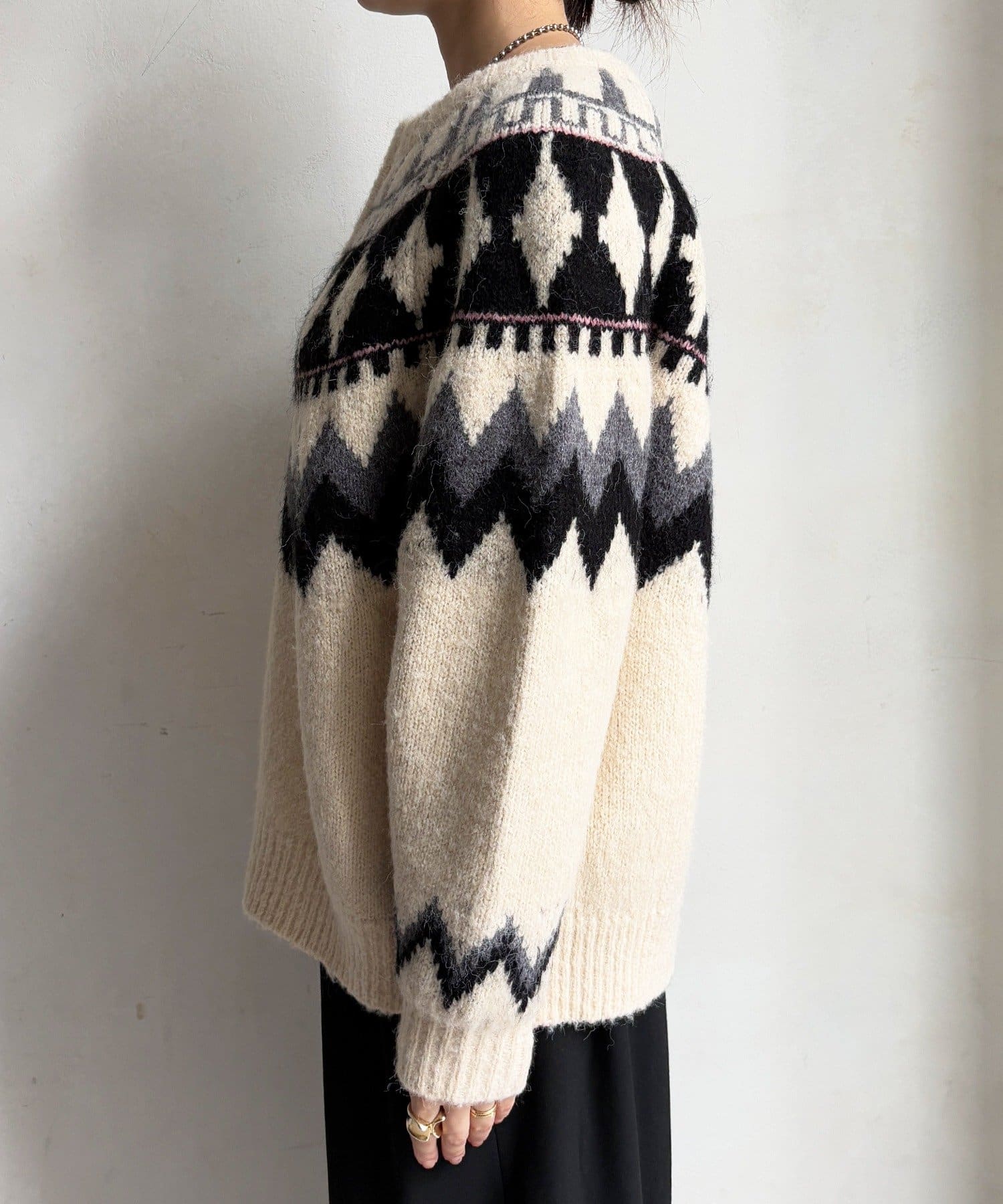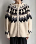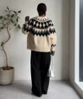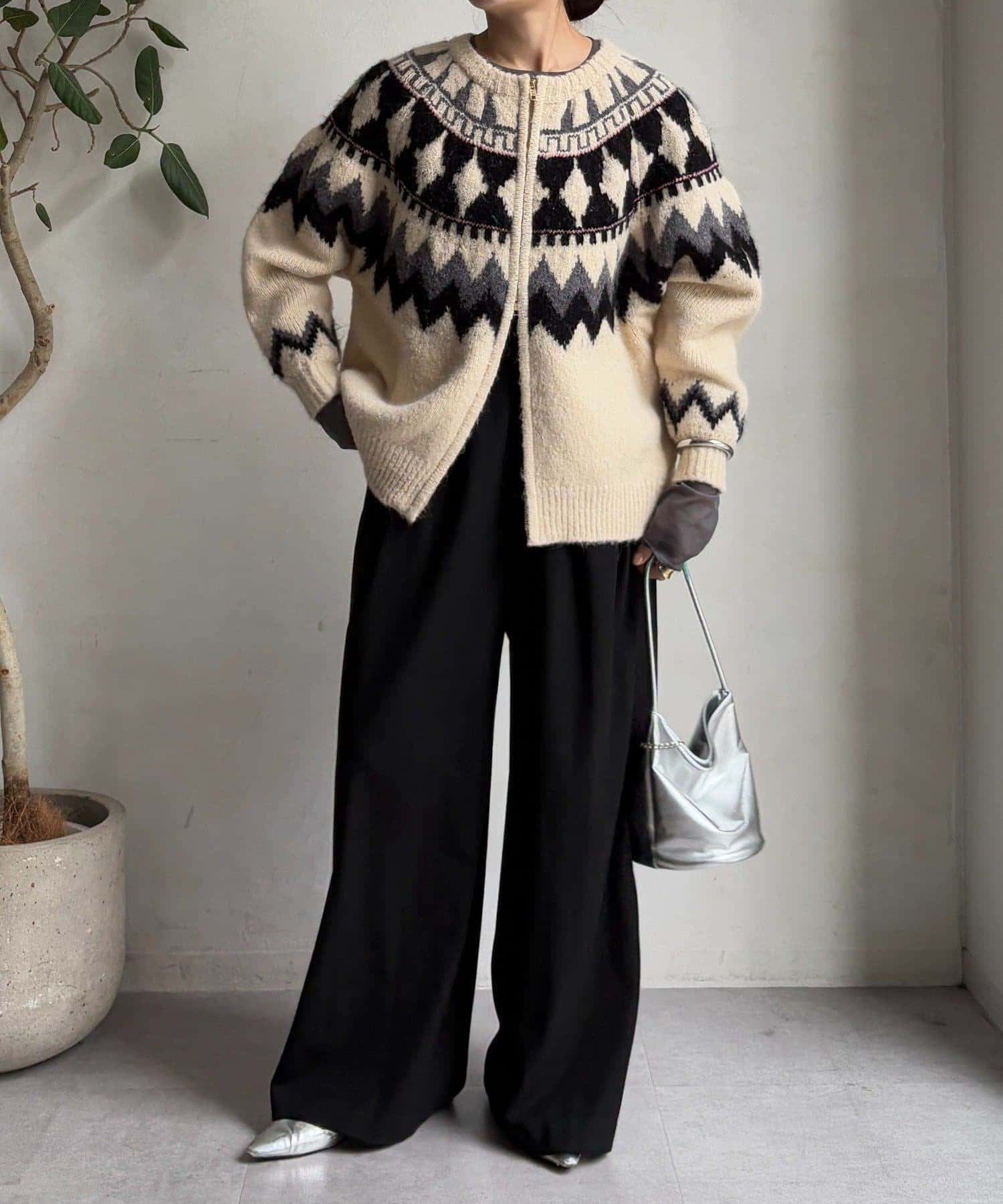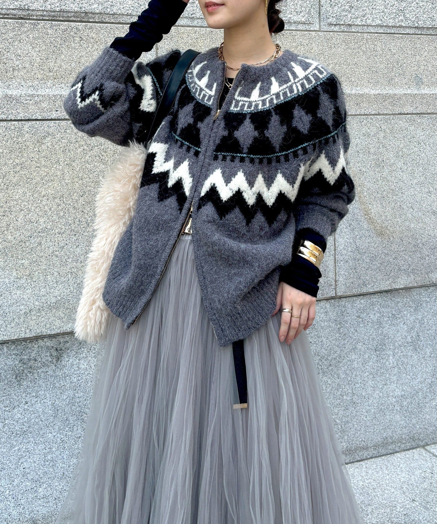 温かみのある柄のニットながらも、フロントをジップデザインにすることで甘さを抑えた大人の印象に。