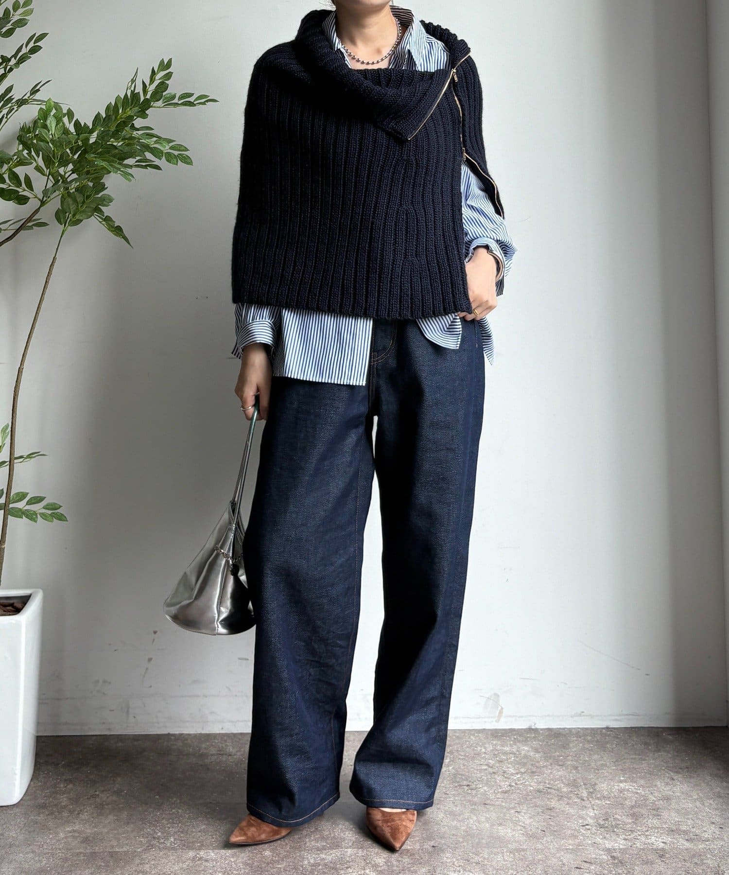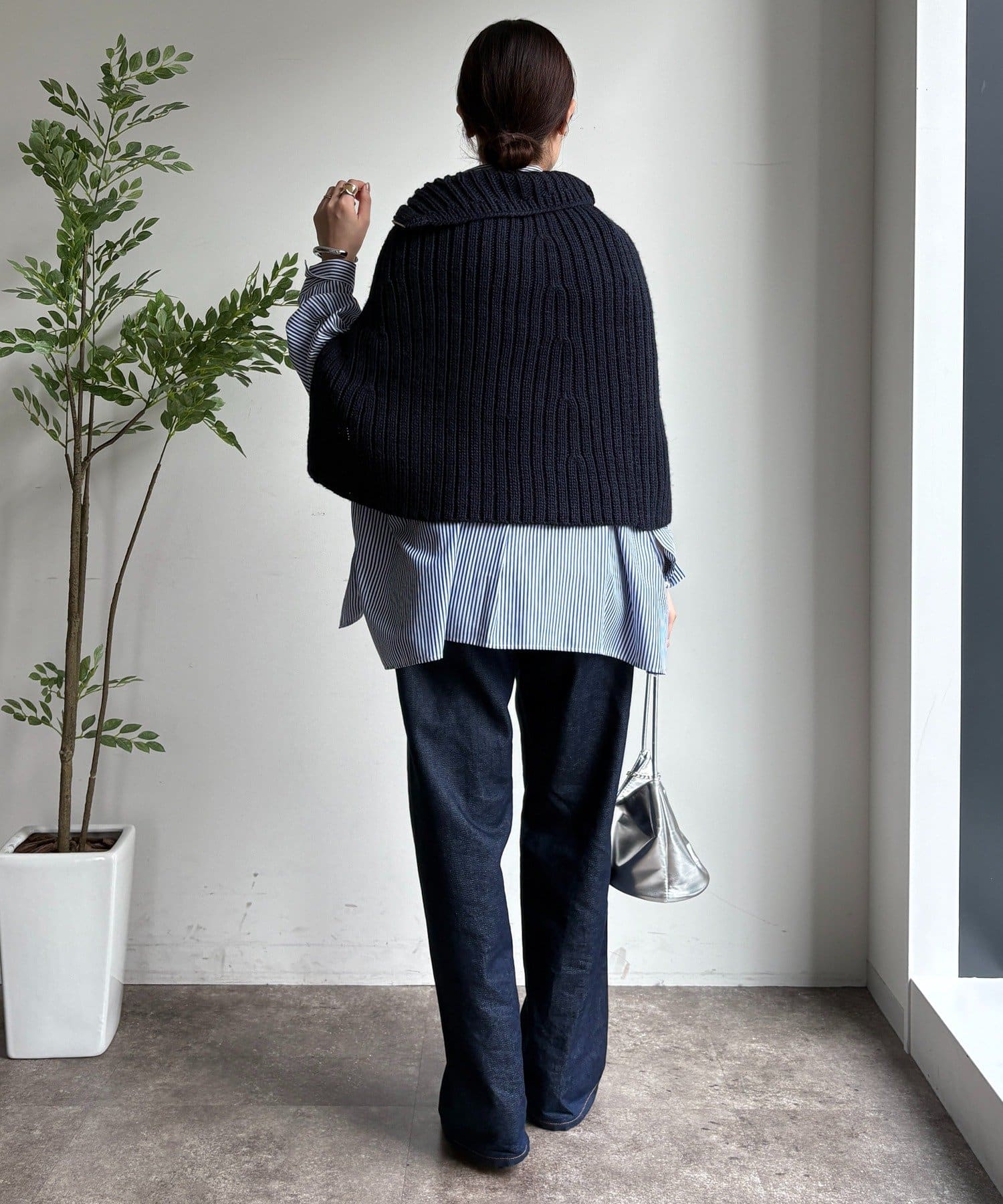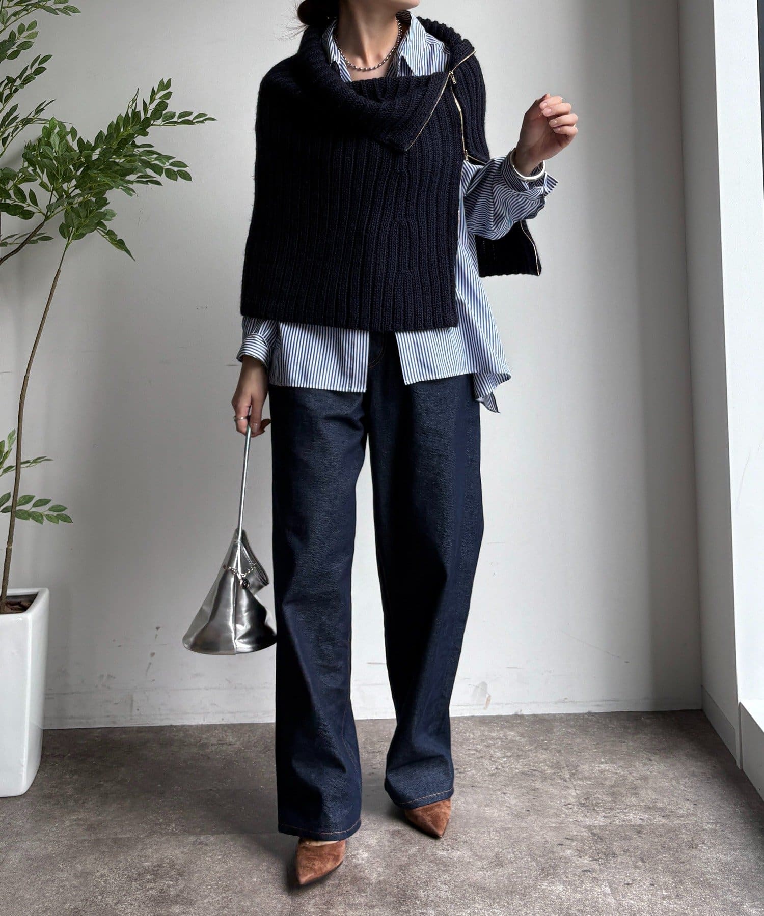 冬には、ニットやタートルネックとのレイヤードスタイルで、暖かくおしゃれを楽しめます。