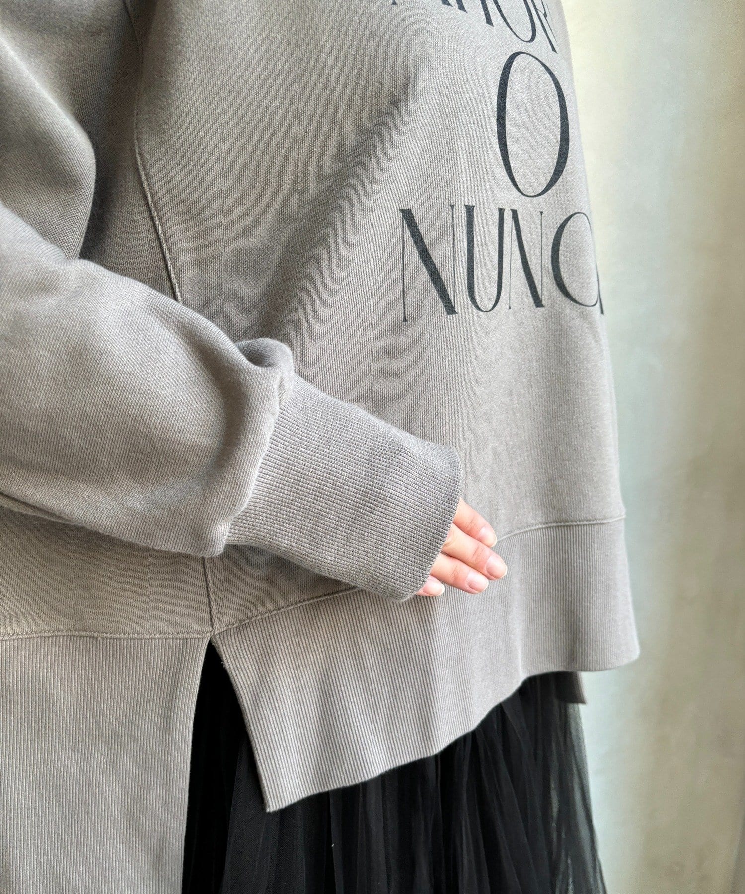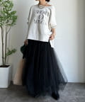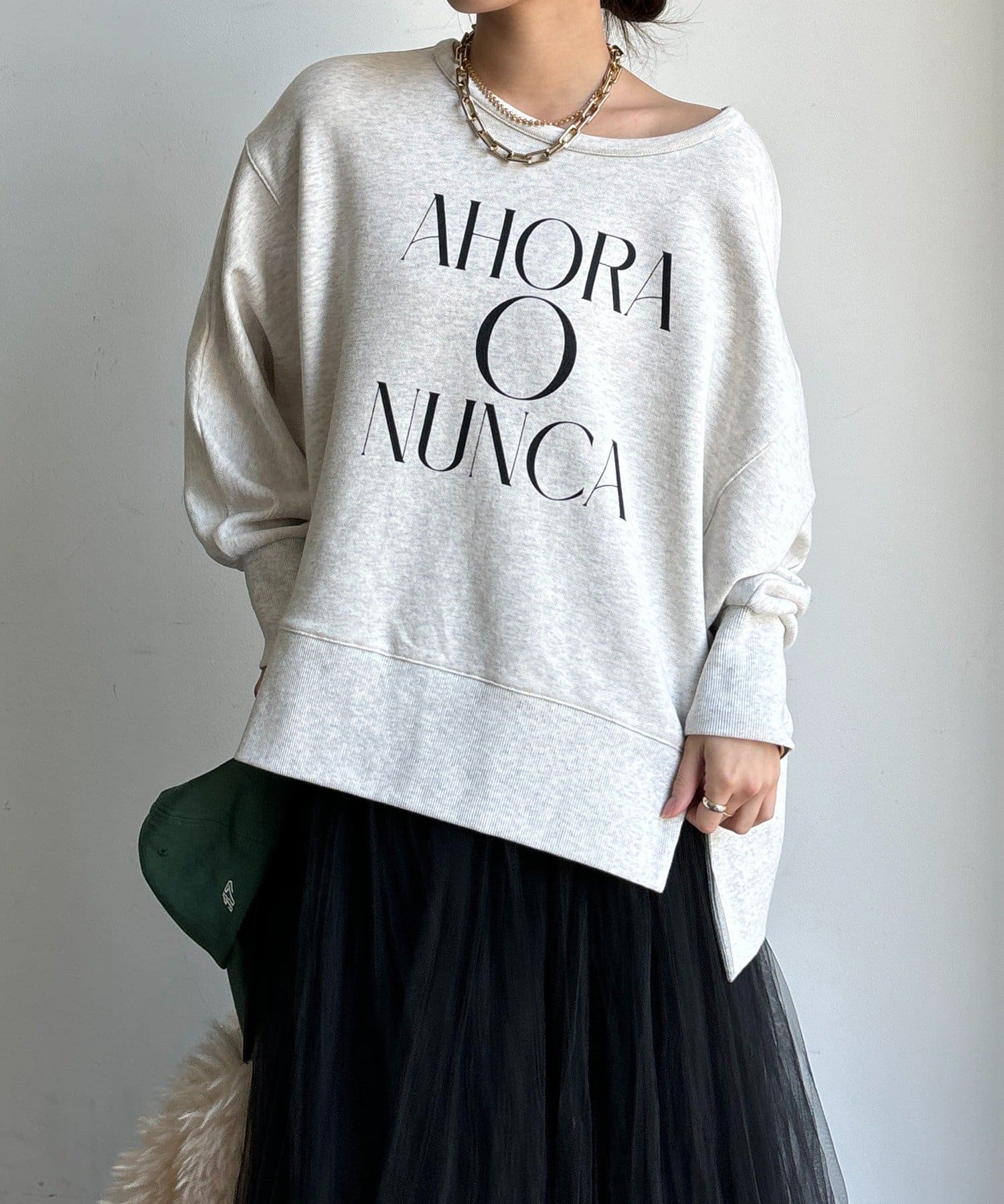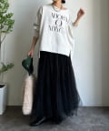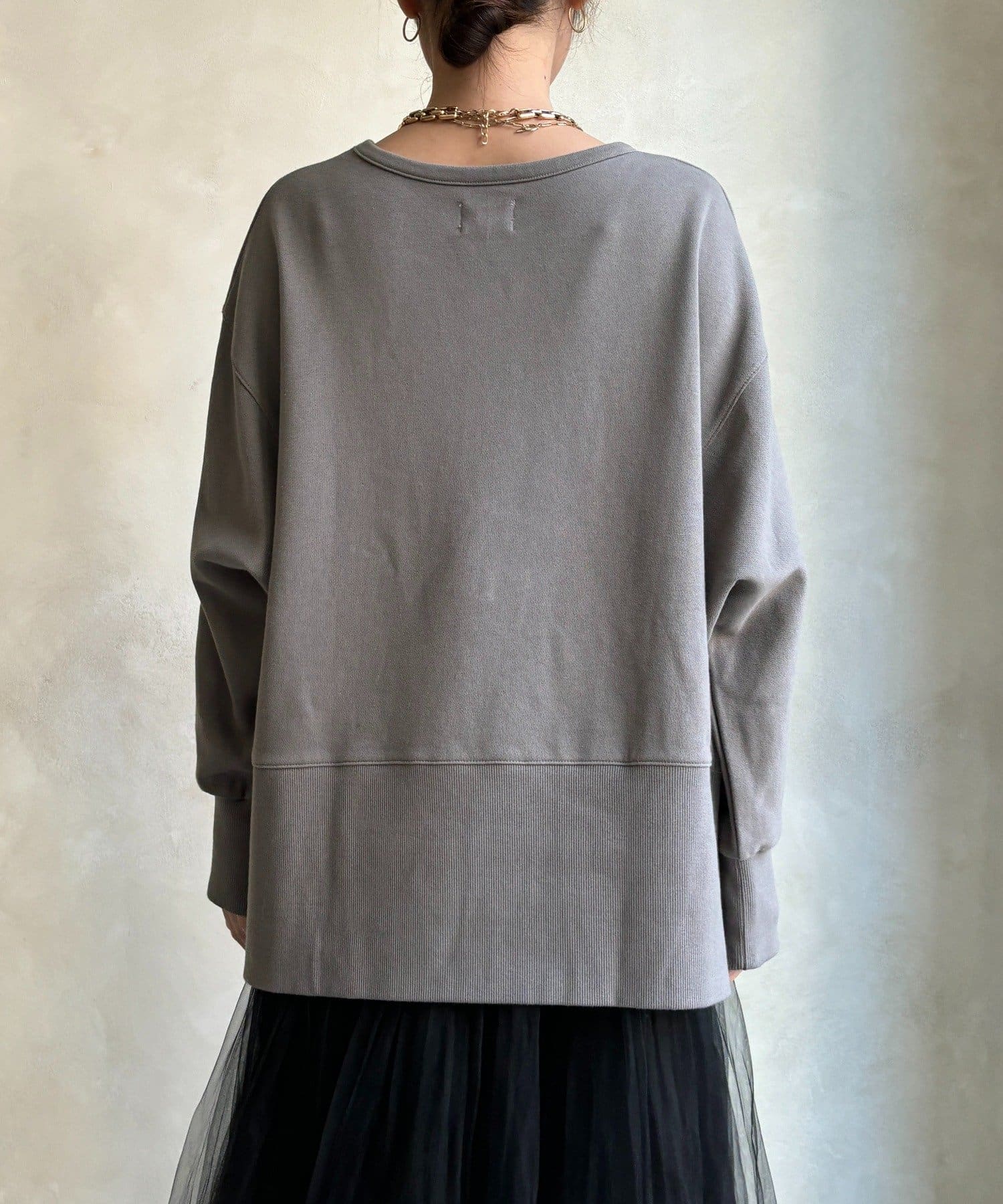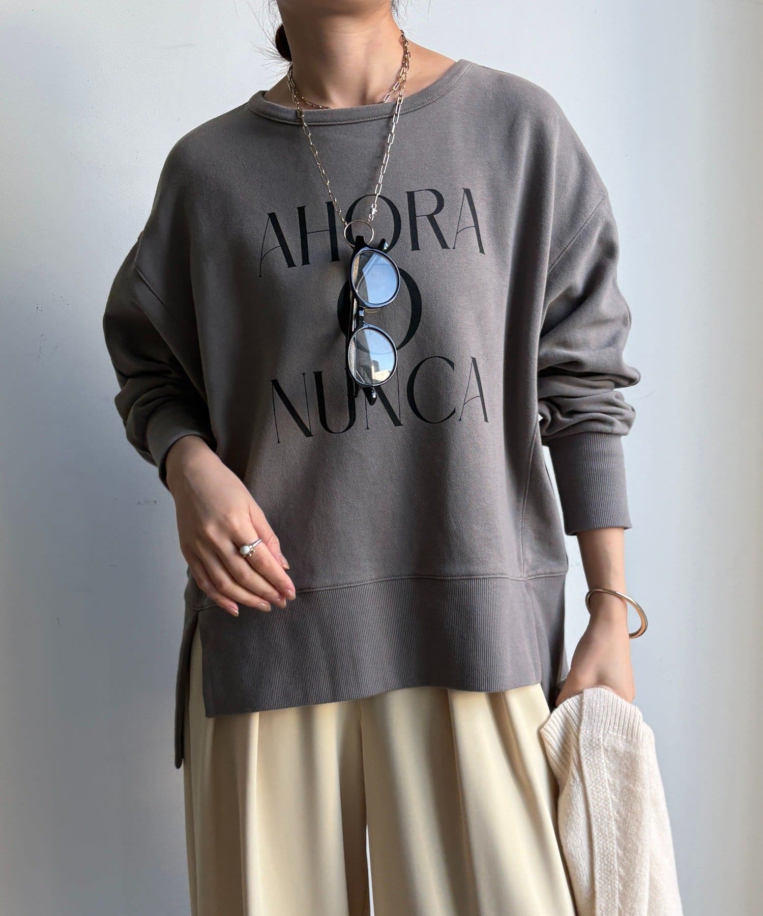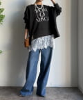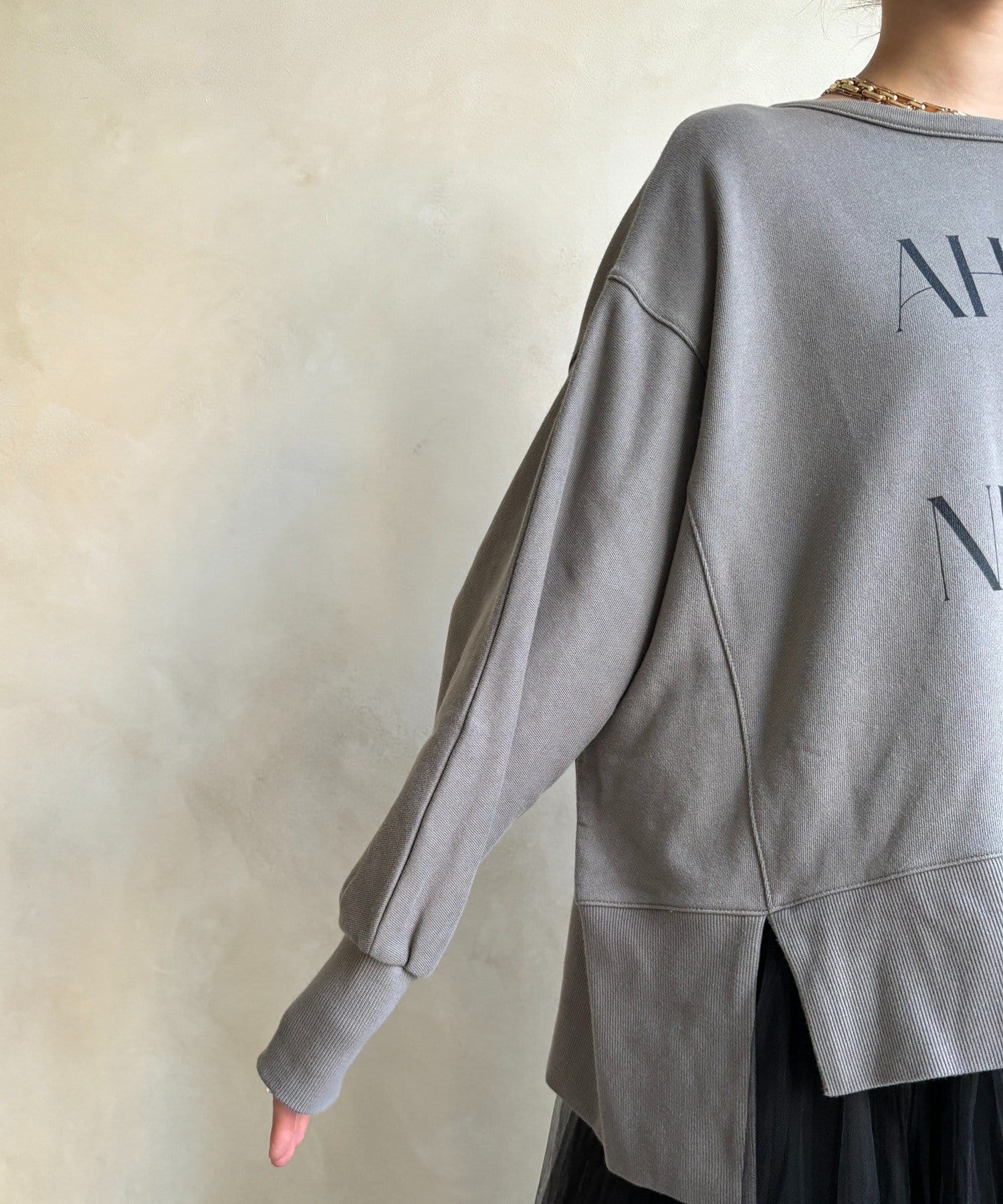 ラフさの中に抜け感と女性らしさを感じる「サイドスリットロゴスウェット」