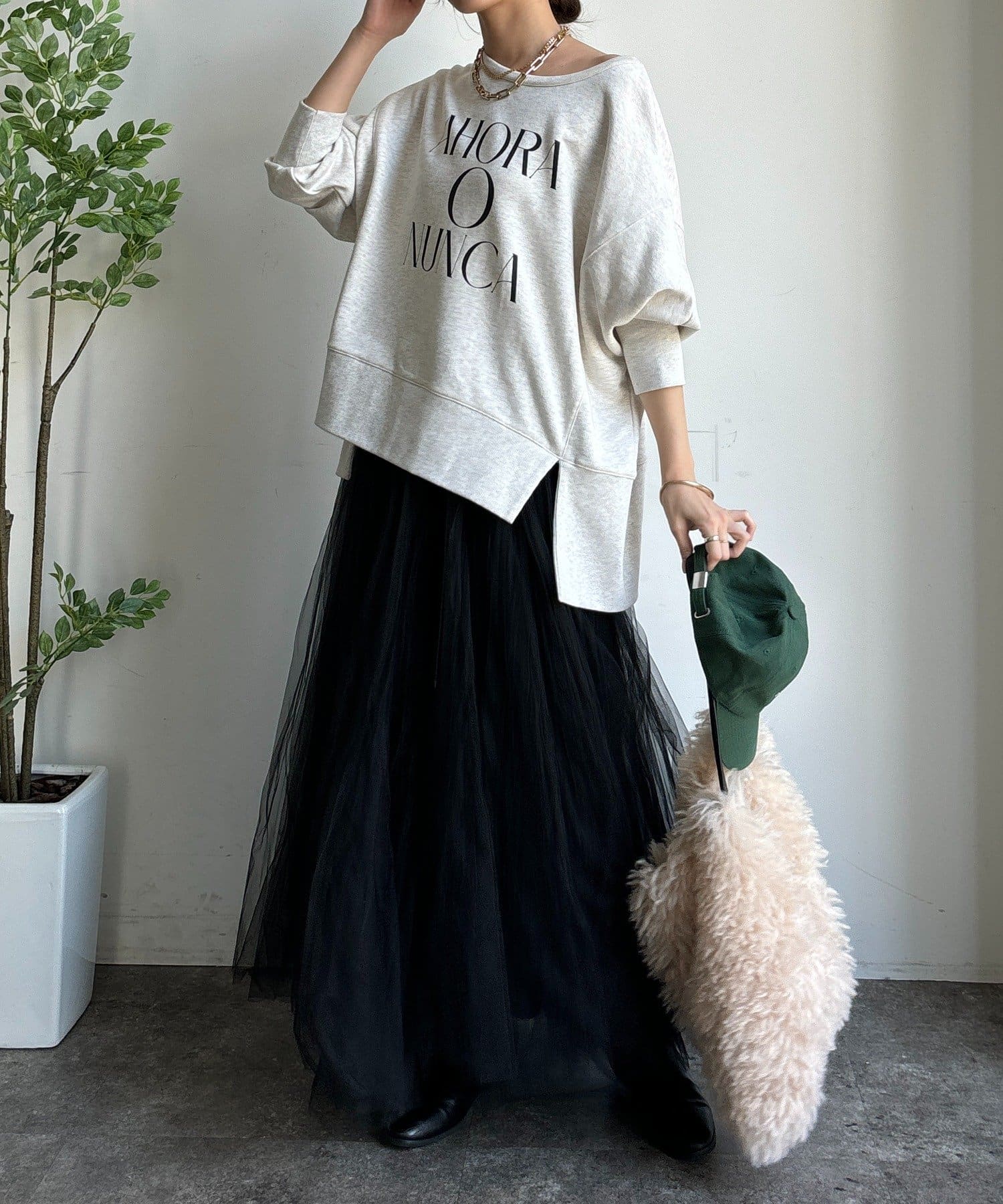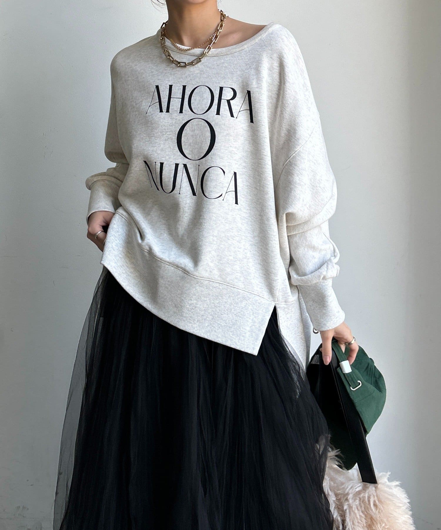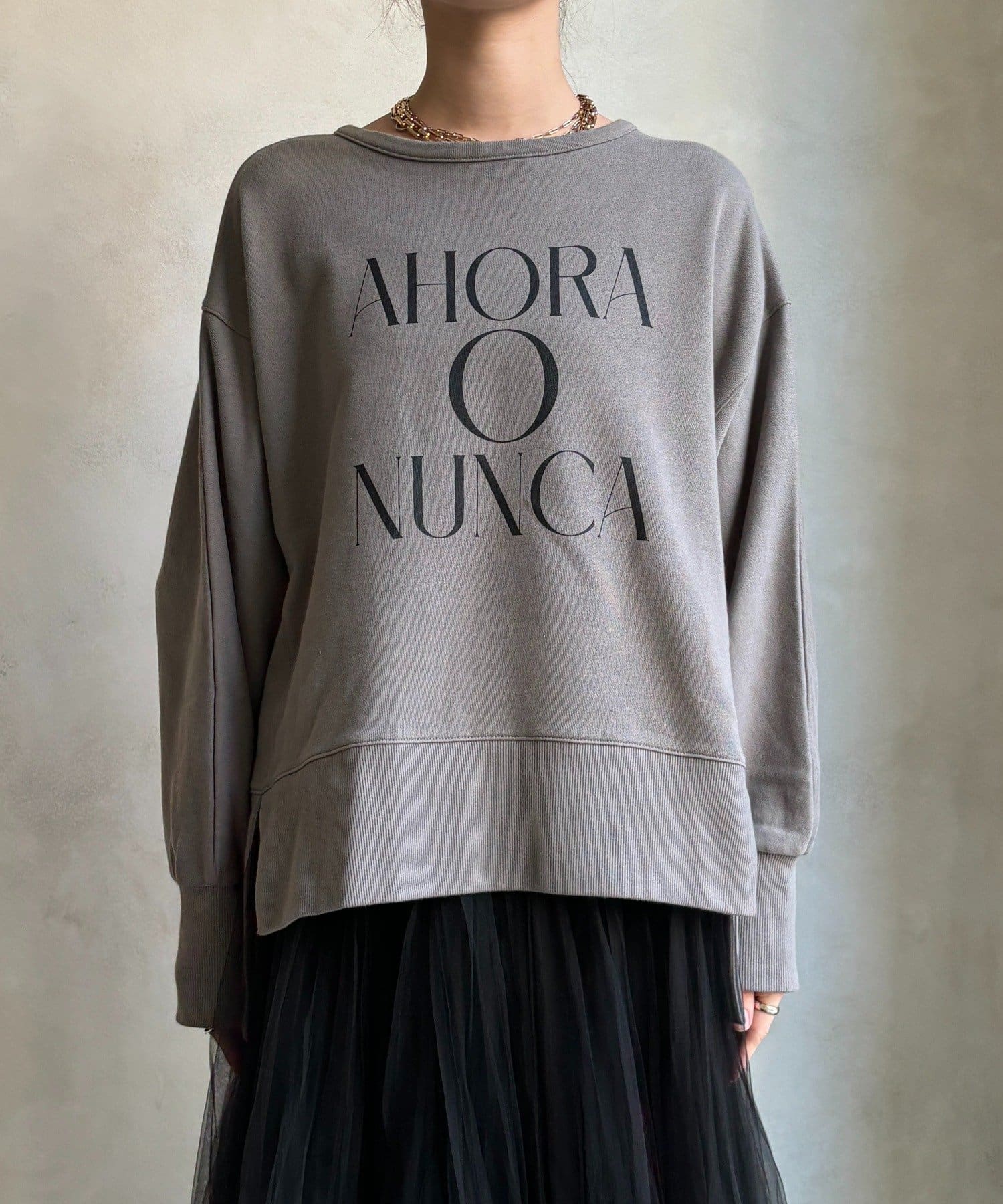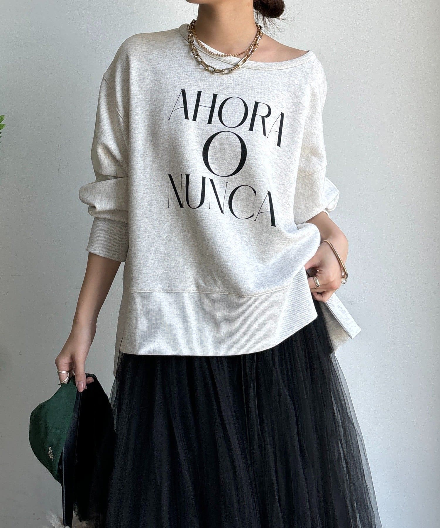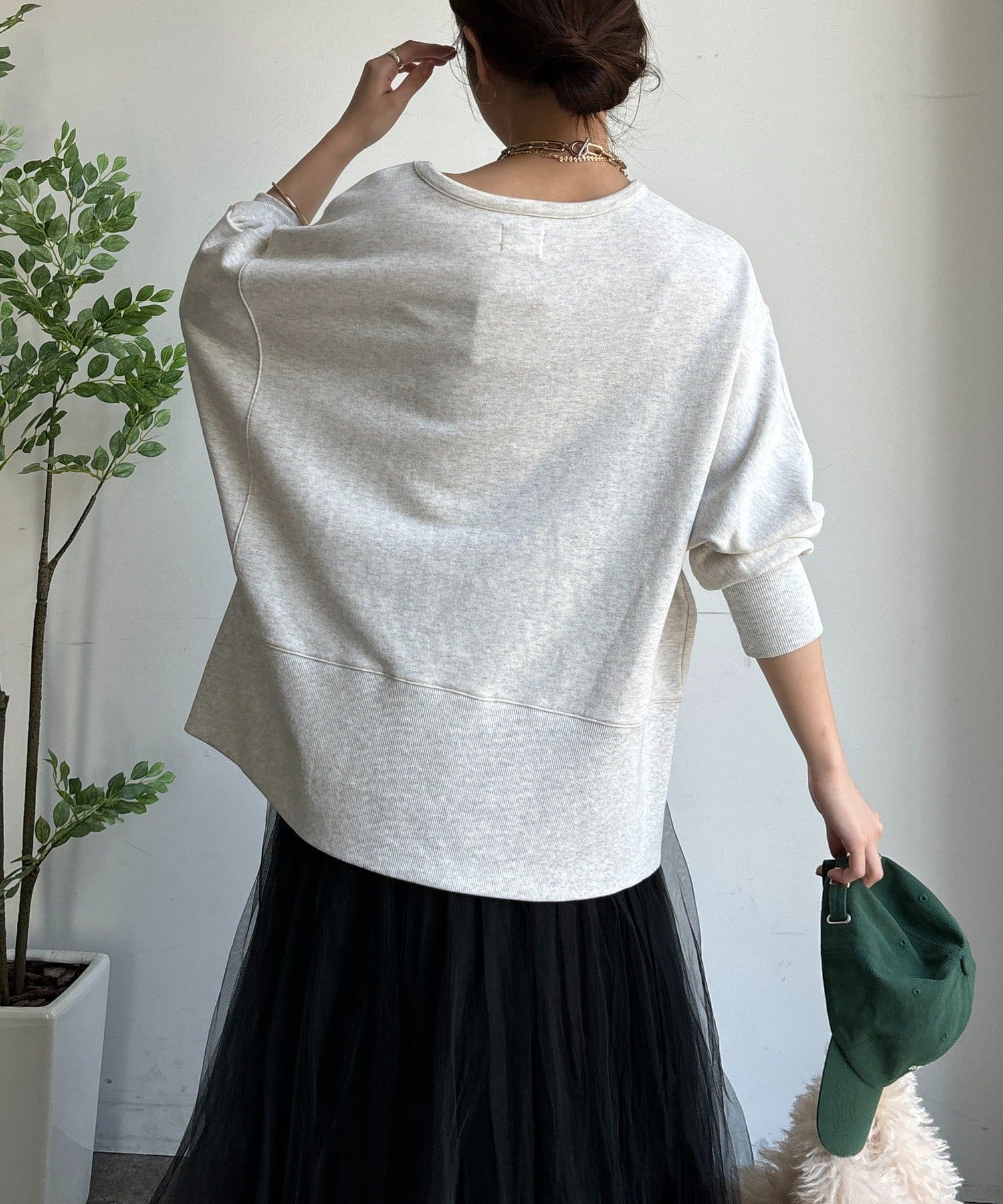 ラフさの中に抜け感と女性らしさを感じる「サイドスリットロゴスウェット」