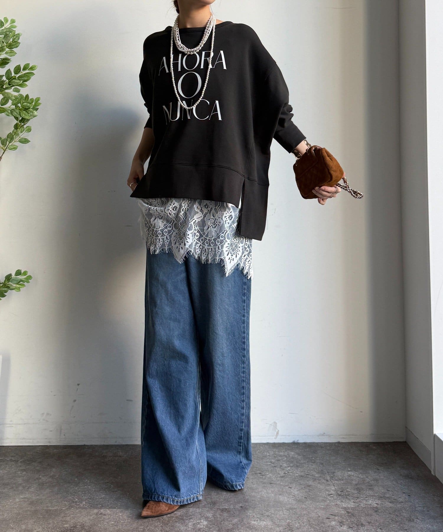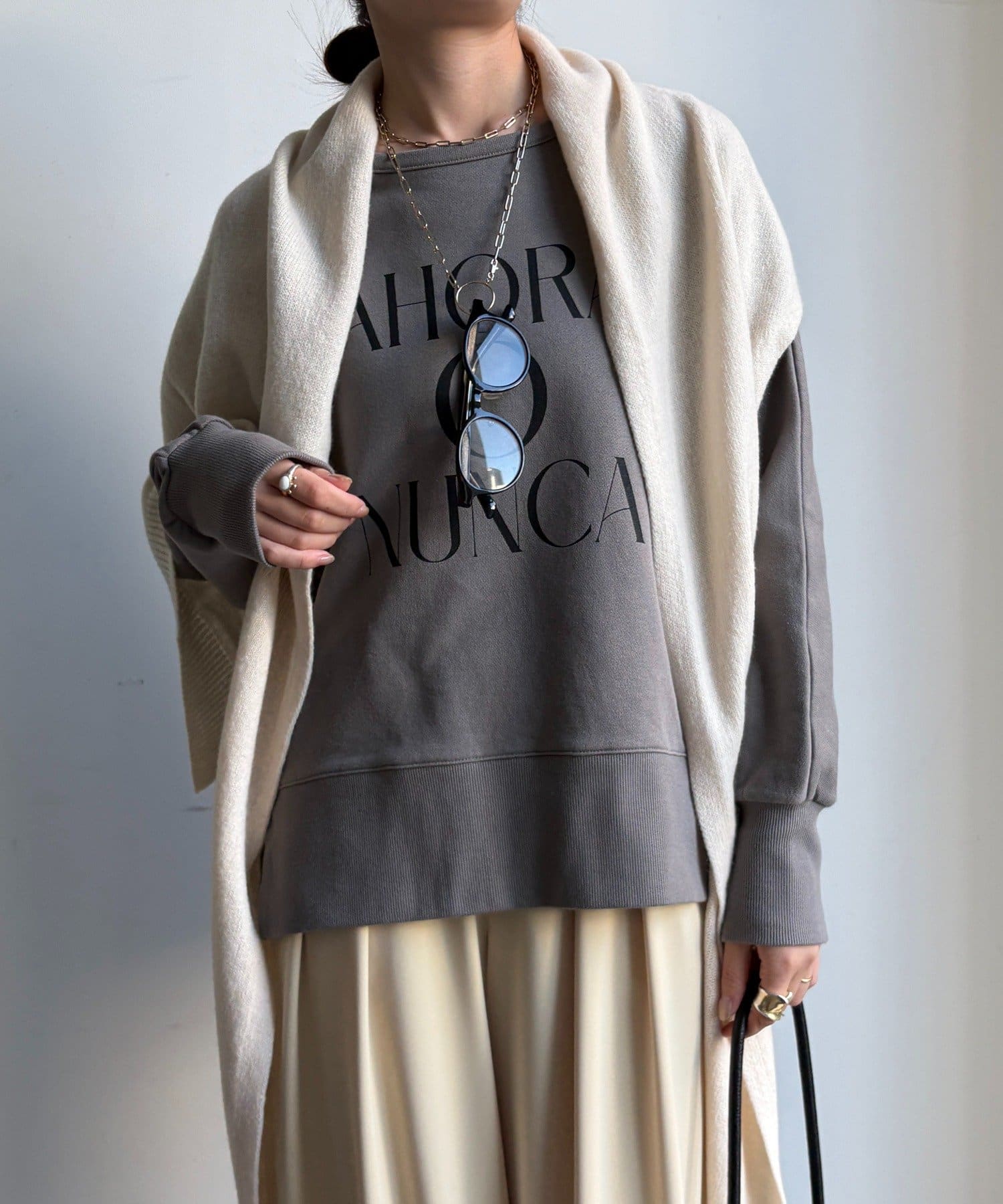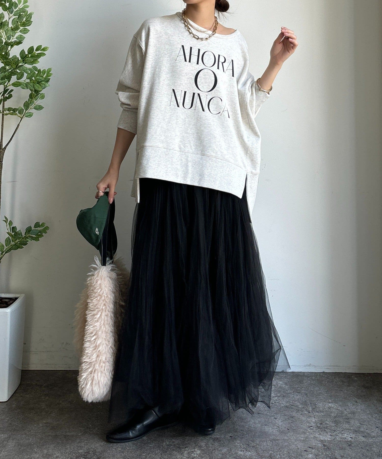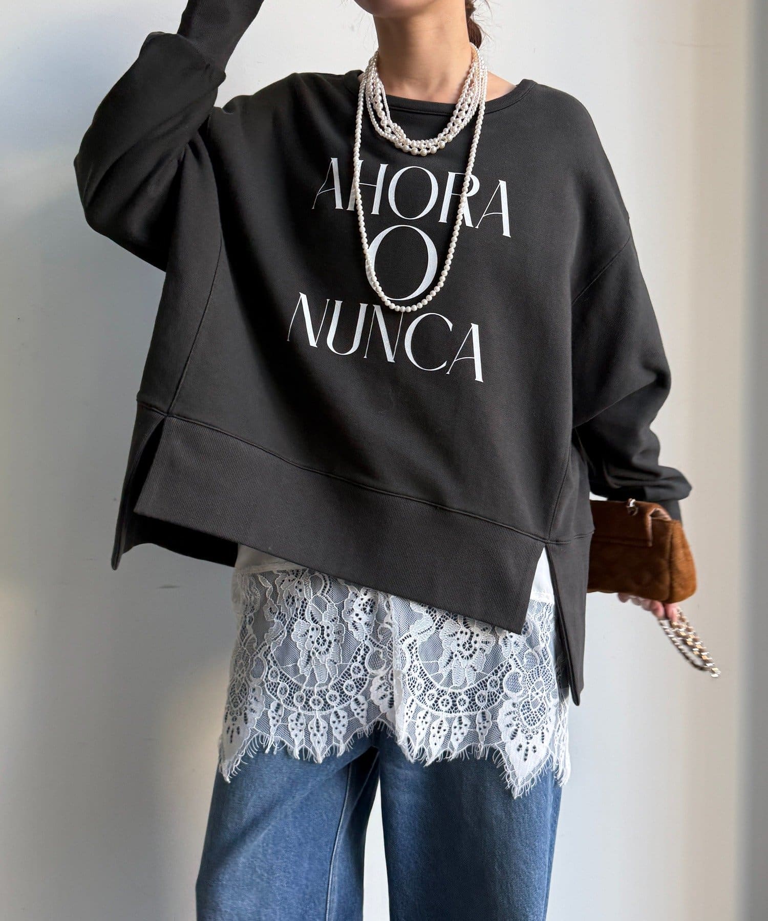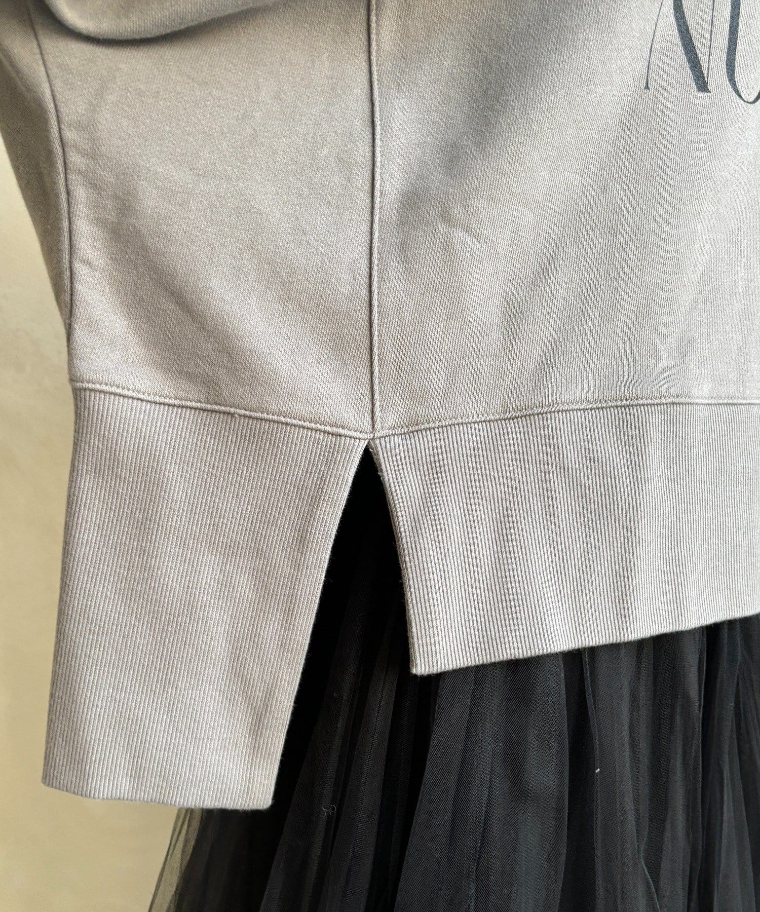 ラフさの中に抜け感と女性らしさを感じる「サイドスリットロゴスウェット」