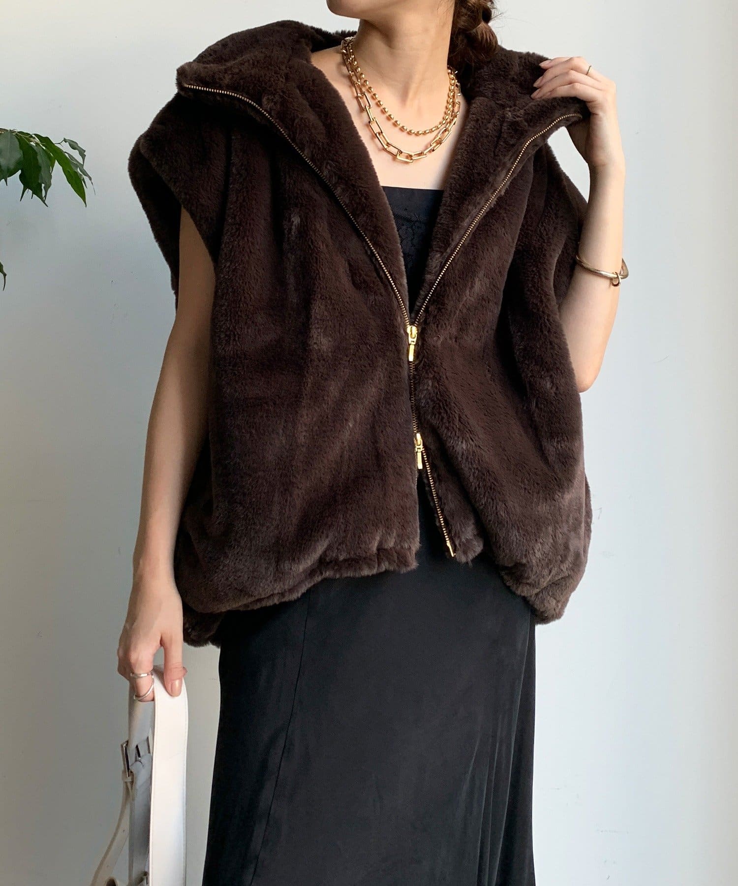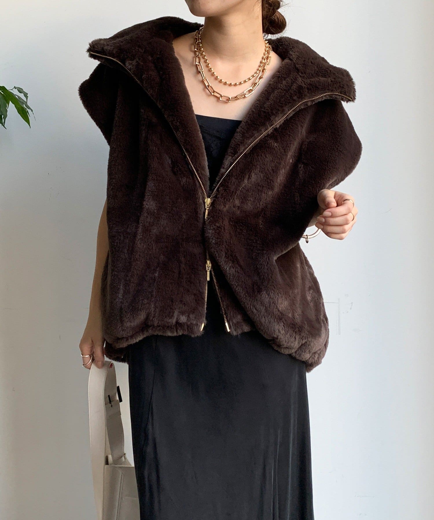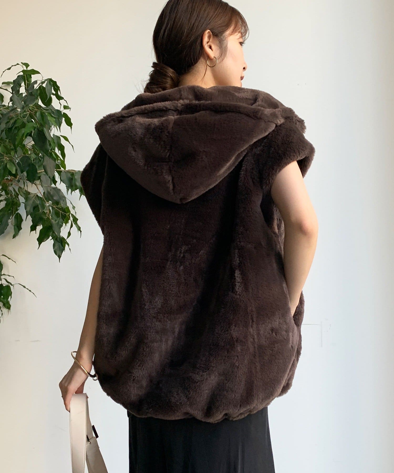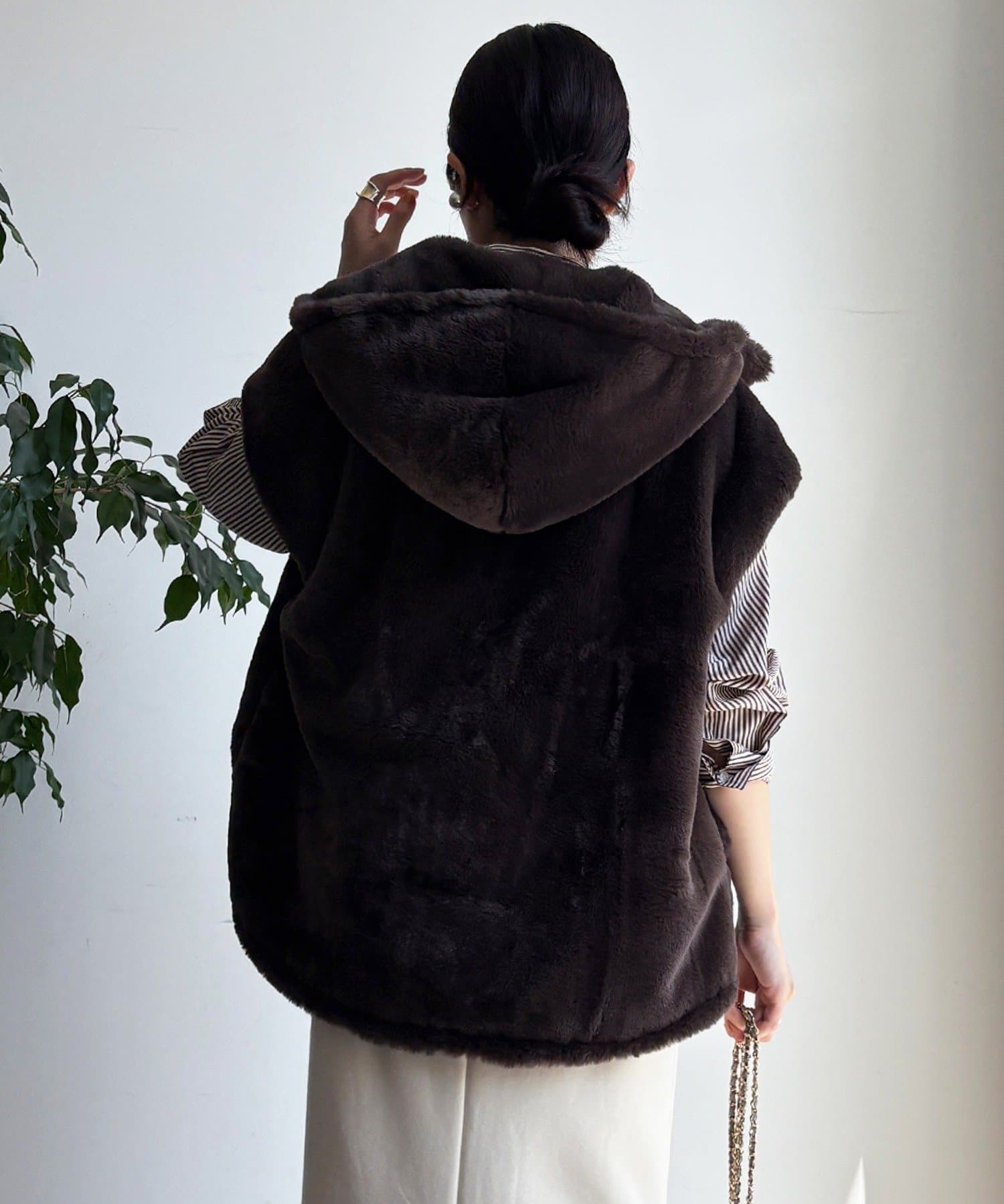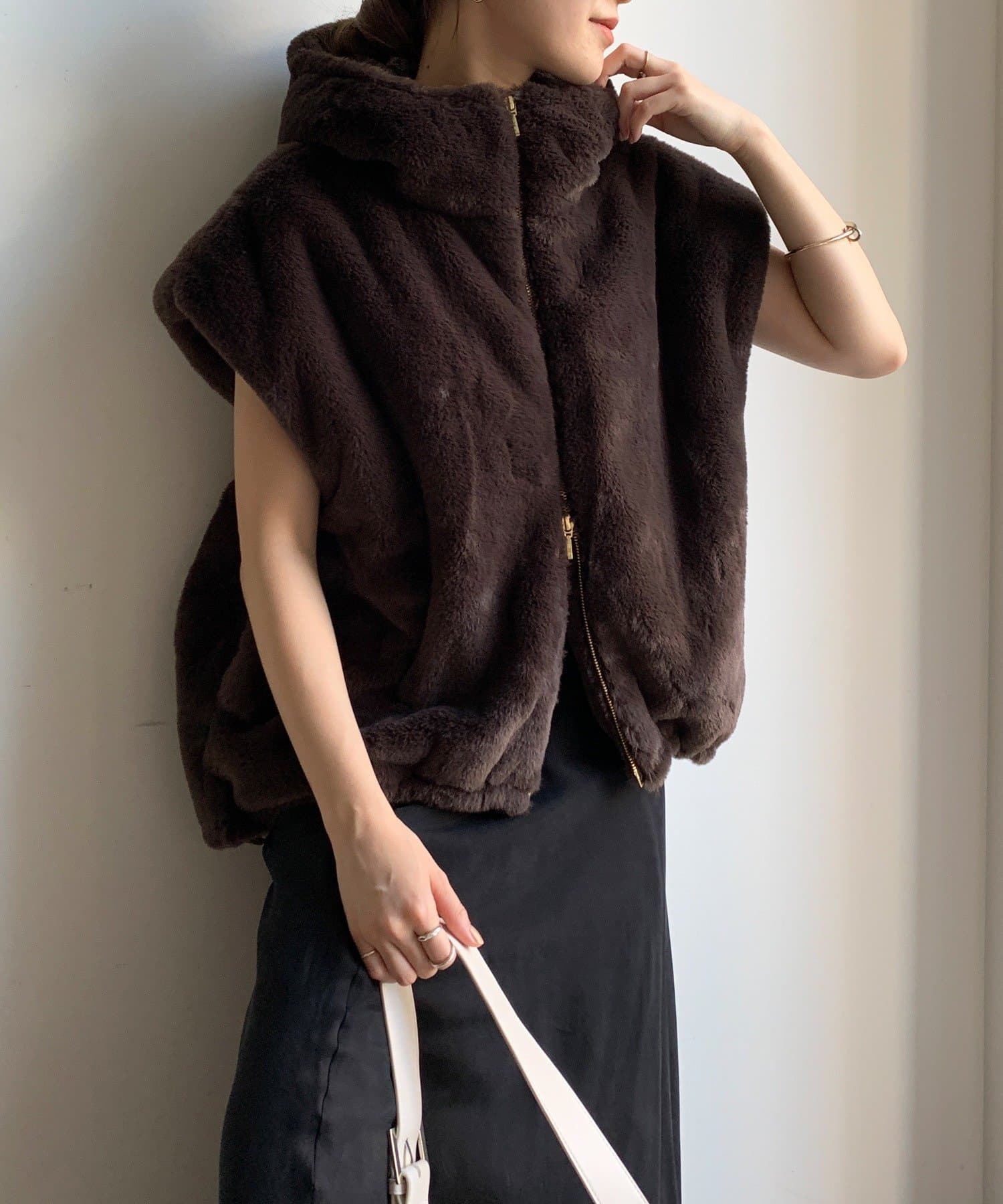 手触りなめらかなフェイクミンクファーを使用した、上品な光沢感が魅力のファーベスト。