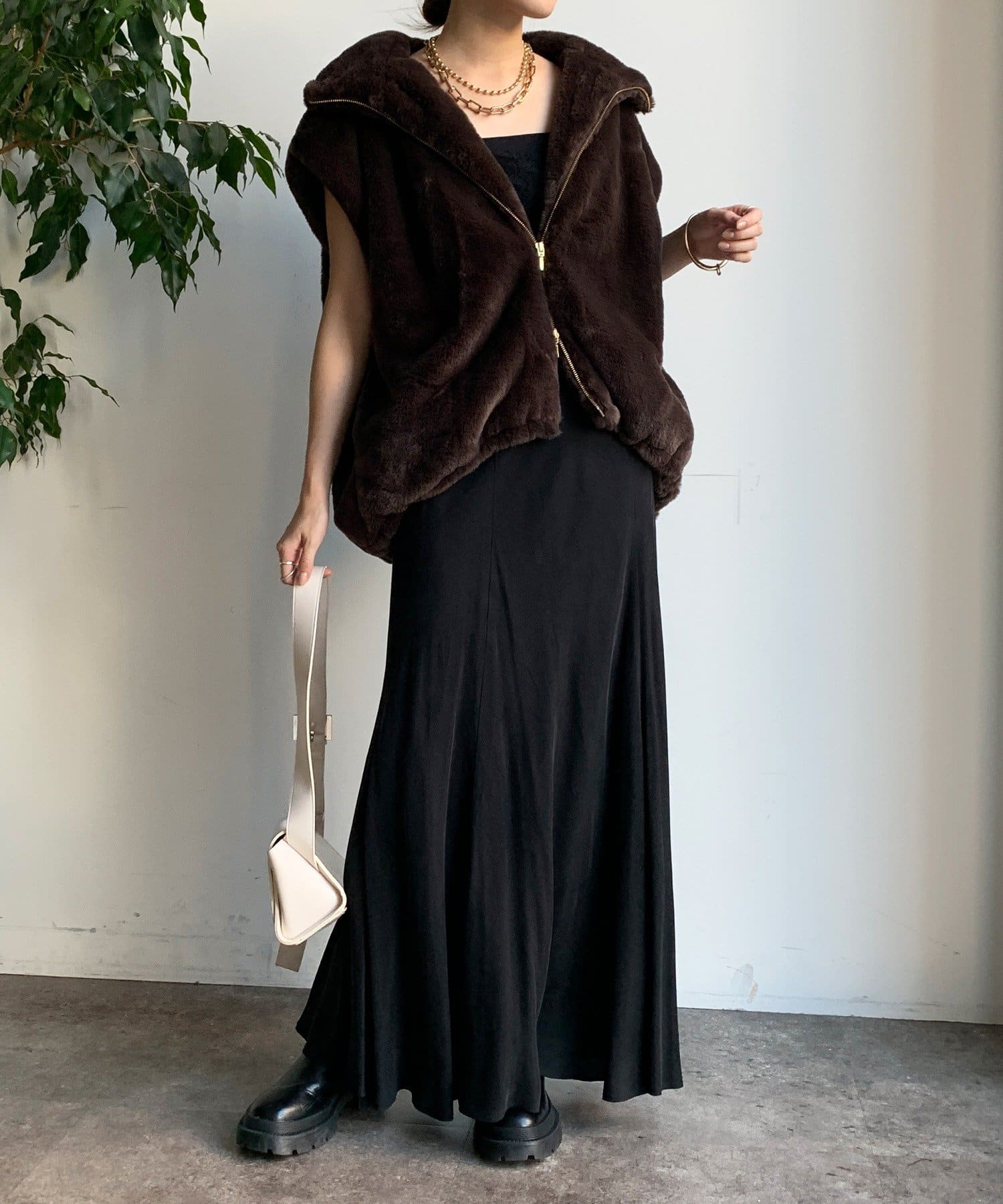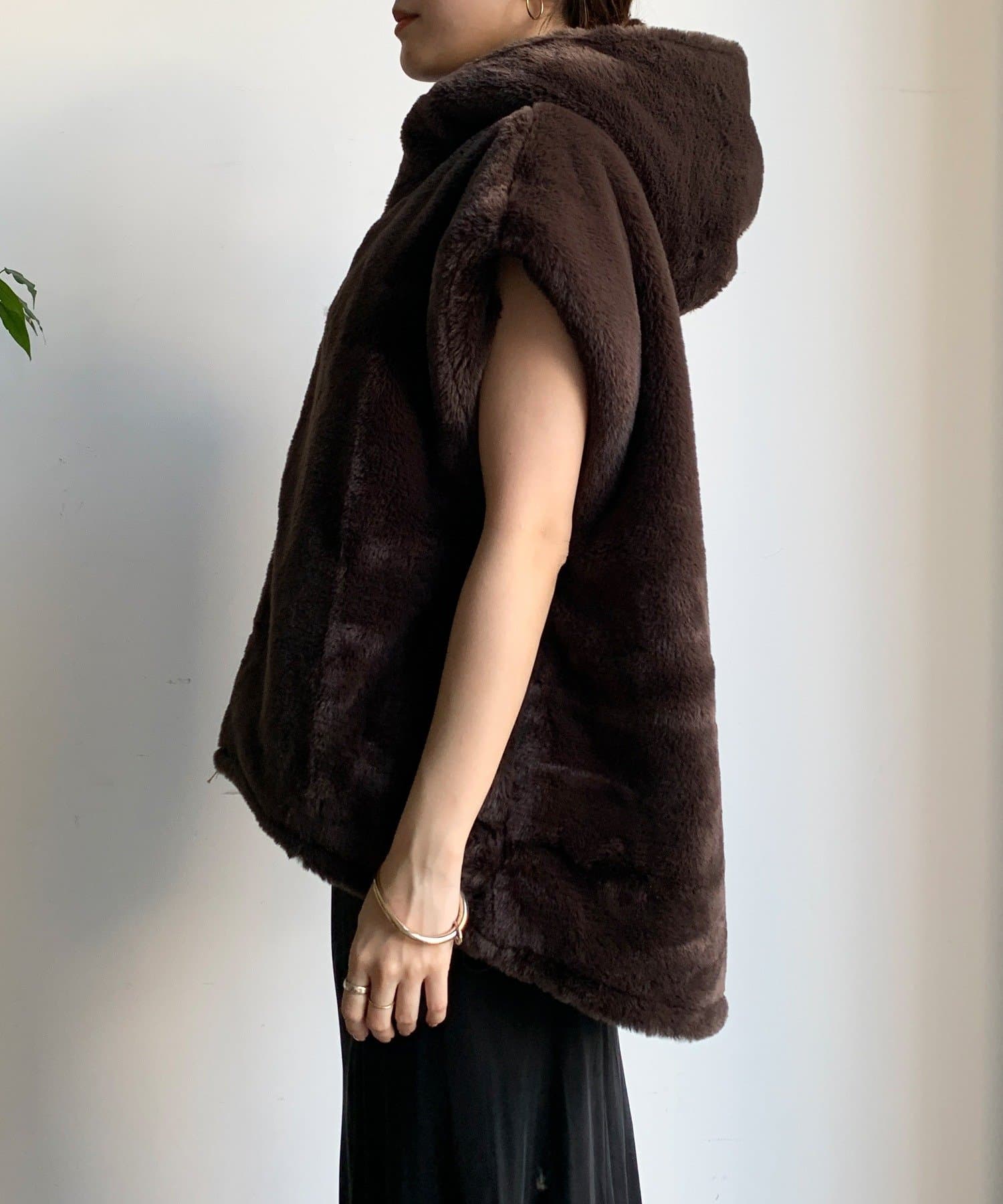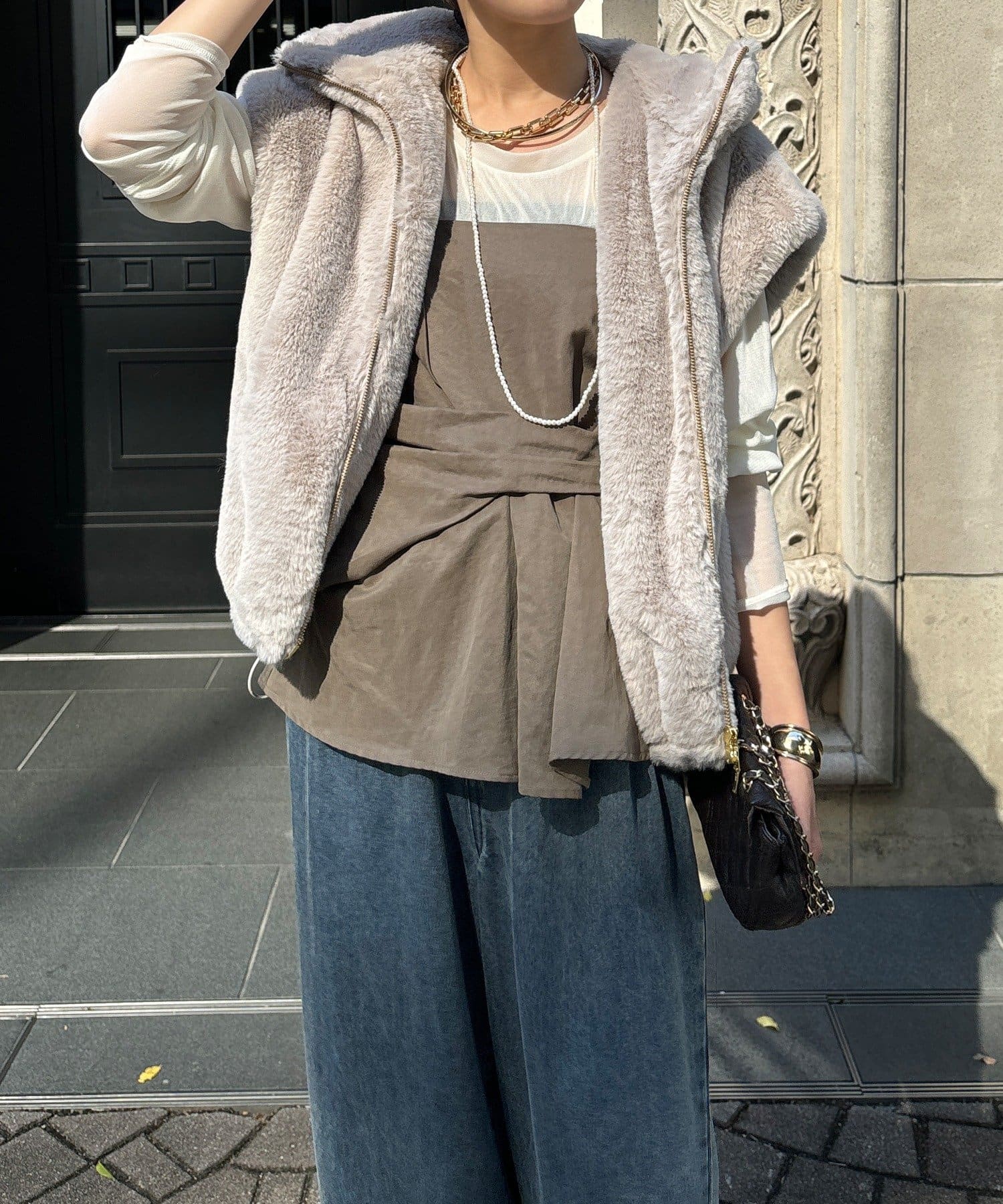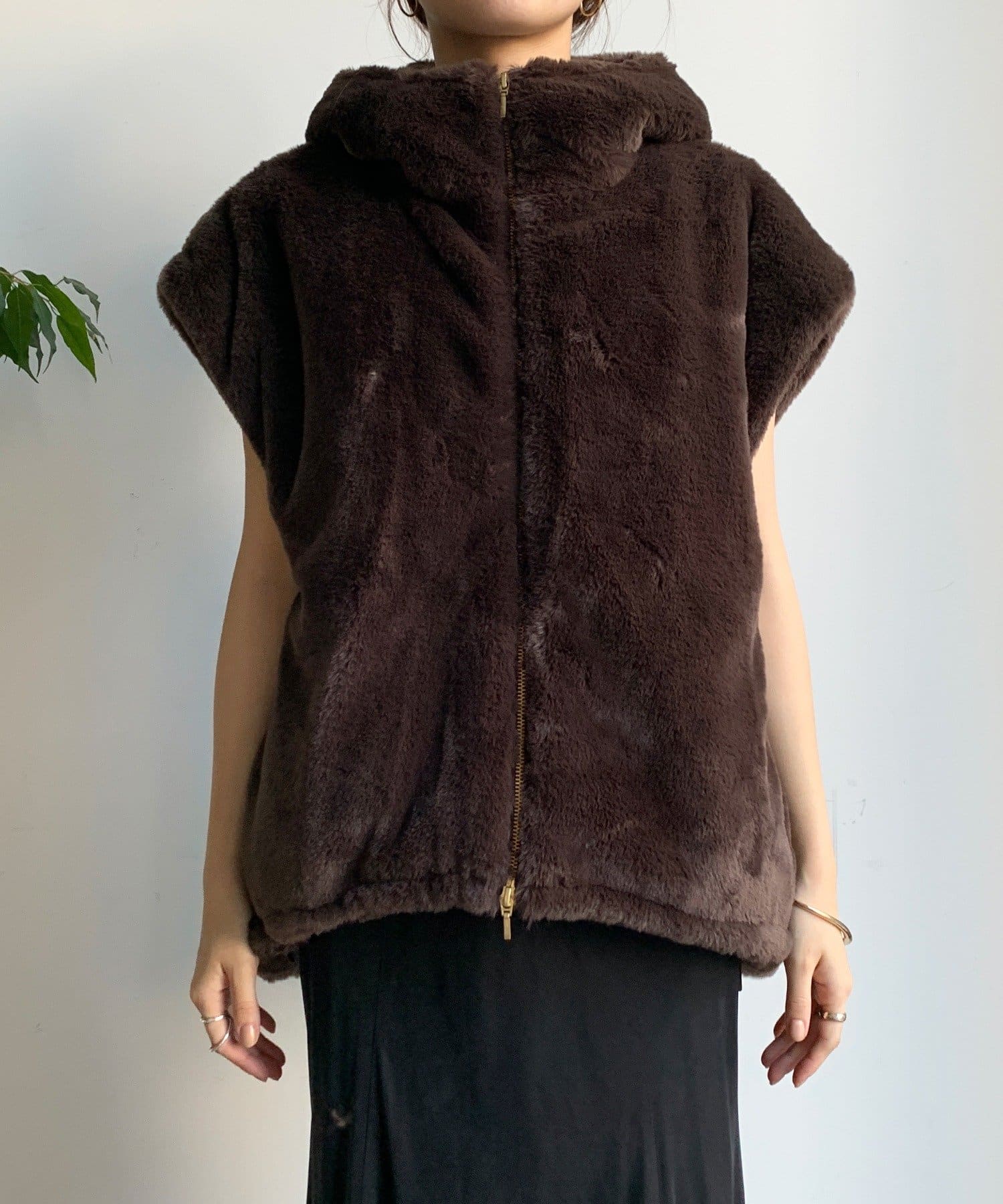 手触りなめらかなフェイクミンクファーを使用した、上品な光沢感が魅力のファーベスト。