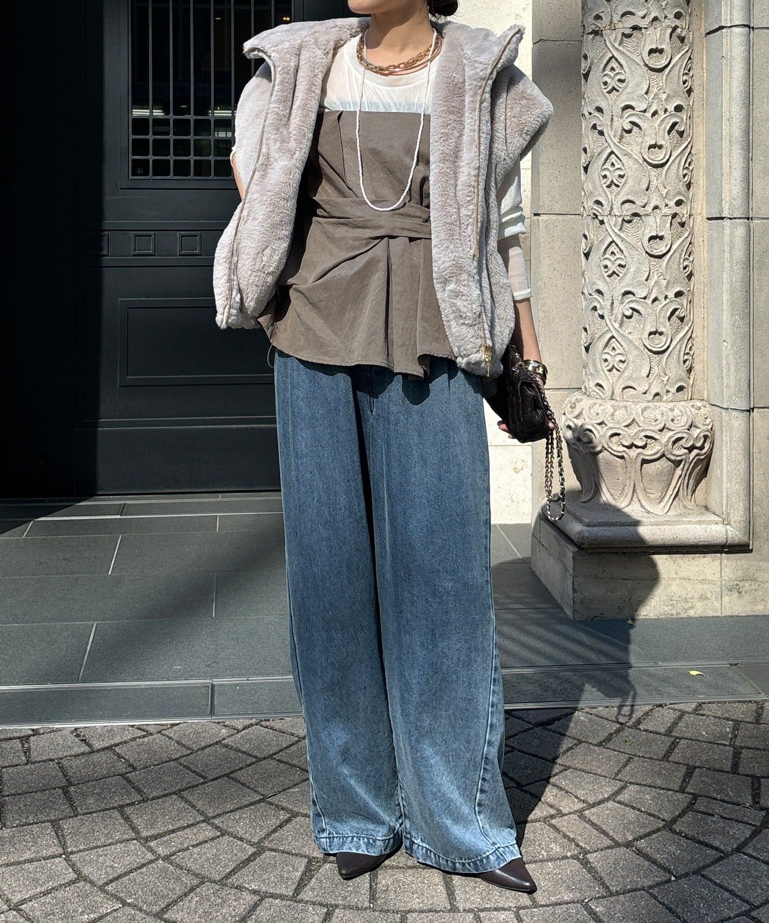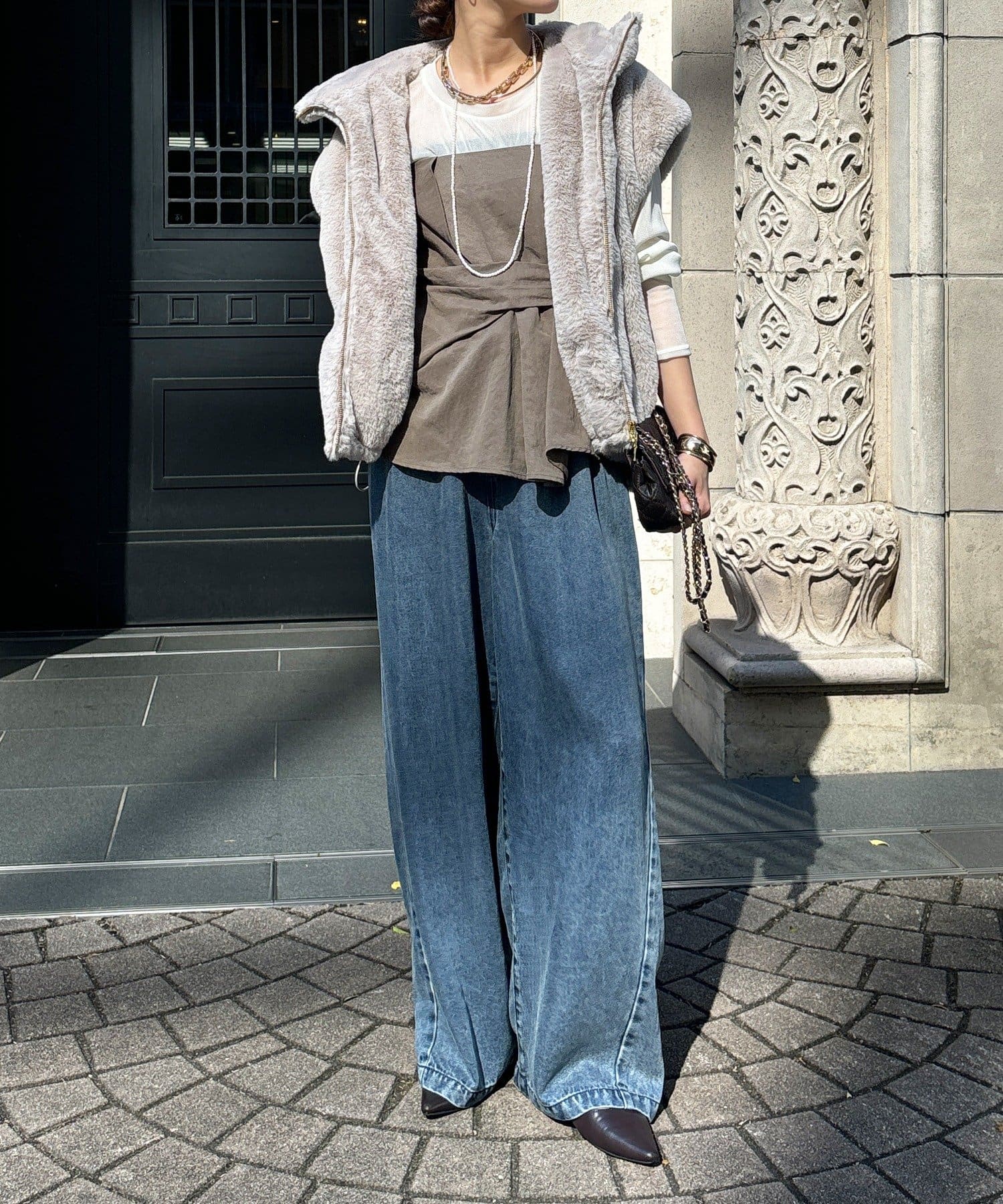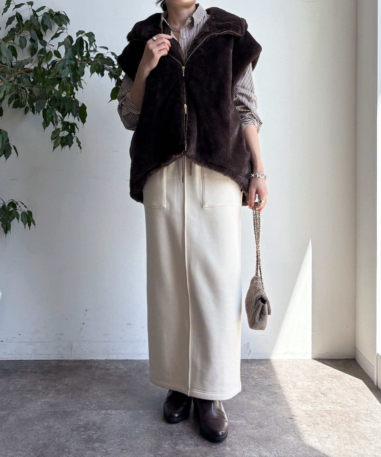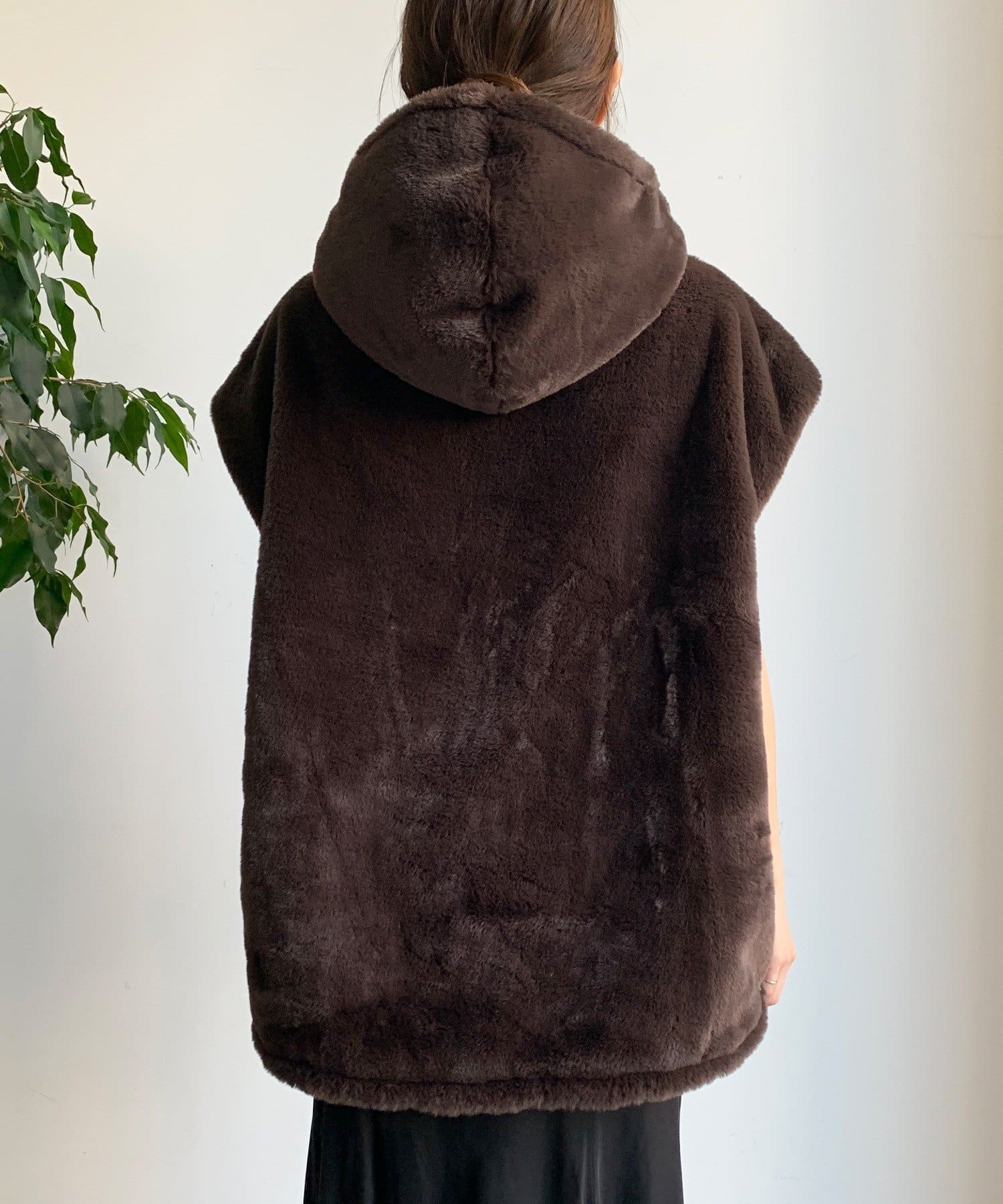 手触りなめらかなフェイクミンクファーを使用した、上品な光沢感が魅力のファーベスト。