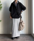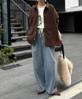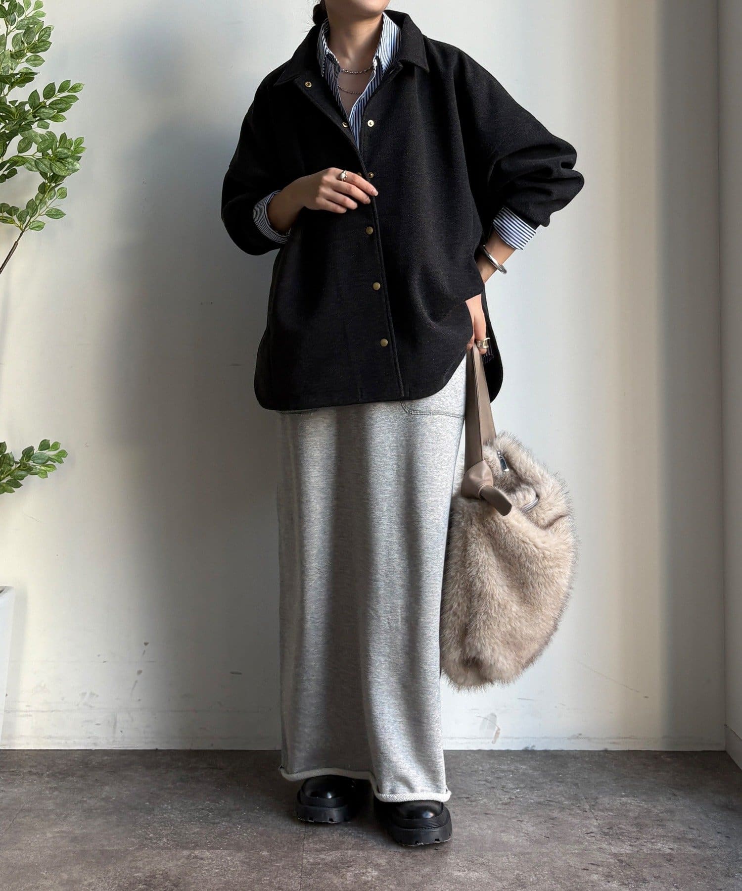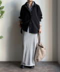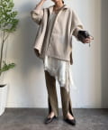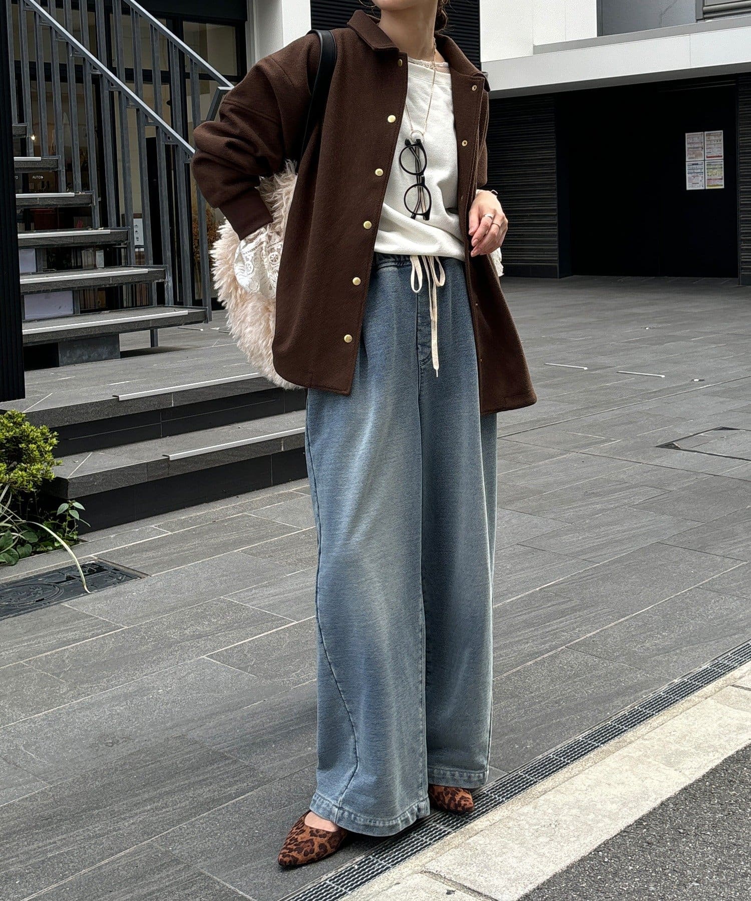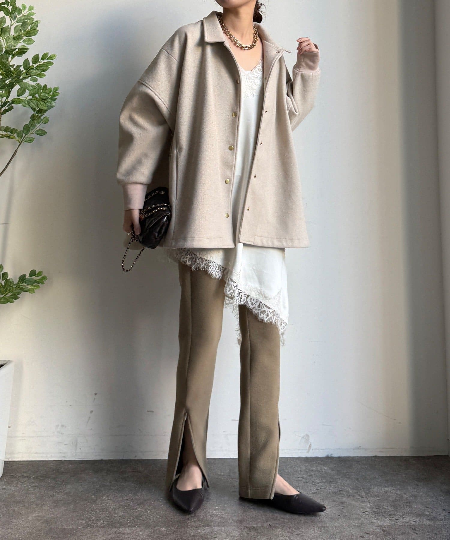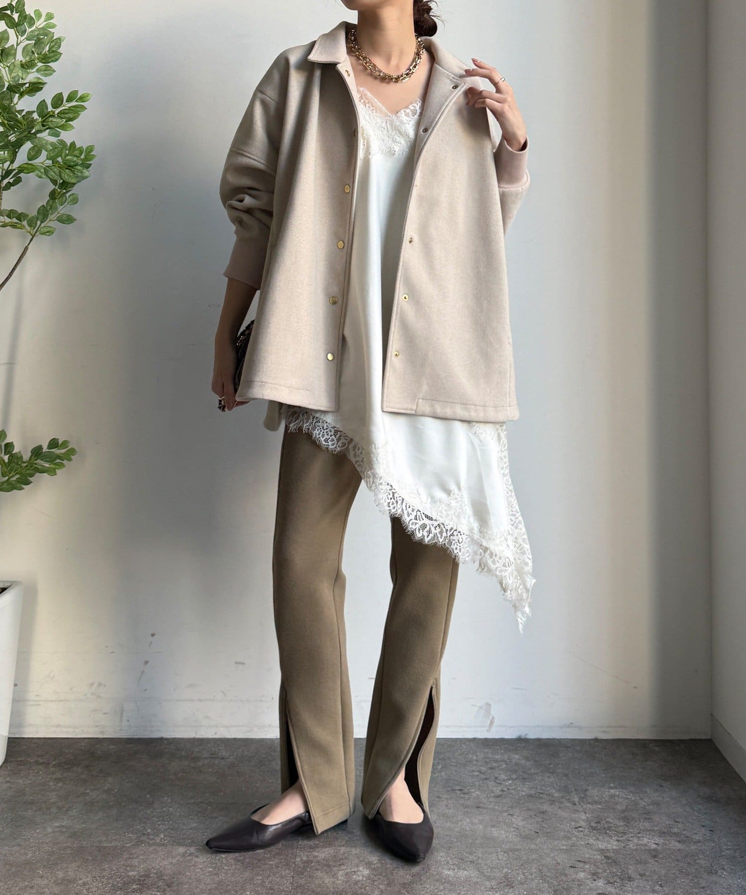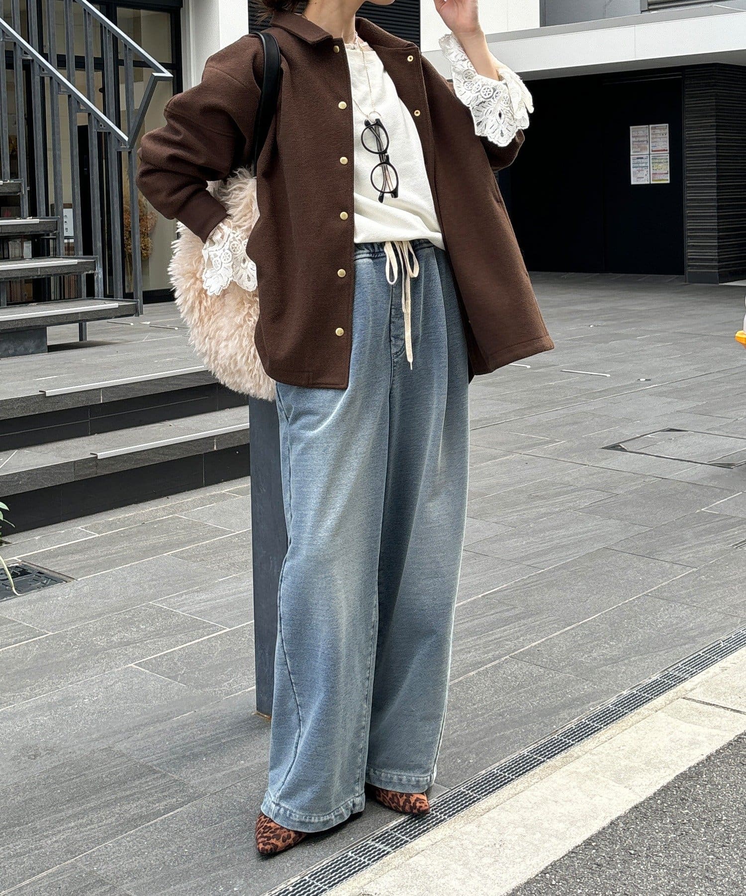 ゴールドのスナップボタンが大人の抜け感を演出し、カットソーやレースインナーを重ねれば、カジュアルながらもフェミニンな印象に◎