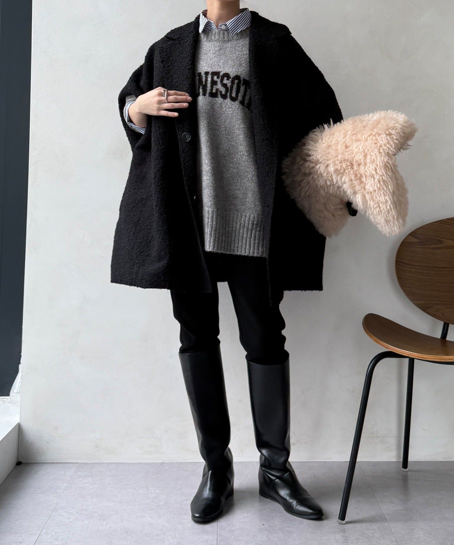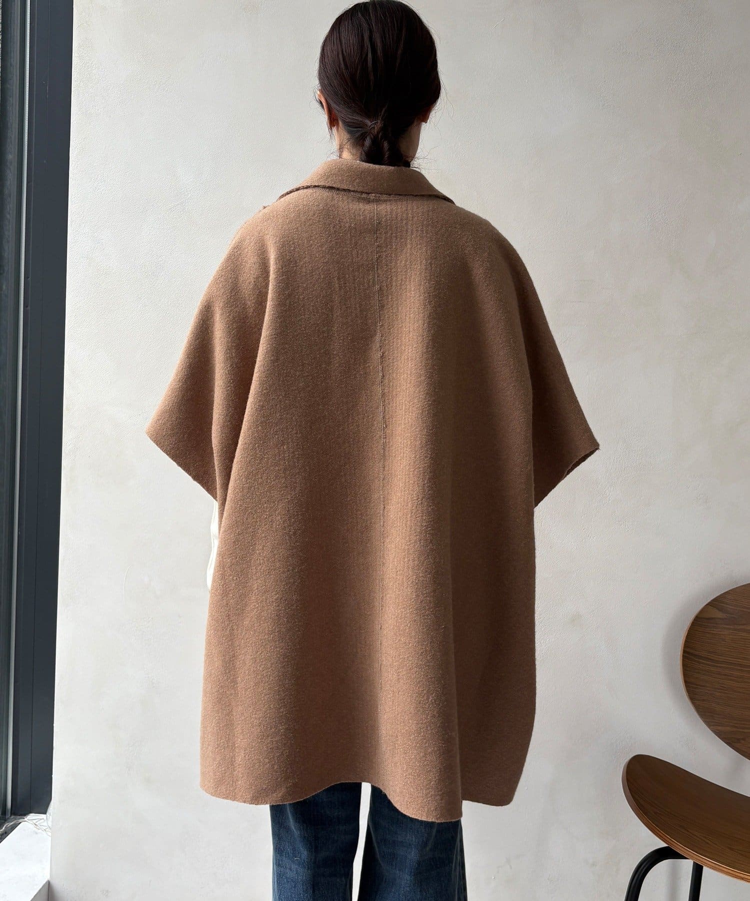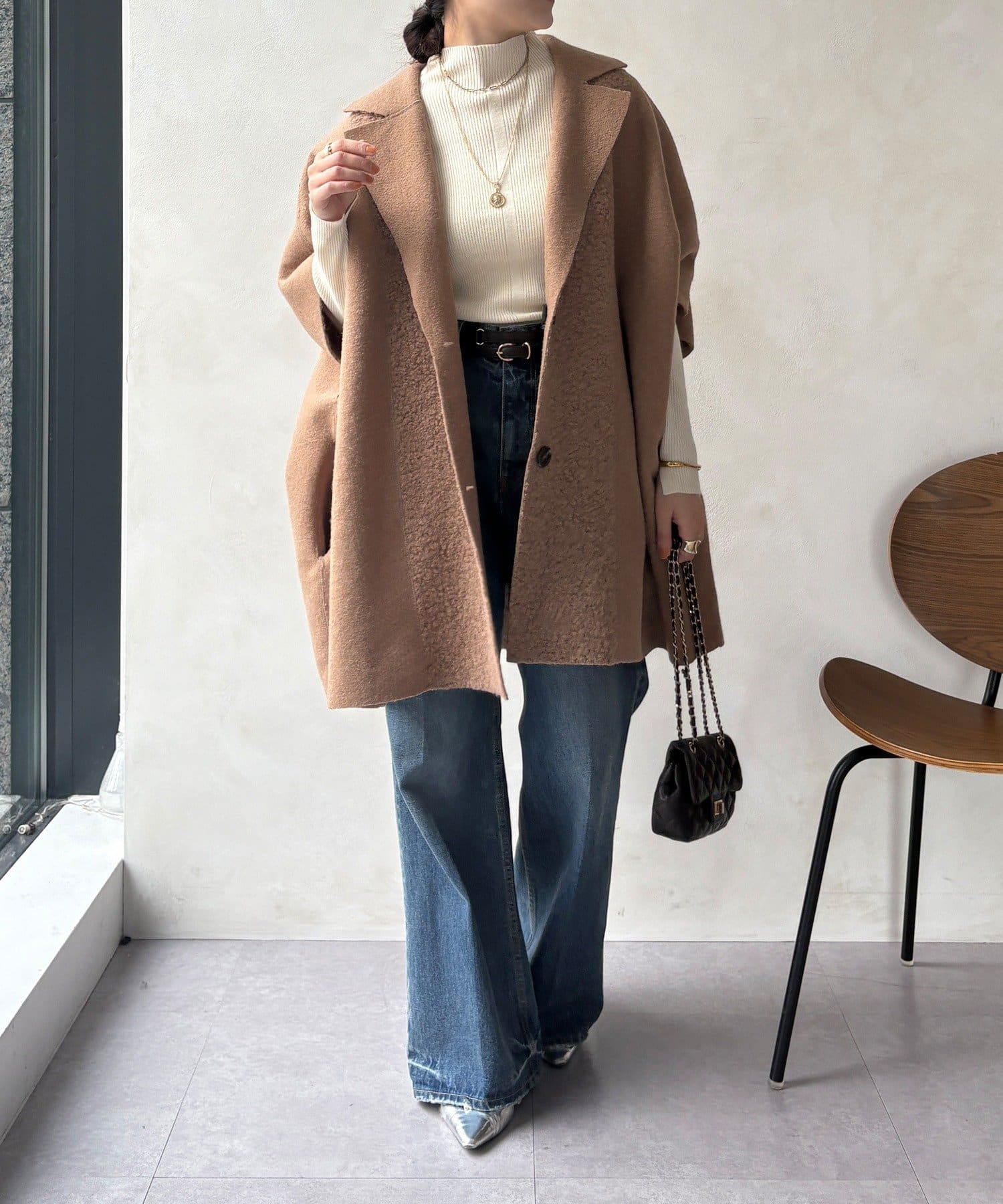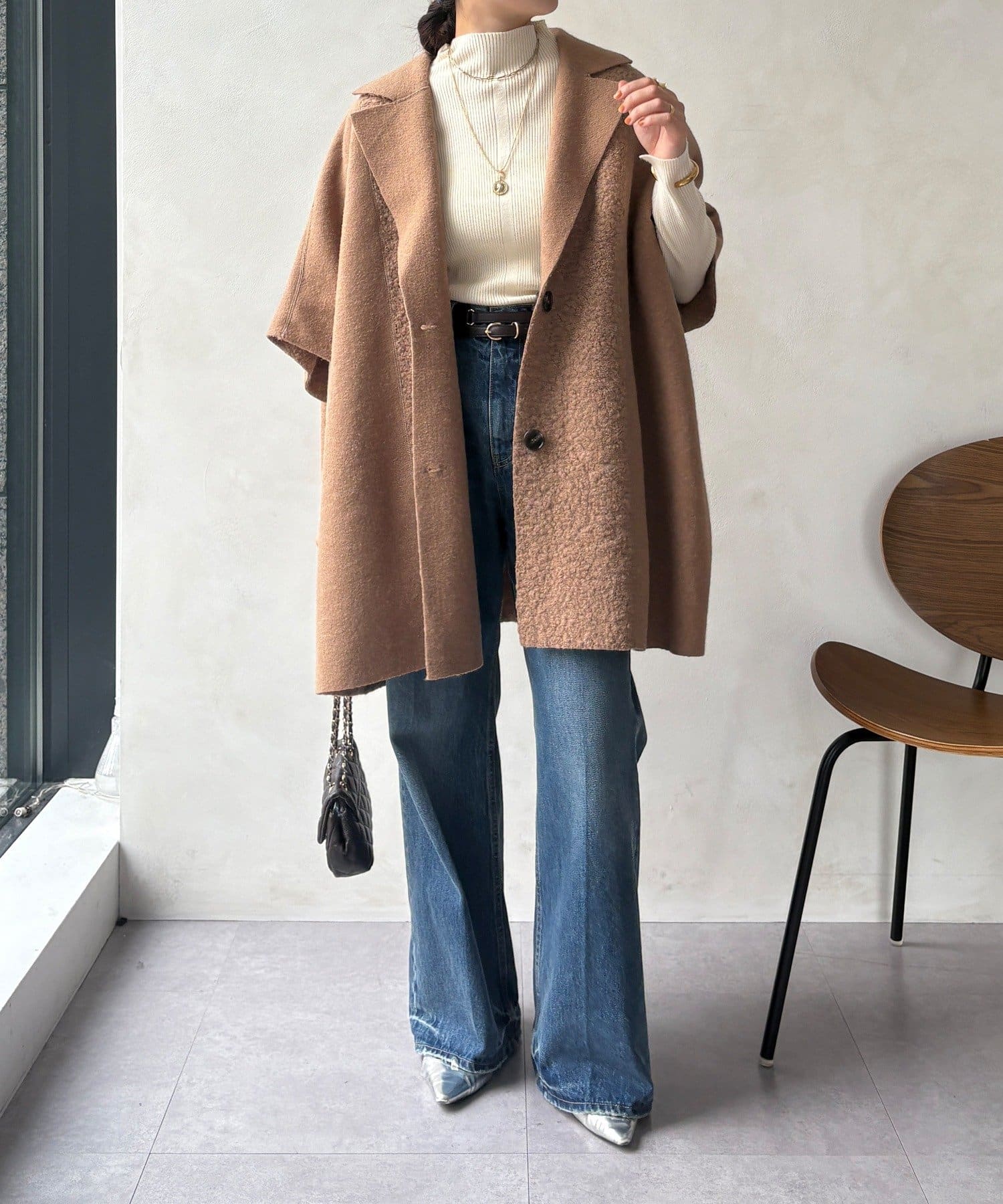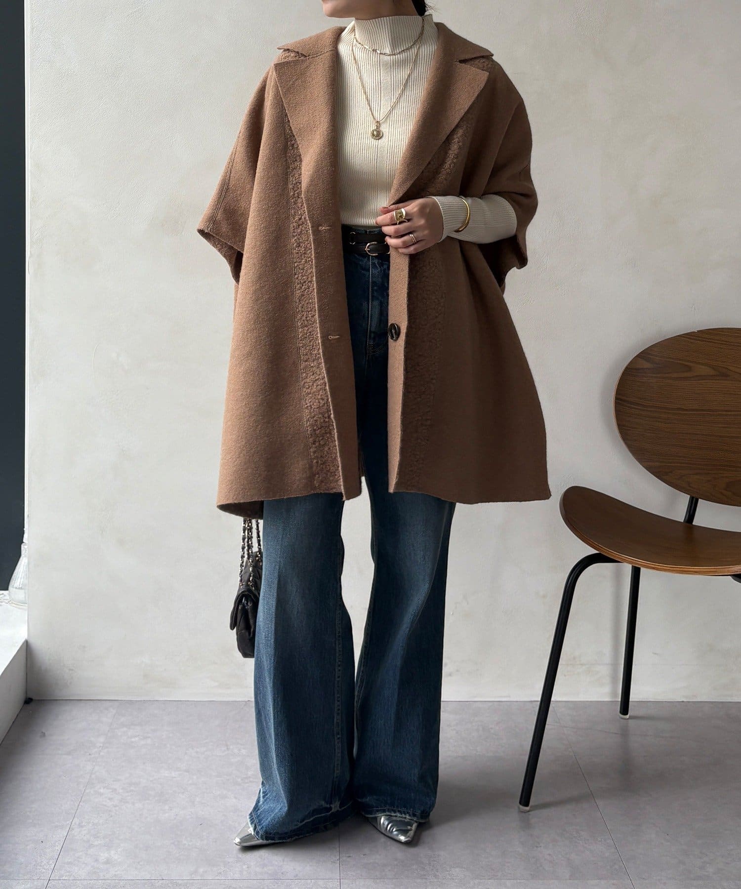 ゆったりとしたポンチョシルエットが体型を選ばず、スタイリングの主役になる一着です。