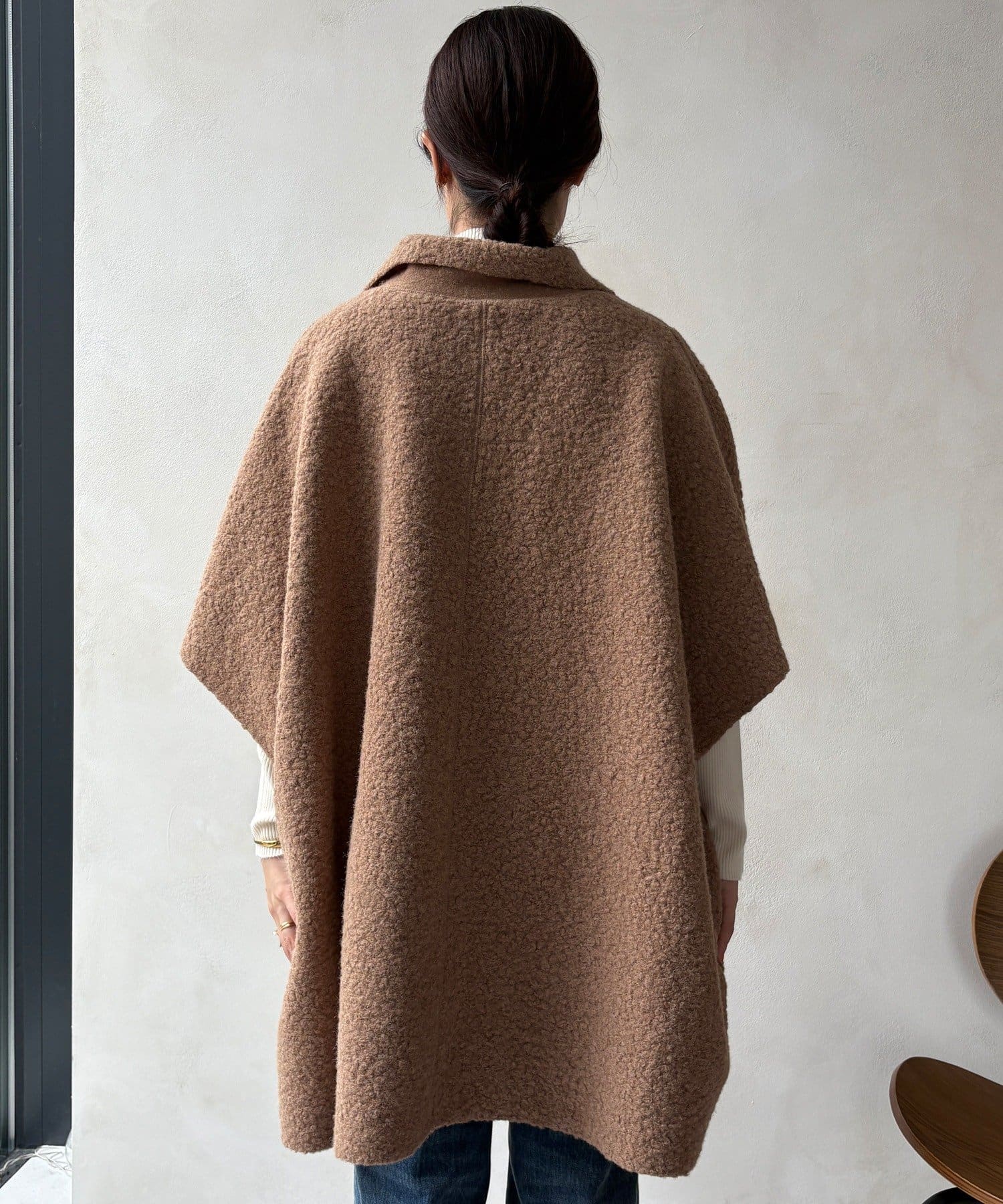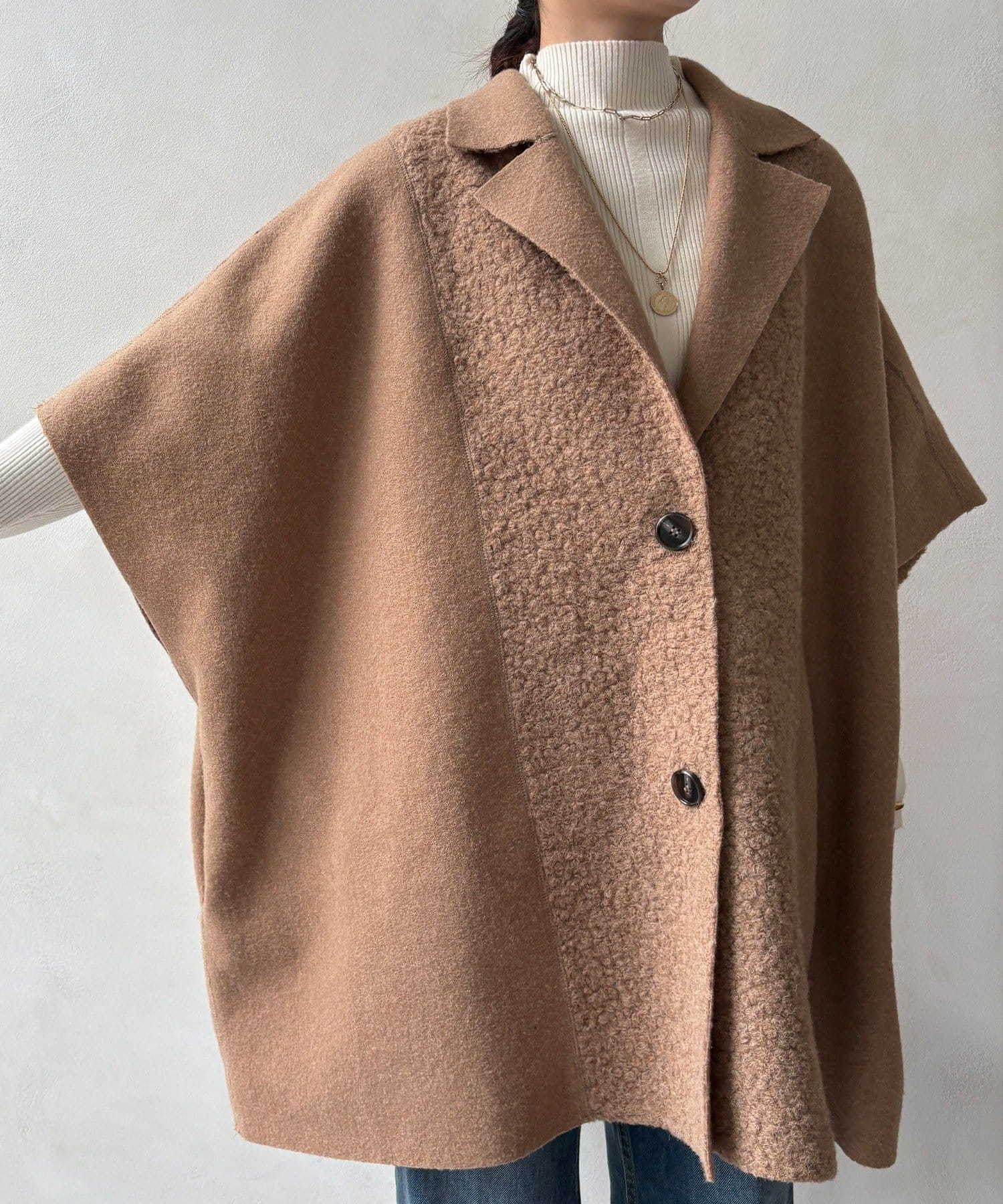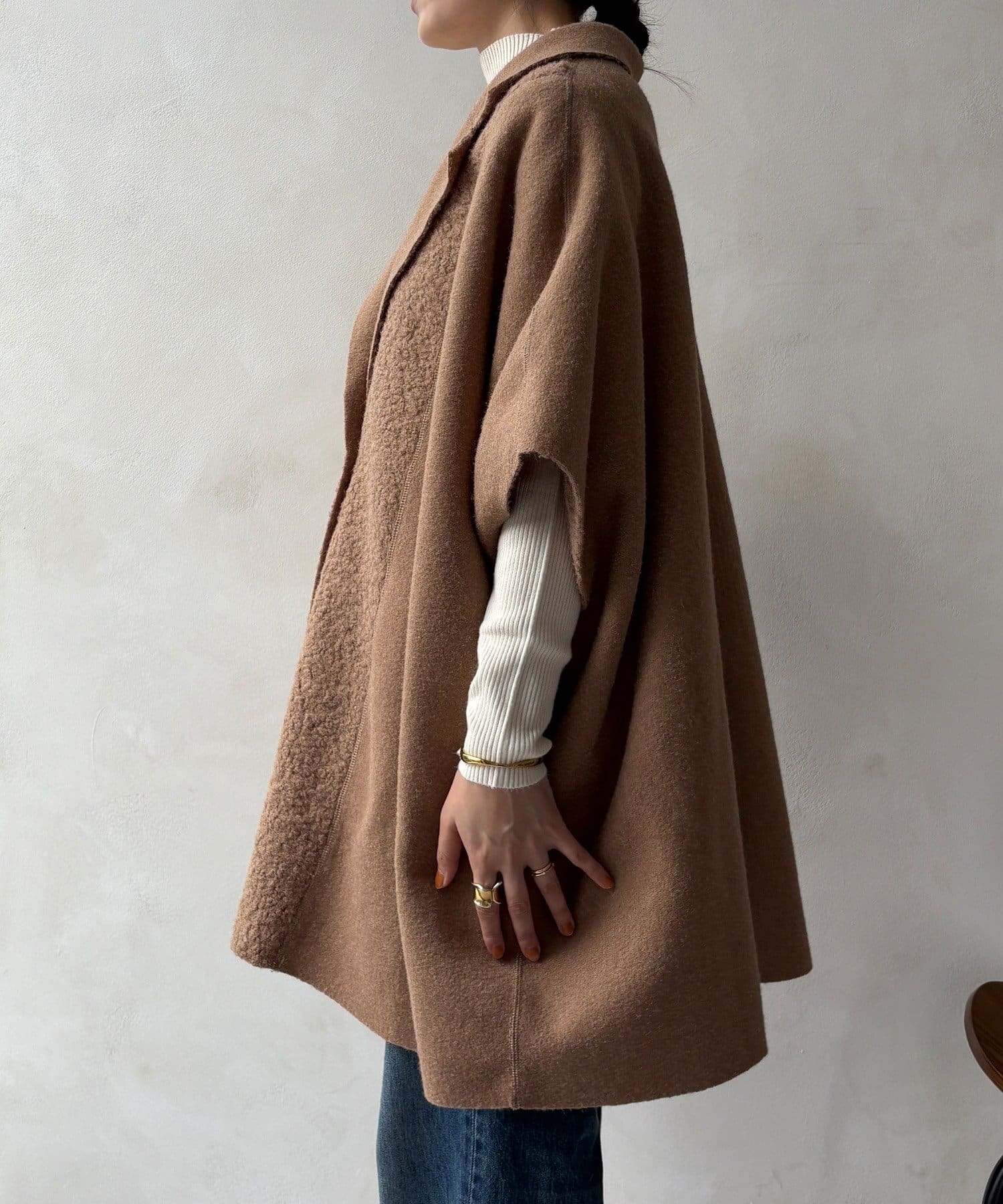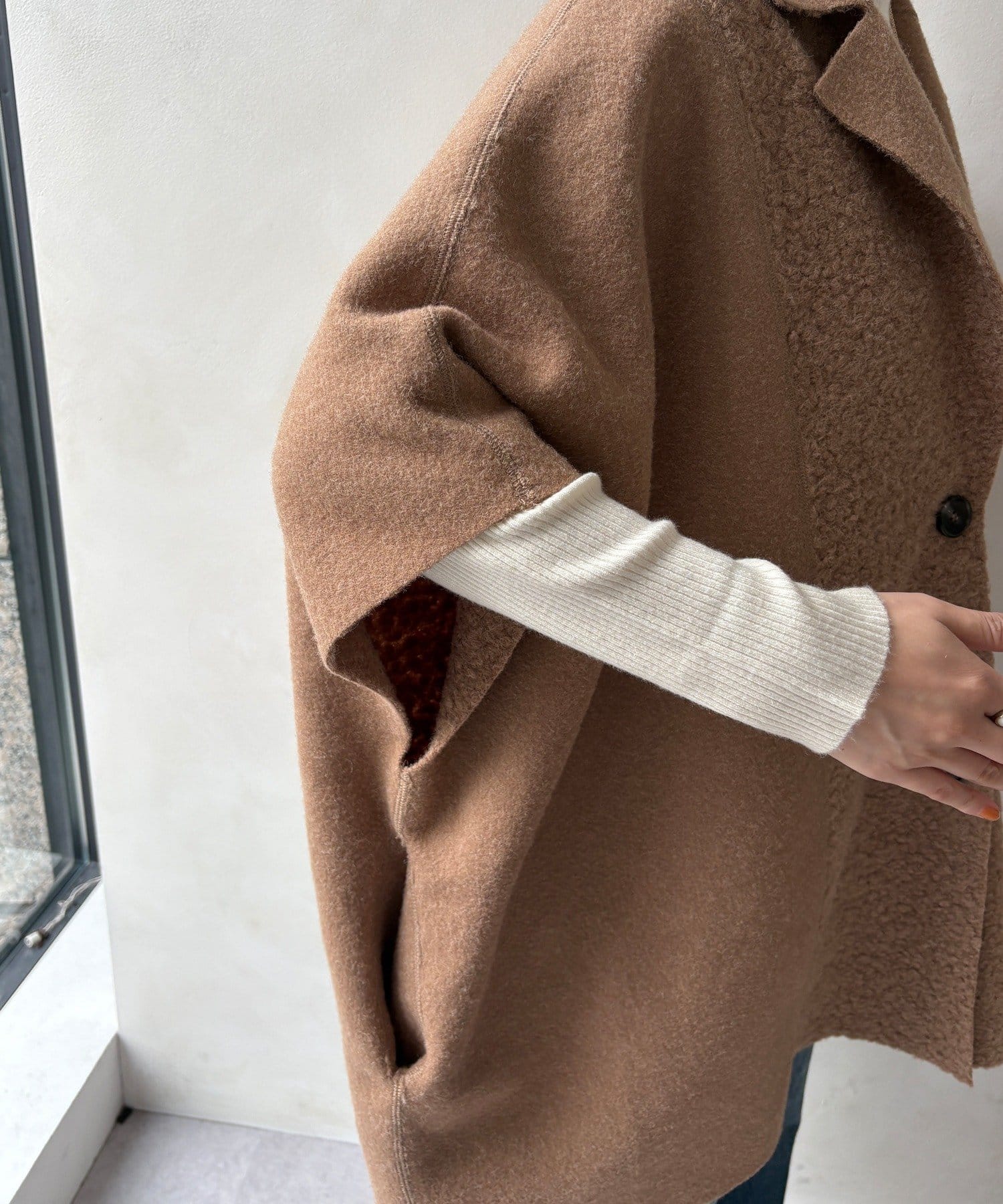 上質なスライバー素材とボアを組み合わせた、リバーシブル仕様のポンチョコートが登場。