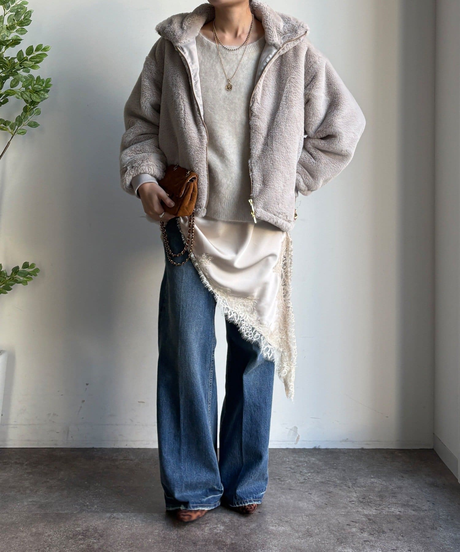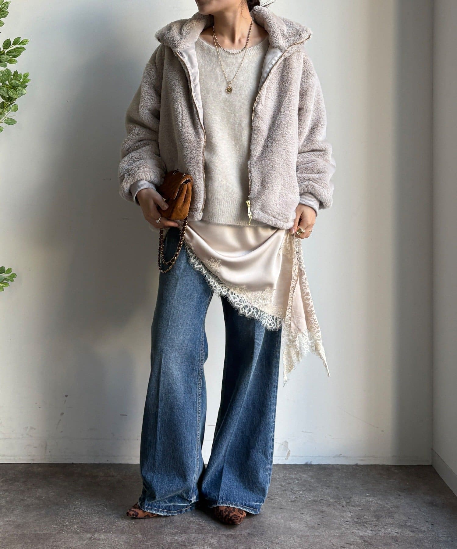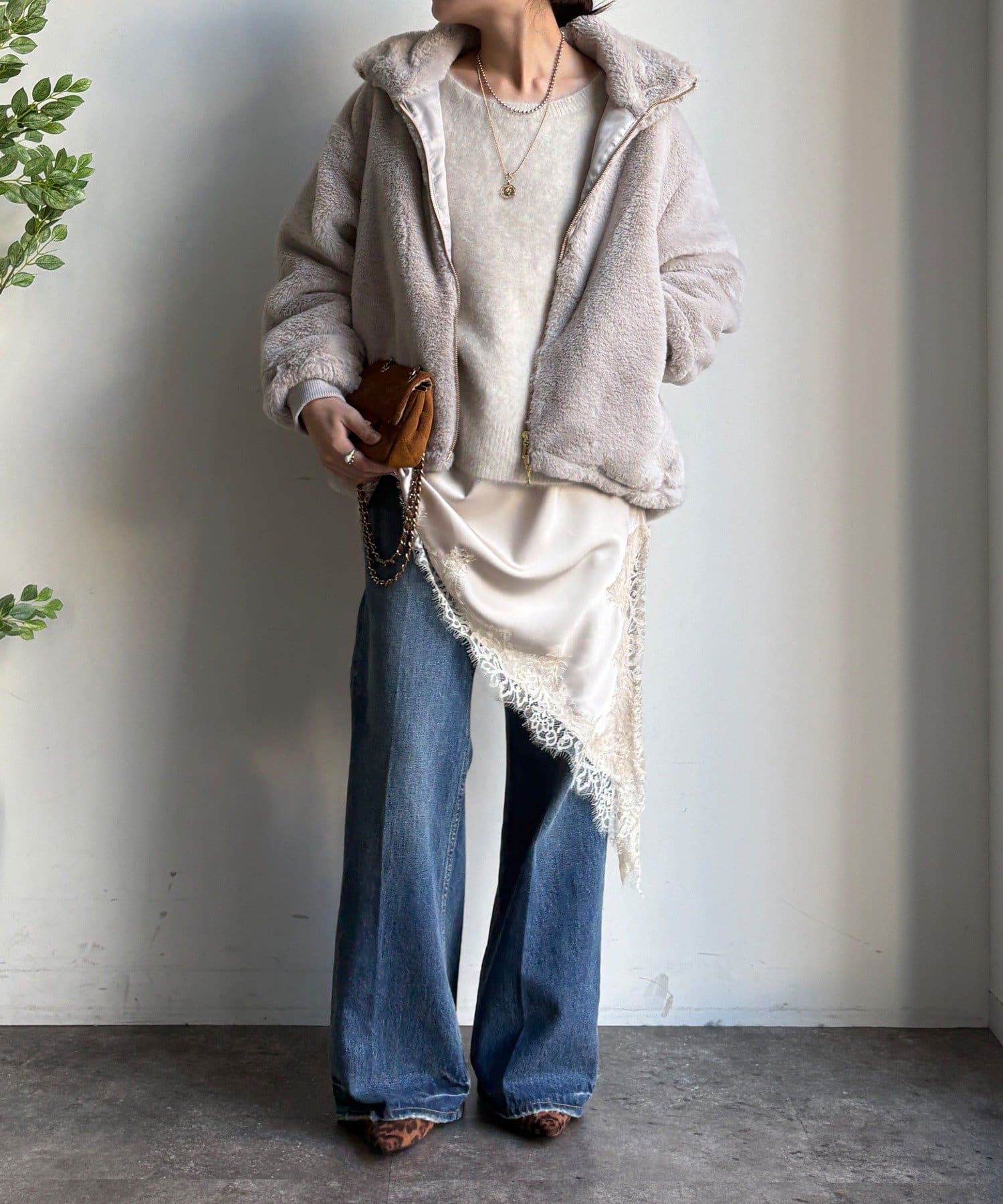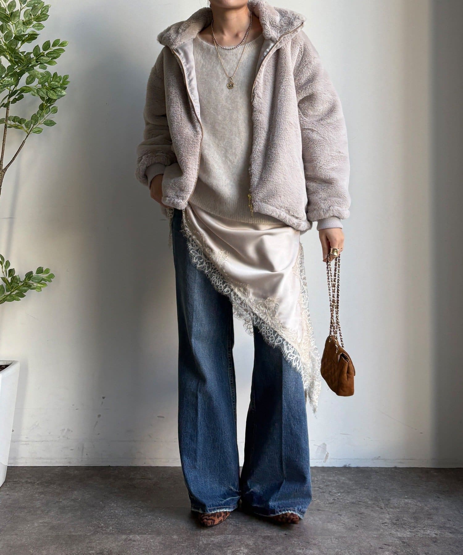 デニム合わせでカジュアルに、スカートやワンピでフェミニンにも楽しめる万能アイテムです。