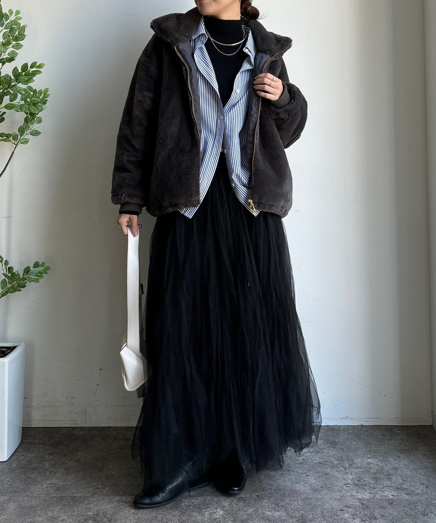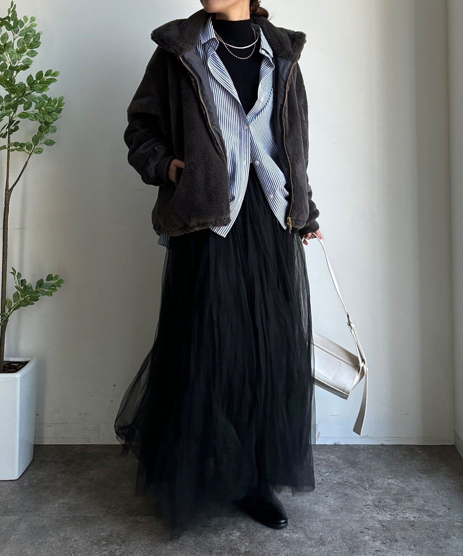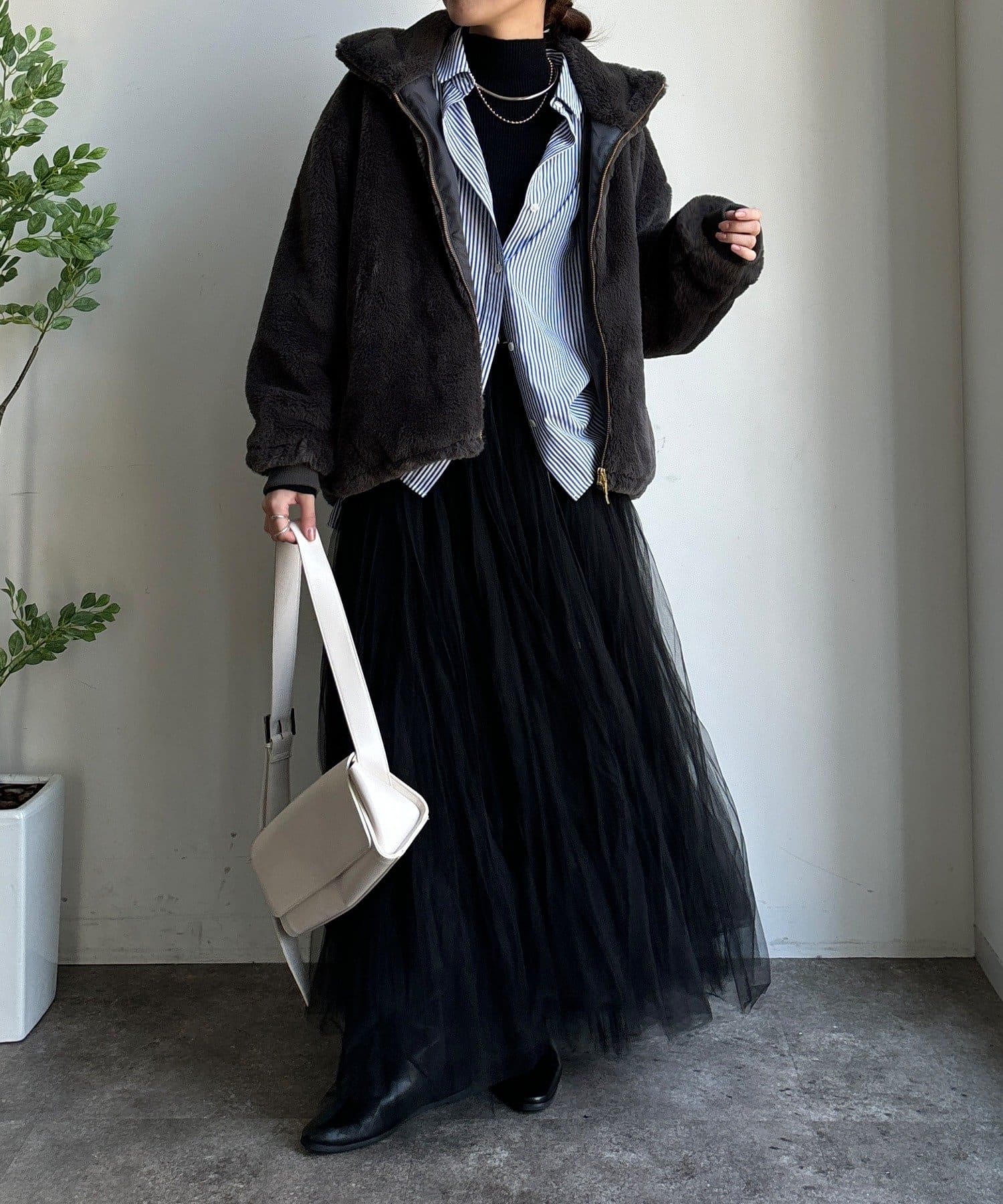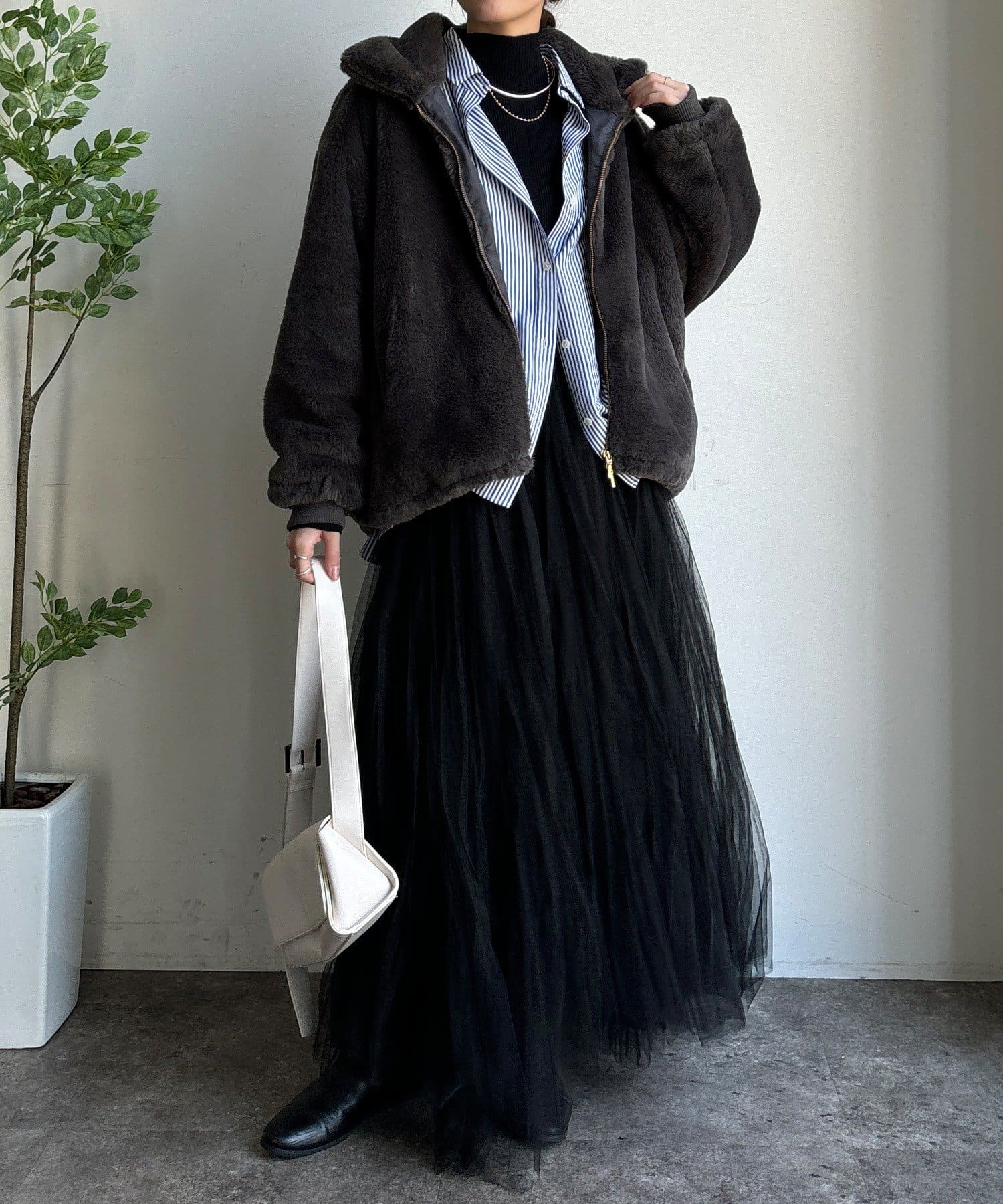 デニム合わせでカジュアルに、スカートやワンピでフェミニンにも楽しめる万能アイテムです。
