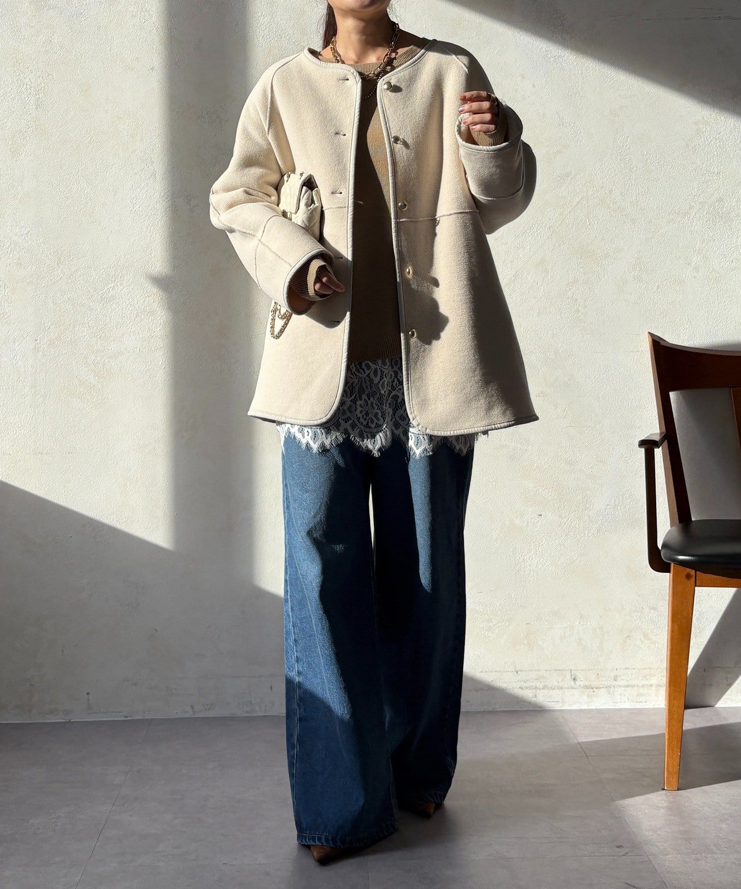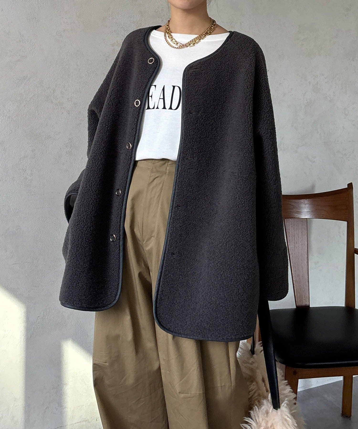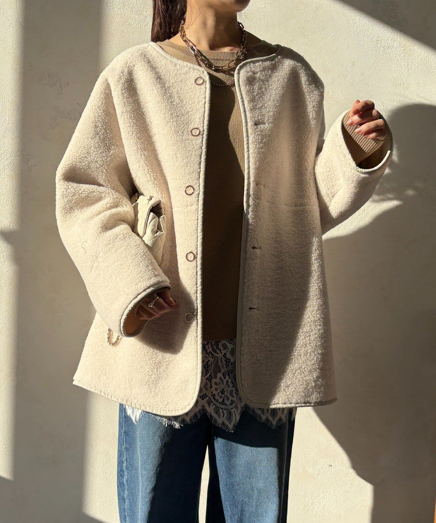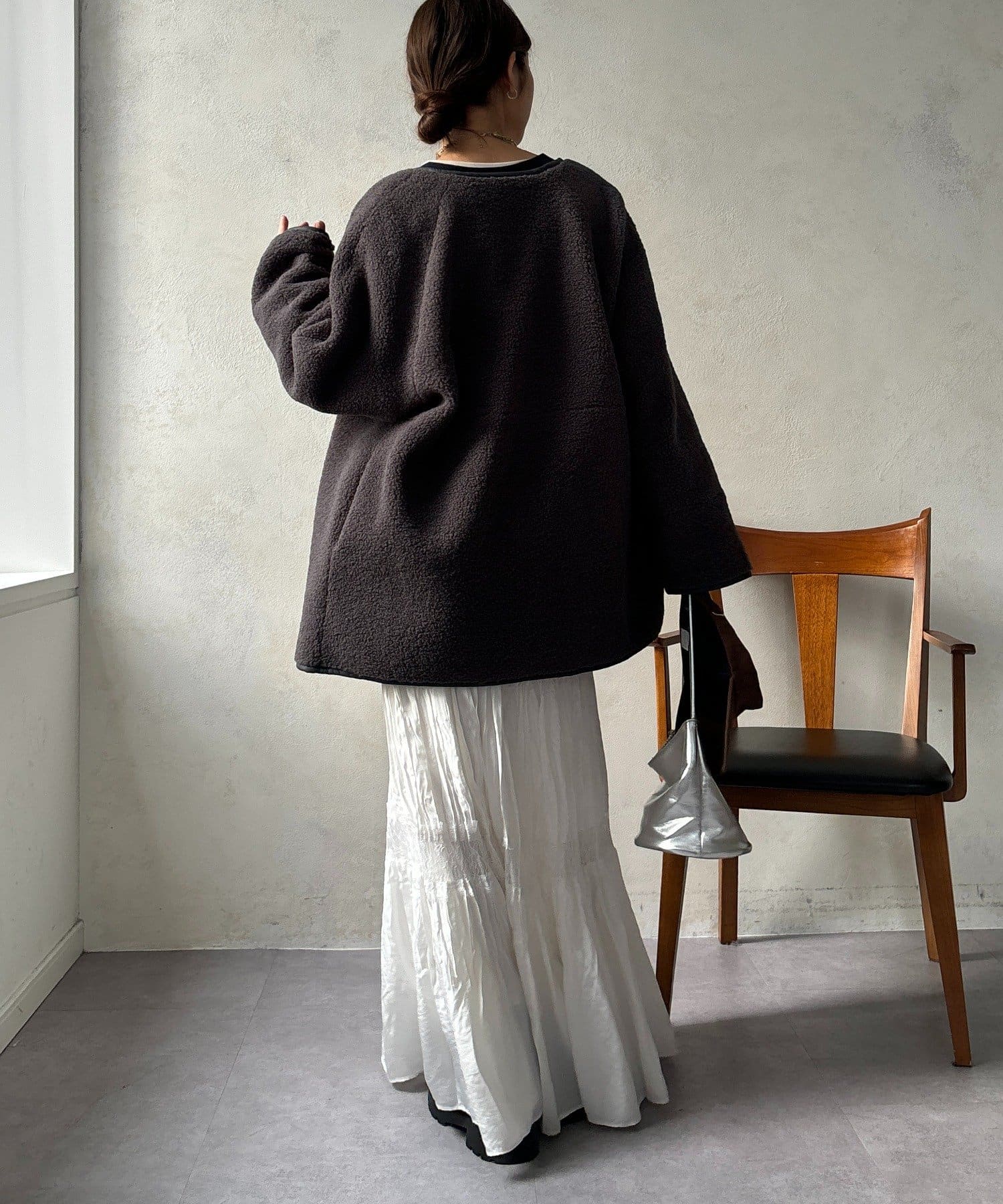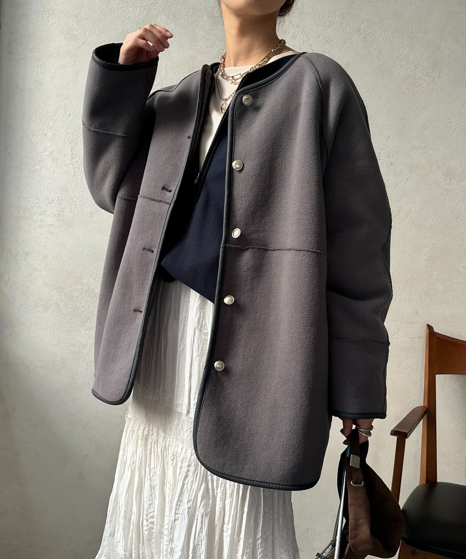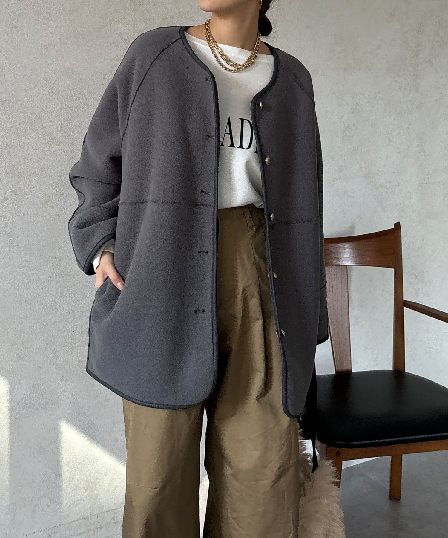 ノーカラーのすっきりとしたデザインのため、気軽に羽織っていただけます。