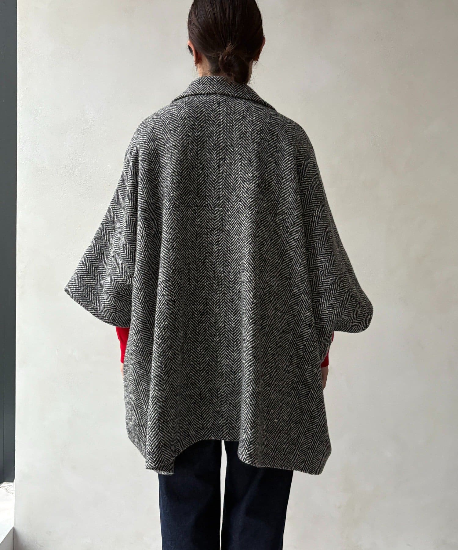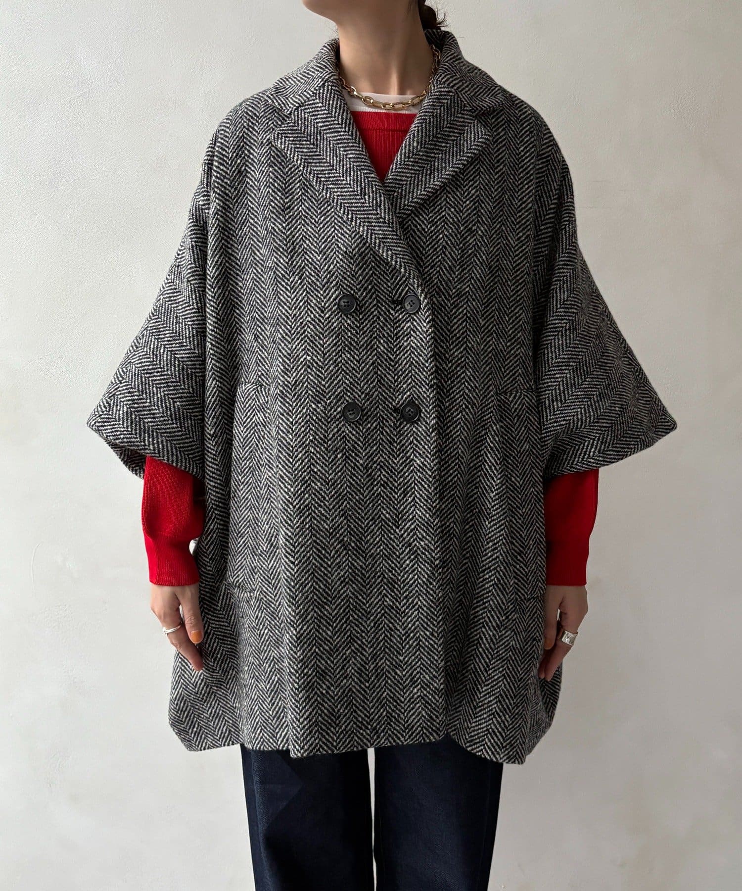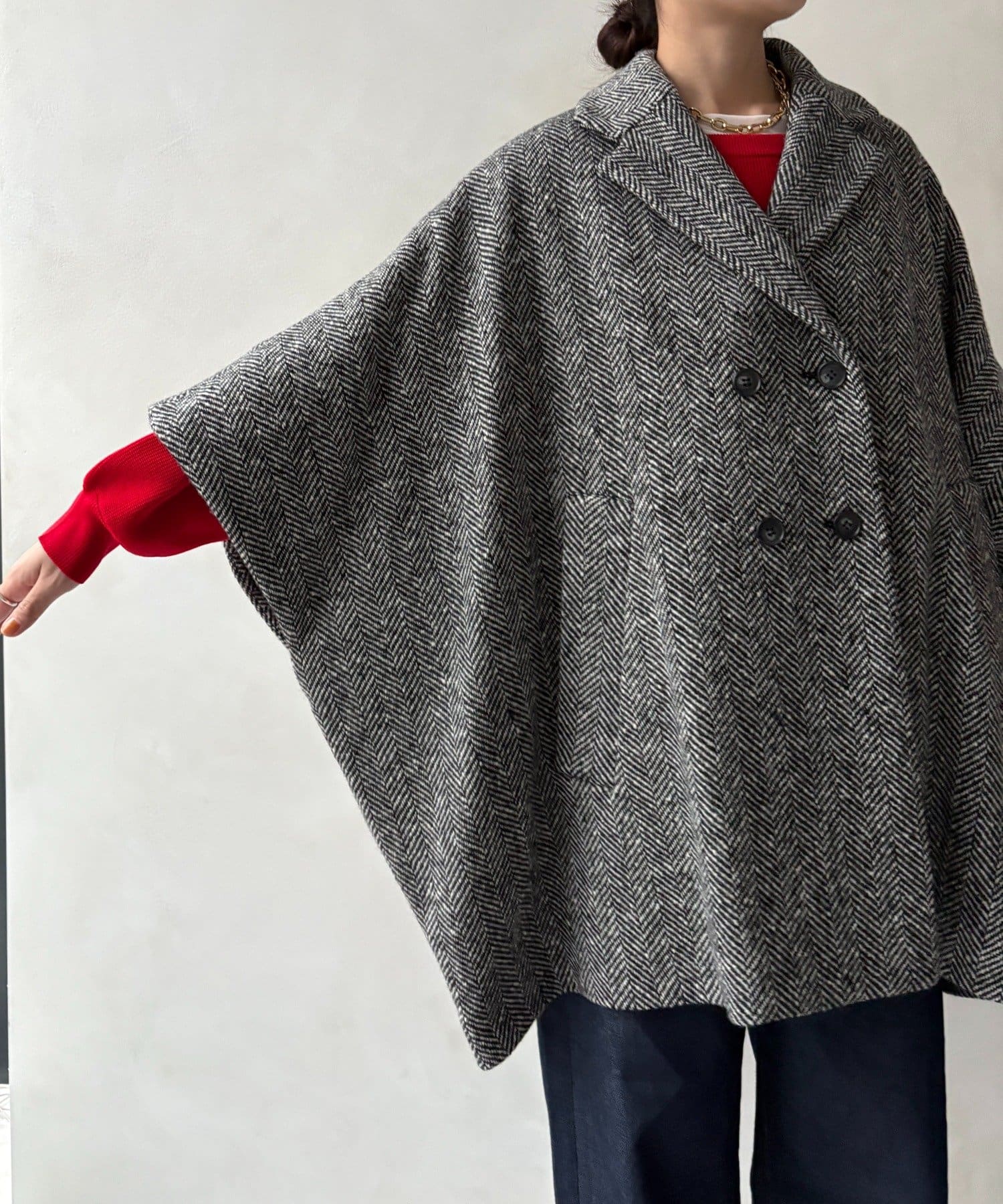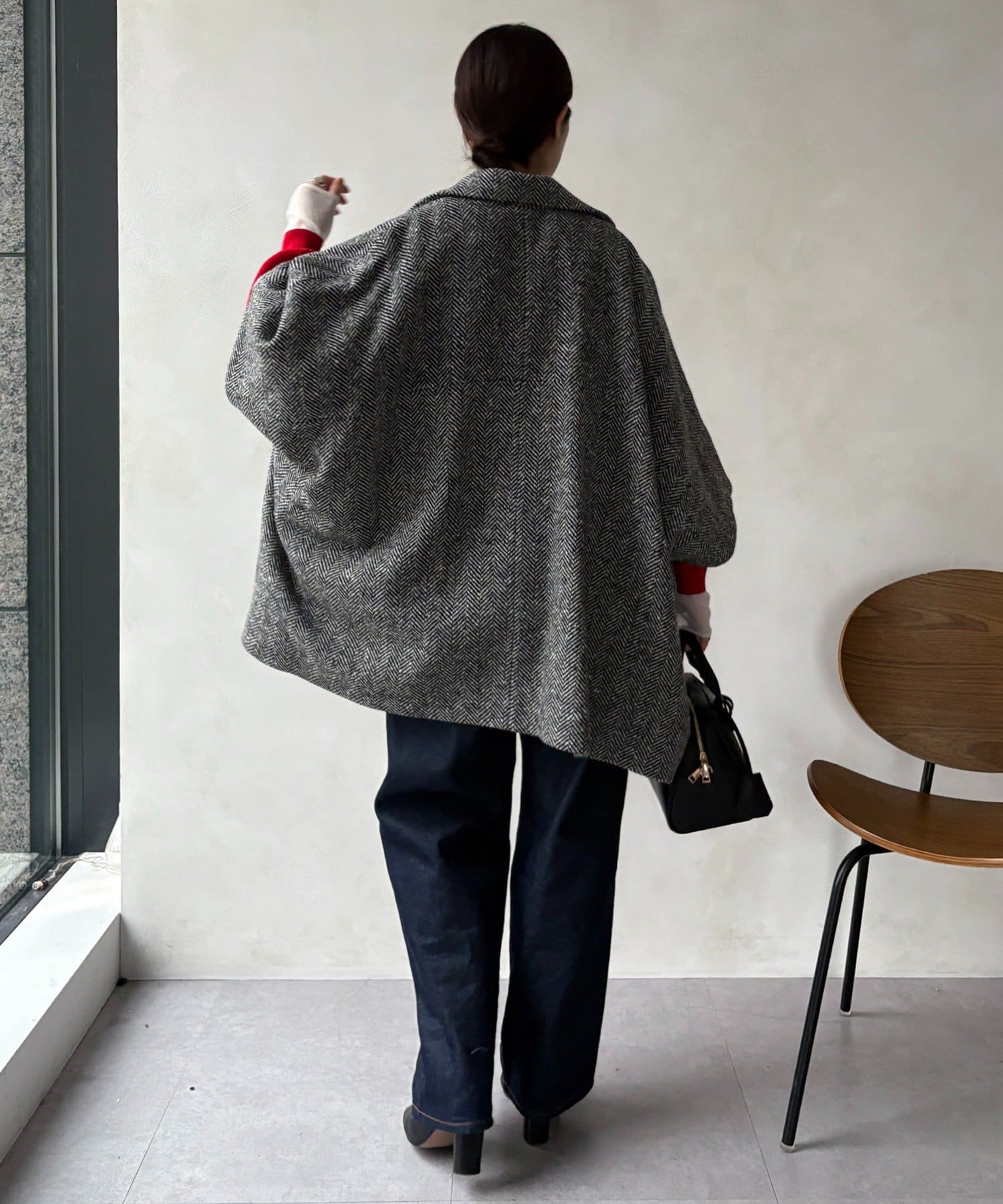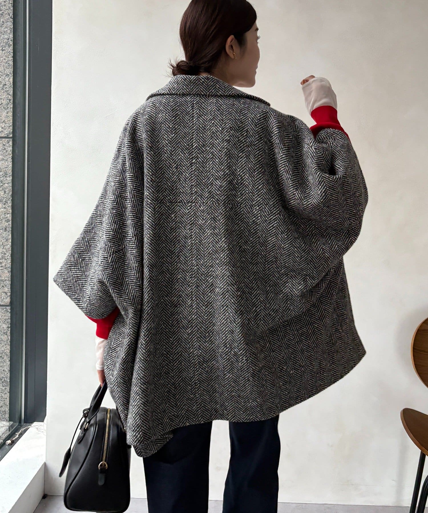 いつものコーデに、さっと羽織るだけでトレンド感あふれるスタイルが完成する、ヘリンボーンポンチョコート。